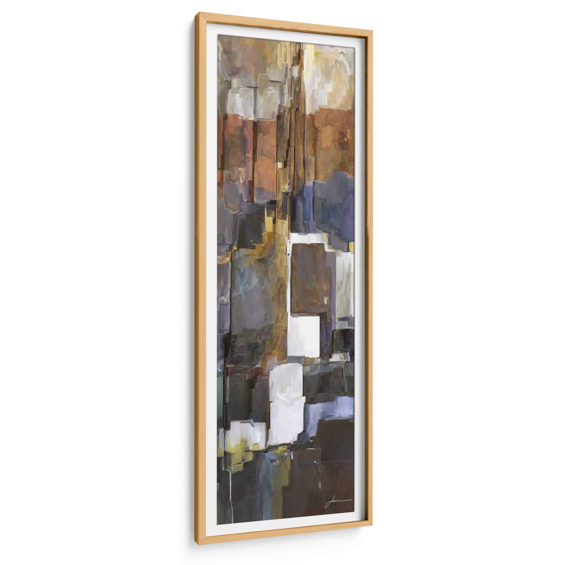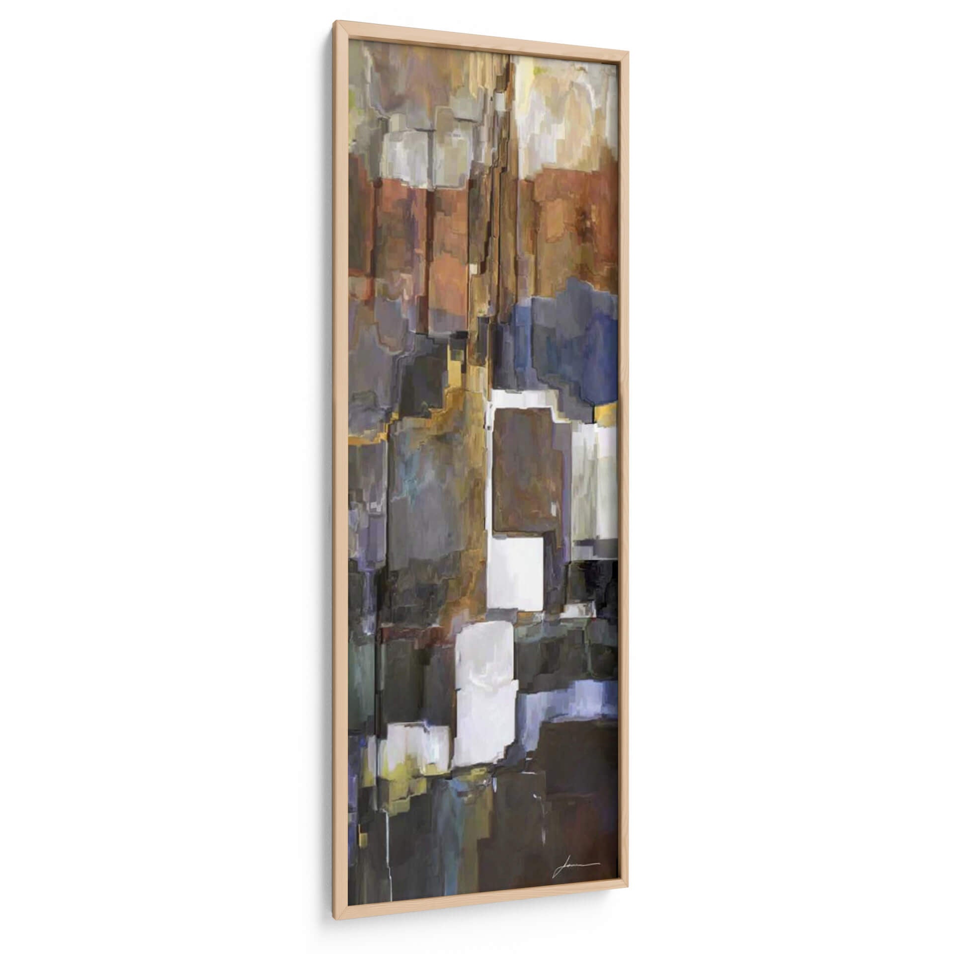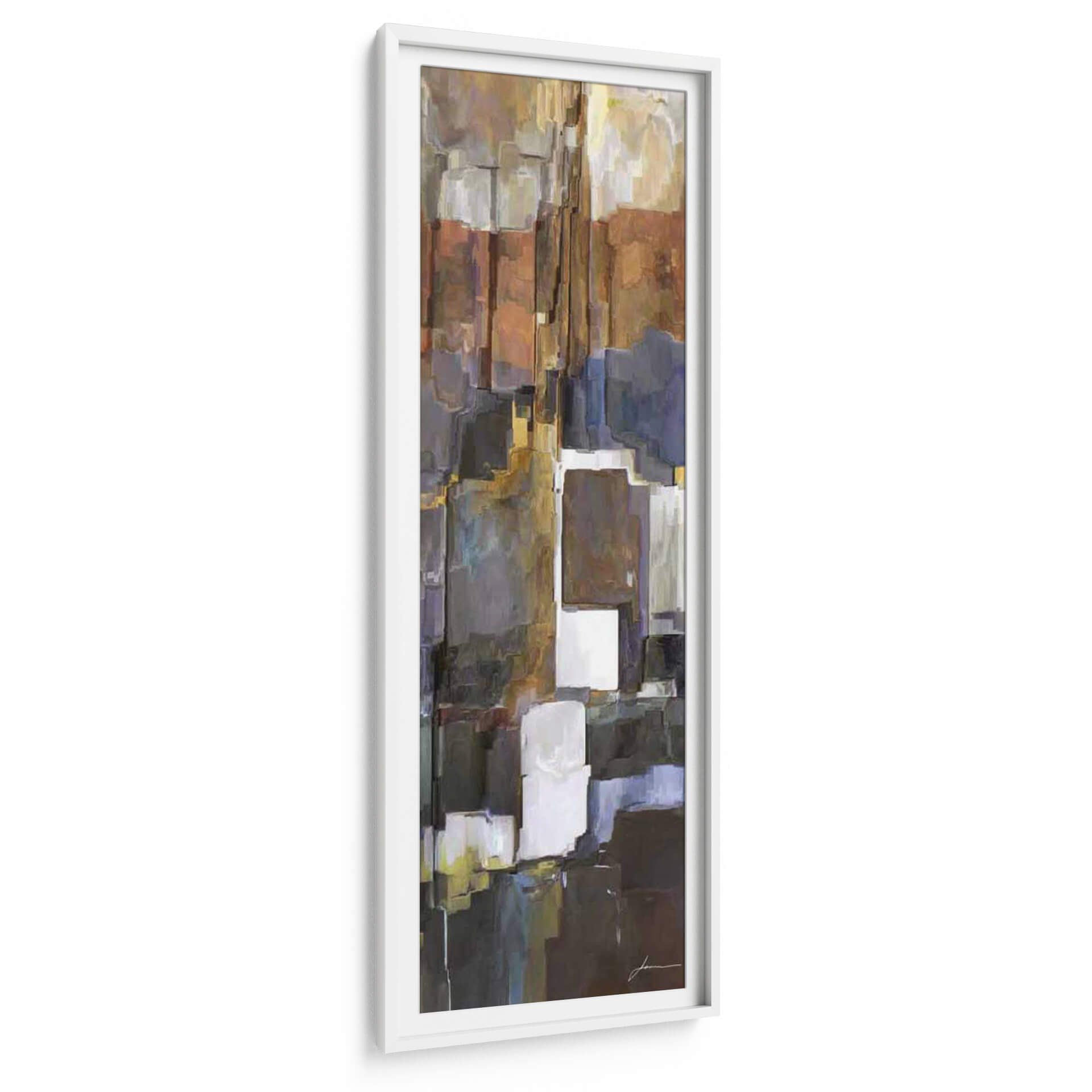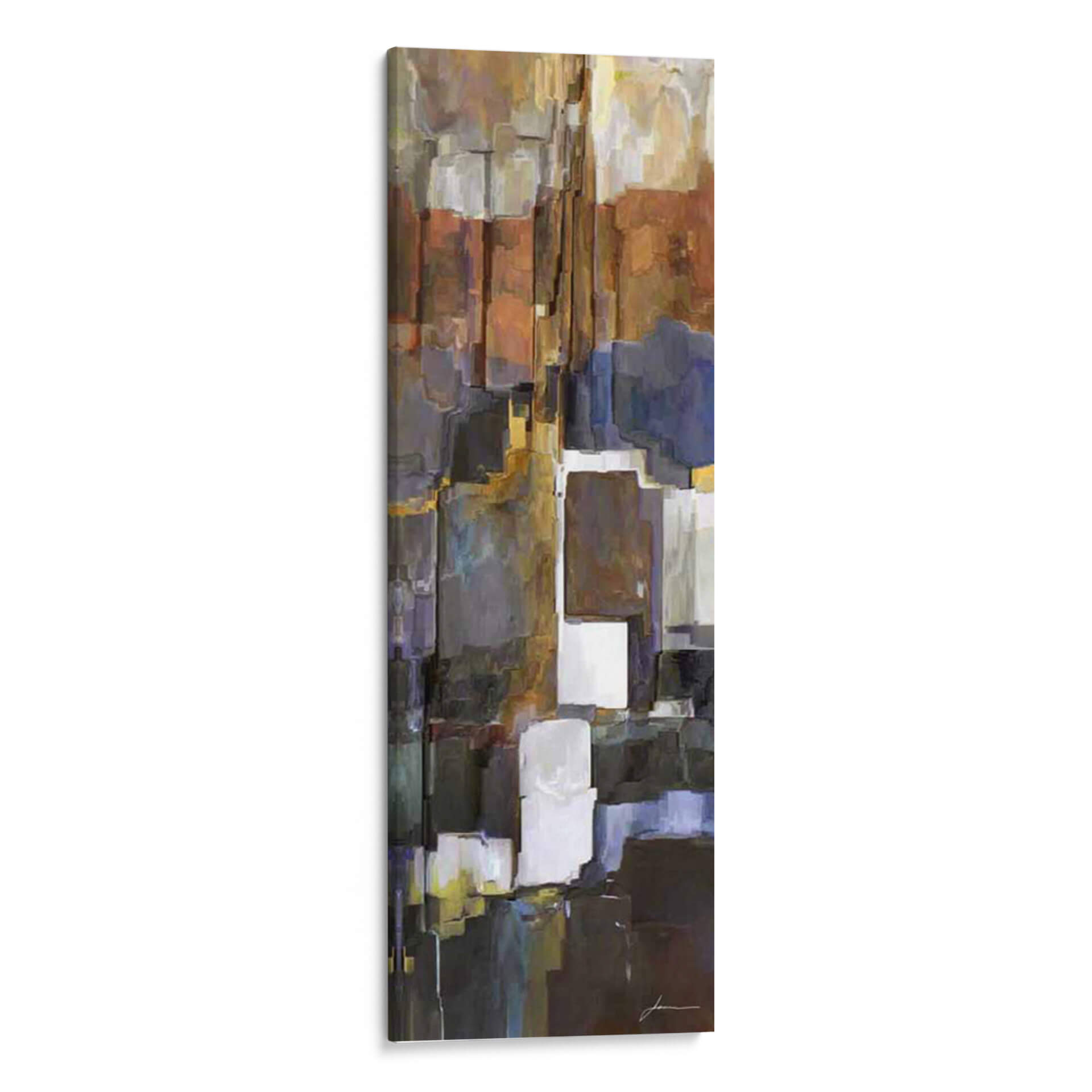 Sumérgete en la profundidad y la textura de "Roca II", una obra de arte contemporáneo de James Burghardt que evoca la solidez y la complejidad de la naturaleza. Este cuadro decorativo se distingue por su paleta de colores tierra, que incluye tonos cálidos de óxido, marrones profundos y toques de gris pizarra y azul índigo, creando una atmósfera rica y sofisticada. La composición se basa en formas rectangulares y bloques apilados que recuerdan a formaciones rocosas abstractas o a la arquitectura urbana, con sutiles pinceladas que añaden movimiento y profundidad. "Roca II" es una pieza que invita a la contemplación, ideal para añadir un punto de interés visual y una sensación de estabilidad a cualquier espacio, desde una sala de estar moderna hasta un despacho profesional o un recibidor. Su estilo abstracto y la riqueza de sus texturas la convierten en una adición versátil y elegante que resuena con quienes aprecian el arte moderno y las piezas con carácter. Transforma tu hogar u oficina con este lienzo que combina la fuerza de la tierra con la expresividad del arte contemporáneo, creando un ambiente único y acogedor.