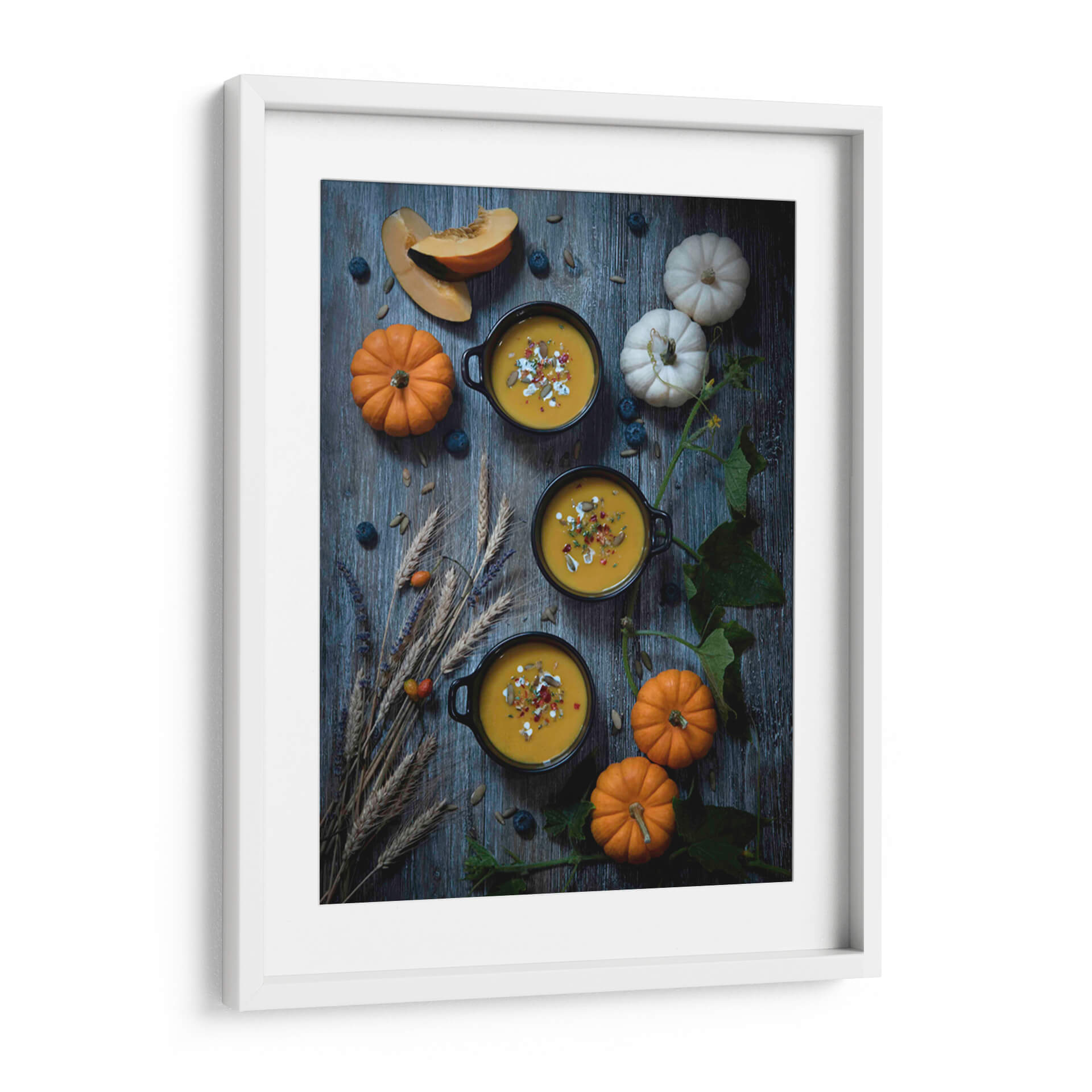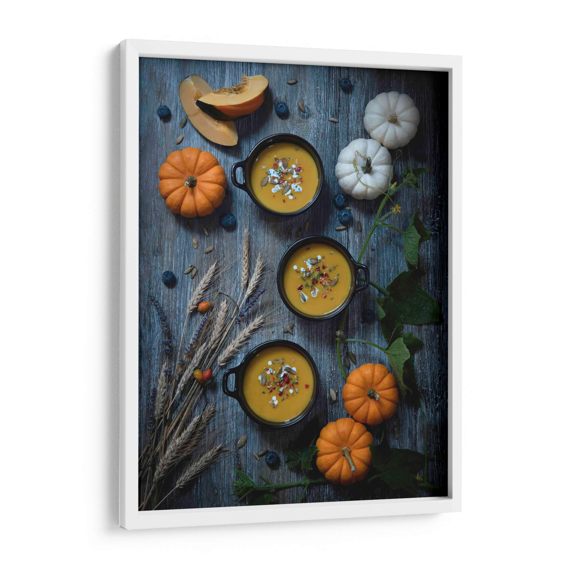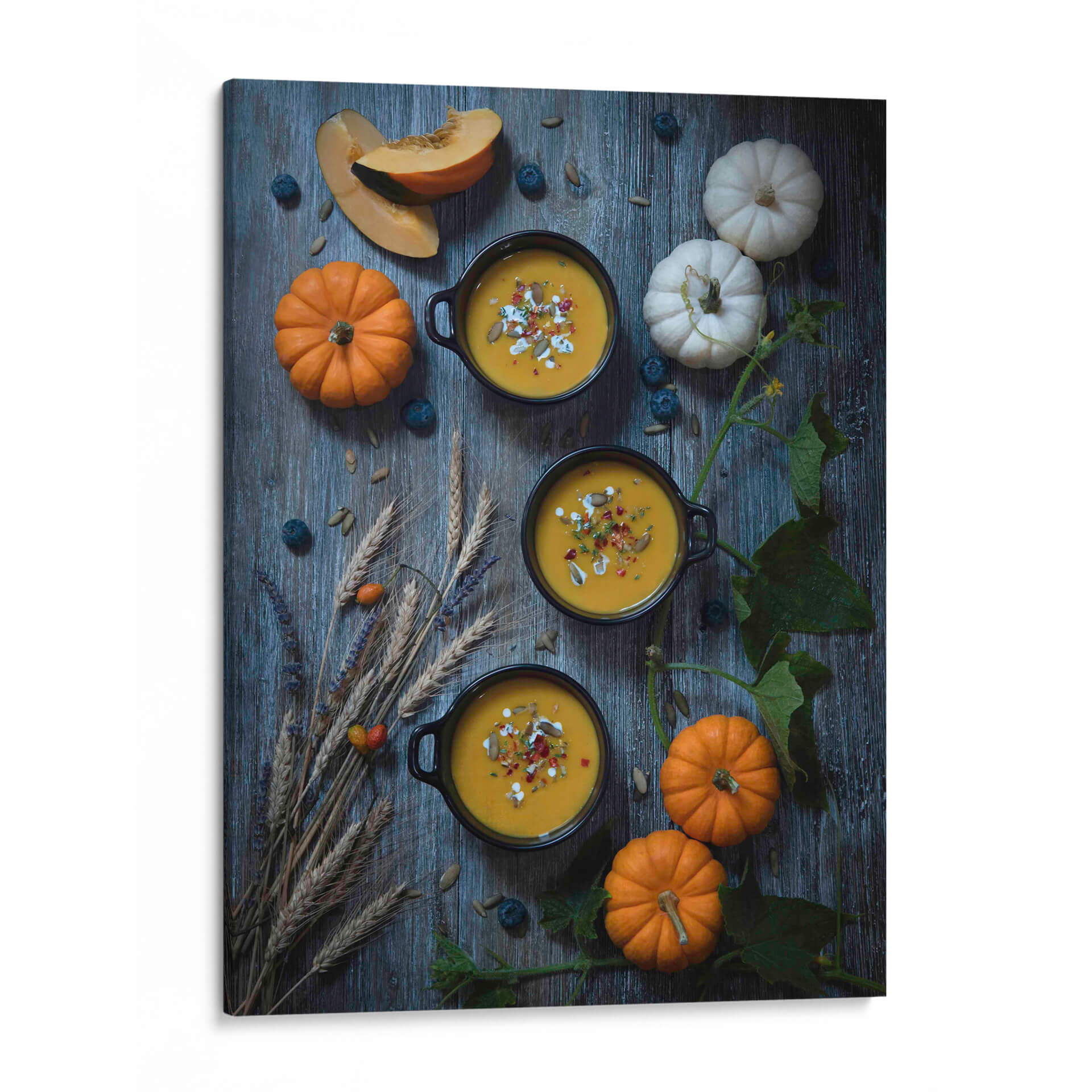 Sumérgete en la calidez reconfortante del otoño con este cuadro decorativo 'Sopa de Calabaza' de Catherine Wang. La obra captura la esencia de la temporada con una composición artística que presenta cuencos de una cremosa sopa de calabaza, adornados con semillas y un toque de picante, rodeados de calabazas anaranjadas y blancas, arándanos y espigas de trigo. El fondo, una madera rústica en tonos azules y grises, aporta una profundidad visual y un contraste que realza los vibrantes colores de los elementos principales. La paleta de colores, dominada por los naranjas, amarillos y toques de azul oscuro, evoca una sensación de confort, hogar y la abundancia de la cosecha. El estilo fotográfico, con una iluminación cuidada, convierte esta escena culinaria en una obra de arte que puede transformar cualquier espacio. Es ideal para cocinas, comedores o salas de estar que busquen un toque acogedor y rústico, aportando un ambiente de tranquilidad y disfrute. Añade un toque de la magia otoñal a tu decoración con esta pieza única que celebra los sabores y colores de la estación.