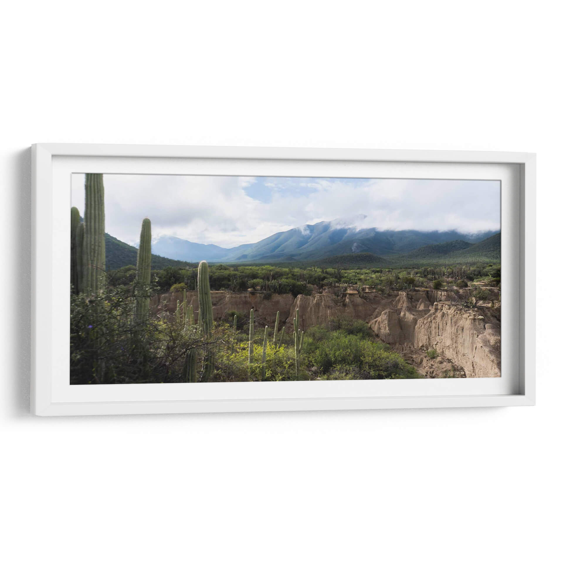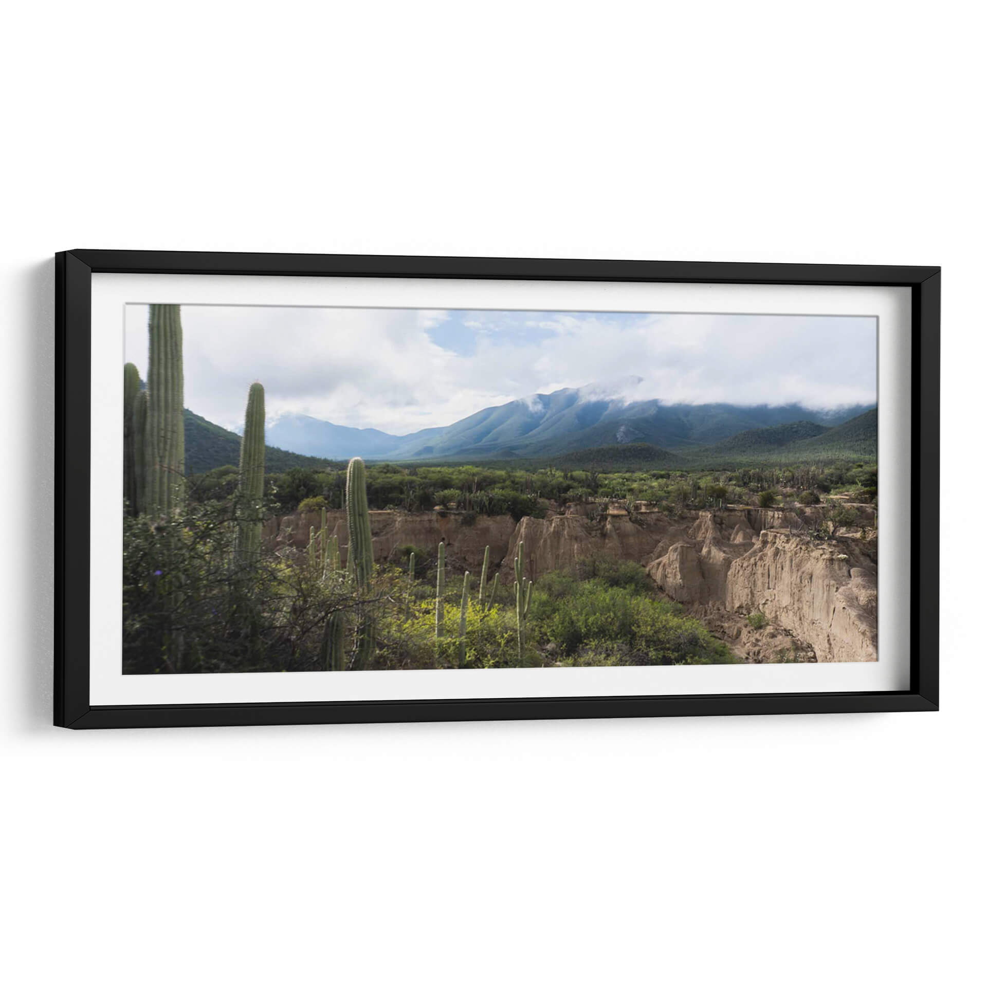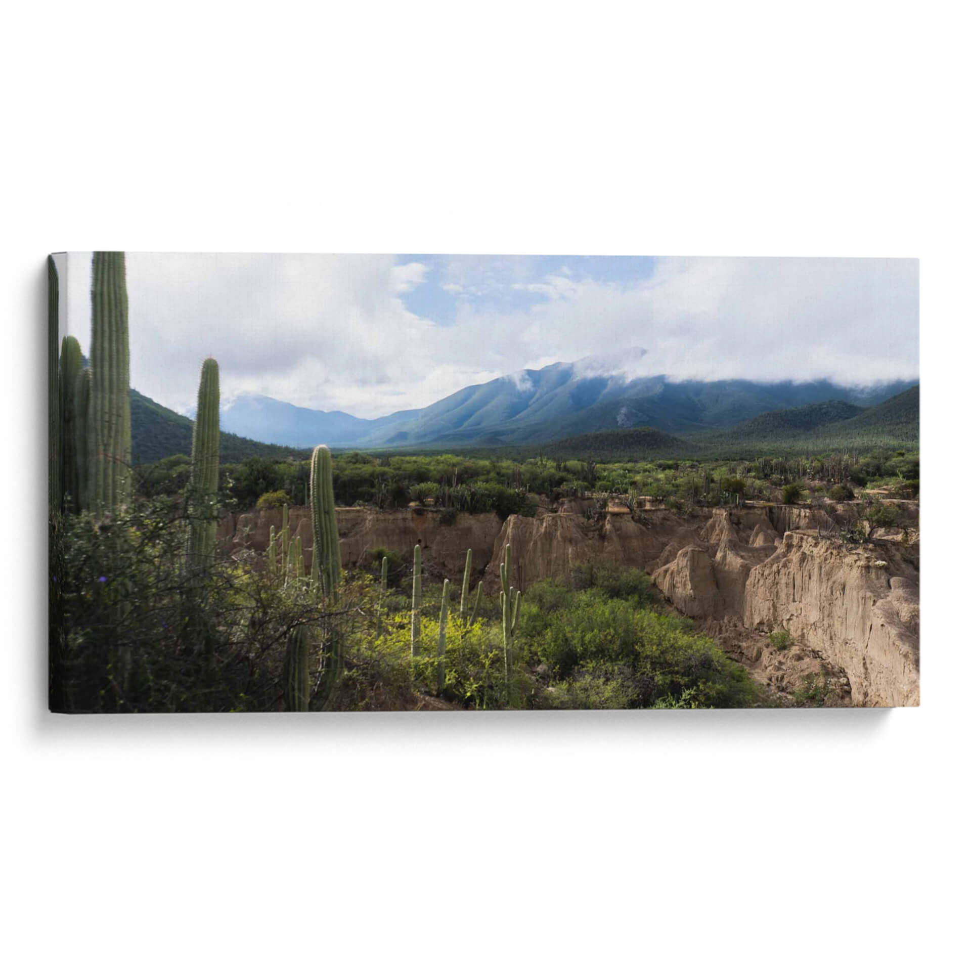 Sumérgete en la majestuosidad árida del "Tehuacán, Semidesierto Poblano" con este evocador cuadro decorativo. La obra captura la esencia de un paisaje desértico con una paleta de colores tierra y verdes vibrantes, dominada por imponentes cactus que se alzan contra un cielo nublado. Las formaciones geológicas únicas y las montañas cubiertas de vegetación crean una atmósfera de serenidad y exploración, invitando a la contemplación de la resiliencia y la belleza indómita de la naturaleza. Este lienzo es ideal para añadir un toque de naturaleza salvaje y tranquilidad a cualquier espacio, ya sea una sala de estar moderna, un estudio tranquilo o una oficina que busque inspiración. Su composición detallada y la profundidad del paisaje transportan al espectador a este rincón especial de México, ofreciendo una ventana a un mundo de texturas y tonos sutiles que enriquecerán tu decoración. Descubre la calma y la fuerza de este semidesierto capturadas en una pieza de arte única, perfecta para quienes aprecian la fotografía de paisajes y la belleza del entorno natural.
