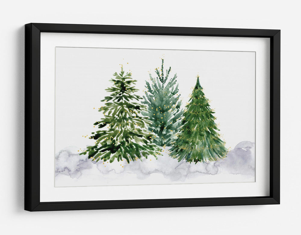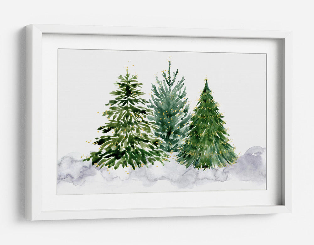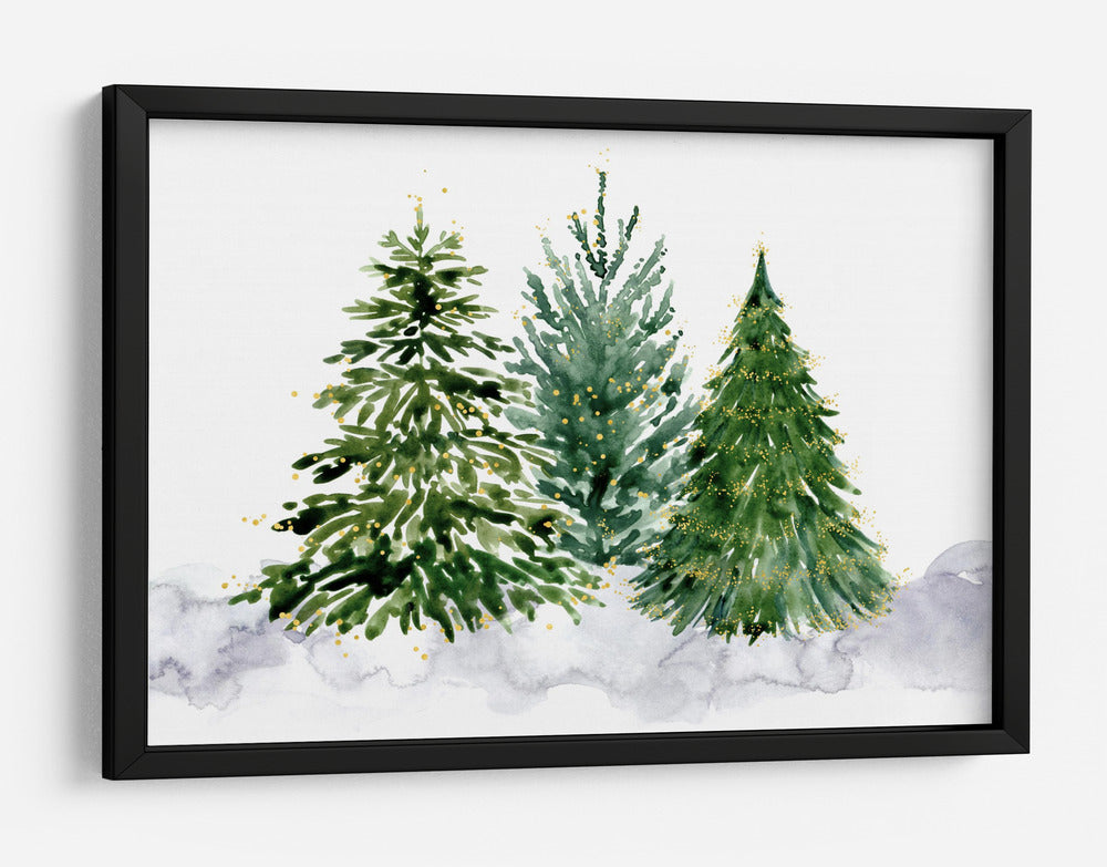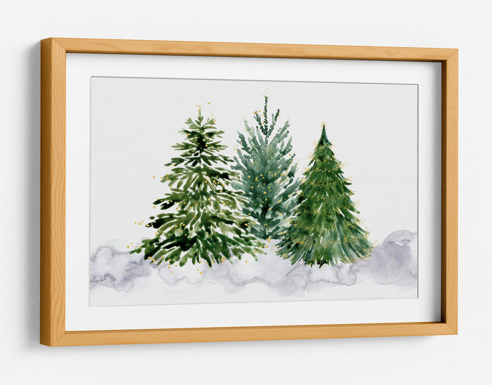 Adéntrate en la magia invernal con este evocador cuadro decorativo que captura la esencia de tres árboles de Navidad pintados a acuarela. La obra presenta una delicada composición de abetos en diversos tonos de verde, salpicados con toques de acuarela grisácea en la base que sugieren un paisaje nevado. Pequeños destellos dorados, como si fueran luces o escarcha, añaden un toque de brillo y festividad a las ramas, creando una atmósfera encantadora y serena. El estilo de acuarela aporta una ligereza y fluidez únicas, haciendo que cada pincelada sea visible y aporte textura a la pieza. Este cuadro es perfecto para quienes buscan infundir un espíritu navideño y de calidez en su hogar u oficina durante la temporada festiva o todo el año. Ideal para colocar en salas de estar, comedores o cualquier espacio que desee un acento de naturaleza invernal y elegancia discreta. Transforma tu ambiente con la belleza atemporal de la acuarela y la alegría de las fiestas.