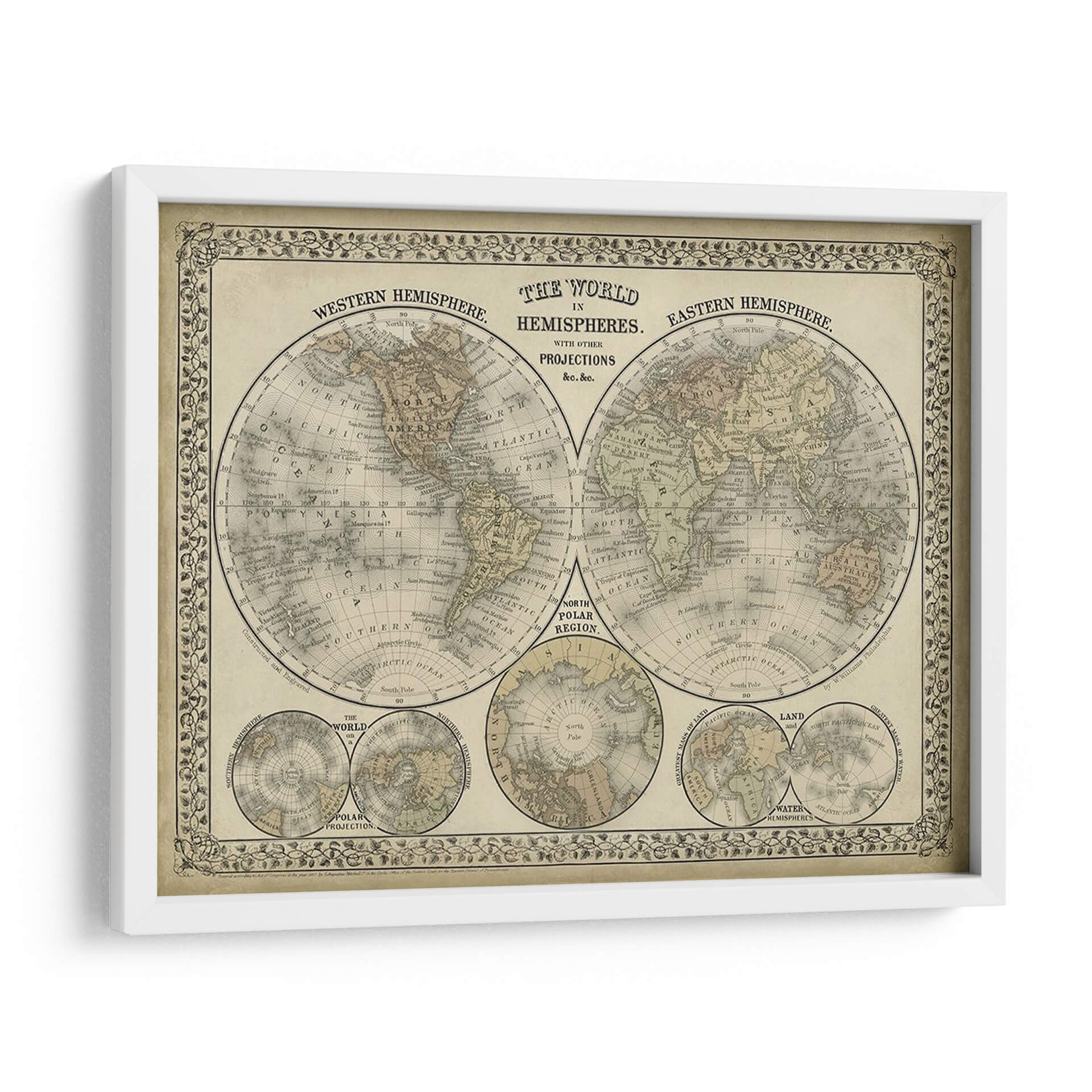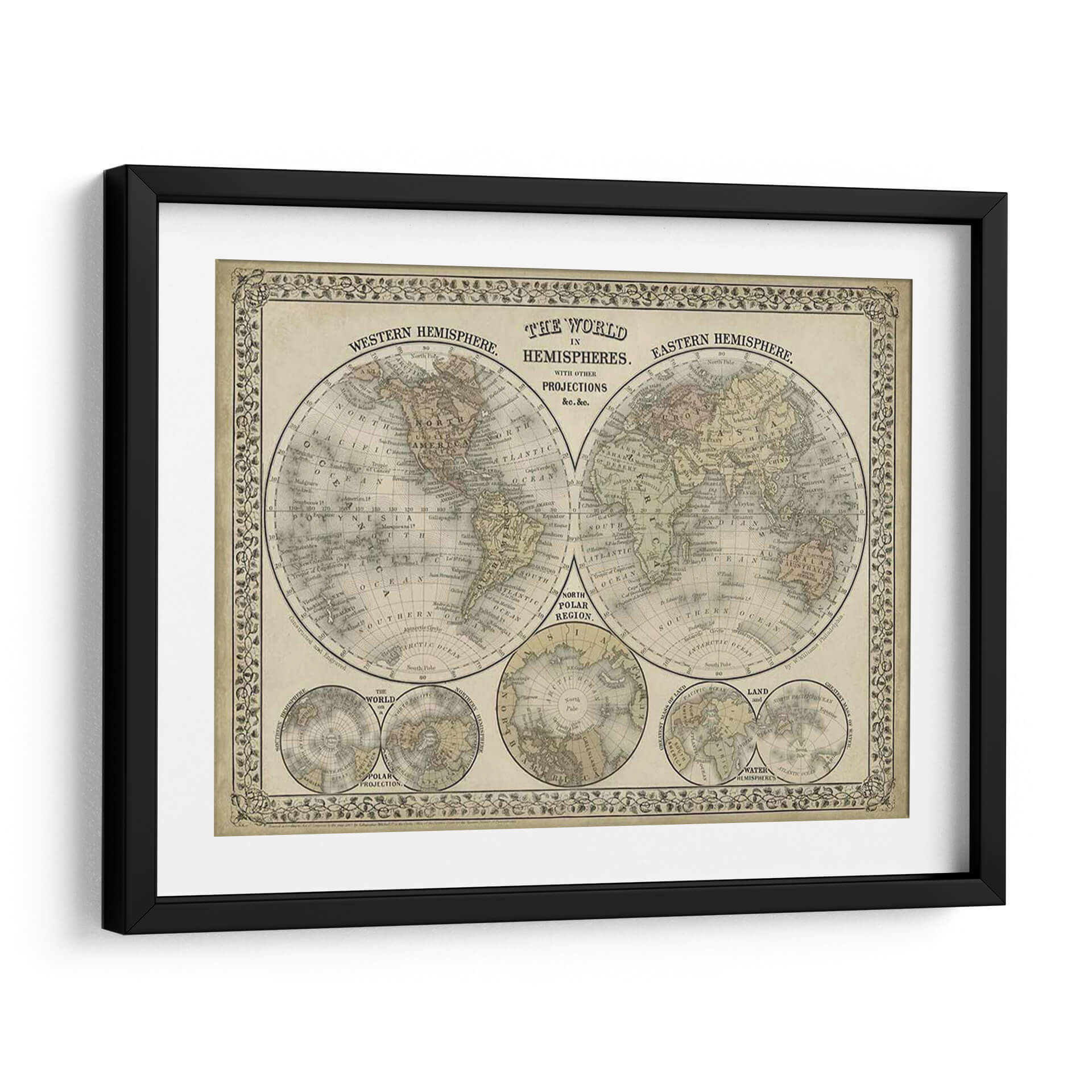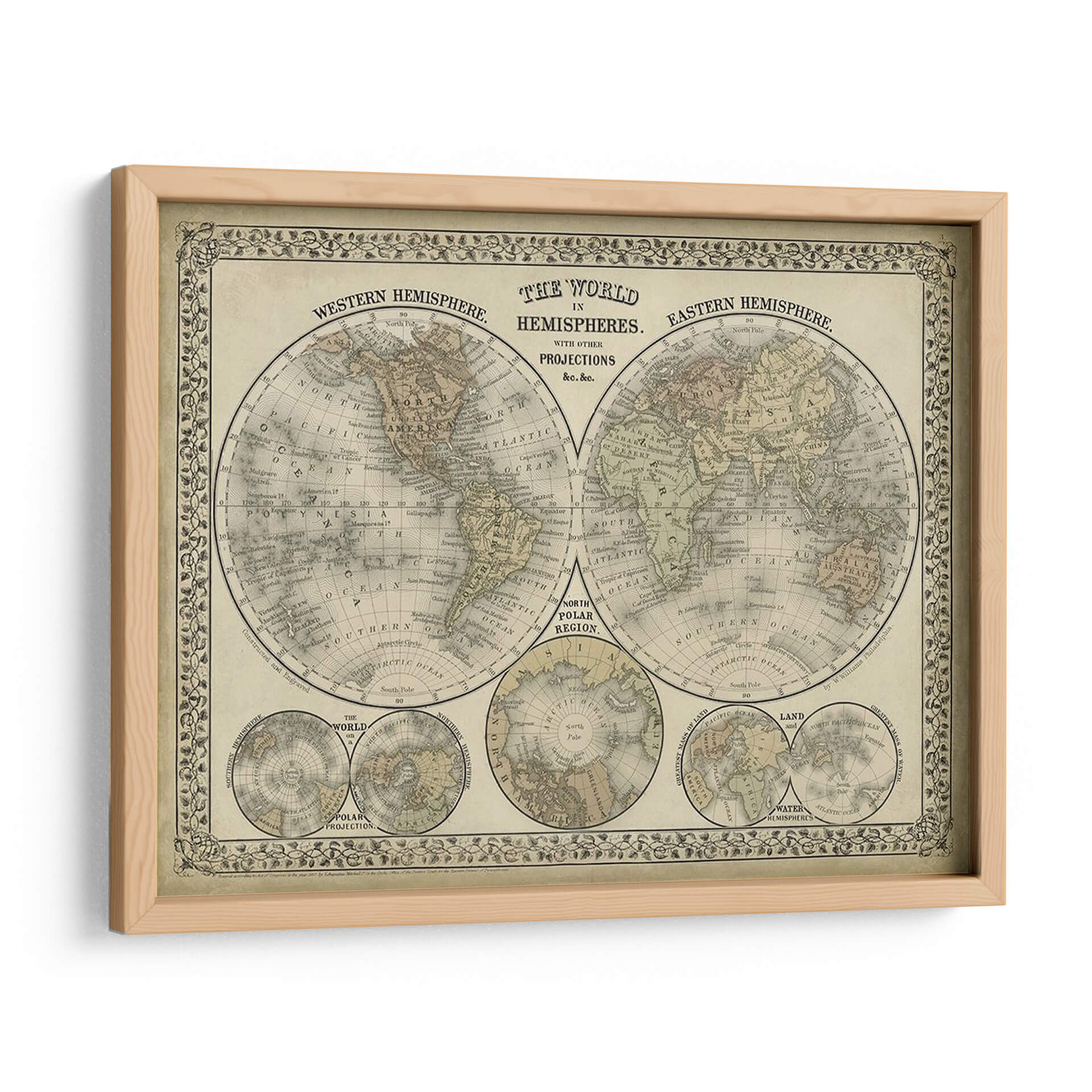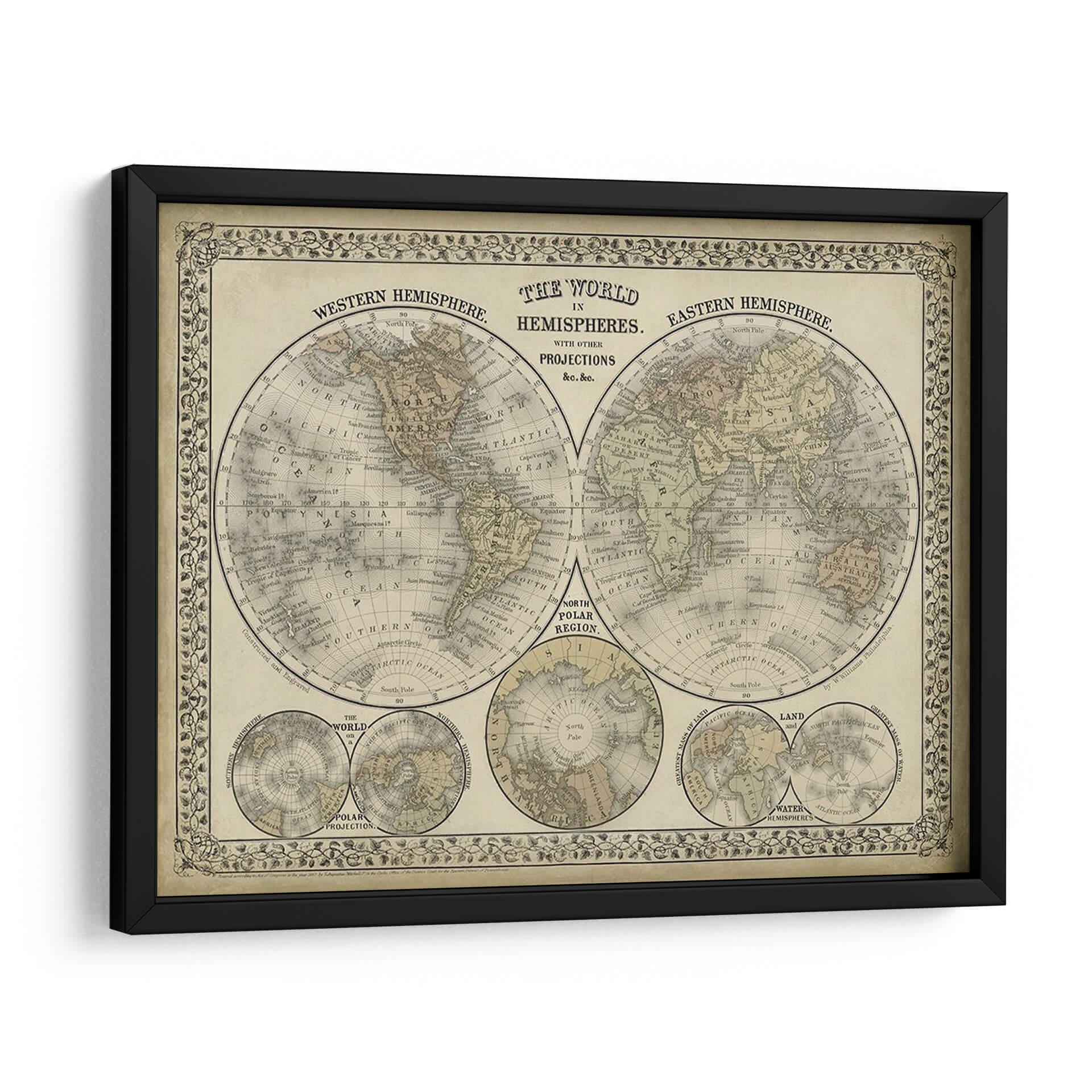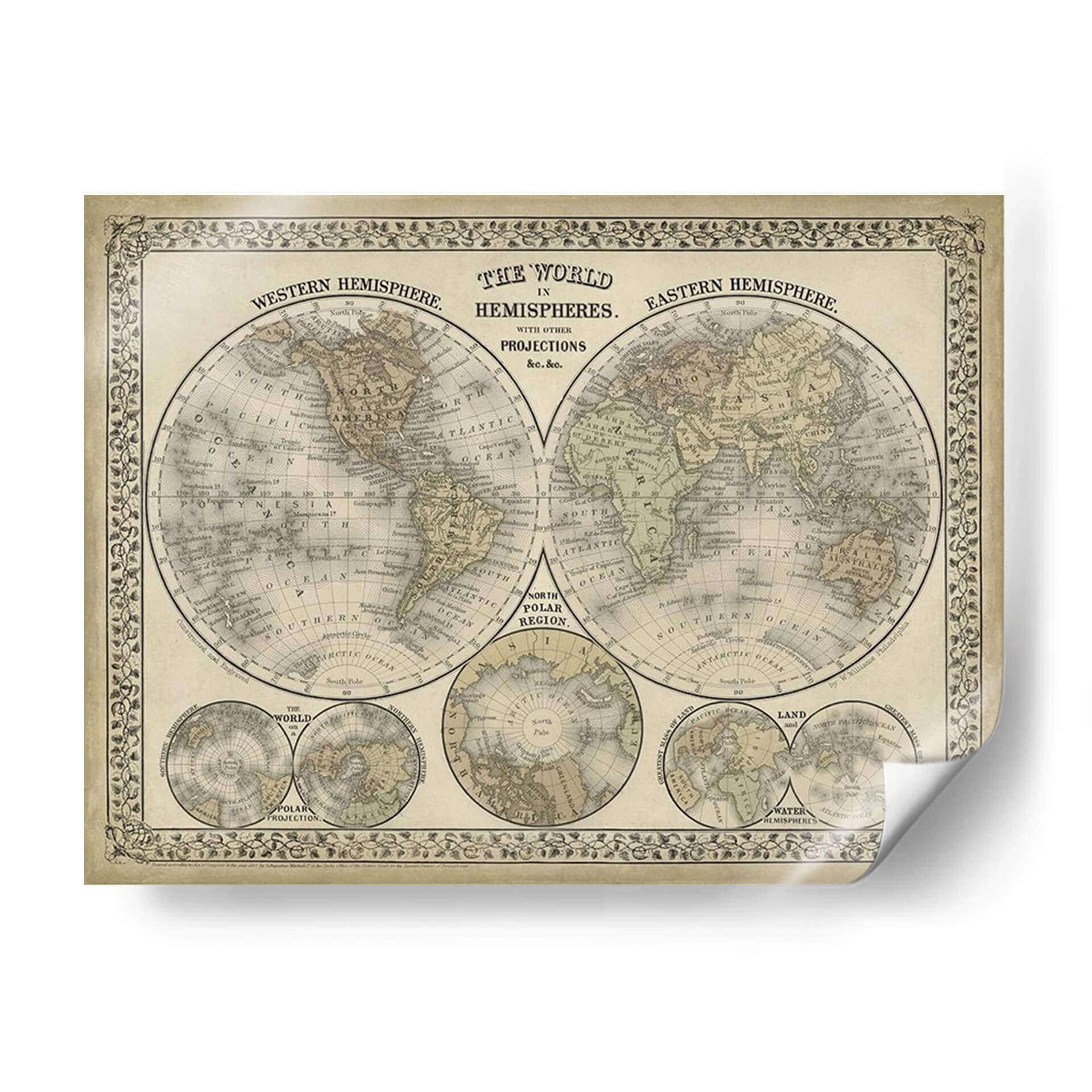Sumérgete en la historia y la geografía con "El Mundo En Hemisferios", una obra de arte que captura la majestuosidad de nuestro planeta. Este cuadro decorativo presenta una detallada proyección cartográfica de los hemisferios oriental y occidental, junto con proyecciones polares, evocando la era de la exploración y el conocimiento geográfico. La paleta de colores, dominada por tonos sepia, beige y verdes apagados, confiere una atmósfera vintage y erudita, perfecta para inspirar curiosity y conversación. Los intrincados detalles de continentes, océanos, y la caligrafía antigua transportan al espectador a un viaje visual a través del tiempo. Este mapa del mundo es ideal para cualquier espacio que busque un toque de elegancia clásica y un punto de interés intelectual. Ya sea en un estudio, una biblioteca, una oficina o un salón, este cuadro de Mitchell se convierte en un elemento decorativo que estimula la imaginación y celebra el vasto mundo que habitamos. Añade un toque de sofisticación y aventura a tu decoración con esta pieza única que invita a explorar.