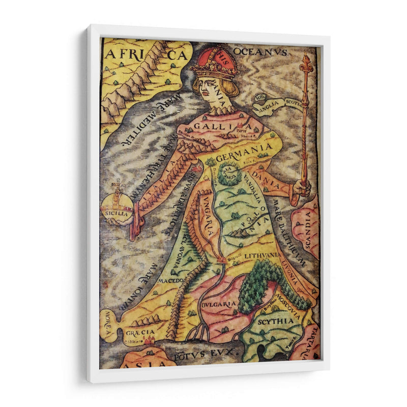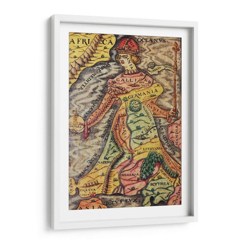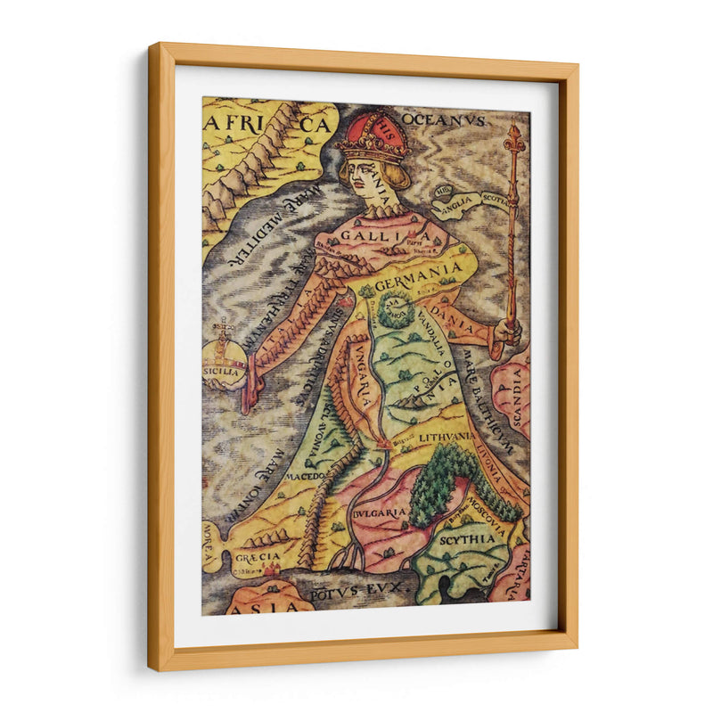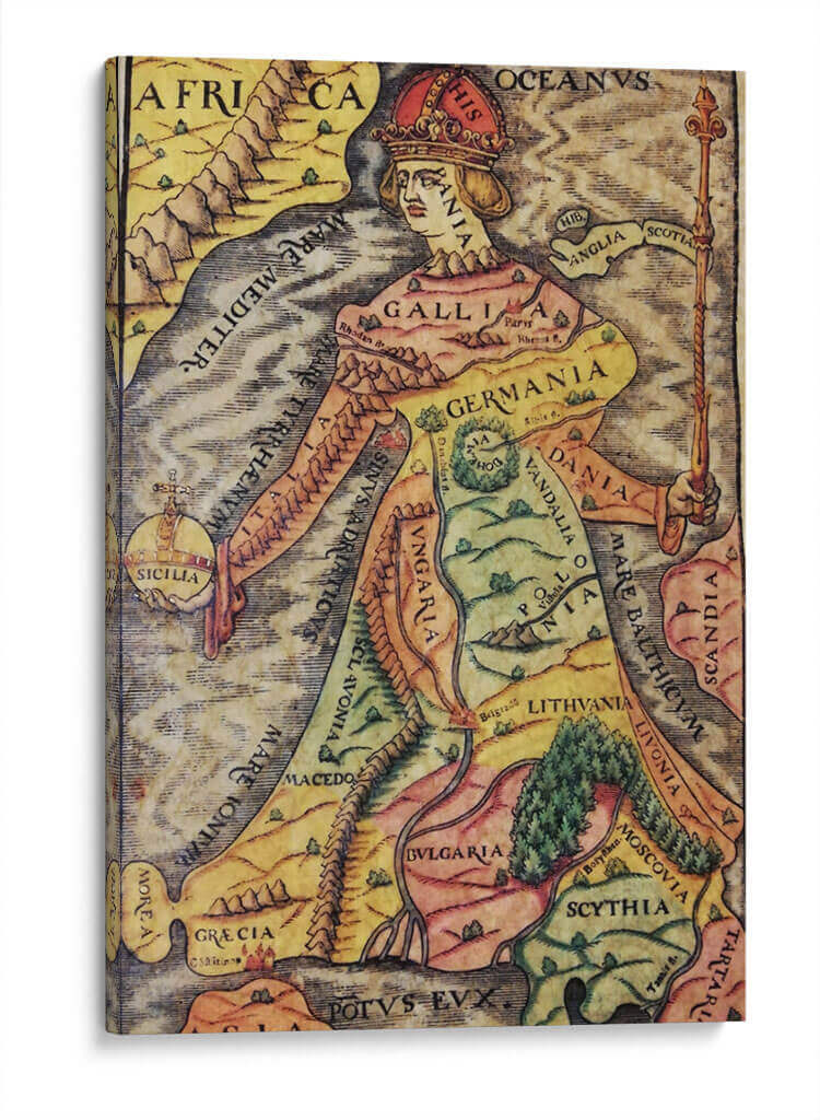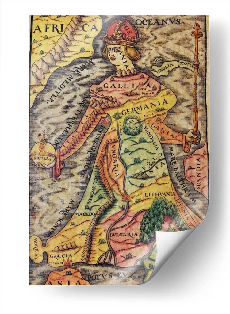Descubre "Europa Regina", una obra de arte decorativo que reimagina el continente europeo como una figura real majestuosa. Este cuadro decorativo fusiona la cartografía histórica con el arte alegórico, presentando un mapa detallado de Europa donde cada región y país se integra de forma ingeniosa en la silueta de una reina coronada. La paleta de colores, rica en tonos tierra, amarillos y verdes, evoca una sensación de historia y tradición, mientras que los detalles intrincados invitan a la exploración visual. La composición es fascinante, con la figura central dominando el espacio y los nombres de las naciones inscritos elegantemente sobre el paisaje. Ideal para añadir un toque de distinción intelectual y un punto focal de conversación a tu estudio, biblioteca u oficina. Este cuadro decorativo no es solo una pieza de arte, sino una ventana a la geografía histórica y una celebración de la identidad europea, perfecta para aquellos que aprecian la historia, la cartografía y el arte con un significado profundo. Transforma tu pared con esta representación única y cautivadora.