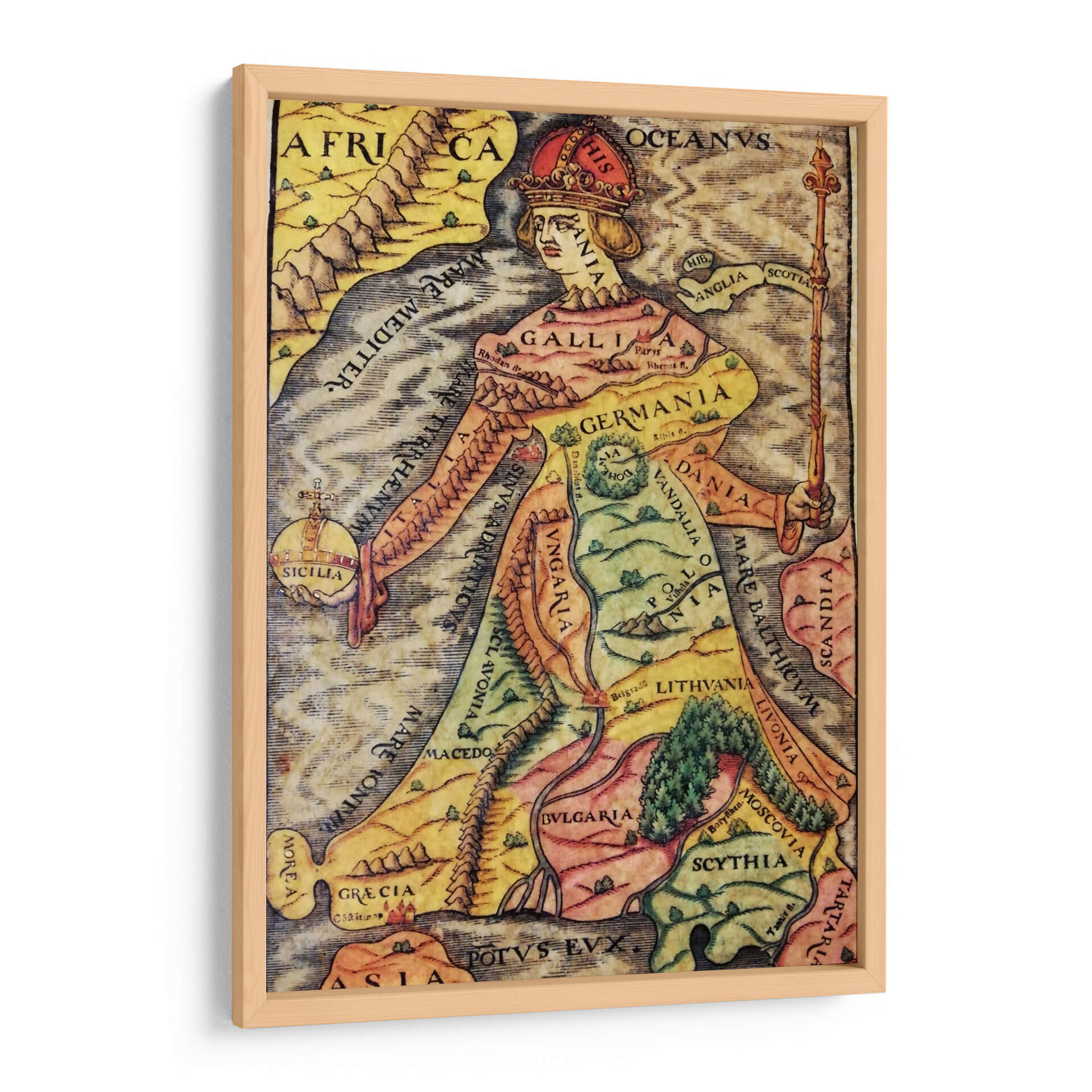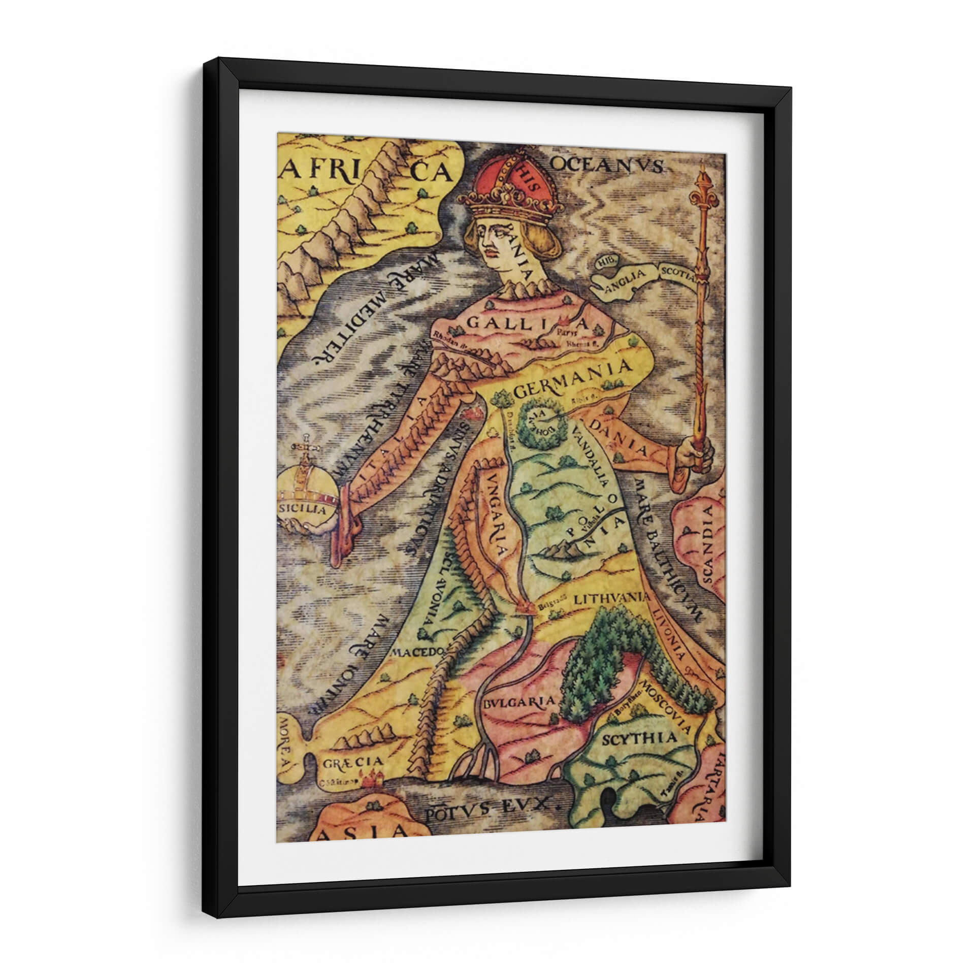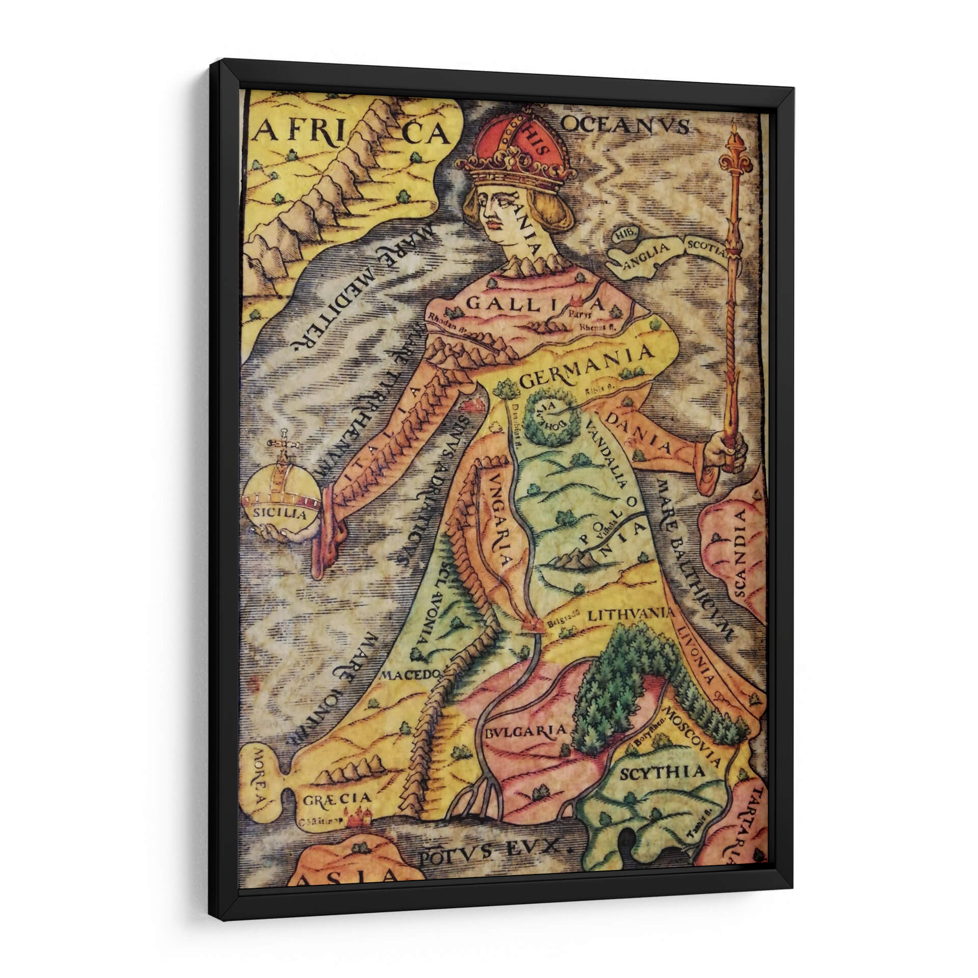 Descubre "Europa Regina", una obra de arte decorativo que reimagina el continente europeo como una figura real majestuosa. Este cuadro decorativo fusiona la cartografía histórica con el arte alegórico, presentando un mapa detallado de Europa donde cada región y país se integra de forma ingeniosa en la silueta de una reina coronada. La paleta de colores, rica en tonos tierra, amarillos y verdes, evoca una sensación de historia y tradición, mientras que los detalles intrincados invitan a la exploración visual. La composición es fascinante, con la figura central dominando el espacio y los nombres de las naciones inscritos elegantemente sobre el paisaje. Ideal para añadir un toque de distinción intelectual y un punto focal de conversación a tu estudio, biblioteca u oficina. Este cuadro decorativo no es solo una pieza de arte, sino una ventana a la geografía histórica y una celebración de la identidad europea, perfecta para aquellos que aprecian la historia, la cartografía y el arte con un significado profundo. Transforma tu pared con esta representación única y cautivadora.