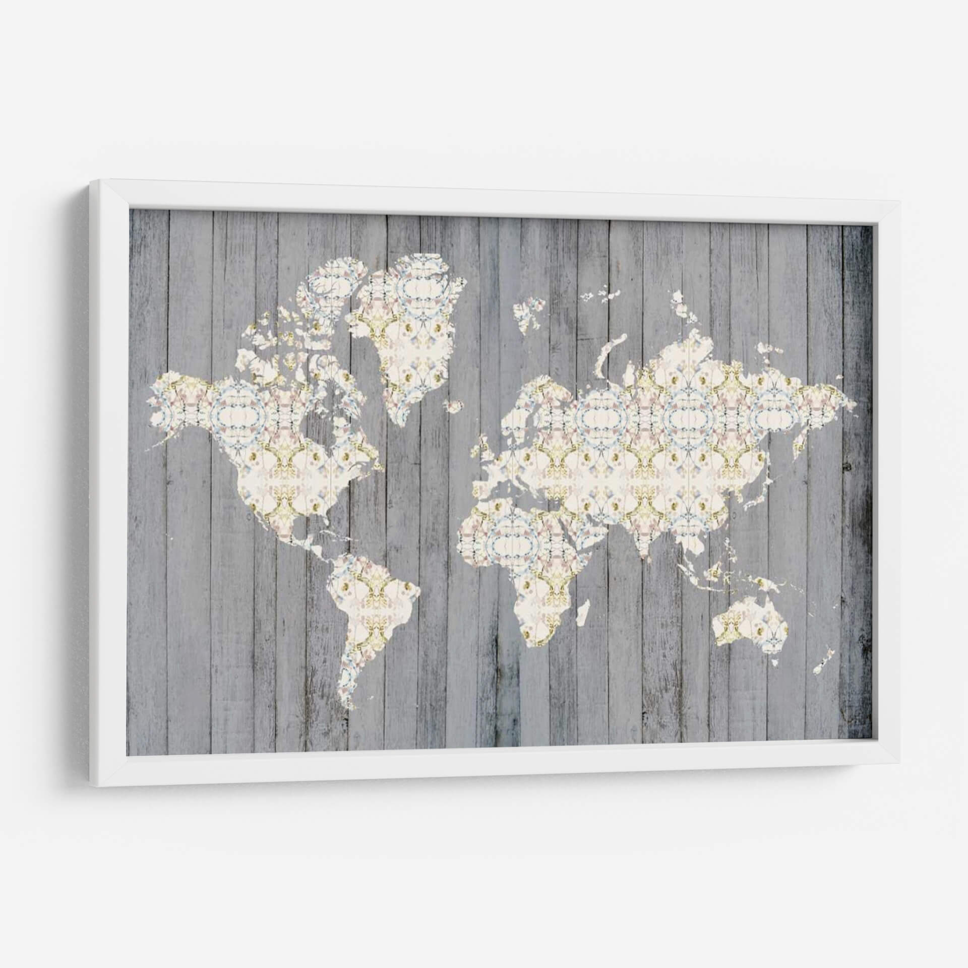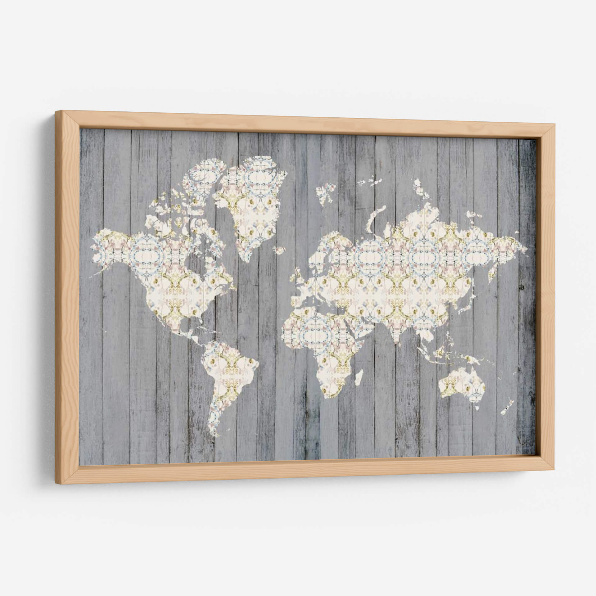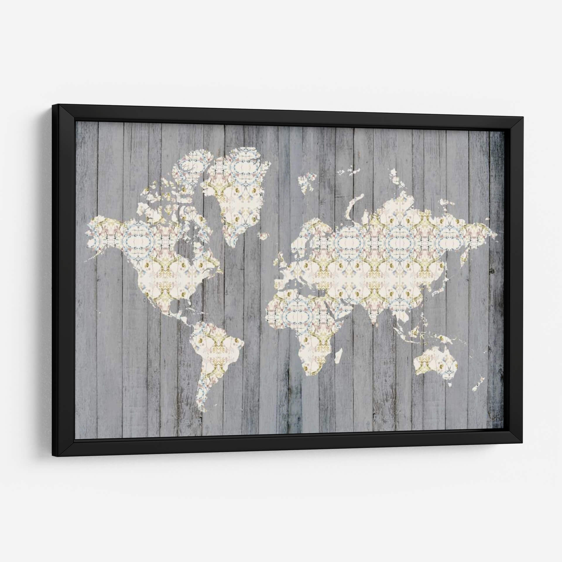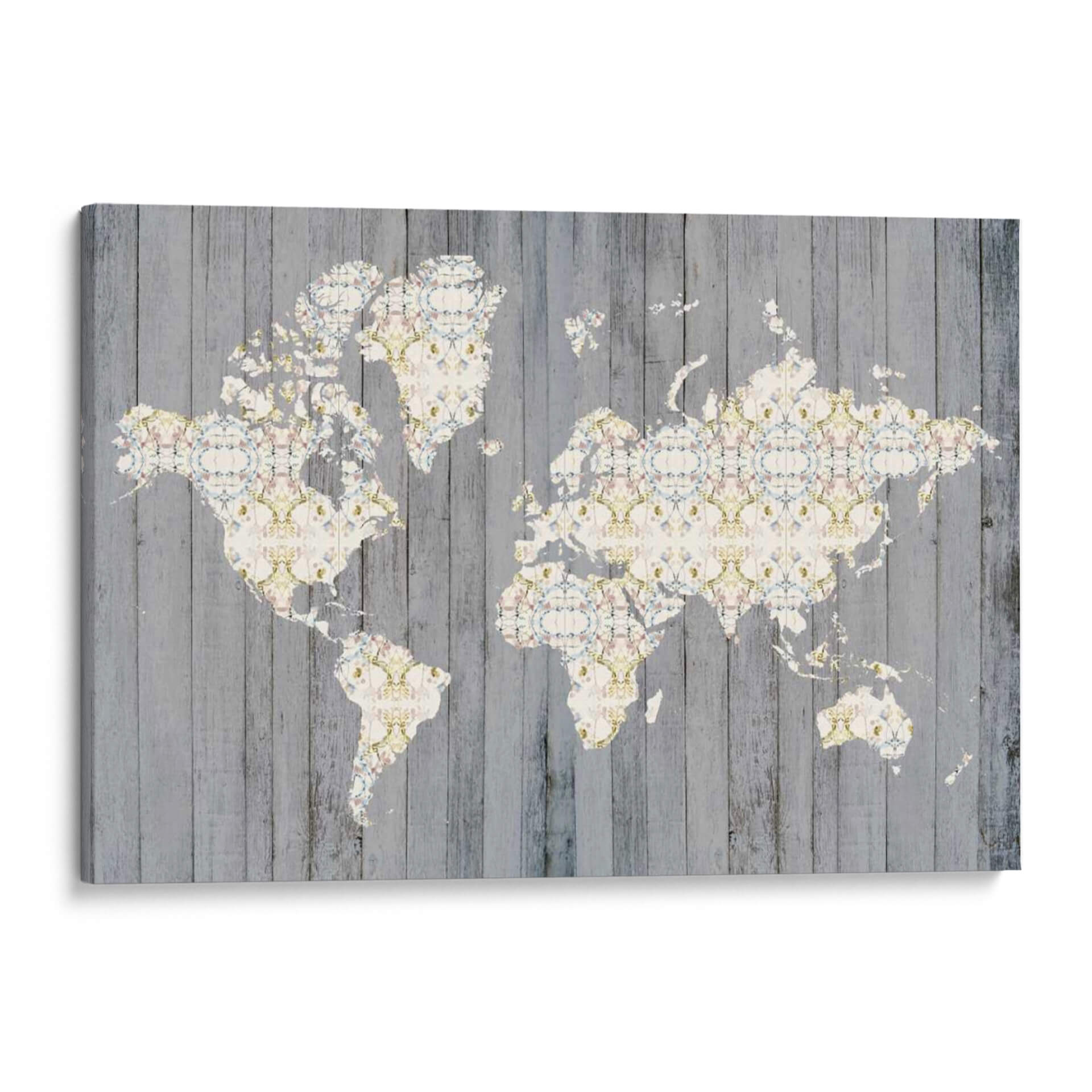Descubre 'Mapa De Flores I', una obra de arte contemporáneo de Jennifer Goldberger que redefine la decoración de paredes. Este cuadro decorativo presenta una representación intrincada del mapa mundial, donde cada masa terrestre está adornada con un delicado patrón floral en tonos pastel y acentos dorados. El fondo, que simula tablones de madera rústica en gris desgastado, crea un contraste visual cautivador que aporta profundidad y textura a la pieza. La composición, equilibrada y detallada, invita a la contemplación y al descubrimiento, fusionando la geografía con la belleza botánica de una manera original y sofisticada. La paleta de colores, sutil y armoniosa, se compone de blancos cremosos, rosas pálidos, azules celestes y toques de verde menta y dorado, evocando una sensación de calma, elegancia y un toque de romanticismo vintage. 'Mapa De Flores I' es ideal para añadir un punto focal distintivo a salones modernos, oficinas con estilo o dormitorios acogedores. Transforma tu espacio con este lienzo único que celebra la belleza del mundo y la delicadeza de la naturaleza, una pieza que no solo decora, sino que también inspira conversaciones y viajes imaginarios, perfecta para amantes de la cartografía y el arte floral.