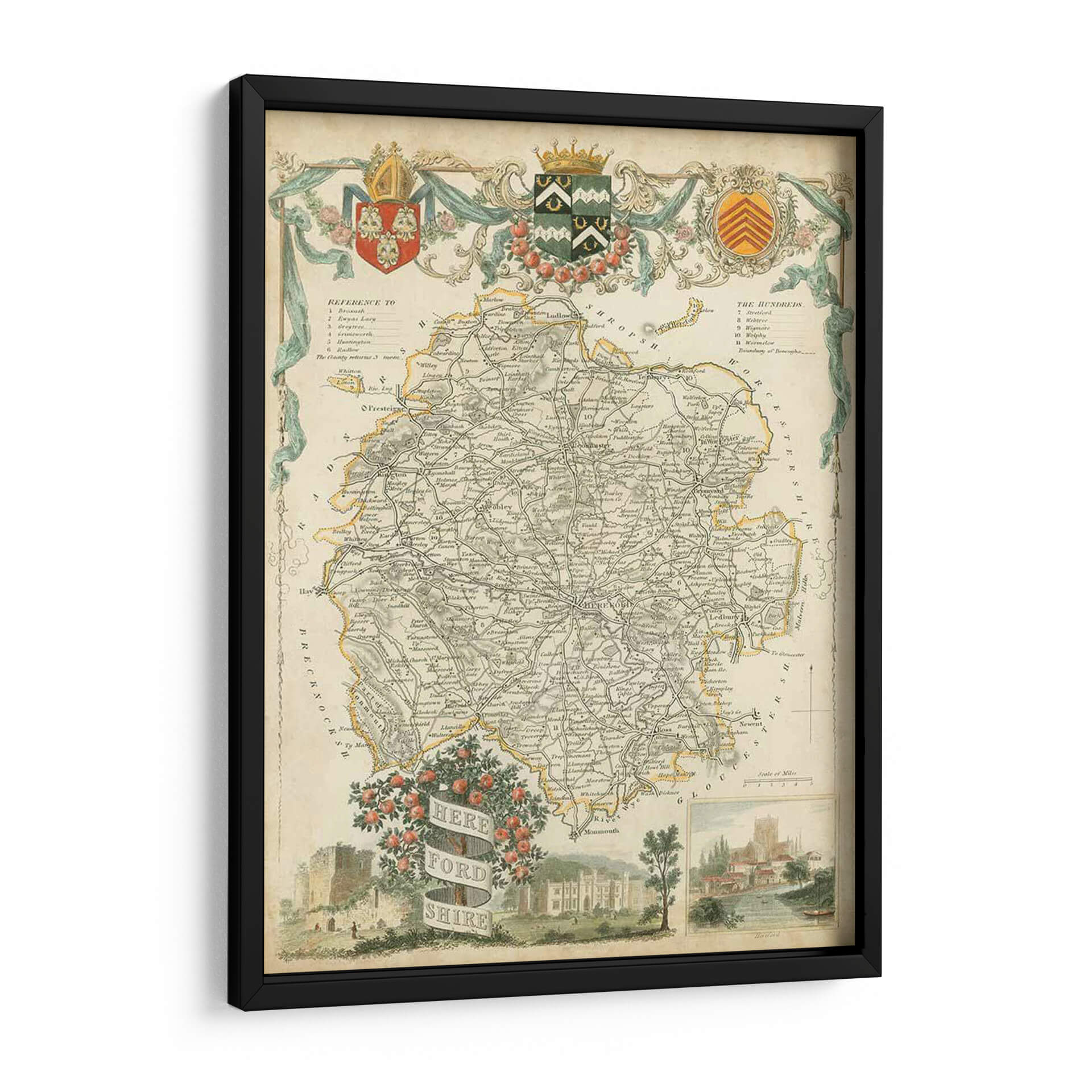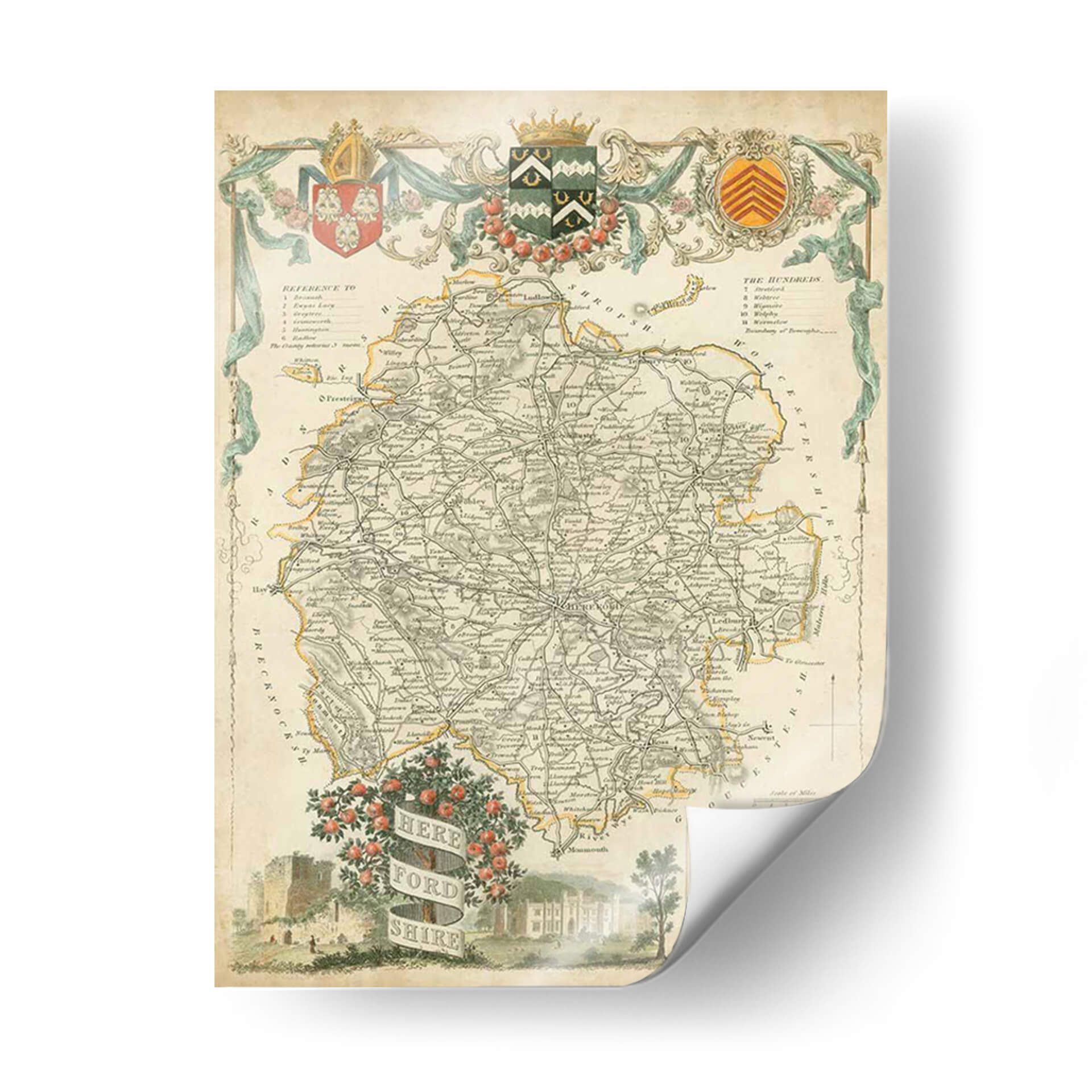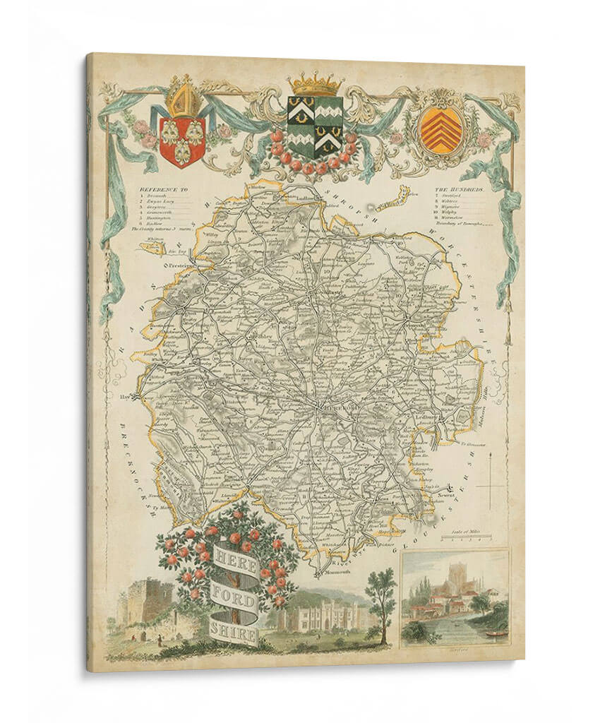 Sumérgete en la rica historia y el detalle intrincado con este exquisito cuadro decorativo del Mapa de Herefordshire. Esta obra de arte, inspirada en mapas antiguos, presenta una paleta de colores apagados y terrosos, con acentos sutiles de amarillo y verde que aportan un toque de vitalidad. La composición se centra en la detallada representación de un mapa geográfico, con una intrincada red de carreteras, nombres de pueblos y características geográficas, todo ello enmarcado por elementos ornamentales clásicos que evocan una sensación de elegancia atemporal. En la parte inferior, una escena pintoresca con un castillo, una mansión y un paisaje fluvial añade profundidad y un encanto rústico, invitando a la contemplación. Este mapa decorativo es una pieza perfecta para añadir un toque de sofisticación y un aire de descubrimiento a cualquier espacio, ya sea una sala de estar, un estudio o una oficina. Ideal para amantes de la historia, la geografía o para quienes buscan una decoración de pared única y con carácter.