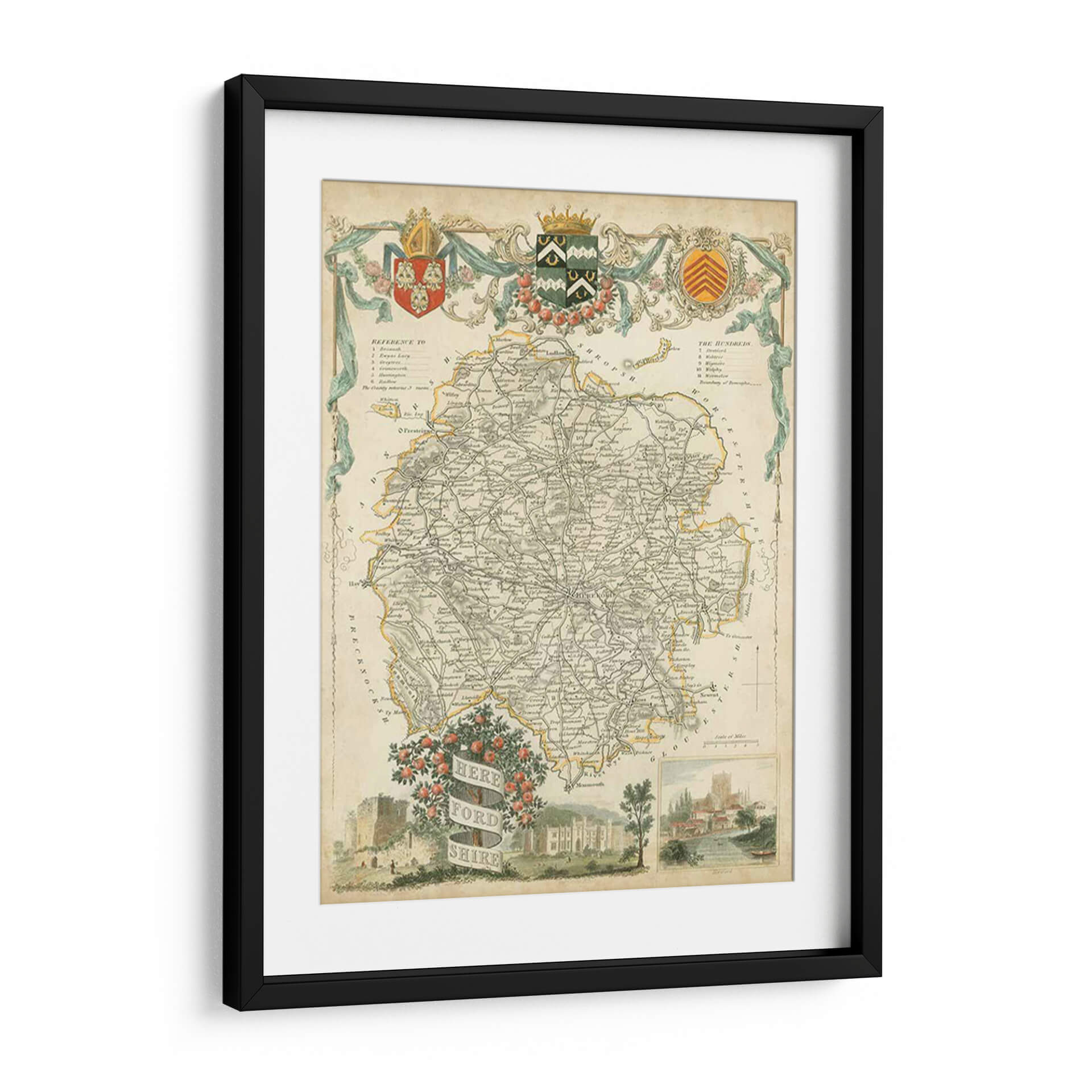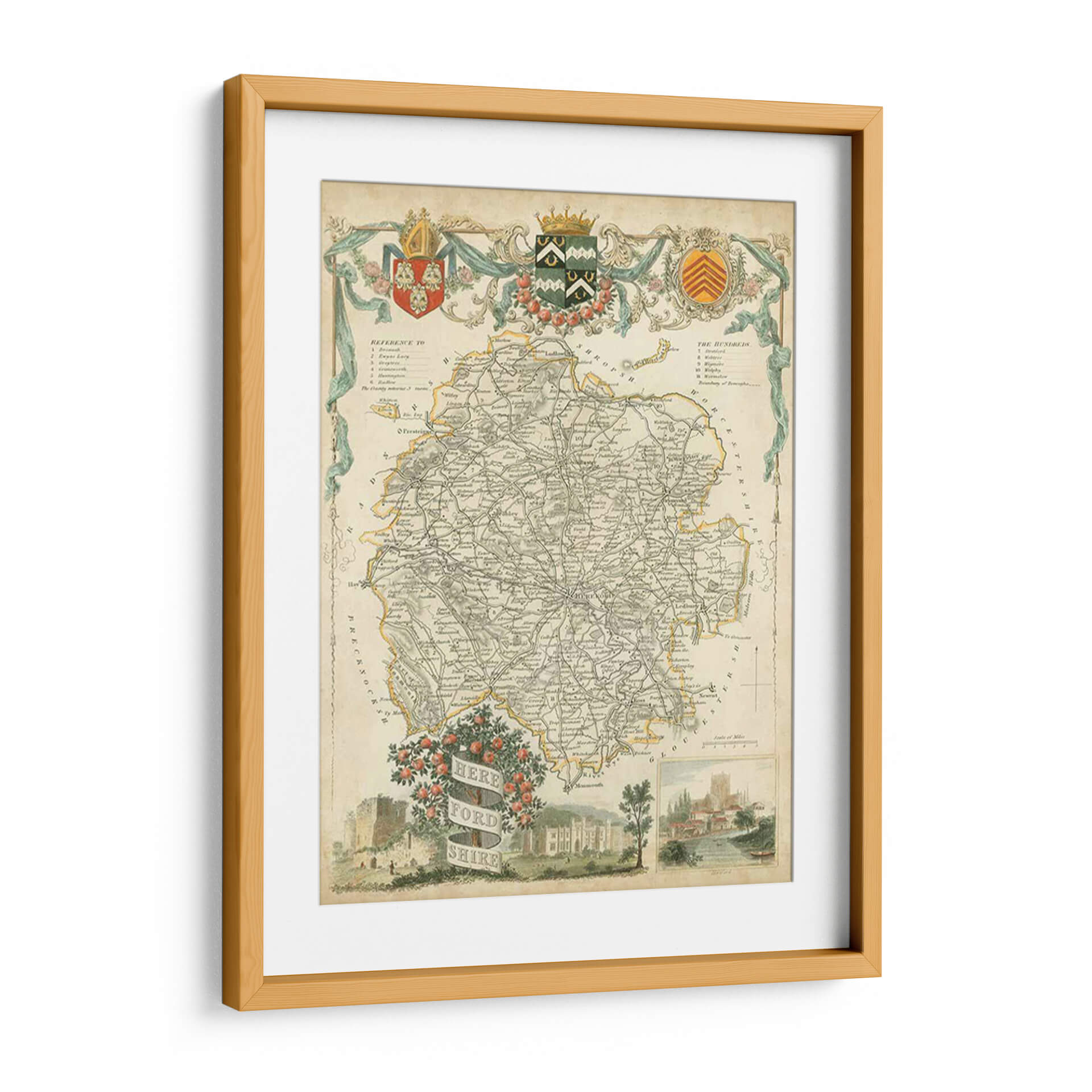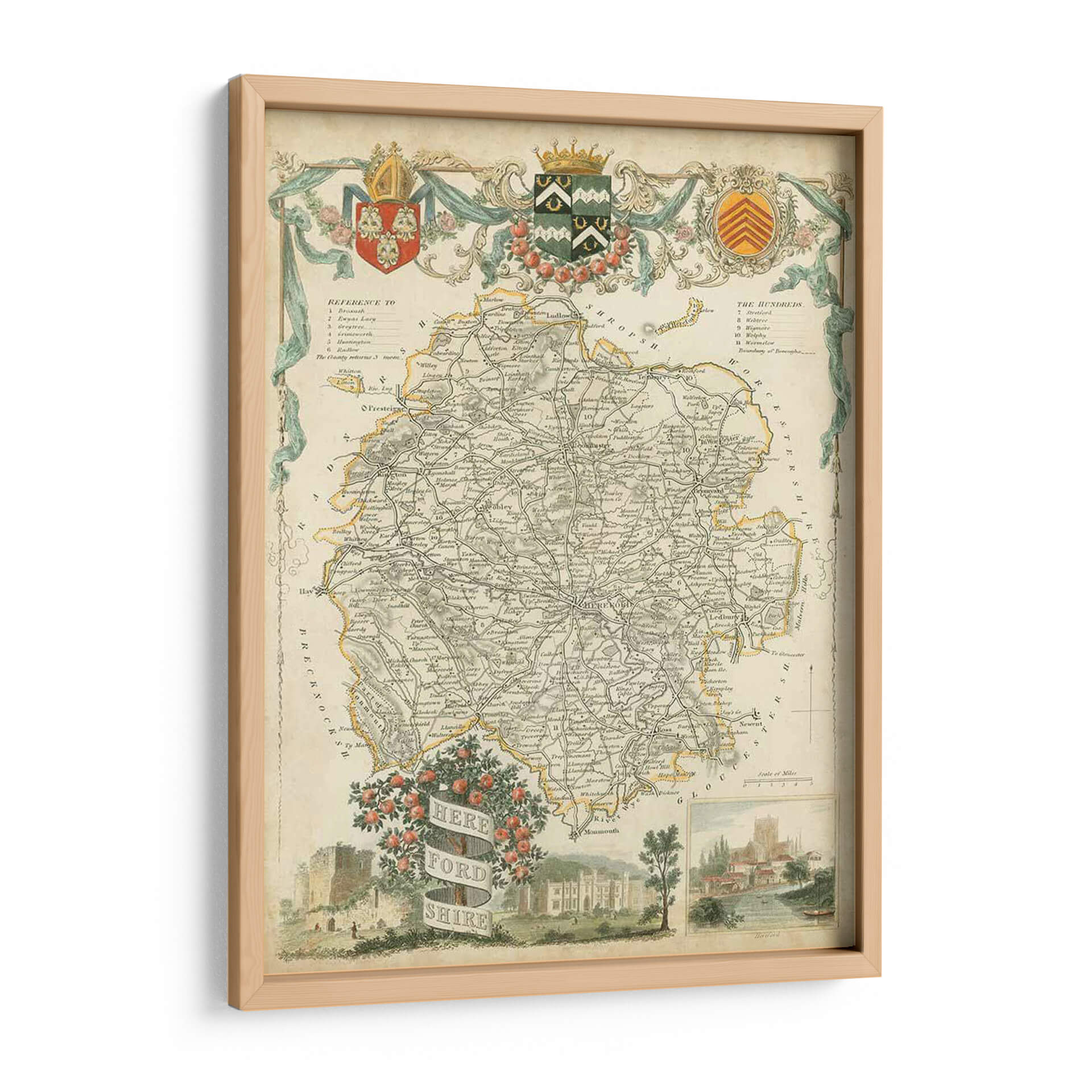 Sumérgete en la rica historia y el detalle intrincado con este exquisito cuadro decorativo del Mapa de Herefordshire. Esta obra de arte, inspirada en mapas antiguos, presenta una paleta de colores apagados y terrosos, con acentos sutiles de amarillo y verde que aportan un toque de vitalidad. La composición se centra en la detallada representación de un mapa geográfico, con una intrincada red de carreteras, nombres de pueblos y características geográficas, todo ello enmarcado por elementos ornamentales clásicos que evocan una sensación de elegancia atemporal. En la parte inferior, una escena pintoresca con un castillo, una mansión y un paisaje fluvial añade profundidad y un encanto rústico, invitando a la contemplación. Este mapa decorativo es una pieza perfecta para añadir un toque de sofisticación y un aire de descubrimiento a cualquier espacio, ya sea una sala de estar, un estudio o una oficina. Ideal para amantes de la historia, la geografía o para quienes buscan una decoración de pared única y con carácter.