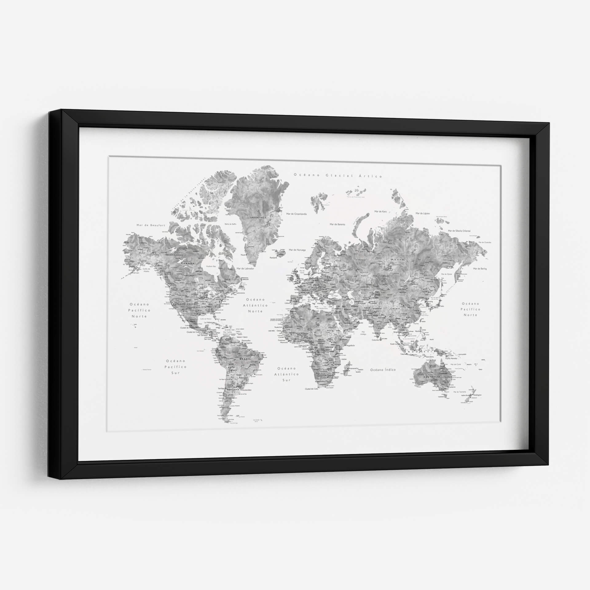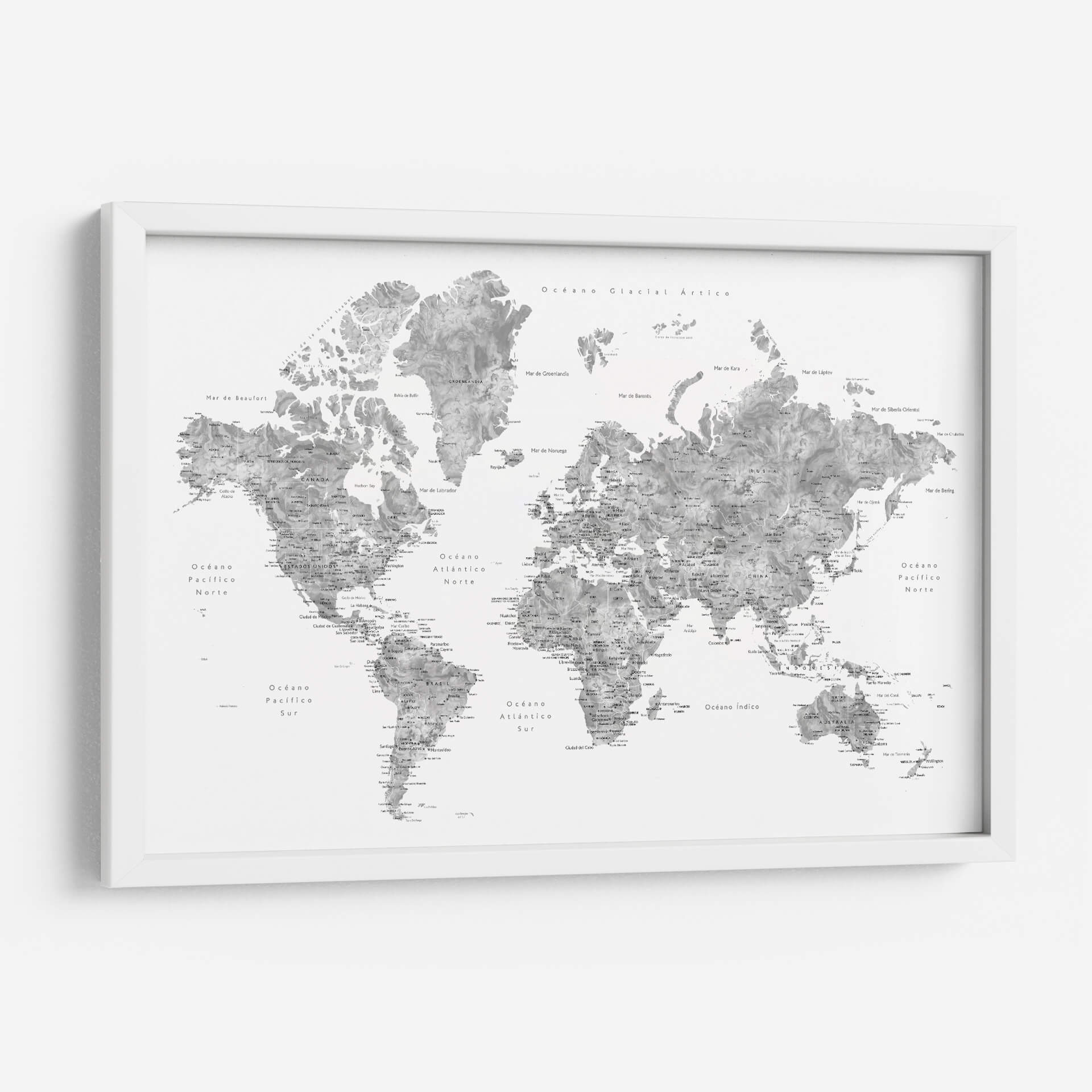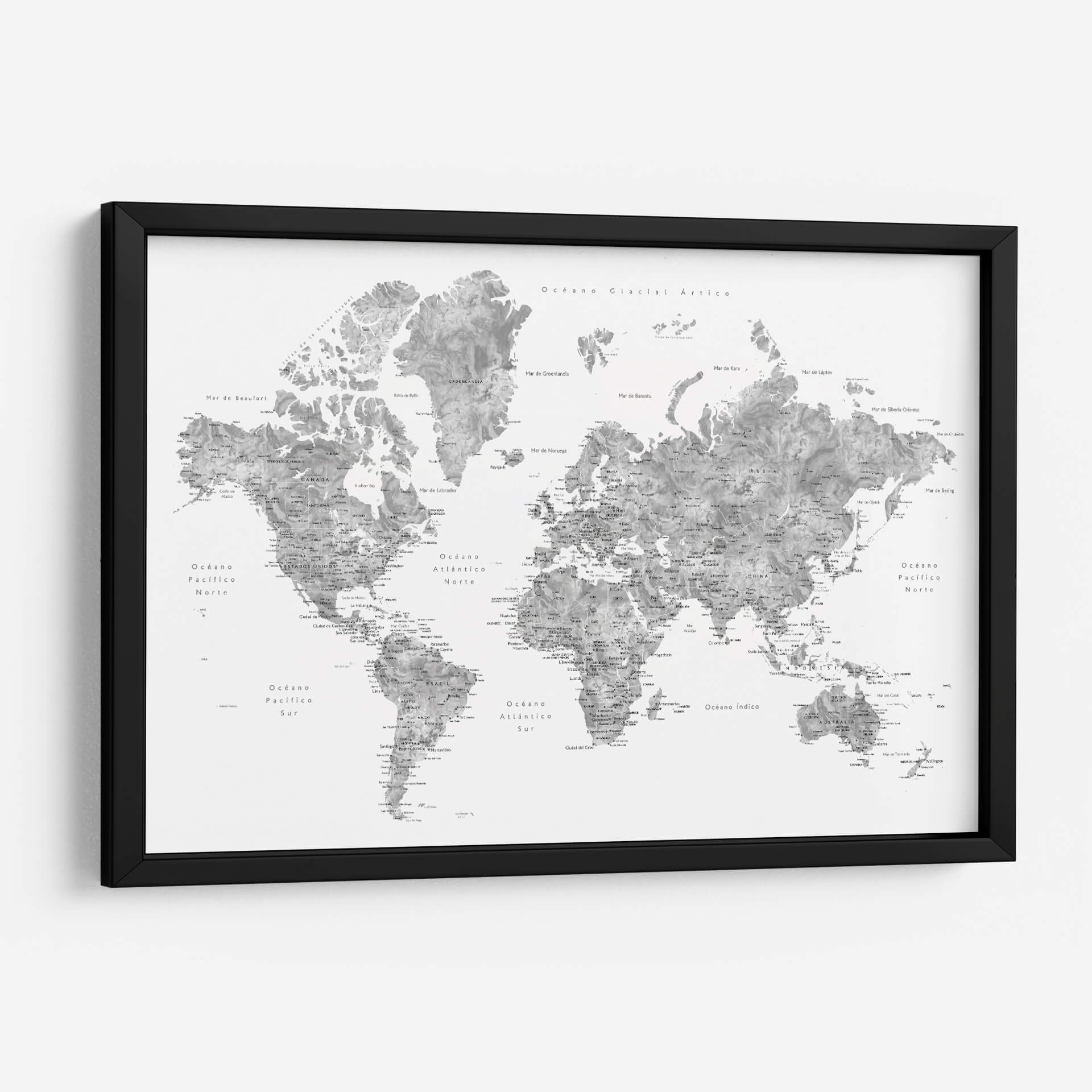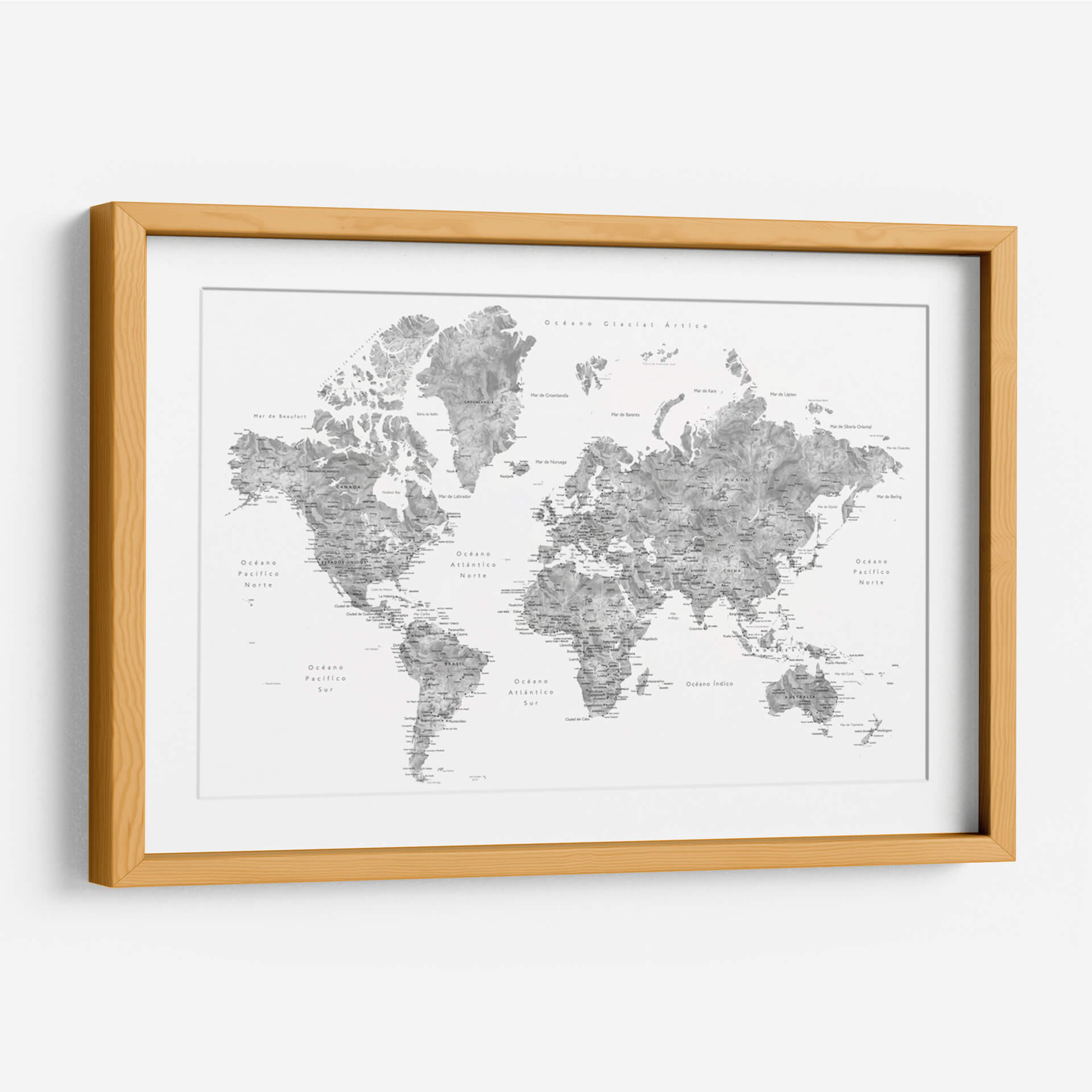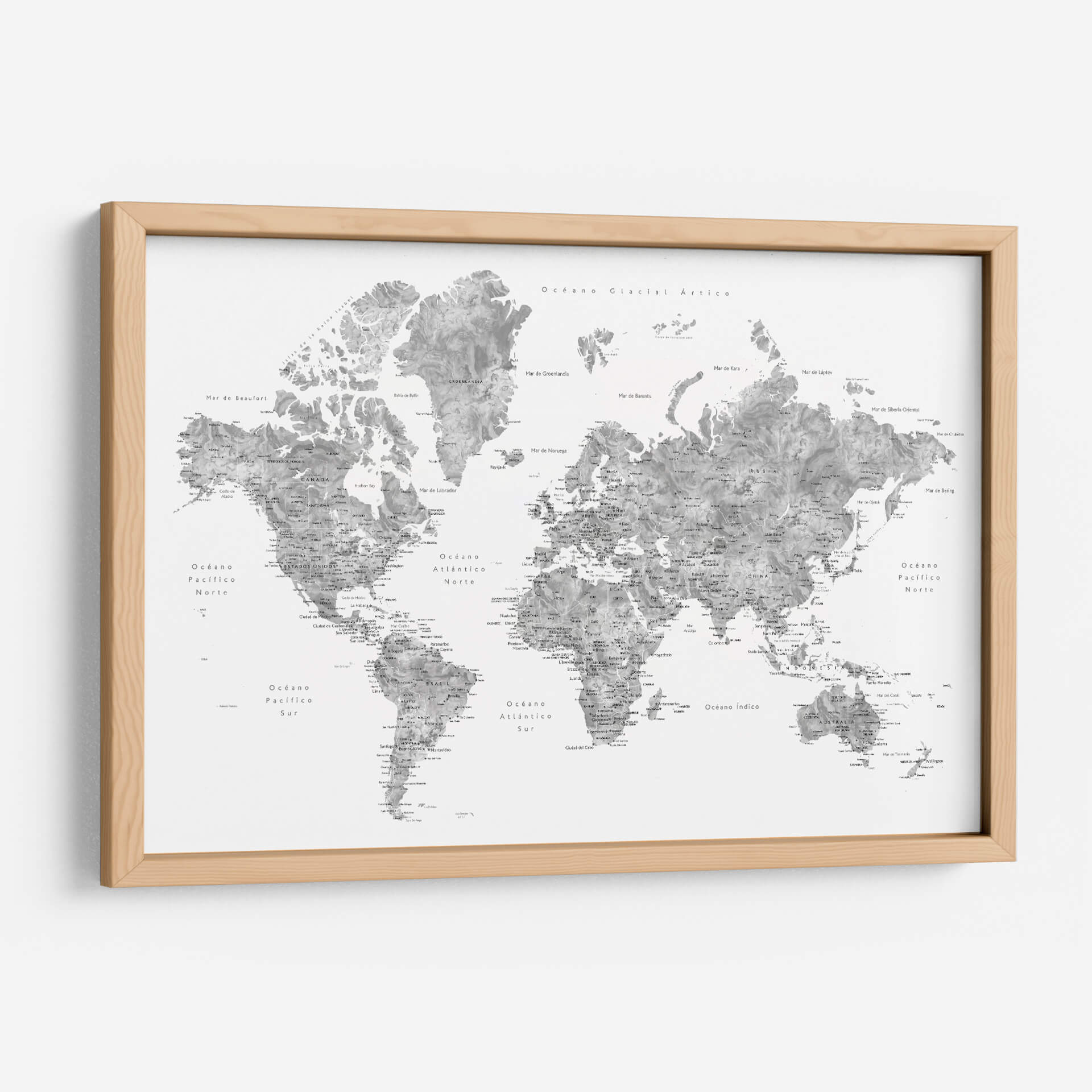 Transforma tu espacio con este cautivador cuadro decorativo del mapa mundial en español. Diseñado con un estilo topográfico monocromático en tonos de gris y blanco, esta pieza evoca una sensación de exploración y conocimiento geográfico. Cada detalle, desde las cordilleras prominentes hasta las vastas extensiones oceánicas, está representado con una claridad impresionante, invitando a la contemplación y al descubrimiento. La sutileza de su paleta de colores lo convierte en un complemento versátil para cualquier decoración, aportando un toque de sofisticación y cultura sin sobrecargar el ambiente. Ideal para oficinas, estudios o salas de estar, este mapa mundi es más que una simple decoración; es una herramienta para soñar con viajes, planificar aventuras o simplemente apreciar la belleza de nuestro planeta. Su diseño detallado y su ejecución artística lo convierten en una obra maestra contemporánea, perfecta para inspirar conversaciones y despertar la curiosidad en quienes la admiren. Añade un elemento educativo y estético a tu hogar o lugar de trabajo con este impresionante cuadro del mapa mundial.