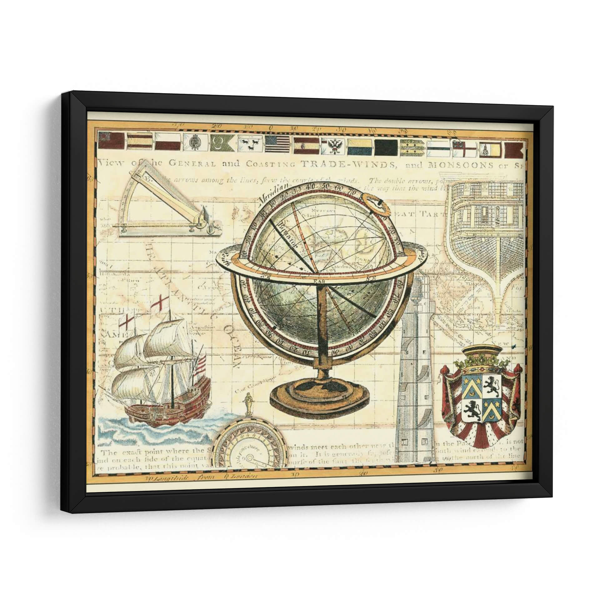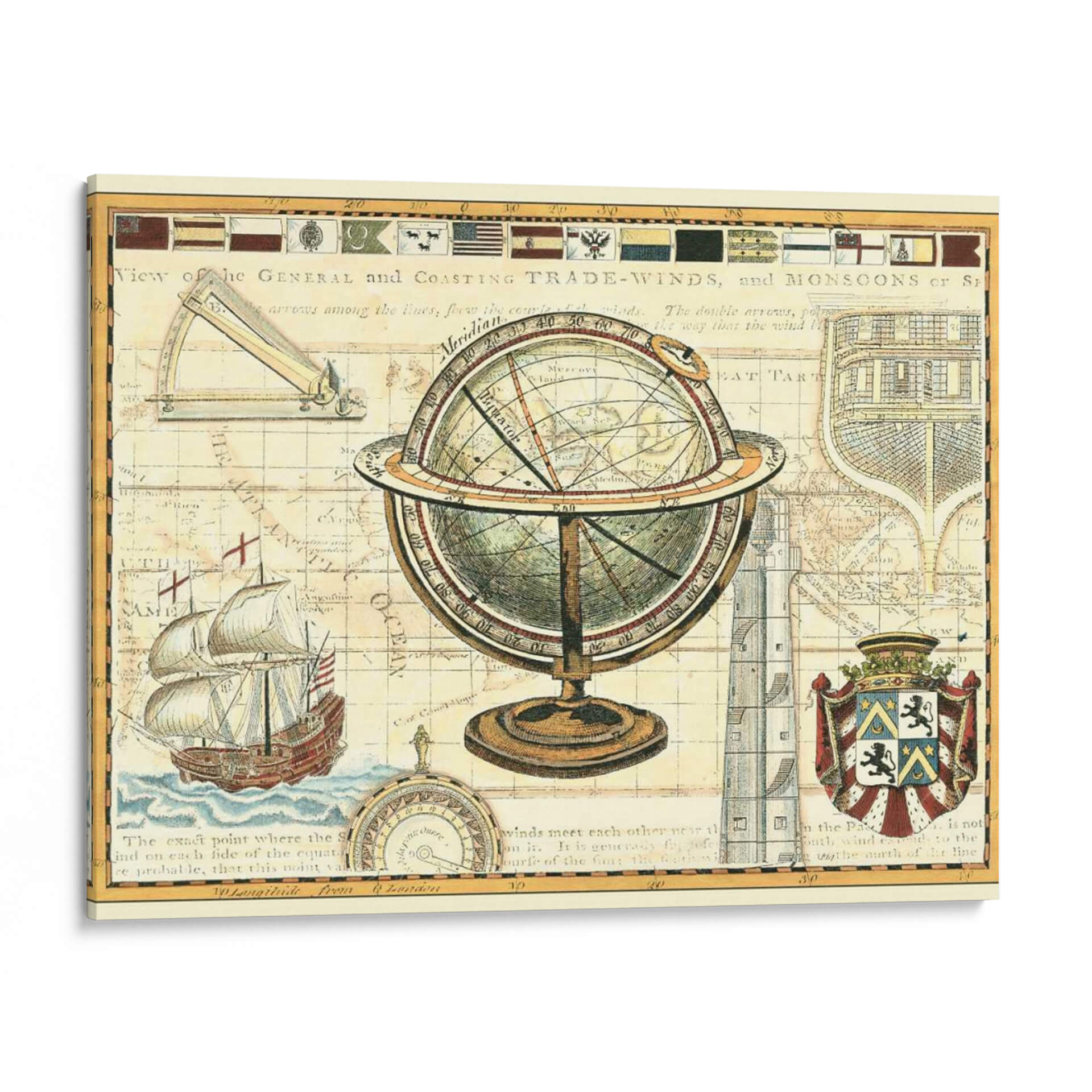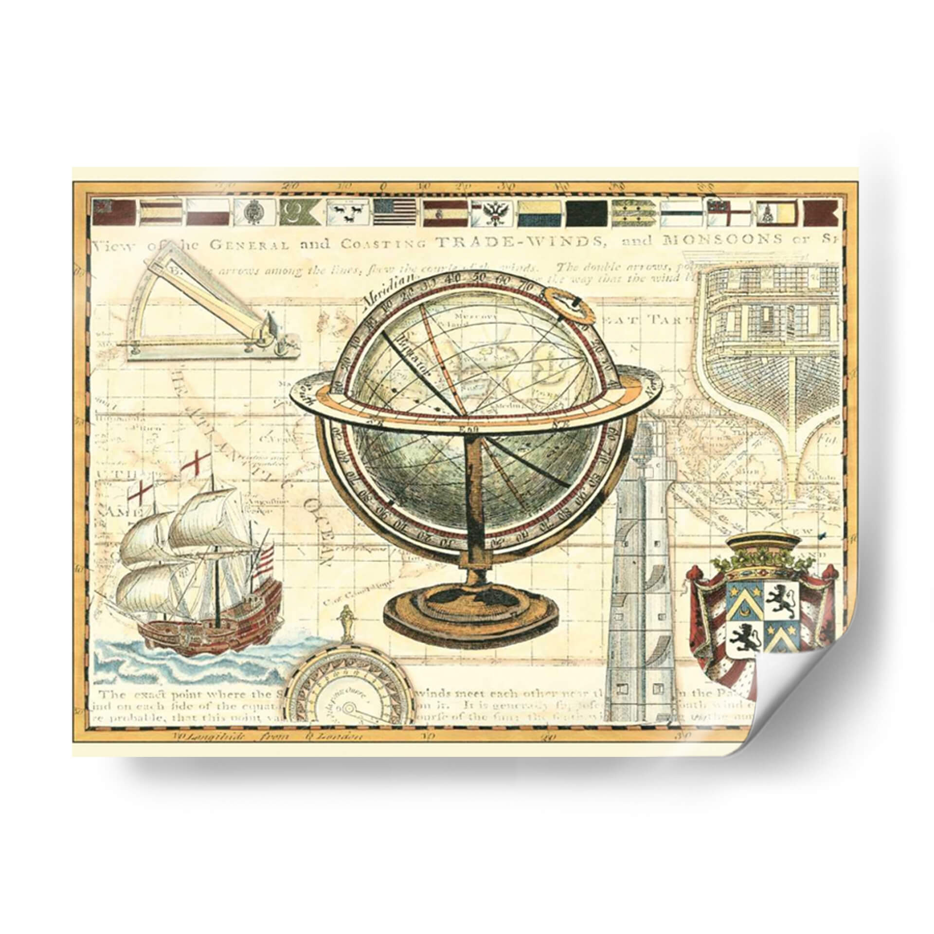 Sumérgete en la rica historia de la exploración y el descubrimiento con este cautivador cuadro decorativo 'Mapa Náutico II'. La obra recrea la atmósfera de los antiguos mapas cartográficos, presentando un detallado globo terráqueo de latón sobre un fondo que evoca los pergaminos del pasado. Observa la intrincada representación de rutas marítimas, vientos y elementos geográficos que transportan la imaginación a una era de grandes navegantes. Los colores cálidos, ocres y tonos tierra predominantes, junto con sutiles acentos de rojo y azul, confieren a la pieza una sensación de autenticidad y calidez, perfecta para cualquier espacio que busque un toque de aventura y conocimiento. Este cuadro decorativo es ideal para estudios, oficinas o salas de estar, aportando un aire de erudición y sofisticación. Su estilo vintage y tematica de navegación lo convierten en un punto focal único, invitando a la conversación y al asombro. Cada detalle, desde el buque de vela hasta la rosa de los vientos y los escudos de armas, cuenta una historia de viajes y descubrimiento. Añade una dimensión de intriga y aprendizaje a tu decoración con esta pieza excepcional de Vision Studio.