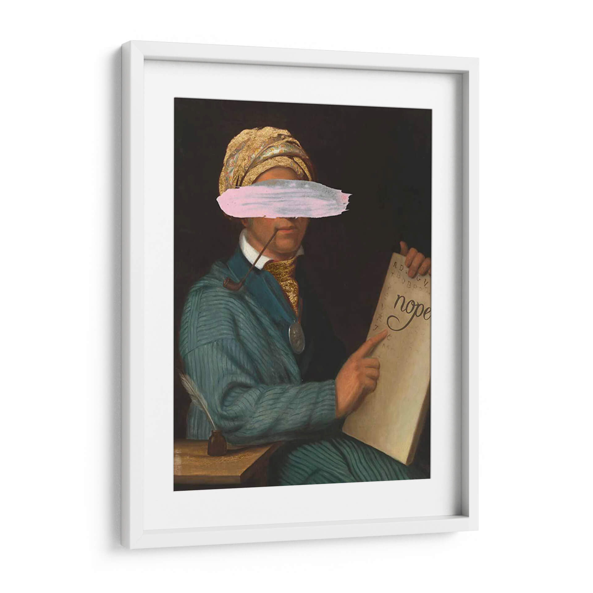 Sumérgete en el enigmático mundo de "Sequoyah Enmascarada" de Jennifer Goldberger, una obra de arte contemporáneo que desafía las convenciones. Este cautivador cuadro decorativo presenta un retrato clásico intervenido con audaces pinceladas abstractas, creando un diálogo fascinante entre lo tradicional y lo moderno. La figura central, ataviada con un turbante dorado texturizado y vestimenta de rayas finas en tonos azul verdoso, sostiene un pergamino que revela la palabra "nope" en una caligrafía expresiva, mientras una mancha de color rosa pálido cubre su rostro, añadiendo una capa de misterio y comentario social. La paleta de colores, dominada por profundos fondos oscuros, acentos dorados y los vibrantes tonos de la vestimenta, crea un contraste visual impactante. El estilo, que fusiona el realismo académico con elementos surrealistas y pop, invita a la reflexión sobre la identidad, la comunicación y la percepción. Ideal para salones modernos, estudios o espacios que buscan una pieza de conversación que inspire intriga y debate, "Sequoyah Enmascarada" es un testimonio del poder del arte para provocar y emocionar. Añade un toque de originalidad y audacia a tu decoración con este cuadro decorativo único.