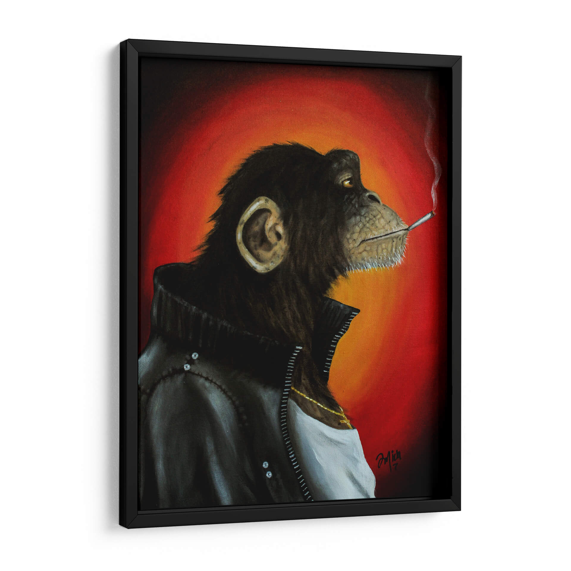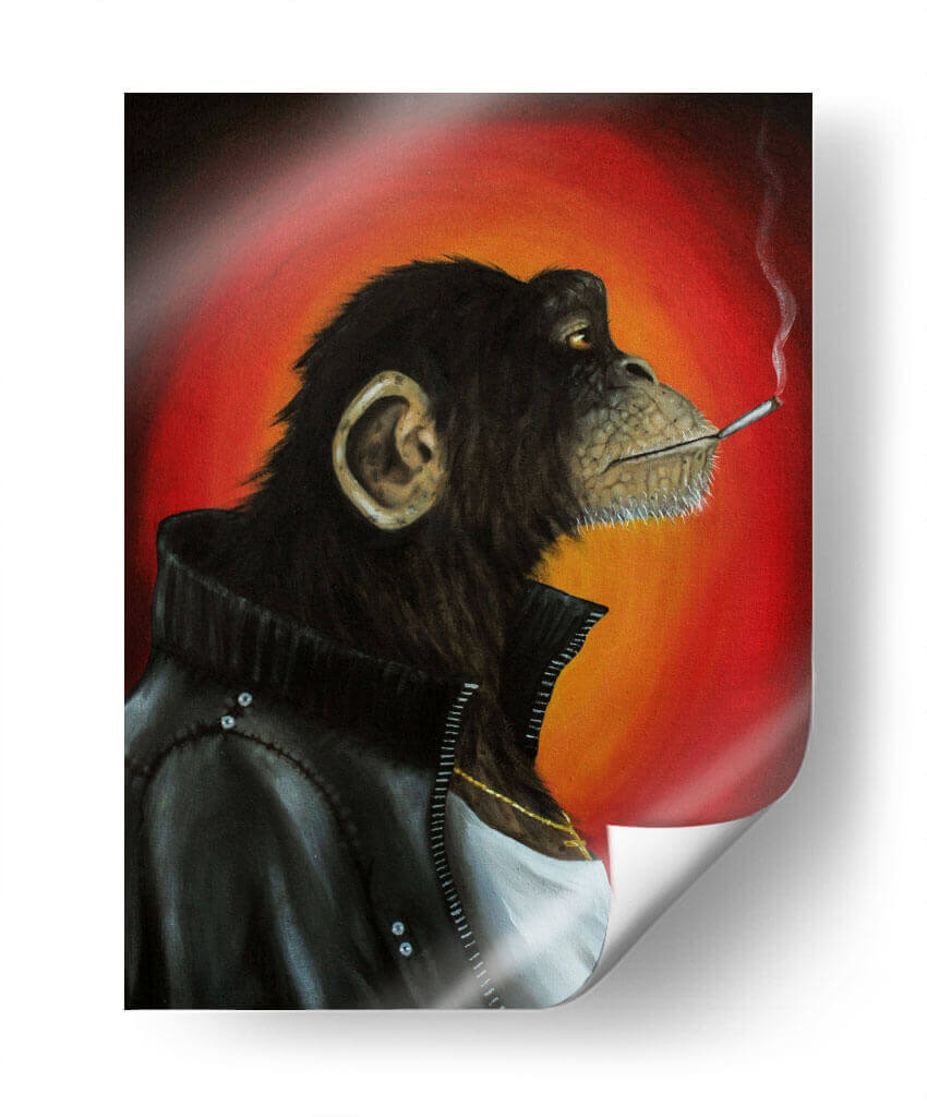 Adéntrate en el intrigante mundo de Marce Islas con "NOT MY CIRCUS", una obra de arte que desafía convenciones y captura la imaginación. Esta pieza presenta un retrato evocador de un chimpancé, vestindo una chaqueta de cuero y fumando un cigarrillo, enmarcado por un vibrante fondo degradado de rojos intensos y naranjas ardientes. La técnica detallada de Islas resalta la textura del pelaje del animal y el brillo del cuero, creando una imagen impactante y llena de carácter. El estilo figurativo, con un toque de realismo y una atmósfera casi cinematográfica, invita a la reflexión sobre la dualidad y la individualidad. Los tonos cálidos y saturados del fondo generan un contraste dramático con la figura central, añadiendo profundidad y energía a la composición. "NOT MY CIRCUS" es ideal para espacios que buscan un toque audaz y contemporáneo, como salas de estar, estudios o oficinas, donde su presencia no solo adornará la pared, sino que también iniciará conversaciones y aportará un aire de sofisticación rebelde. Permite que esta obra maestra aporte una dosis de personalidad y estilo único a tu decoración, celebrando la singularidad y la fuerza interior.