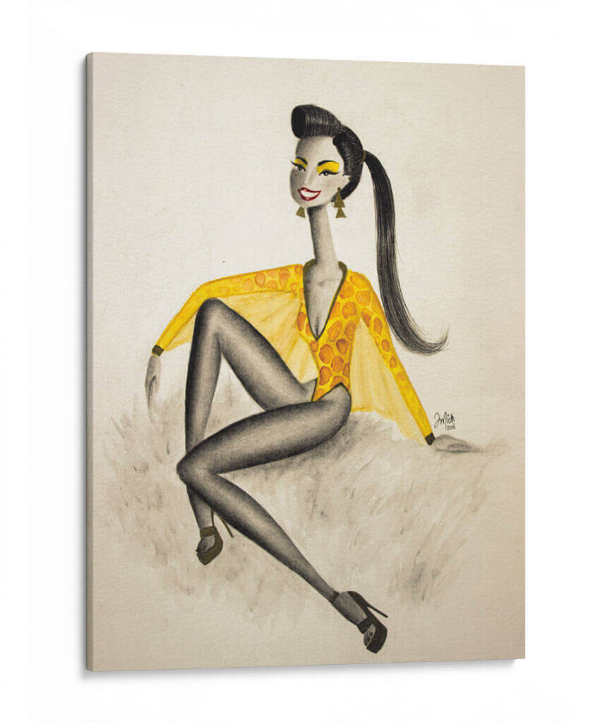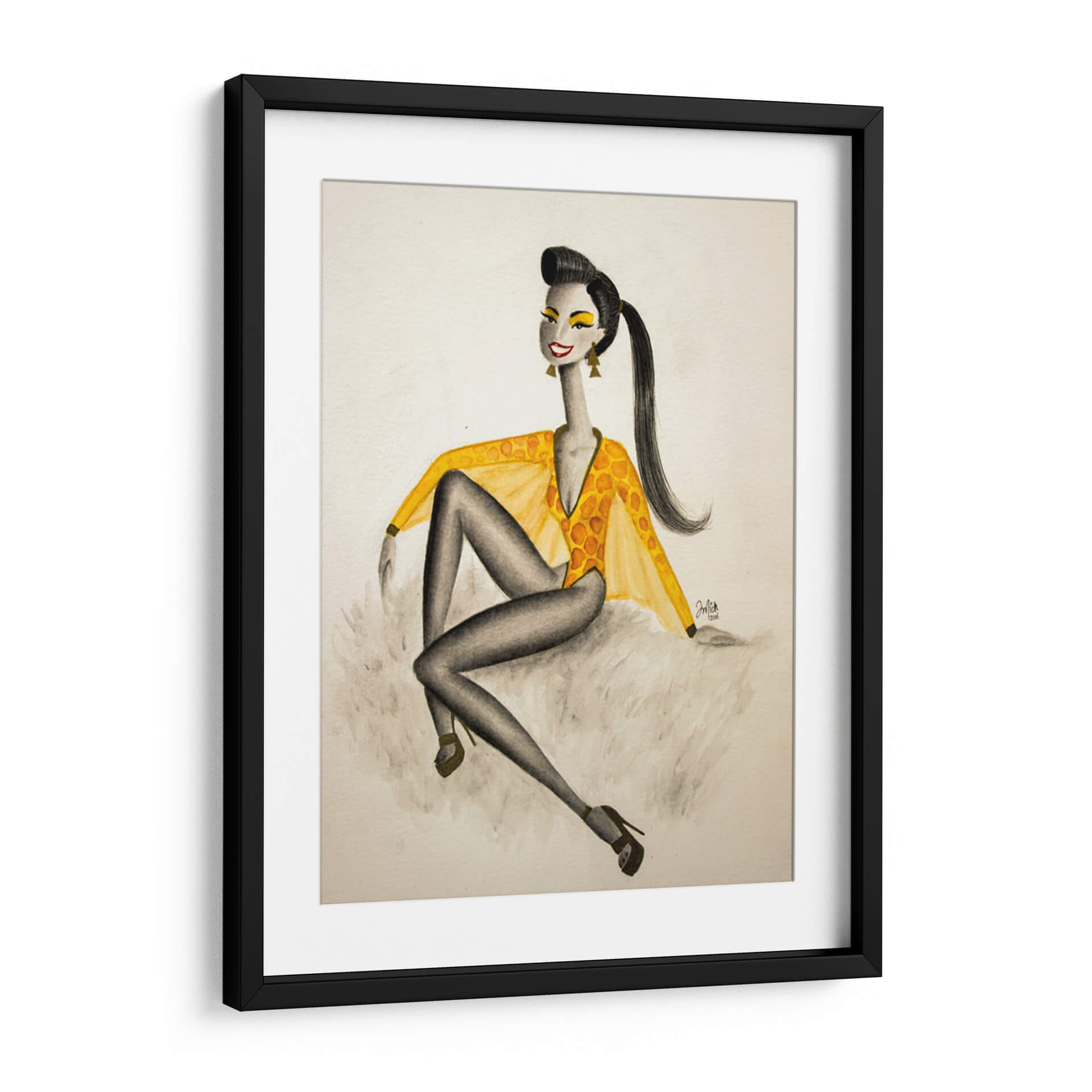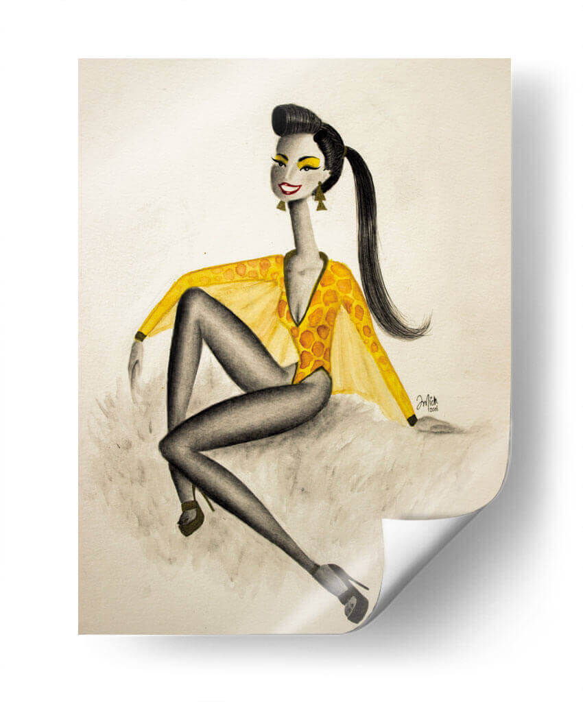 Descubre la cautivadora obra "POSE" de Marce Islas, una pieza que irradia estilo y elegancia. Esta ilustración de moda contemporánea presenta a una figura femenina estilizada con una pose dinámica, ataviada con un vibrante vestido amarillo con un patrón audaz. La paleta de colores se centra en contrastes llamativos, con el amarillo brillante del atuendo de la figura en marcado contraste con sus medias oscuras y el fondo neutro, creando un efecto visual potente. El estilo artístico combina trazos de lápiz con toques de color, evocando la atmósfera de las revistas de moda clásicas y el glamour de la alta costura. La expresión segura de la modelo y su postura sugerente invitan a la contemplación, transmitiendo una sensación de confianza y sofisticación. Este cuadro decorativo es perfecto para añadir un toque de personalidad y un acento de color a cualquier espacio moderno, ya sea una sala de estar, un dormitorio o un estudio de moda. Su diseño único y su carácter audaz la convierten en una elección excepcional para aquellos que buscan arte que hable por sí mismo y añada un toque de distinción a su decoración.