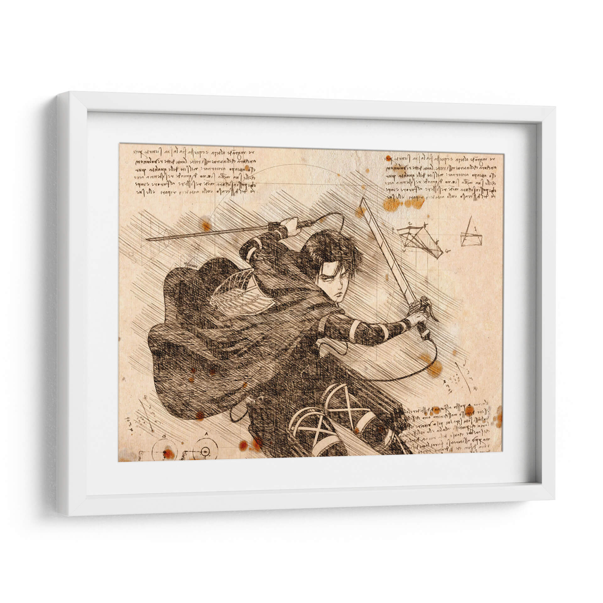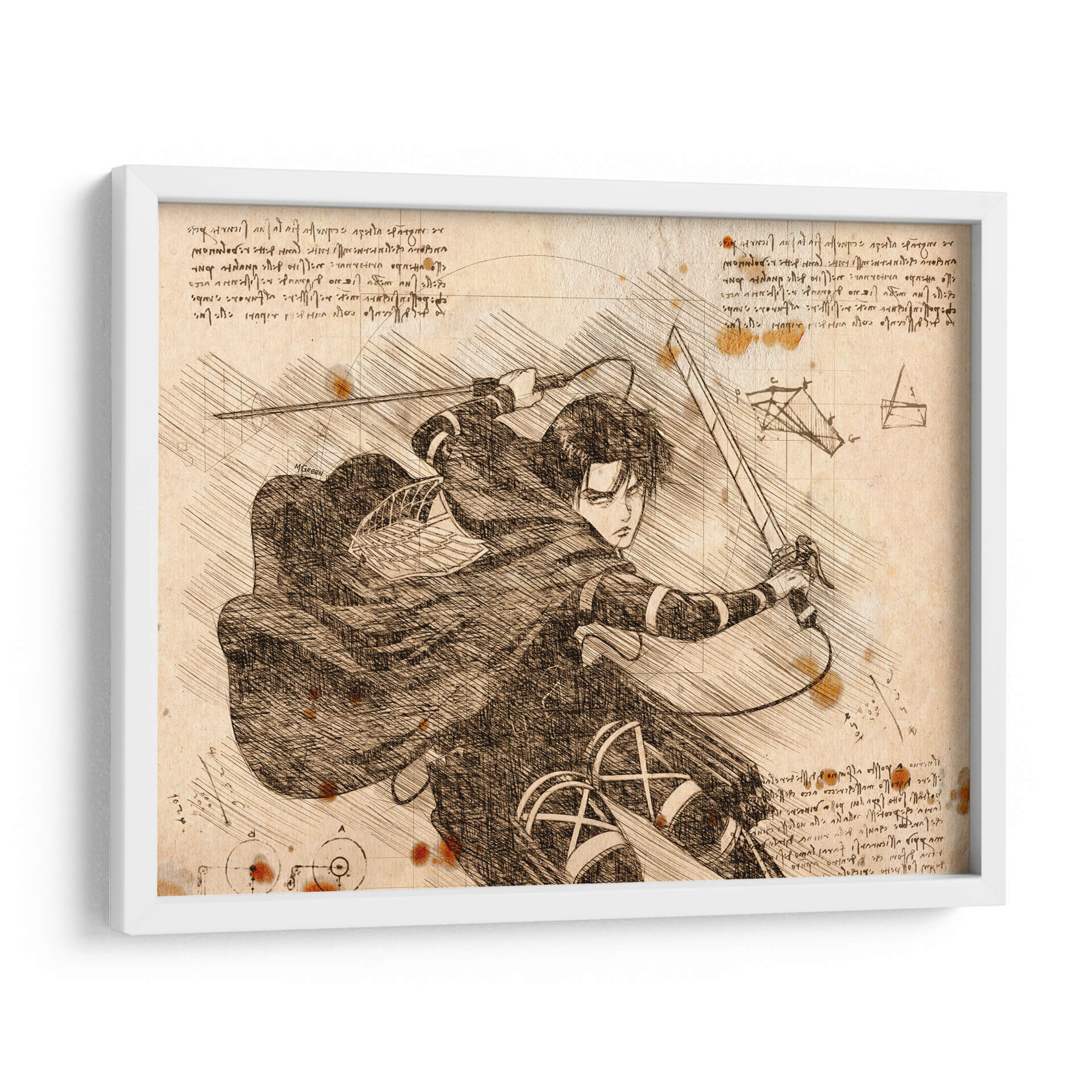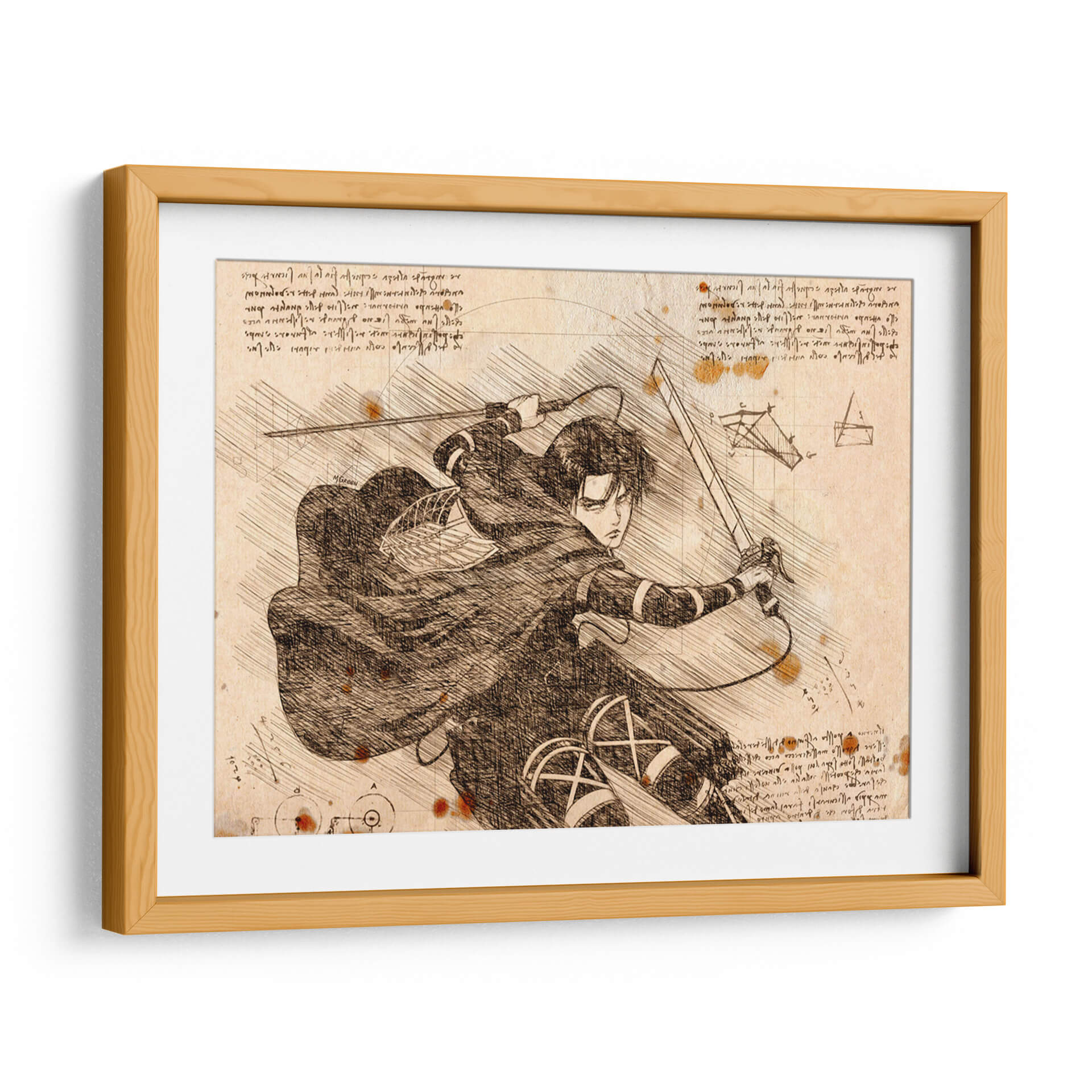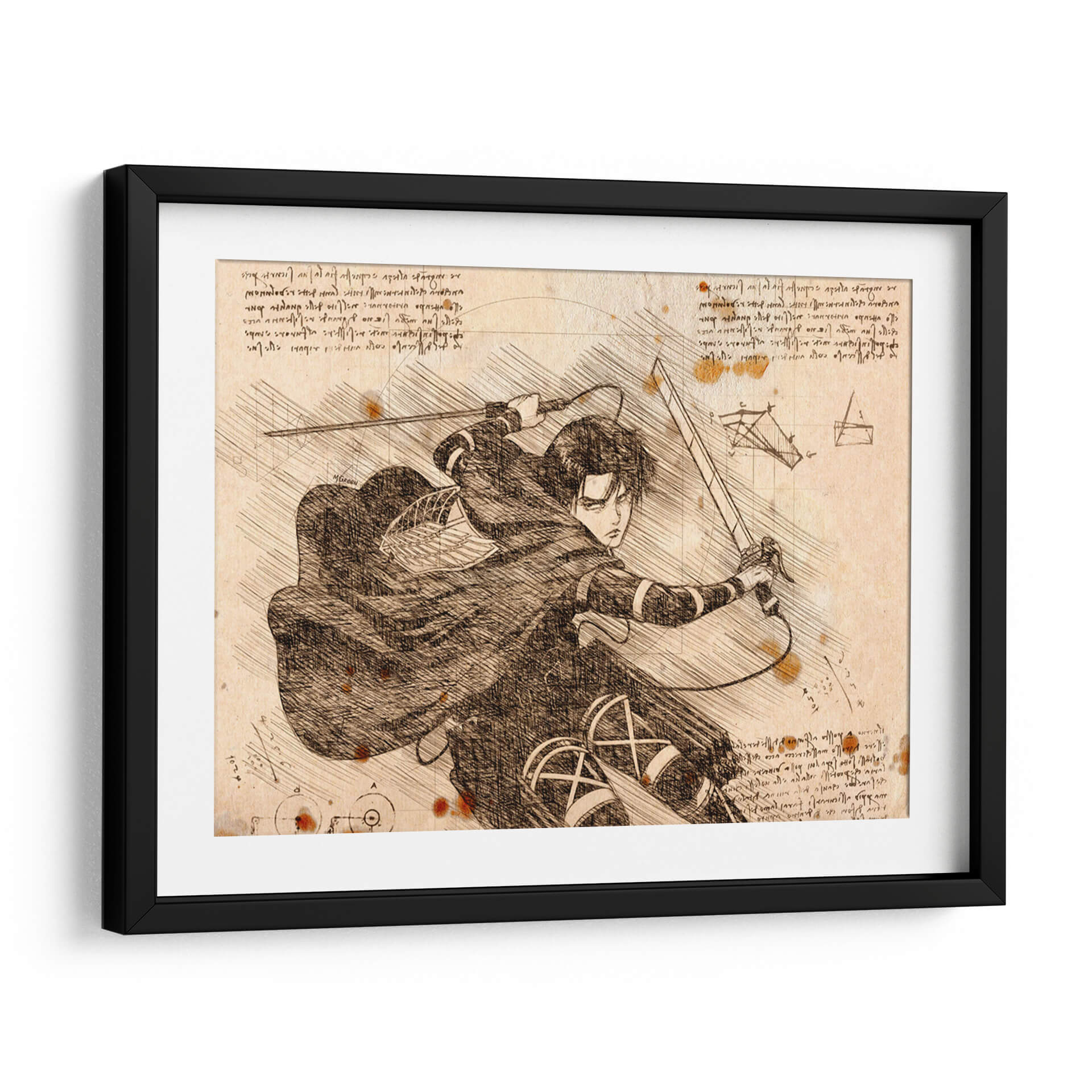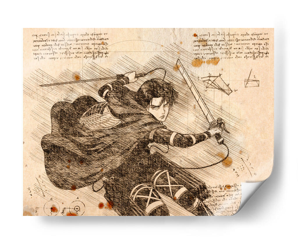 Sumérgete en la intensidad y el estilo de "Levi descripción - DaVinci Style" de Marco Green, una obra de arte que fusiona la estética del boceto renacentista con la energía de un personaje icónico. Este cuadro decorativo presenta una figura masculina decidida, empuñando espadas con una pose dinámica que evoca acción y determinación. La paleta de colores sepia y ocre, junto con las texturas que recuerdan a viejos manuscritos y estudios anatómicos, crea una atmósfera de profundidad histórica y misterio. Los trazos a lápiz y las notas marginales que rodean la figura principal añaden un toque de autenticidad y el encanto del proceso creativo. Ideal para espacios que buscan un carácter distintivo y una conexión con el arte clásico reinterpretado de forma moderna, como estudios, oficinas o salas de estar con un toque intelectual. Transforma tu pared con esta pieza que combina el arte del dibujo con la narrativa visual, ofreciendo un punto focal intrigante y sofisticado. Una decoración de pared que habla de disciplina, fuerza y un legado artístico perdurable, perfecta para los amantes del arte y los coleccionistas que aprecian la maestría en cada detalle. Añade un toque de genio a tu hogar.