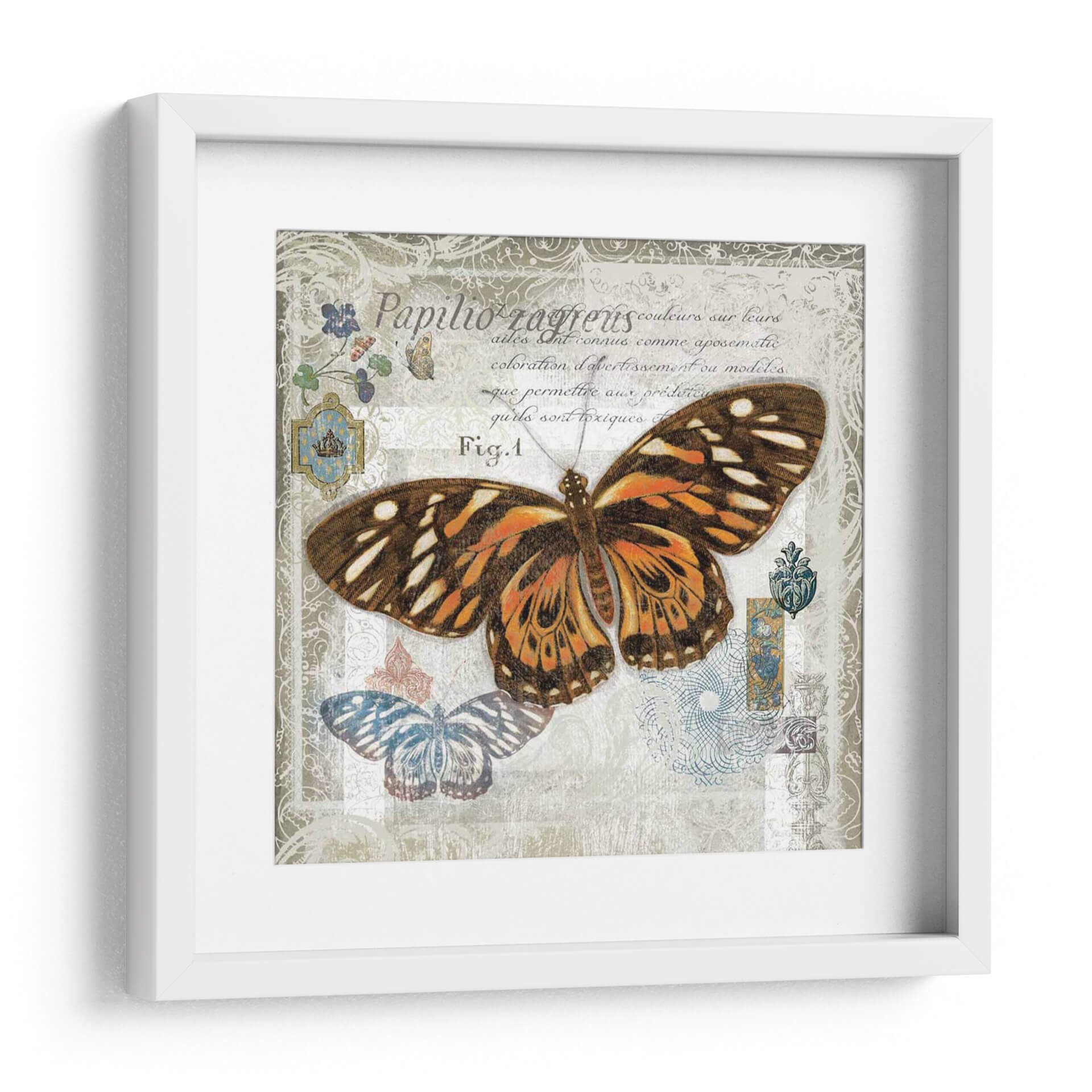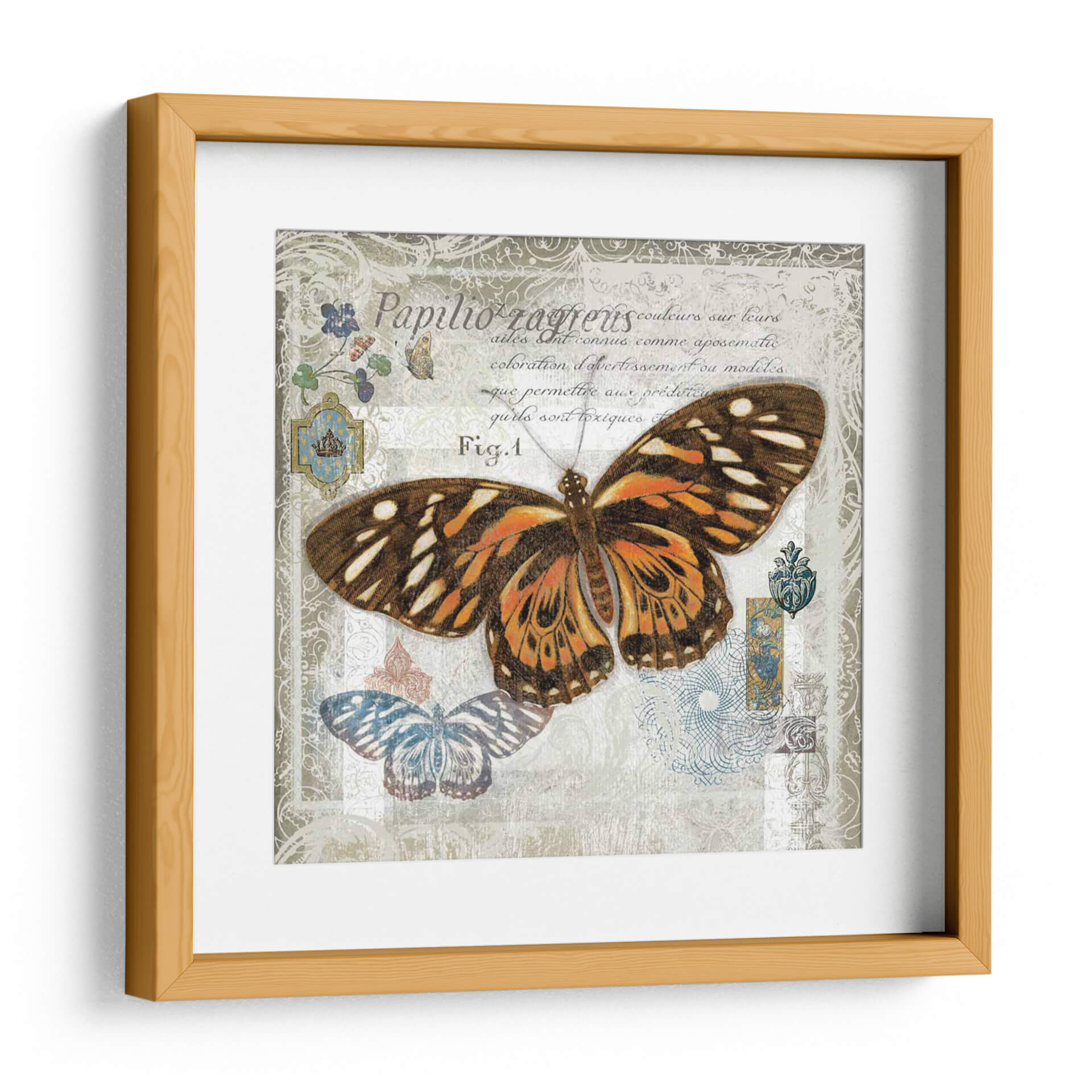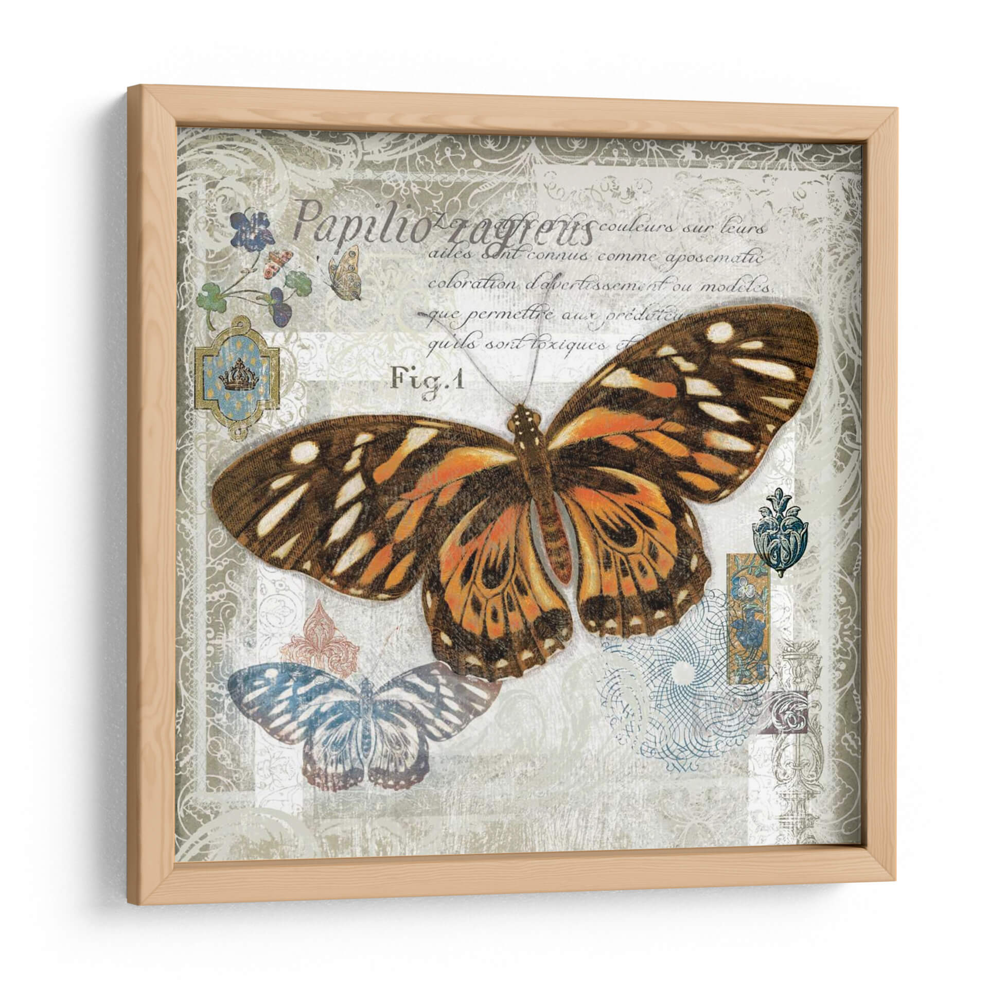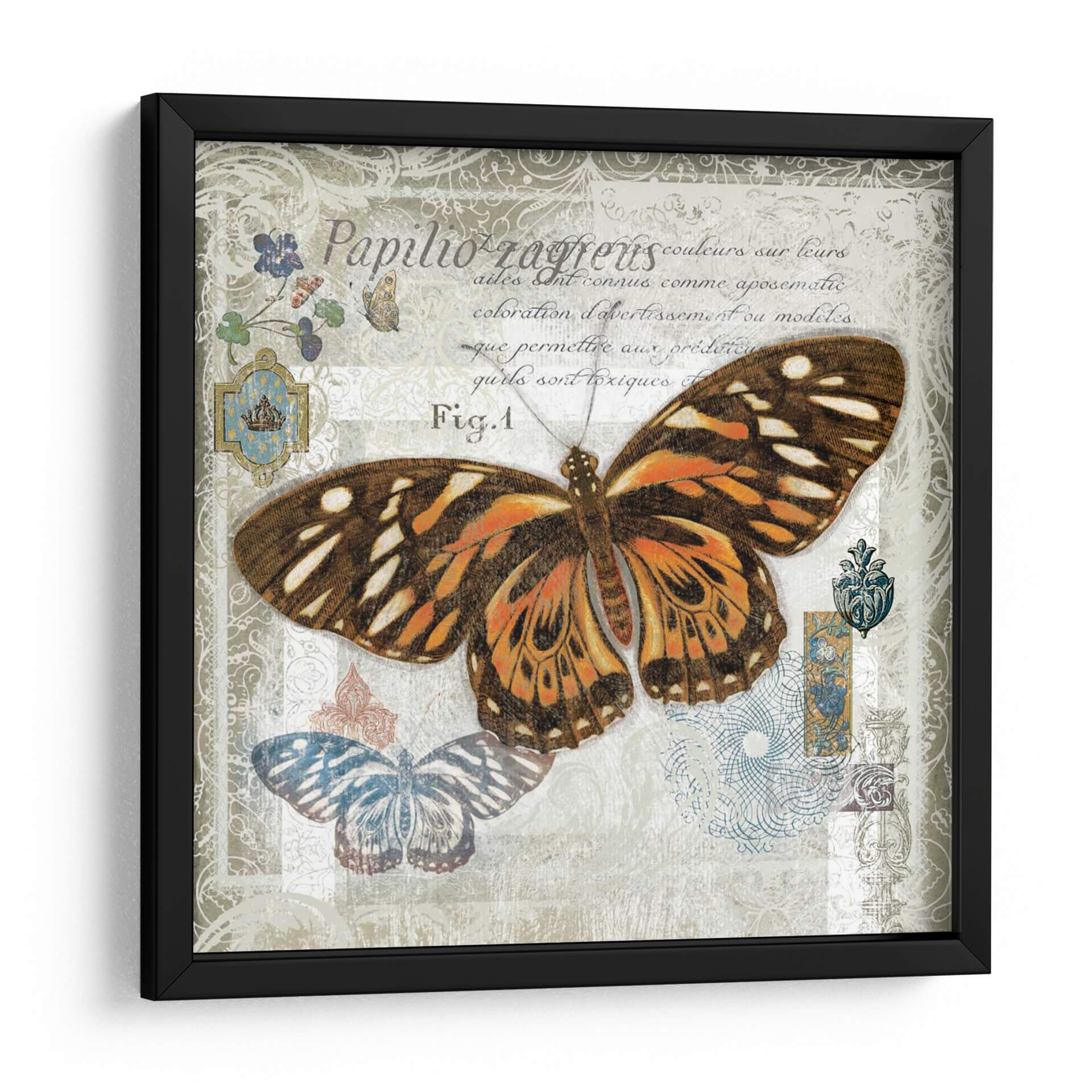 Transforma tu espacio con el cautivador cuadro decorativo 'Artefacto De Mariposa I' de Alan Hopfensperger. Esta obra maestra captura la delicadeza y la vibrante belleza de las mariposas en un estilo visualmente rico. La composición presenta una mariposa principal en tonos naranjas y marrones, con intrincados patrones que atraen la mirada, acompañada por una mariposa secundaria en tonos azules y grises. El fondo, con su textura desgastada y sutiles grabados florales y ornamentales, evoca una sensación de historia y elegancia, reminiscentes de viejos estudios de naturalismo. Los colores, que van desde el cálido naranja hasta los neutros grises y beige, crean una atmósfera sofisticada y serena, perfecta para cualquier hogar u oficina. Este cuadro es ideal para añadir un toque de naturaleza estilizada y un aire de misterio a salones, dormitorios o estudios. Su diseño detallado y la armonía de colores lo convierten en una pieza de conversación que aporta personalidad y distinción a tu decoración.