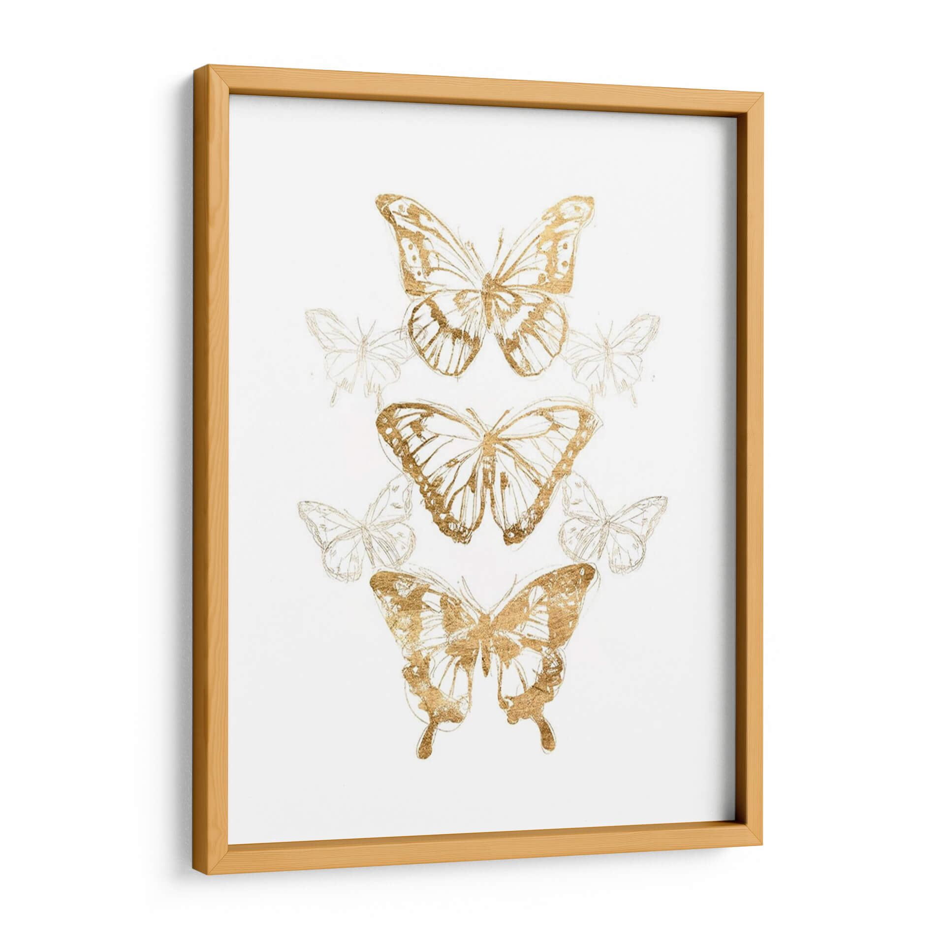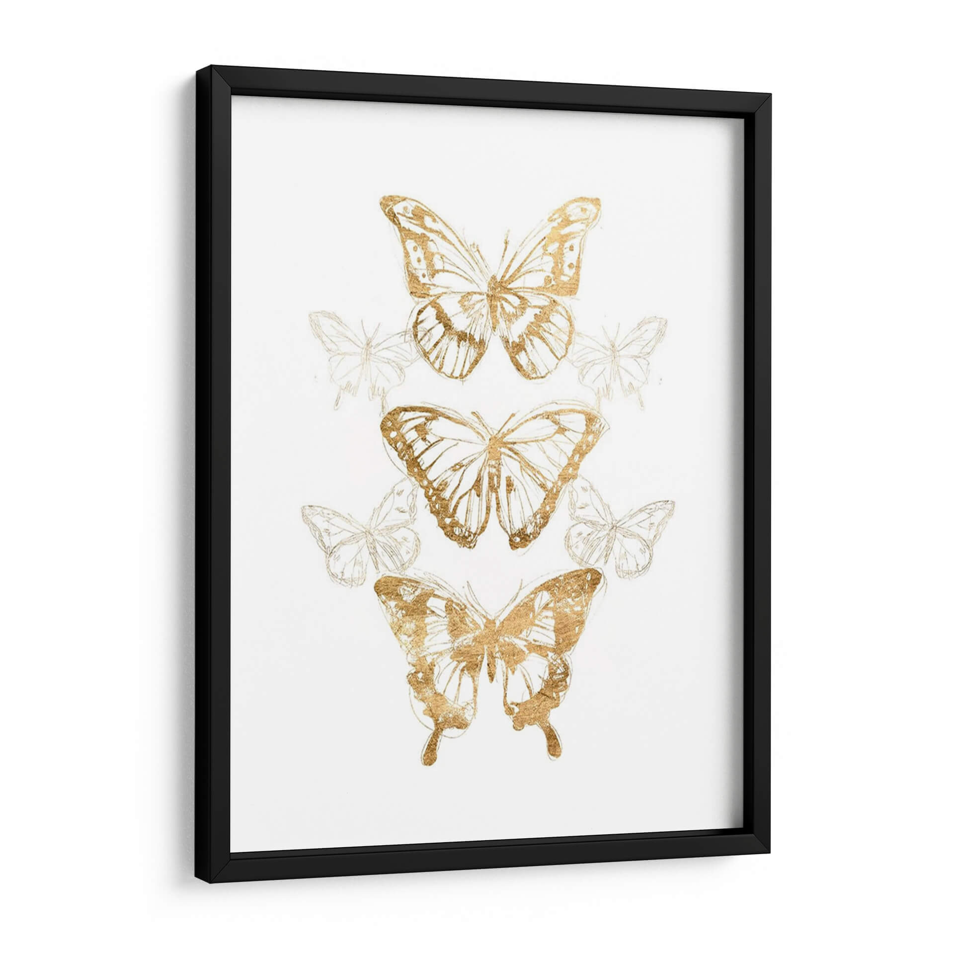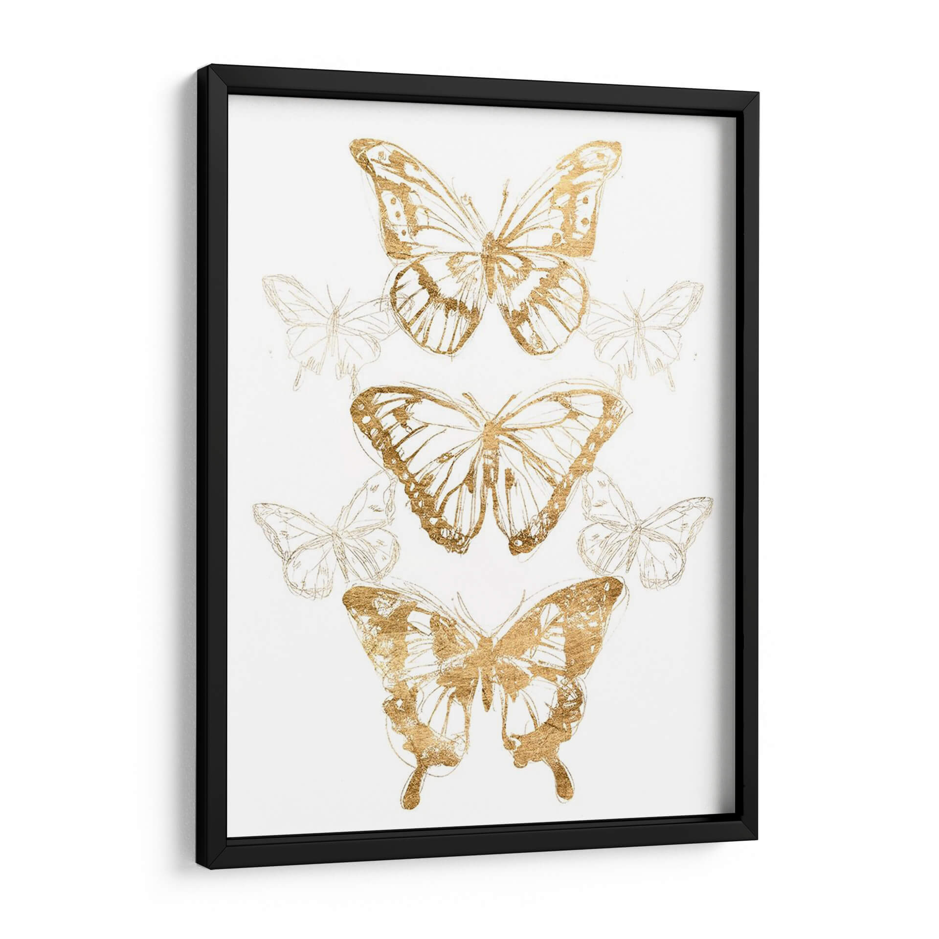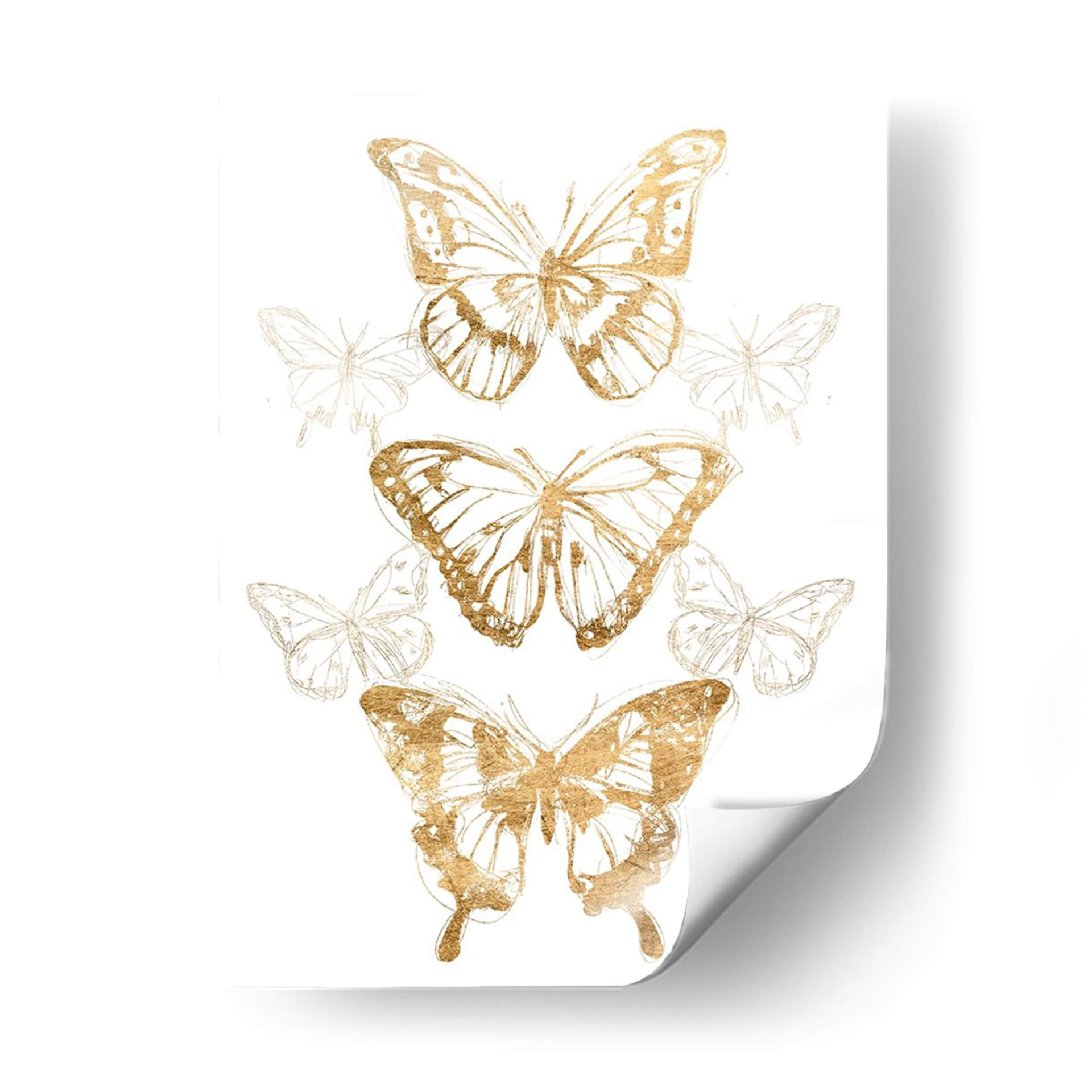 Embellece tu hogar con el 'Contornos De Mariposa De Oro II', una obra de arte exquisita del artista June Erica Vess. Este cautivador cuadro decorativo presenta una delicada composición de mariposas, donde los contornos dorados resaltan con un brillo sutil sobre un fondo blanco limpio, evocando una sensación de ligereza y elegancia. La obra se caracteriza por un estilo que fusiona lo figurativo con toques de arte lineal y abstracto, creando un efecto visual dinámico y sofisticado. Las mariposas, símbolos universales de transformación y belleza, se presentan en distintas fases y tamaños, añadiendo profundidad y movimiento a la pieza. La paleta de colores, centrada en el contraste del oro metálico con el blanco puro, aporta un toque de lujo y modernidad, ideal para cualquier espacio que busque un acento refinado. Este cuadro decorativo es perfecto para añadir un elemento de serenidad y encanto a tu sala de estar, dormitorio o estudio. Su diseño versátil lo convierte en una pieza central que complementa a la perfección una decoración contemporánea, minimalista o incluso bohemia, transformando cualquier pared en una galería personal llena de estilo y significado.