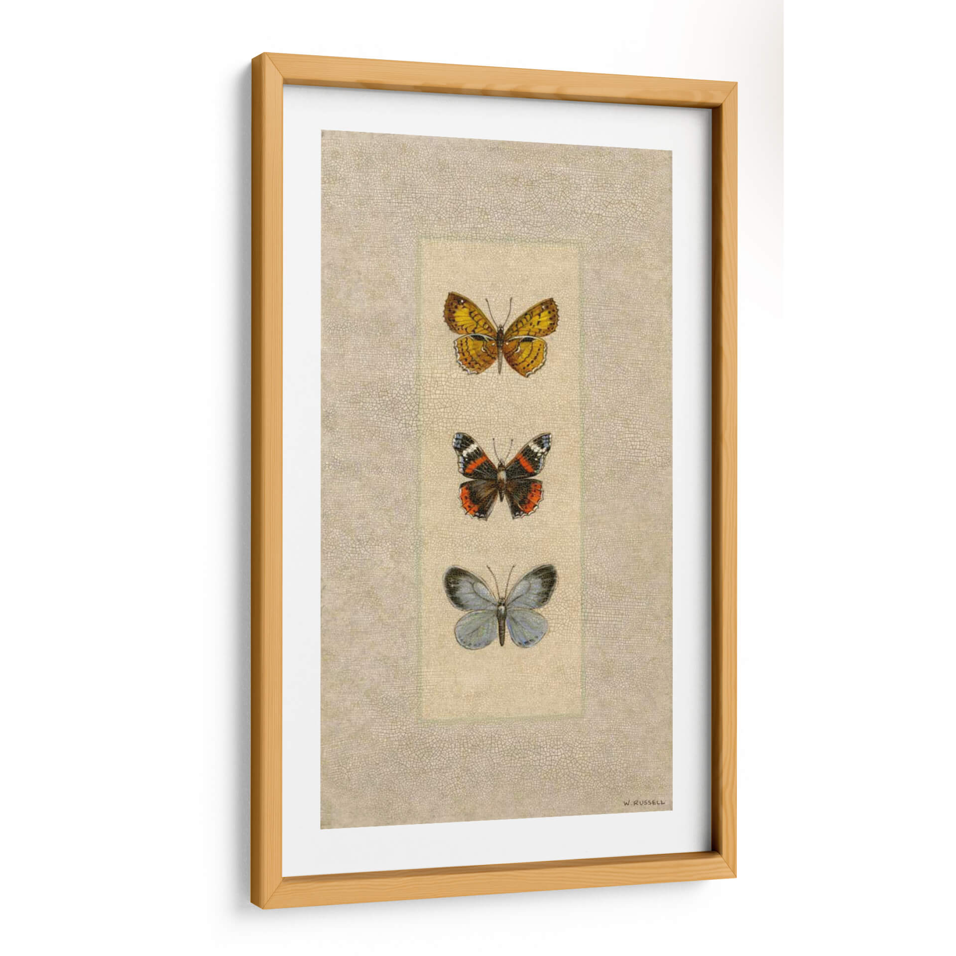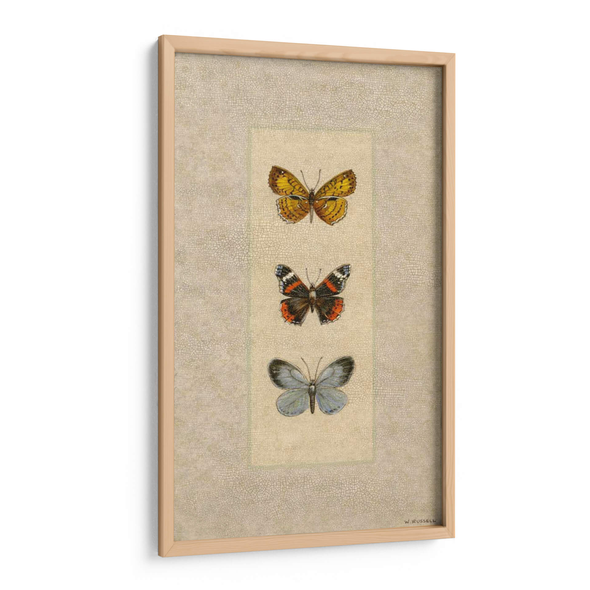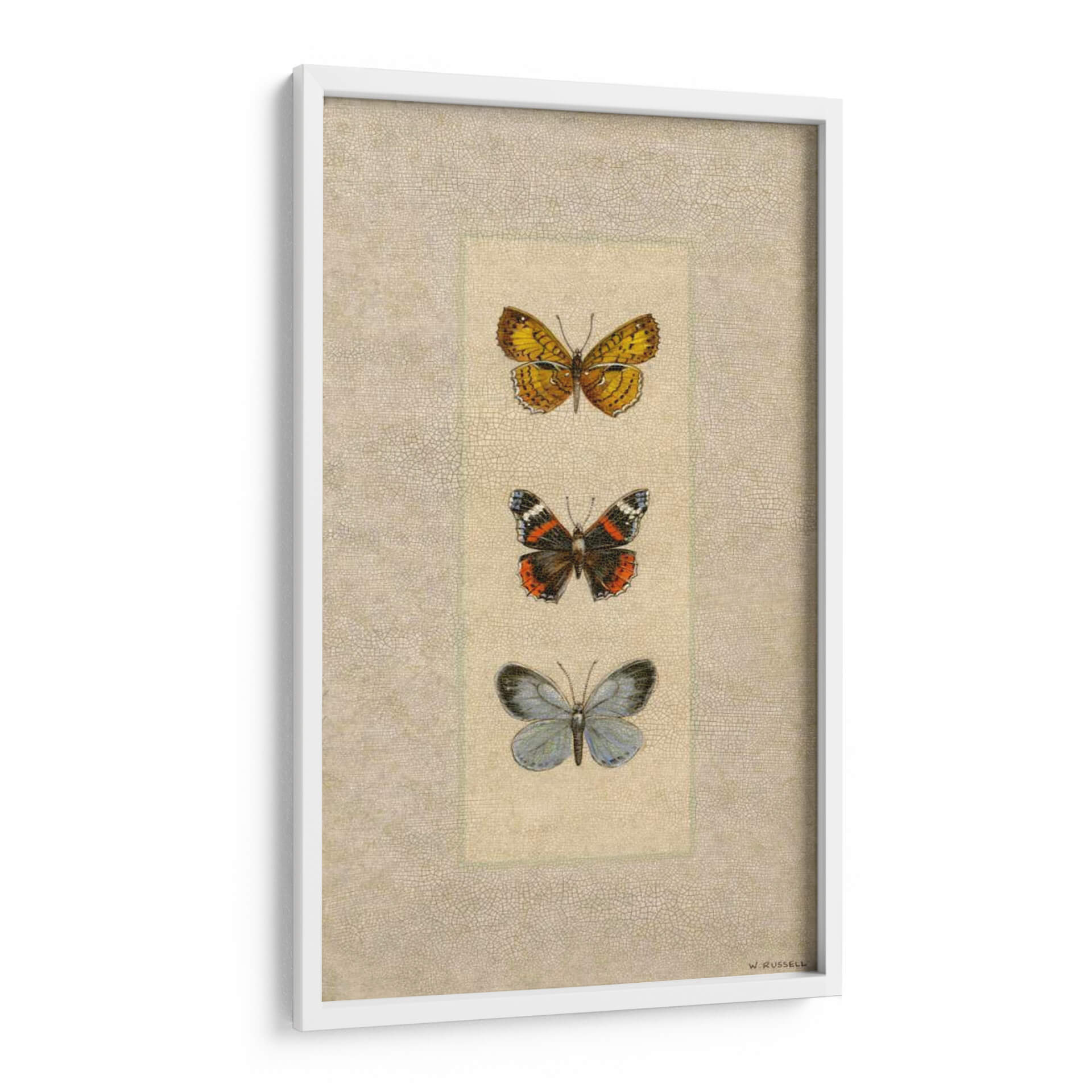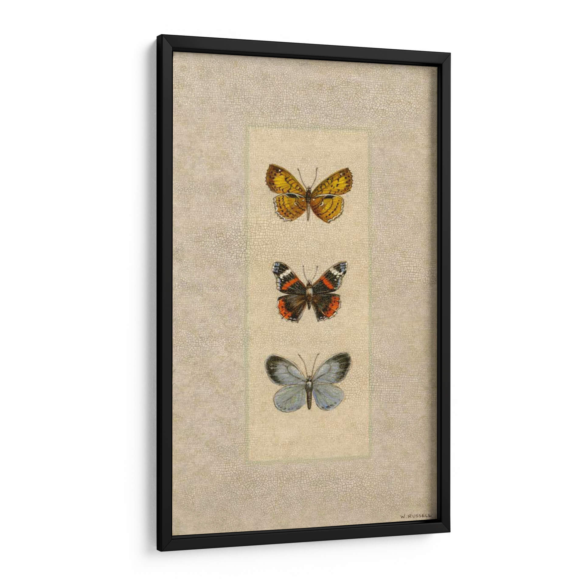 Embellece tu hogar u oficina con "Mariposa Trio II", una exquisita obra de arte de Wendy Russell. Este cuadro decorativo presenta una delicada composición de tres mariposas dispuestas verticalmente, cada una capturada con un detalle fascinante. La mariposa superior despliega alas en vibrantes tonos amarillos y naranjas, adornadas con intrincados patrones oscuros, evocando la calidez del sol. La mariposa central muestra una paleta de colores más audaz, con negro, naranja intenso y toques blancos, sugiriendo vitalidad y transformación. Finalmente, la mariposa inferior, en delicados tonos azules y grises, aporta una sensación de serenidad y calma. El fondo texturizado, con un sutil patrón que recuerda al cuero o a una superficie antigua, complementa la elegancia natural de las mariposas, creando un ambiente de sofisticación atemporal. Esta pieza es ideal para añadir un toque de naturaleza y arte refinado a cualquier espacio, desde un dormitorio tranquilo hasta una sala de estar moderna o un despacho profesional. "Mariposa Trio II" no es solo una decoración, sino una invitación a la contemplación y a la apreciación de la belleza efímera del mundo natural, representada con maestría por Wendy Russell. Transforma tus paredes en un lienzo de inspiración con este impresionante cuadro de mariposas.