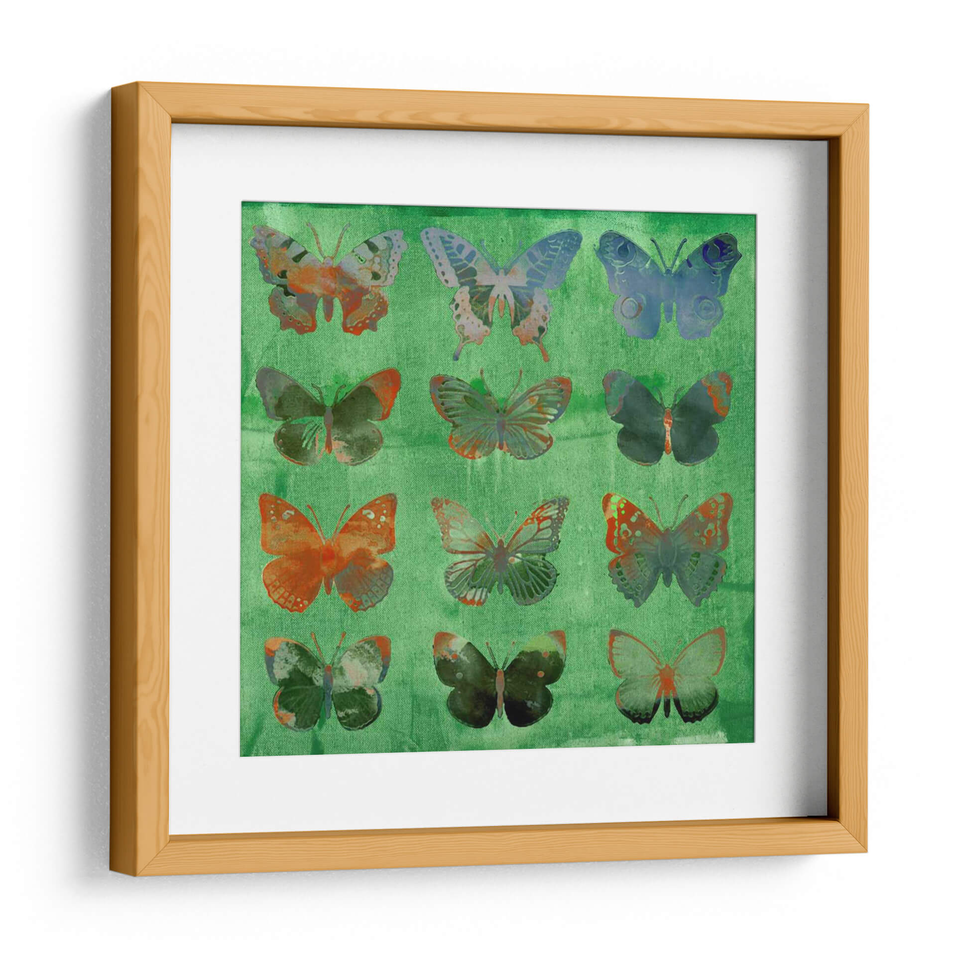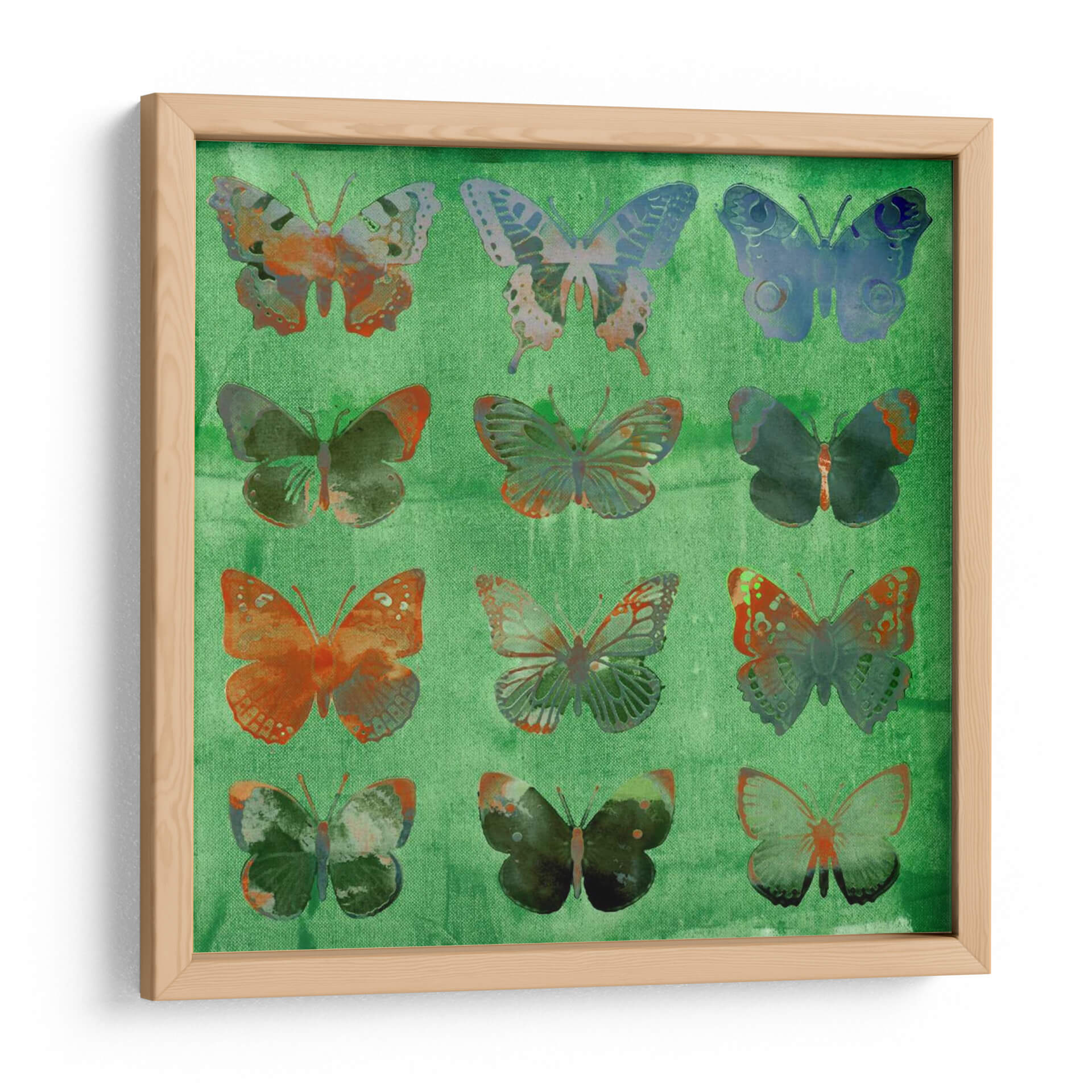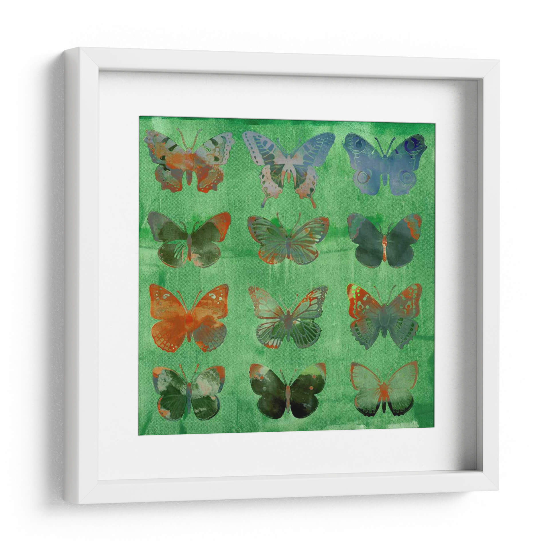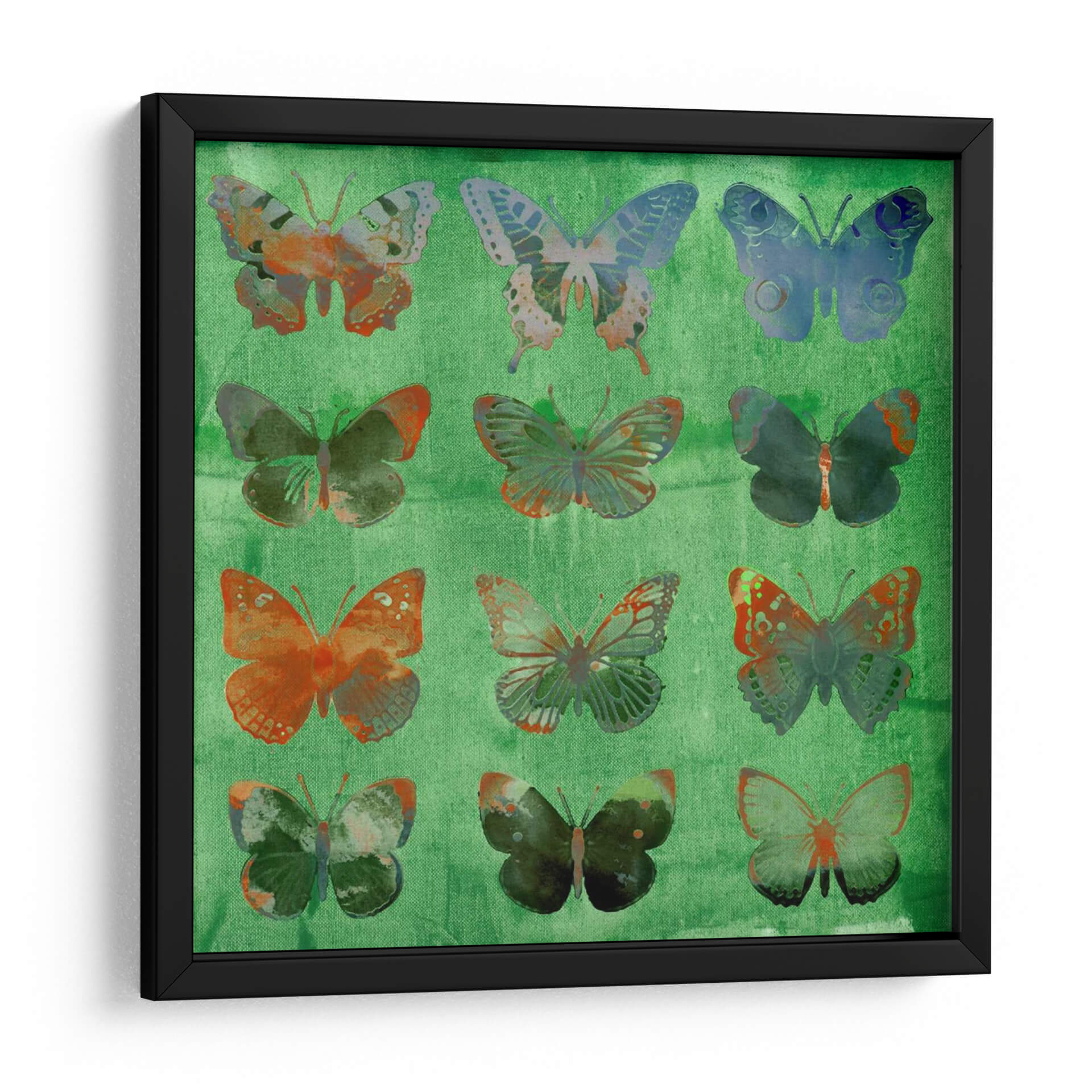 Sumérgete en la belleza etérea de "Mariposas en Verde", una obra de arte contemporáneo que captura la delicadeza y la vitalidad de estas maravillosas criaturas. La composición presenta una cuadrícula de mariposas, cada una con un diseño y una paleta de colores únicos, que varían desde tonos cálidos de naranja y terracota hasta azules profundos y verdes vibrantes. El fondo, de un verde intenso y texturizado, evoca la frescura de la naturaleza y proporciona un telón de fondo dinámico para las mariposas. El estilo, que combina elementos de collage digital y pintura texturizada, crea una sensación de profundidad y complejidad visual. Esta pieza es ideal para añadir un toque de color y sofisticación a cualquier espacio, ya sea un salón moderno, un dormitorio sereno o una oficina inspiradora. "Mariposas en Verde" no es solo una decoración de pared; es una invitación a la contemplación, celebrando la transformación y la libertad. Los sutiles detalles y la rica paleta de colores hacen que cada mariposa sea una obra de arte en sí misma, ofreciendo una experiencia visual cautivadora que evoluciona con la luz y la perspectiva.
