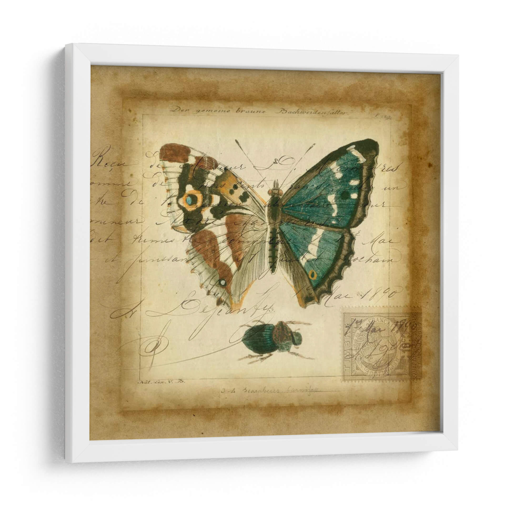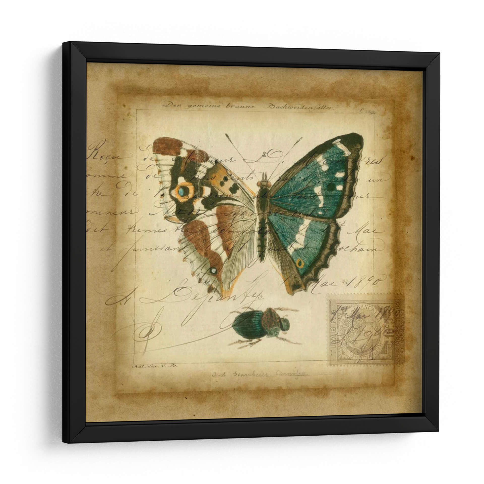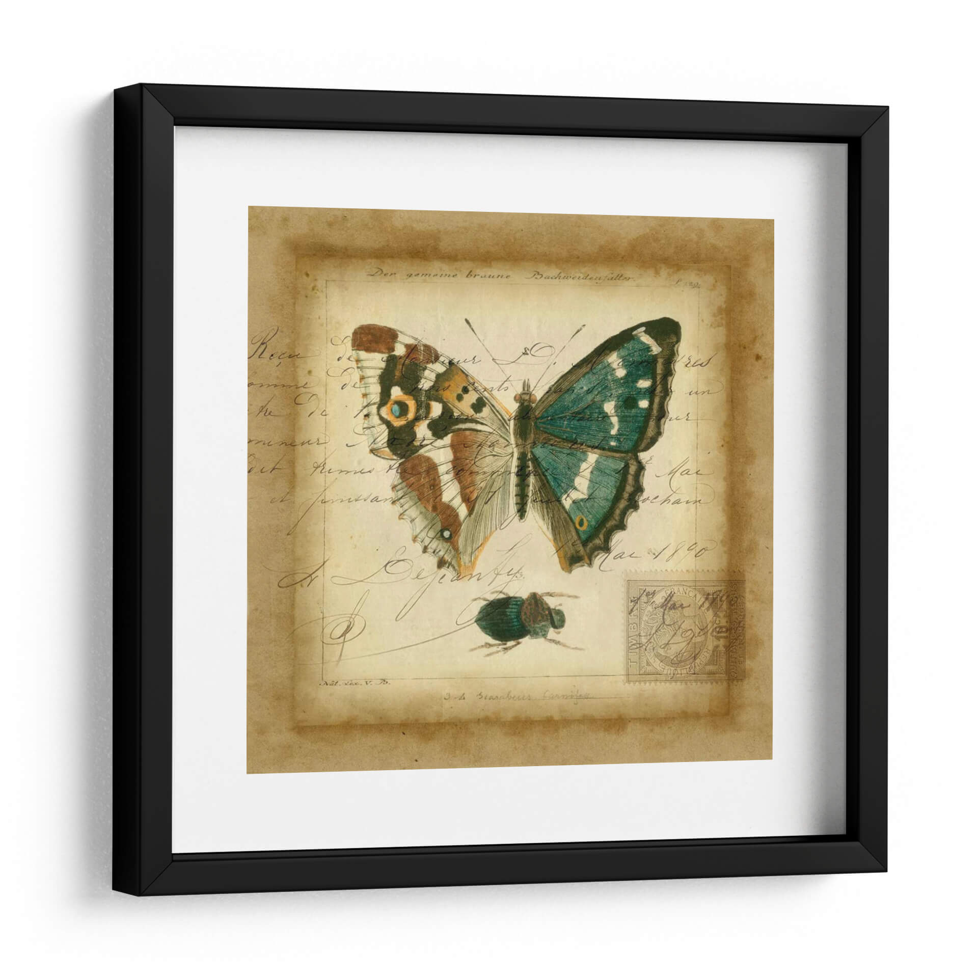 Sumérgete en la delicadeza y el encanto vintage con "Postscript Butterfly II", una obra de arte de Vision Studio que evoca la nostalgia de los cuadernos de naturalista del siglo XIX. Este cuadro decorativo presenta una mariposa exquisitamente detallada, con alas que despliegan una paleta de verdes esmeralda y toques de marrón y ocre, posada sobre un fondo que simula un manuscrito antiguo. La caligrafía desvanecida y las marcas de tiempo, junto a la presencia de un pequeño escarabajo y un sello postal, transportan a una época de exploración y descubrimiento científico. El estilo combina la precisión de la ilustración científica con un aire artístico y evocador, creando una pieza de decoración de pared que es tanto educativa como estéticamente cautivadora. Los tonos cálidos y terrosos del fondo, contrastados con los vibrantes colores de la mariposa, aportan una sensación de profundidad y sofisticación. "Postscript Butterfly II" es ideal para añadir un toque de elegancia histórica y un punto focal de interés natural a salones, estudios o despachos, resonando con amantes de la entomología, la historia y el arte clásico con un giro contemporáneo. Descubre la belleza atemporal de la naturaleza y la escritura en esta cautivadora composición visual.