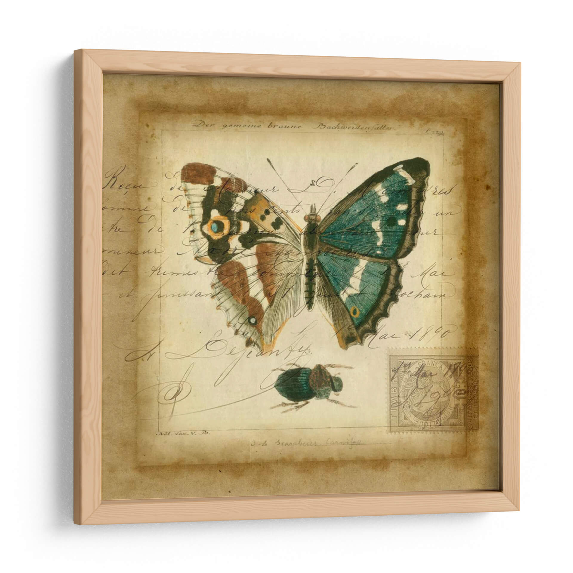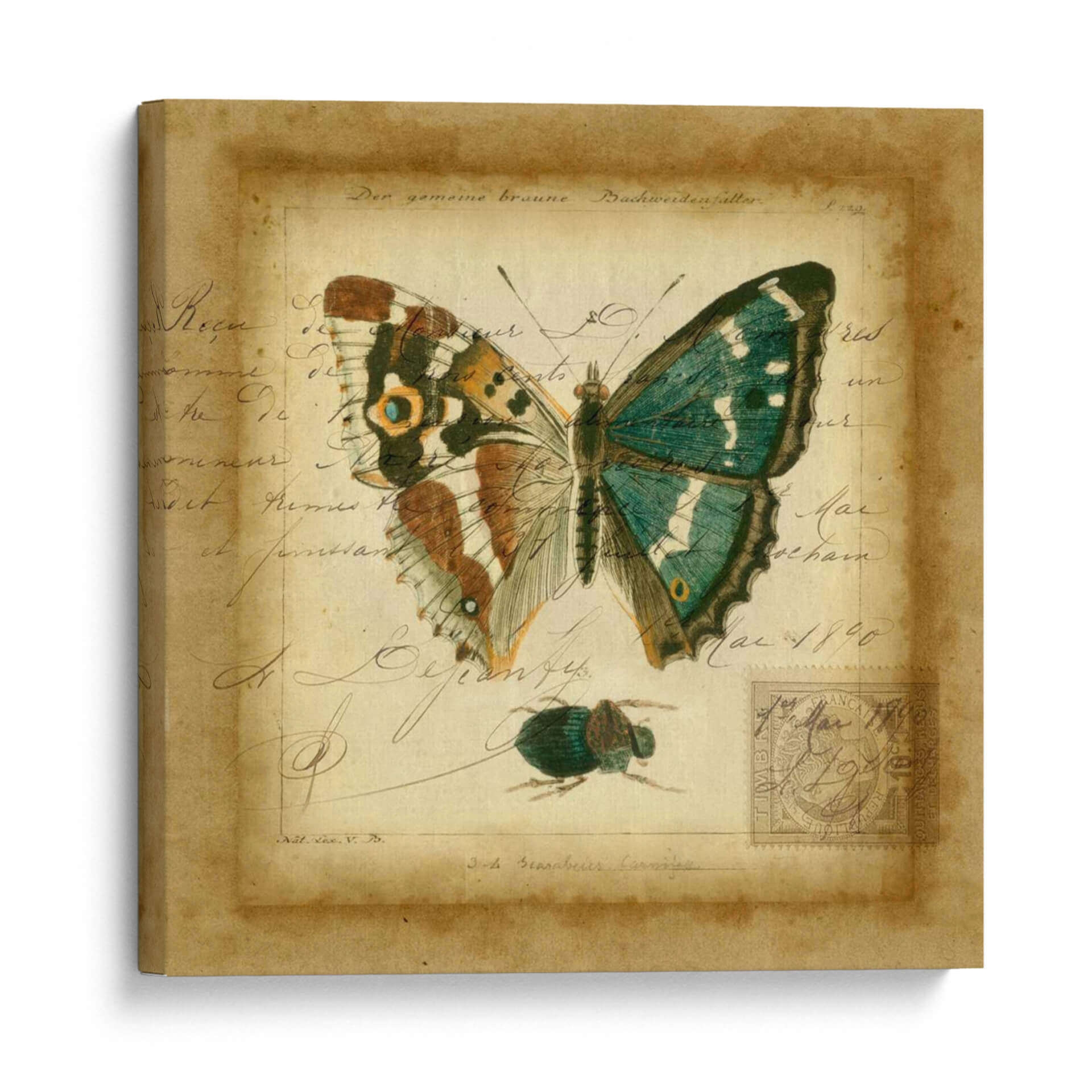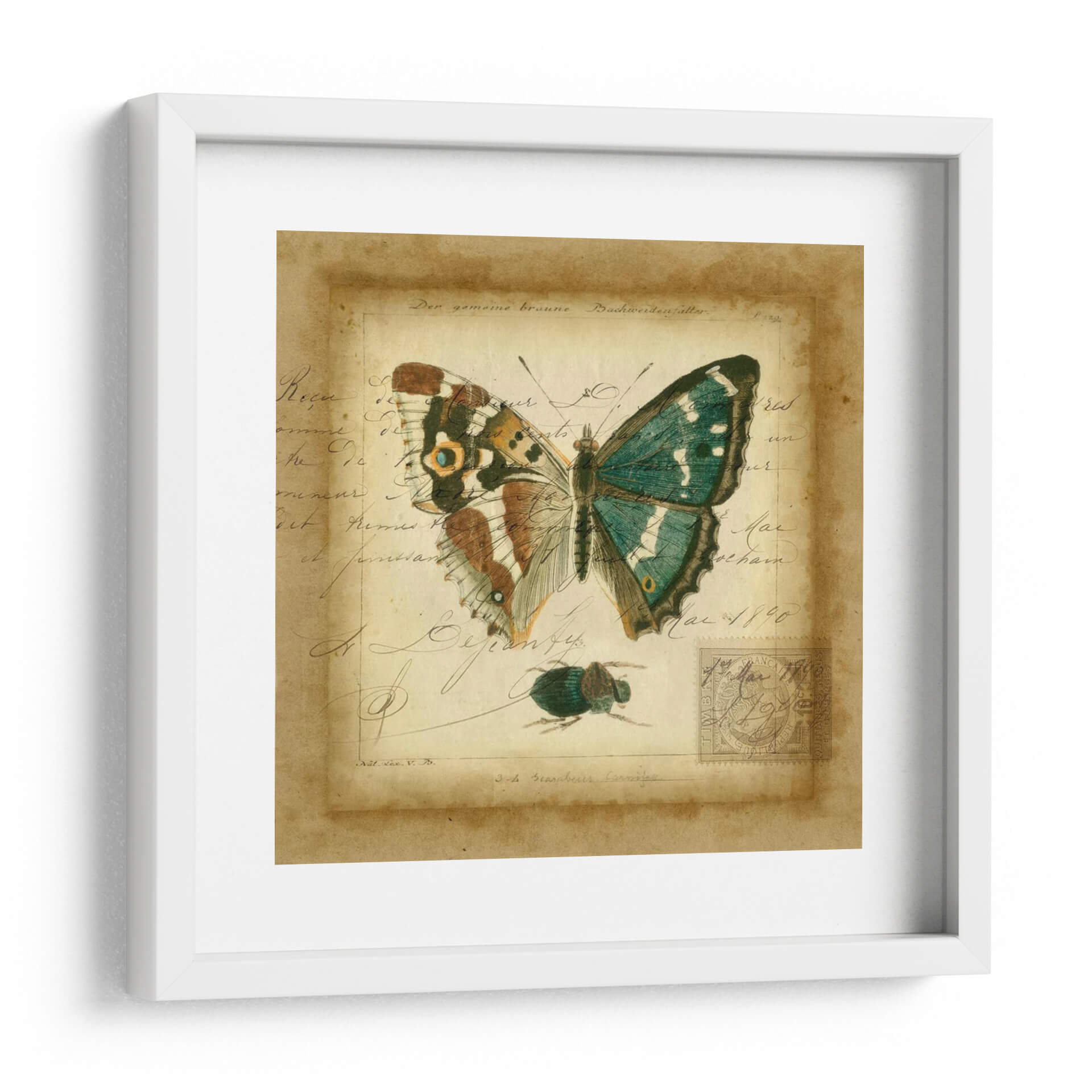 Sumérgete en la delicadeza y el encanto vintage con "Postscript Butterfly II", una obra de arte de Vision Studio que evoca la nostalgia de los cuadernos de naturalista del siglo XIX. Este cuadro decorativo presenta una mariposa exquisitamente detallada, con alas que despliegan una paleta de verdes esmeralda y toques de marrón y ocre, posada sobre un fondo que simula un manuscrito antiguo. La caligrafía desvanecida y las marcas de tiempo, junto a la presencia de un pequeño escarabajo y un sello postal, transportan a una época de exploración y descubrimiento científico. El estilo combina la precisión de la ilustración científica con un aire artístico y evocador, creando una pieza de decoración de pared que es tanto educativa como estéticamente cautivadora. Los tonos cálidos y terrosos del fondo, contrastados con los vibrantes colores de la mariposa, aportan una sensación de profundidad y sofisticación. "Postscript Butterfly II" es ideal para añadir un toque de elegancia histórica y un punto focal de interés natural a salones, estudios o despachos, resonando con amantes de la entomología, la historia y el arte clásico con un giro contemporáneo. Descubre la belleza atemporal de la naturaleza y la escritura en esta cautivadora composición visual.