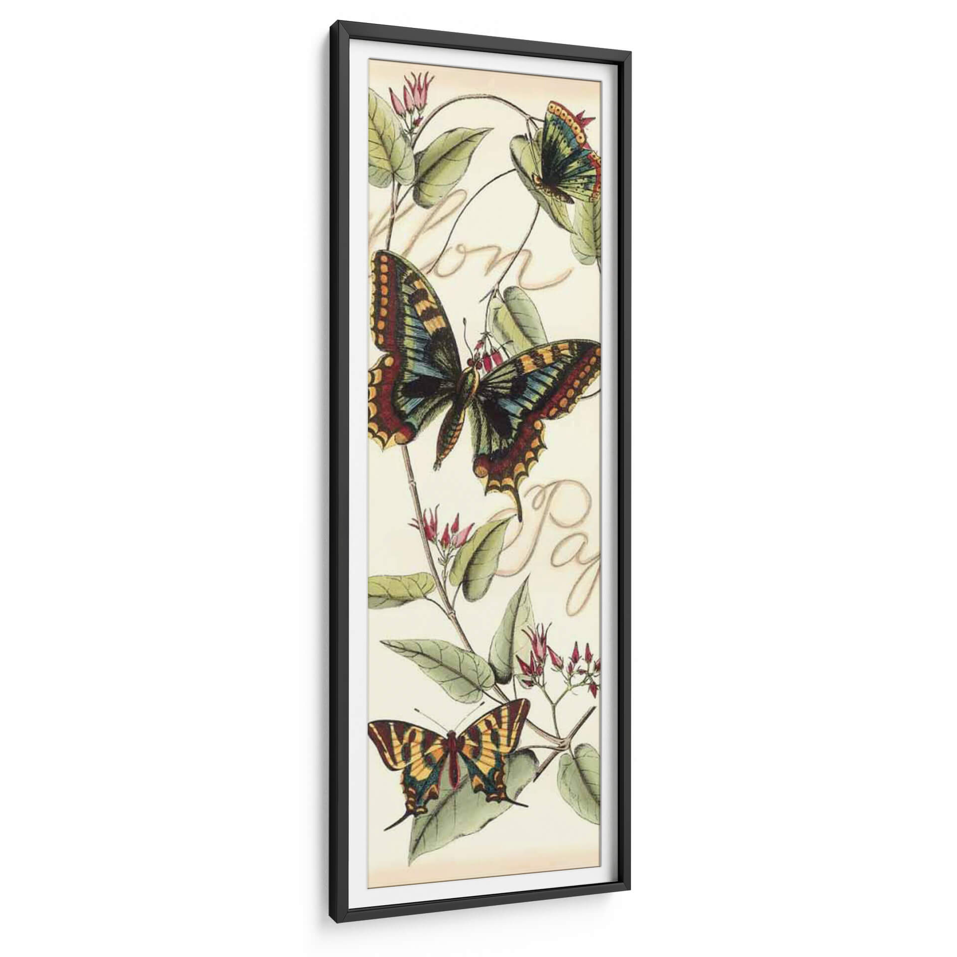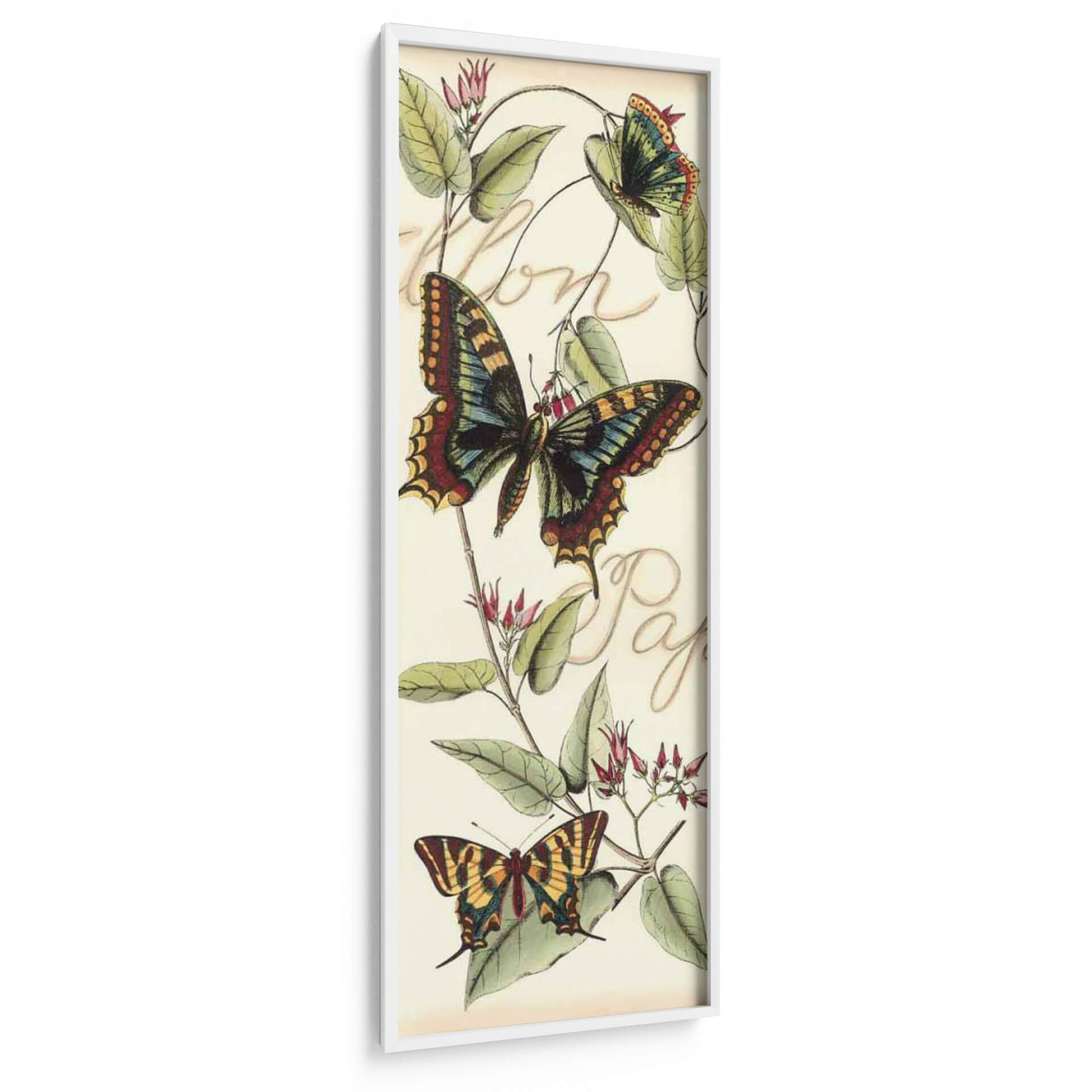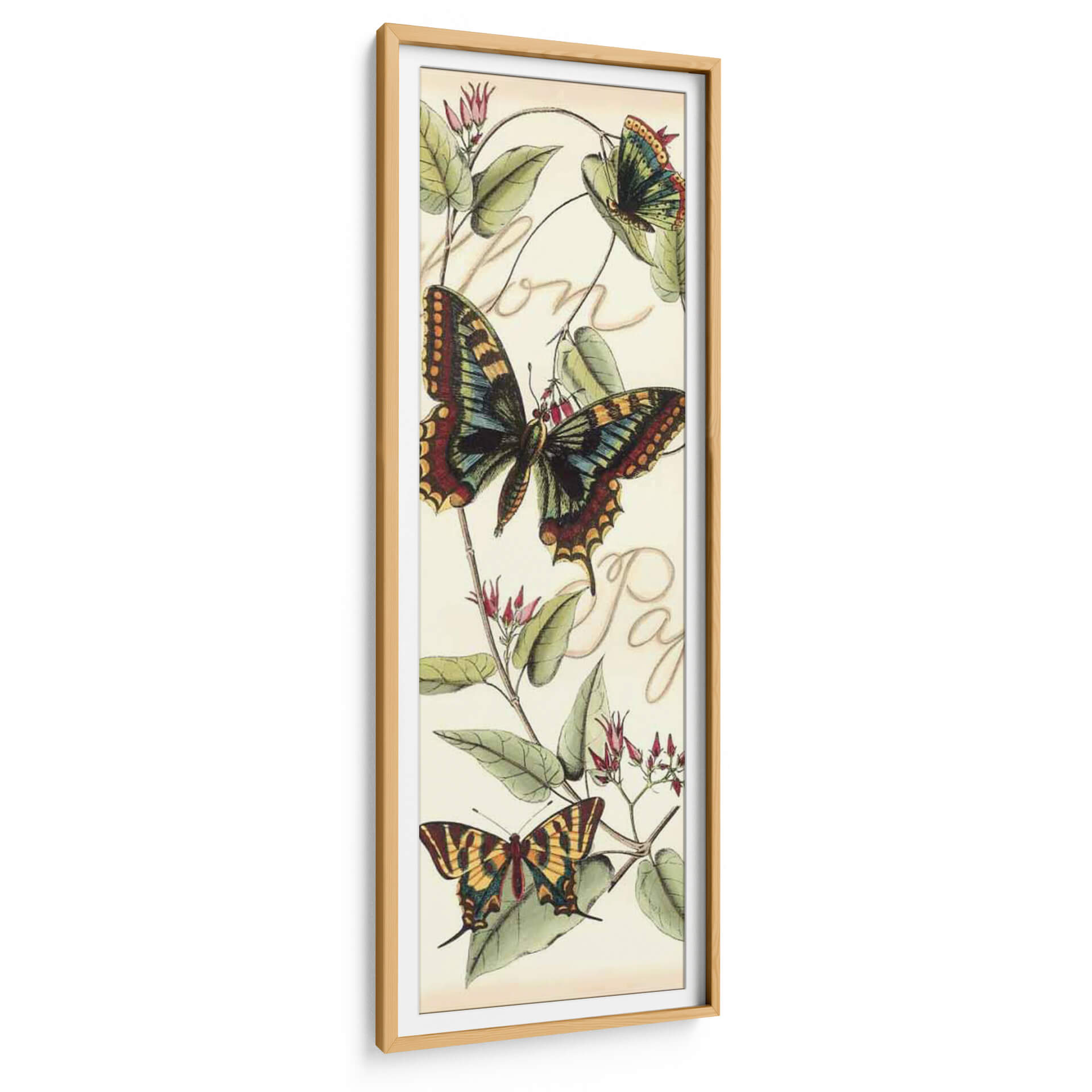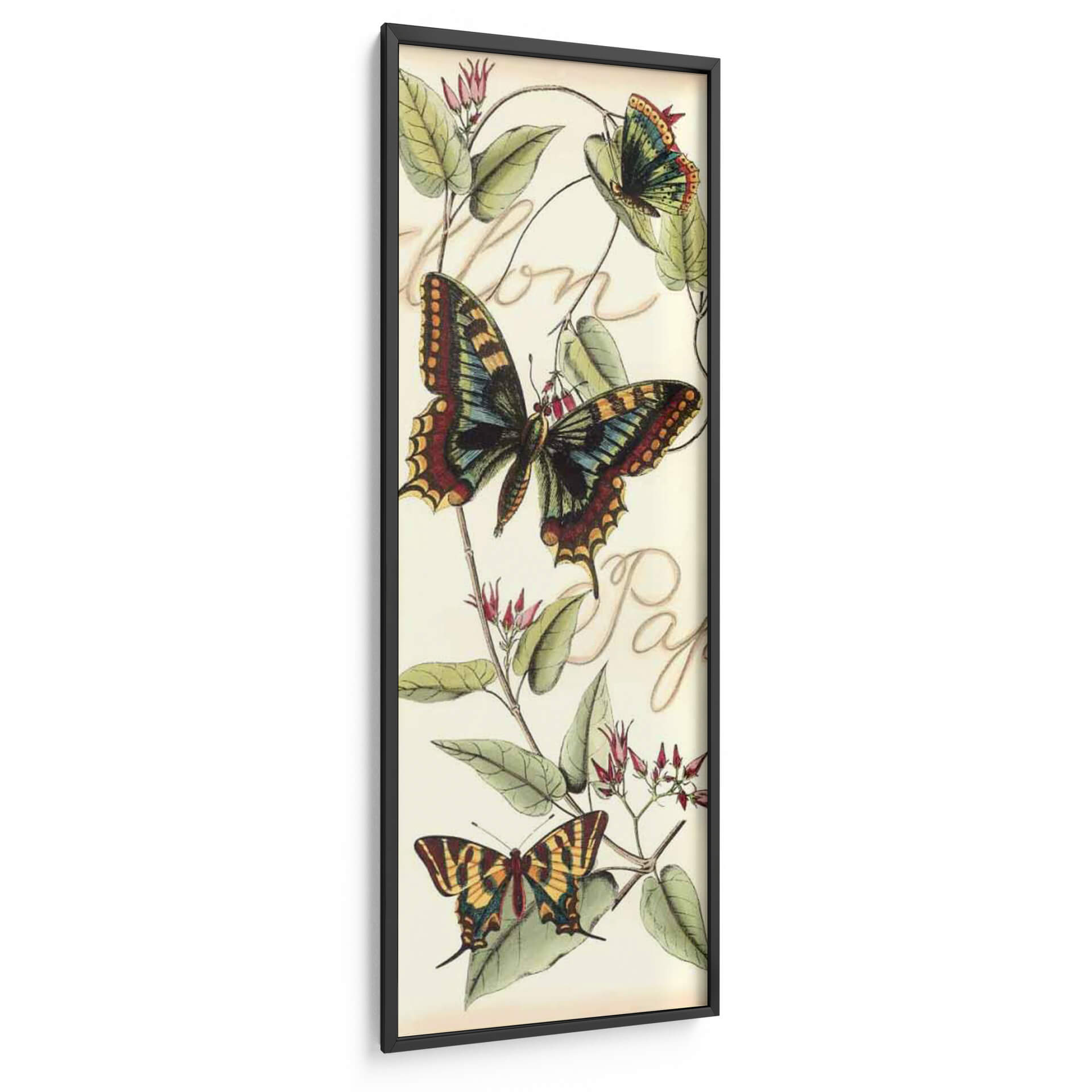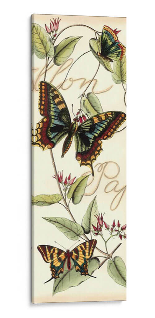 Captura la delicadeza y la belleza etérea de la naturaleza con este cautivador cuadro decorativo, 'Vuelo de Mariposa I'. La obra presenta dos mariposas de vibrantes colores, detalladamente ilustradas, posadas sobre ramas con hojas verdes y delicadas flores rojas. El fondo de tonalidad crema, adornado con sutiles caligrafías doradas, evoca una sensación de elegancia atemporal y un toque vintage. La composición vertical, centrada en la interacción de las mariposas con su entorno botánico, crea una atmósfera de serenidad y asombro. Los tonos tierra, verdes, rojos y toques de azul y amarillo en las alas de las mariposas, se combinan armoniosamente para ofrecer un punto focal visualmente rico pero equilibrado. Este cuadro es ideal para añadir un toque de sofisticación natural a cualquier espacio, ya sea un salón moderno, un dormitorio acogedor o una oficina que busque inspiración. Su estilo, que recuerda a las ilustraciones científicas clásicas pero con un toque artístico contemporáneo, lo hace versátil para diversos esquemas de decoración, desde el clásico hasta el ecléctico. Transforma tu hogar en un refugio de calma y belleza con esta pieza que celebra la efímera gracia de las mariposas.