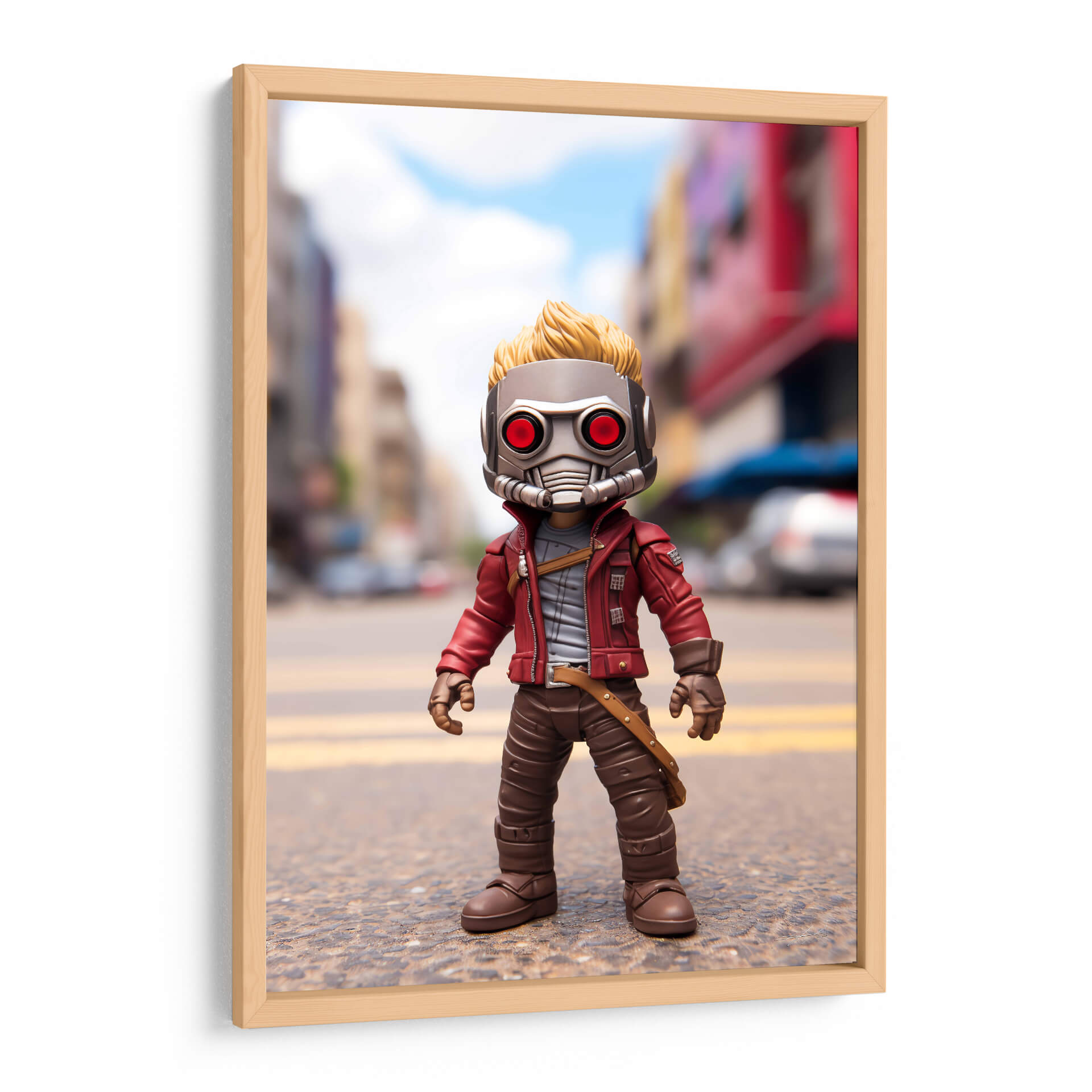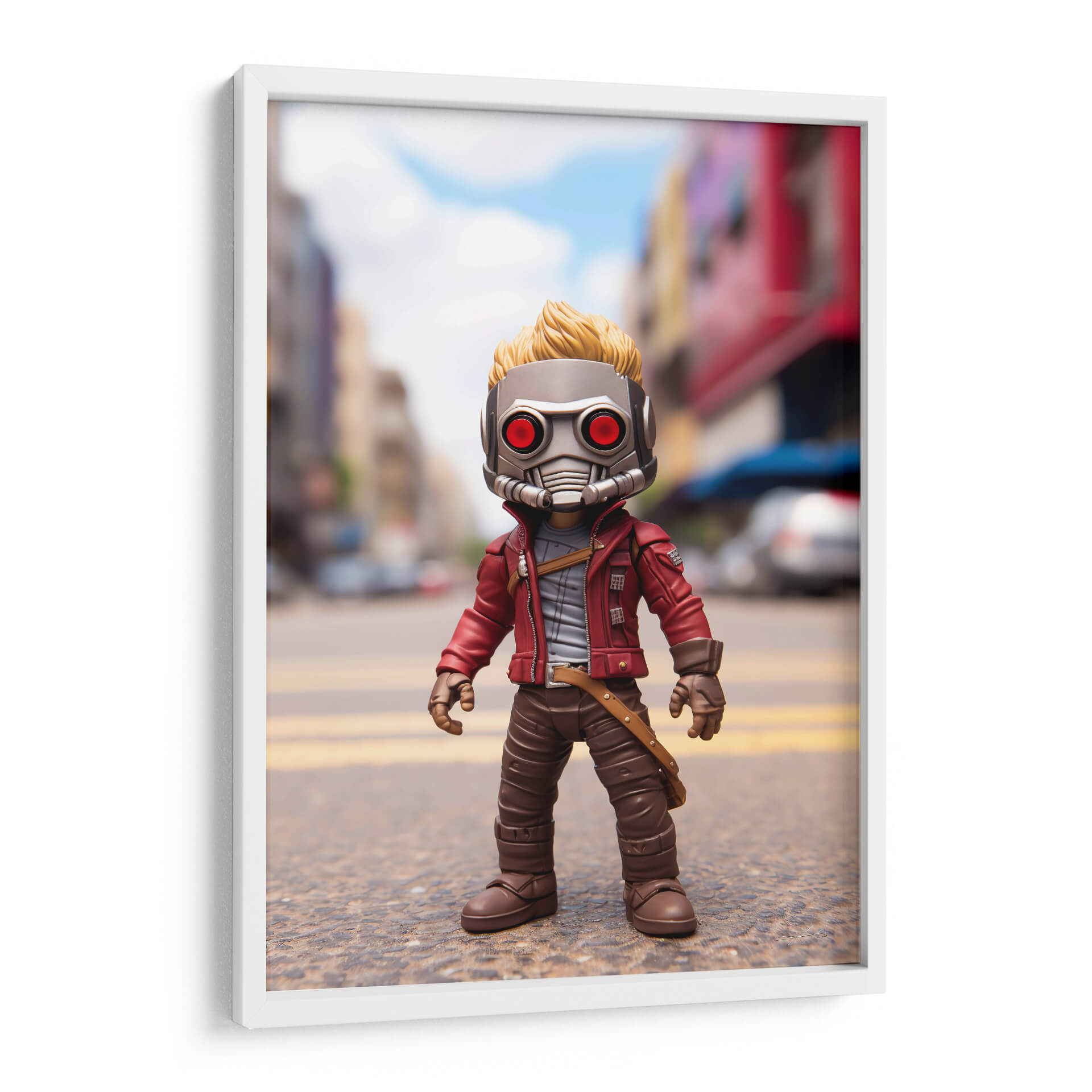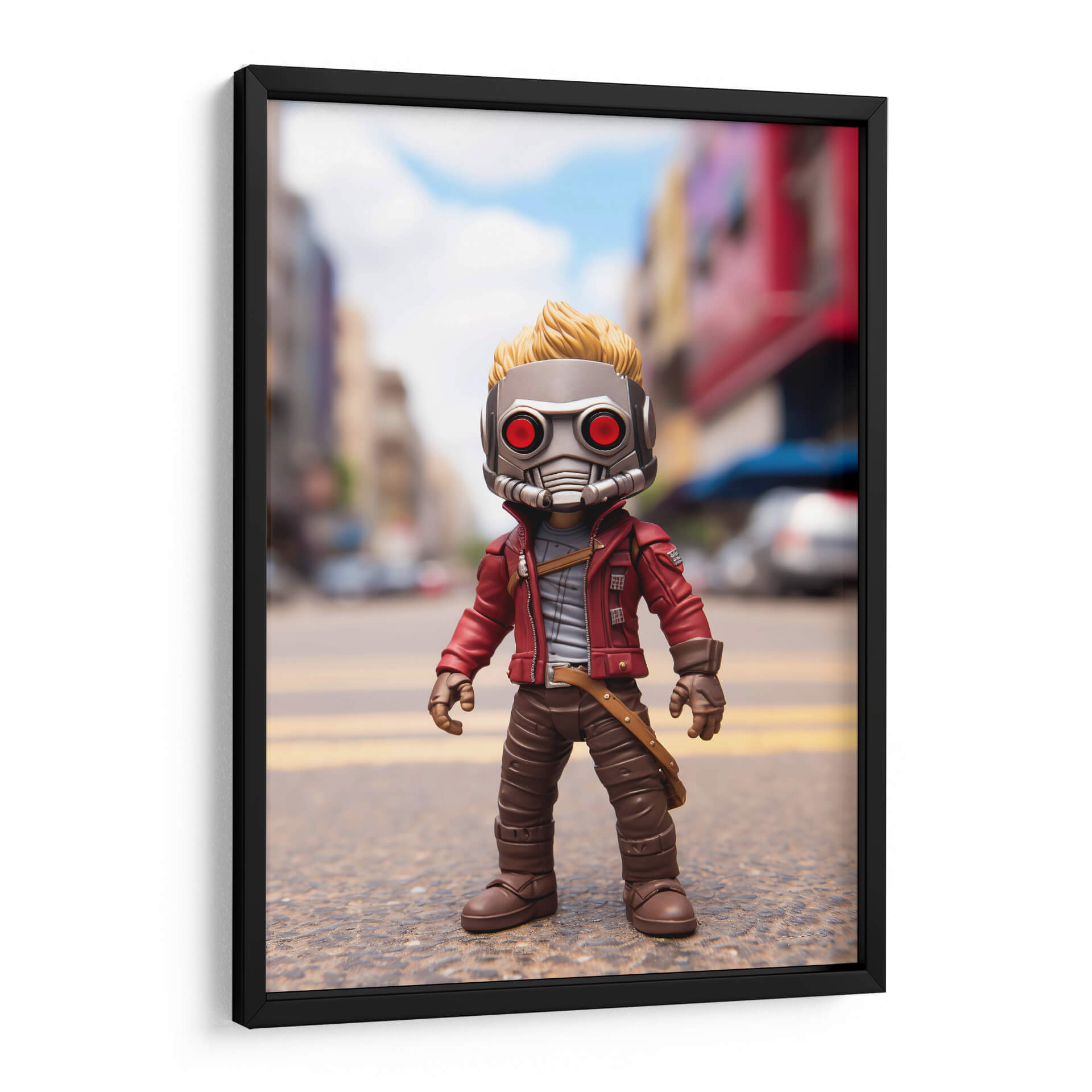 Sumérgete en el universo cinematográfico con este cautivador cuadro decorativo inspirado en el icónico "Mi Pequeño Star Lord". Esta pieza visual captura la esencia de un personaje intrépido y aventurero, presentando una figura estilizada con un distintivo casco metálico de ojos rojos y una chaqueta roja vibrante. El fondo, una calle urbana desenfocada con edificios y cielos azules, sitúa al personaje en un escenario dinámico, sugiriendo un trasfondo de acción y exploración intergaláctica. Los colores predominantes, como el rojo de la chaqueta, el gris del casco y los tonos marrones de la vestimenta, crean un contraste llamativo y una atmósfera llena de personalidad. El estilo, que combina elementos de figura de acción con una ejecución artística digital, lo convierte en una adición única para cualquier coleccionista o fanático. Ideal para decorar un salón moderno, una sala de juegos o incluso una oficina, este cuadro decorativo aporta un toque de fantasía, aventura y un aire pop a tu espacio, convirtiéndose en un punto focal que invita a la imaginación y a revivir las emocionantes historias de los Guardianes de la Galaxia. Un homenaje visual que celebra el espíritu audaz y carismático.