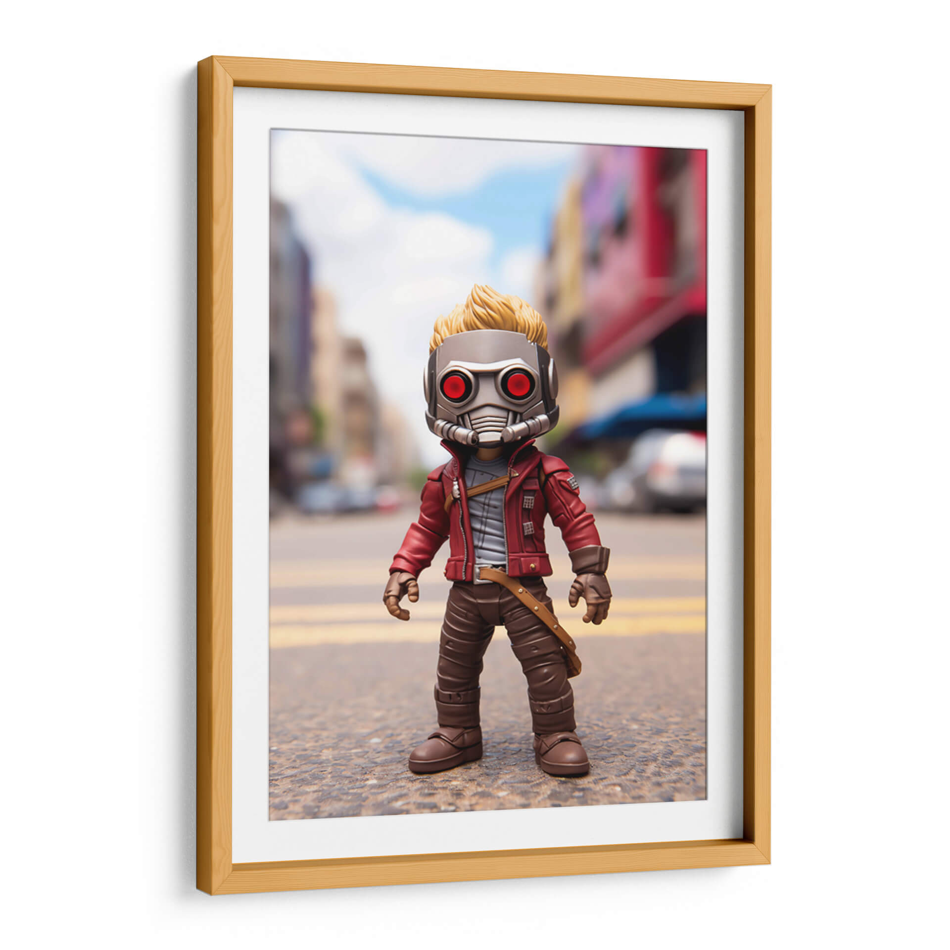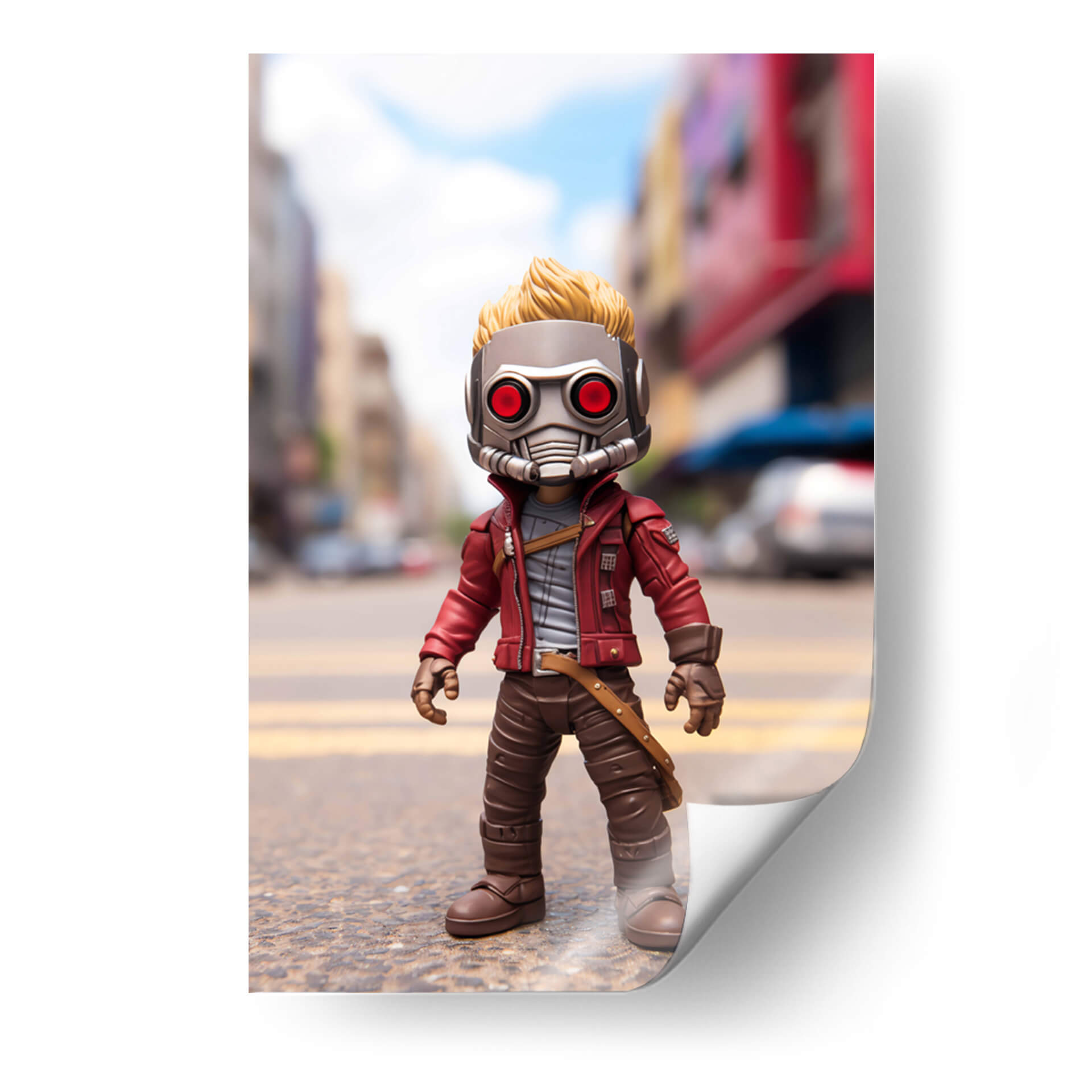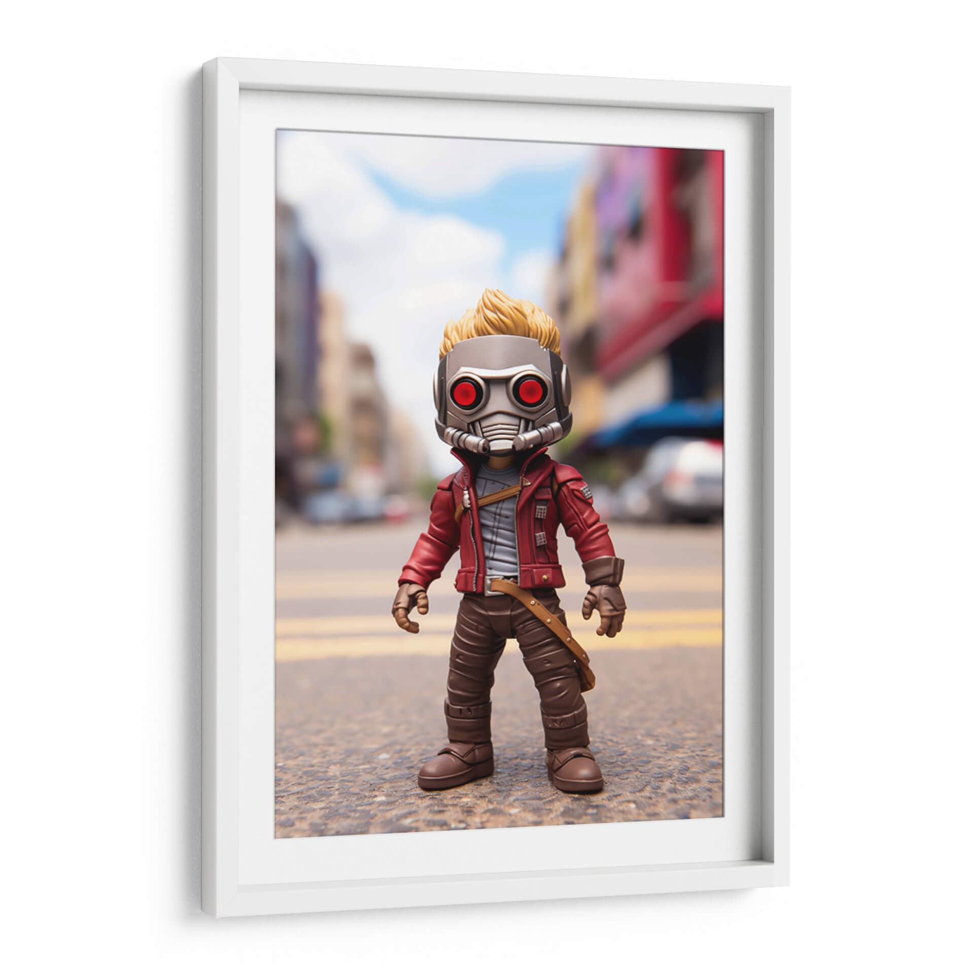 Sumérgete en el universo cinematográfico con este cautivador cuadro decorativo inspirado en el icónico "Mi Pequeño Star Lord". Esta pieza visual captura la esencia de un personaje intrépido y aventurero, presentando una figura estilizada con un distintivo casco metálico de ojos rojos y una chaqueta roja vibrante. El fondo, una calle urbana desenfocada con edificios y cielos azules, sitúa al personaje en un escenario dinámico, sugiriendo un trasfondo de acción y exploración intergaláctica. Los colores predominantes, como el rojo de la chaqueta, el gris del casco y los tonos marrones de la vestimenta, crean un contraste llamativo y una atmósfera llena de personalidad. El estilo, que combina elementos de figura de acción con una ejecución artística digital, lo convierte en una adición única para cualquier coleccionista o fanático. Ideal para decorar un salón moderno, una sala de juegos o incluso una oficina, este cuadro decorativo aporta un toque de fantasía, aventura y un aire pop a tu espacio, convirtiéndose en un punto focal que invita a la imaginación y a revivir las emocionantes historias de los Guardianes de la Galaxia. Un homenaje visual que celebra el espíritu audaz y carismático.