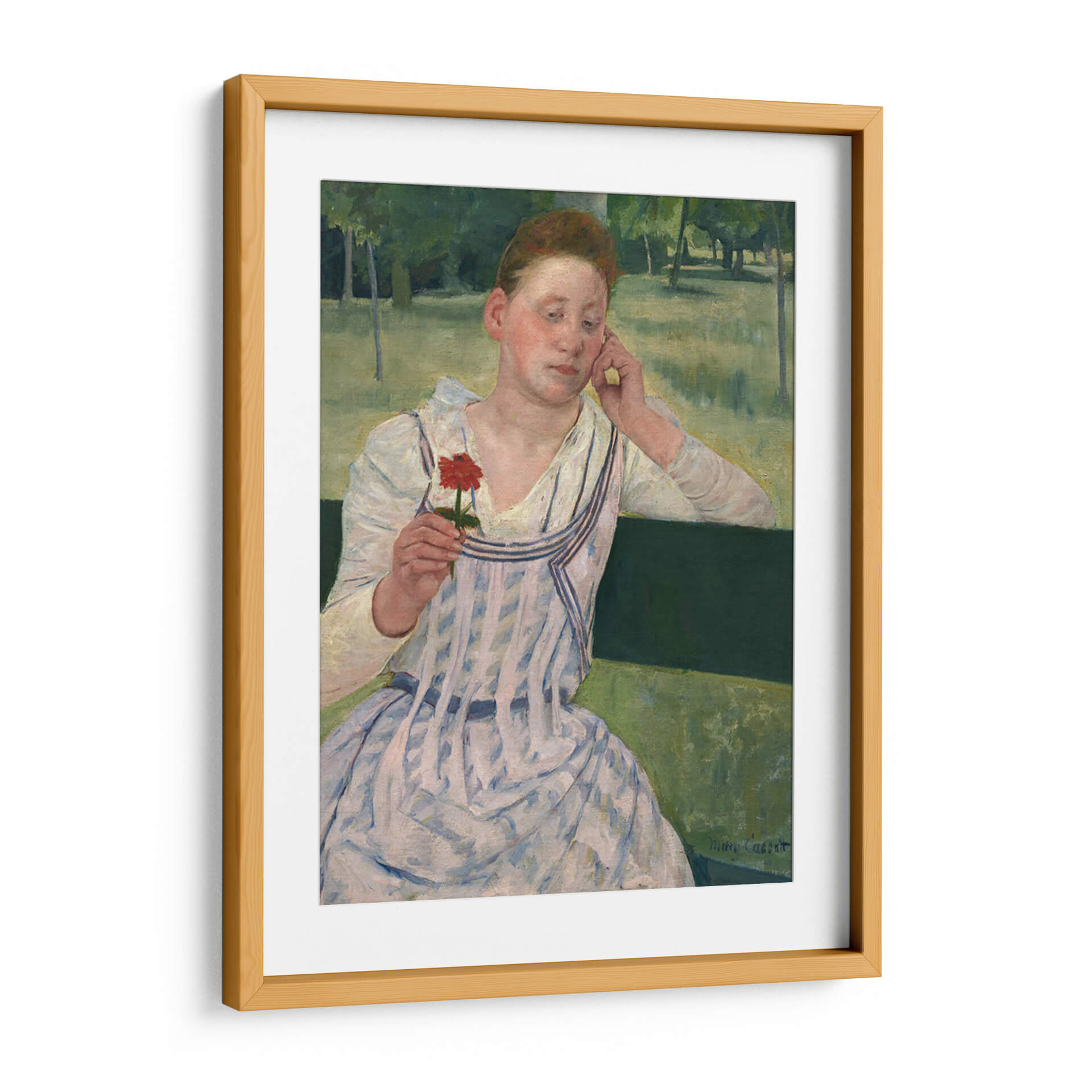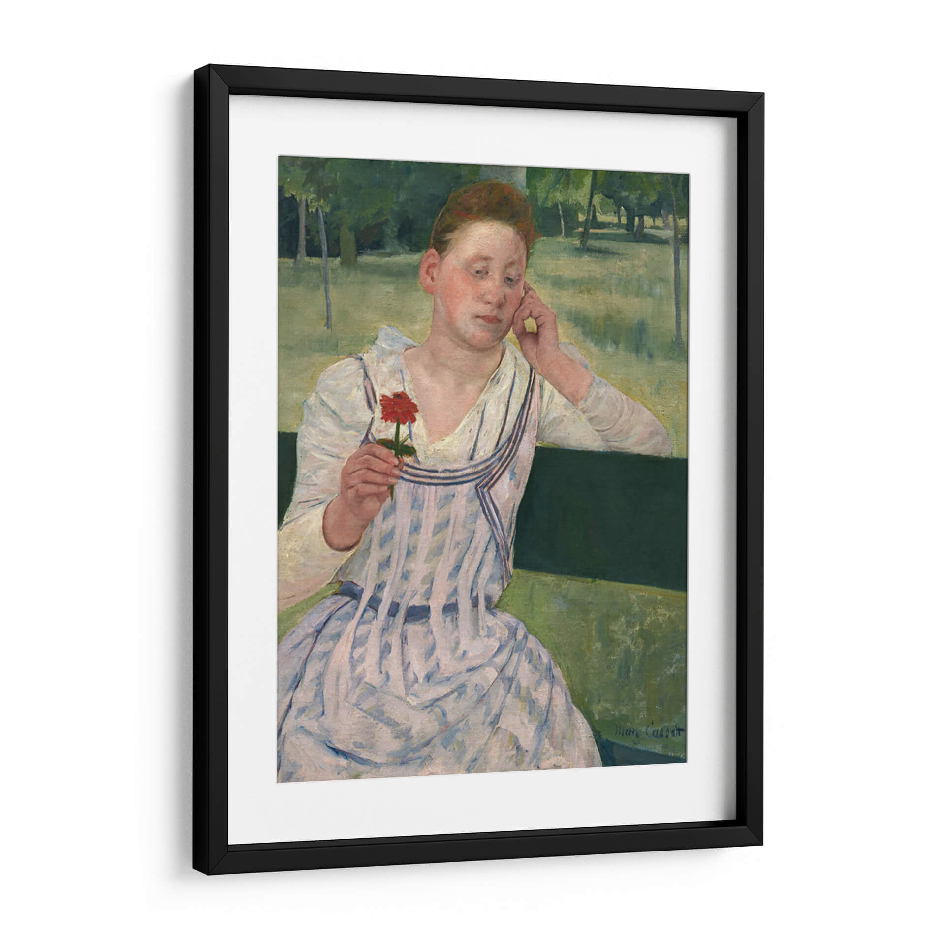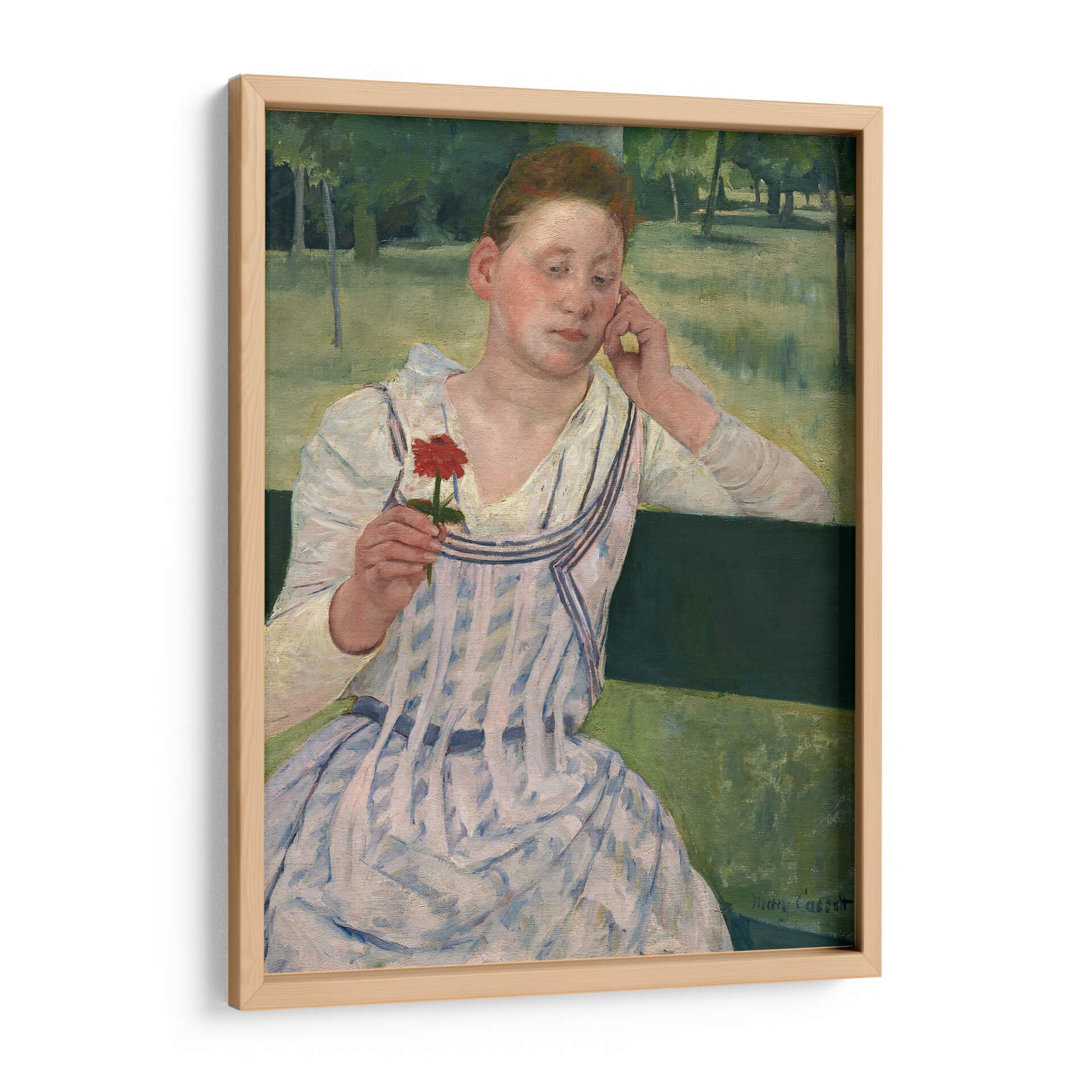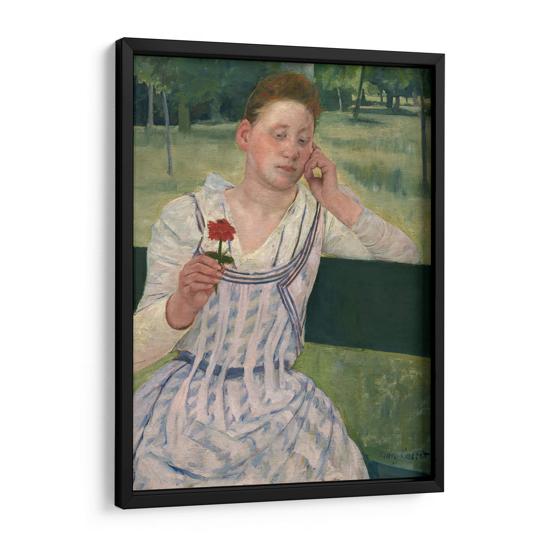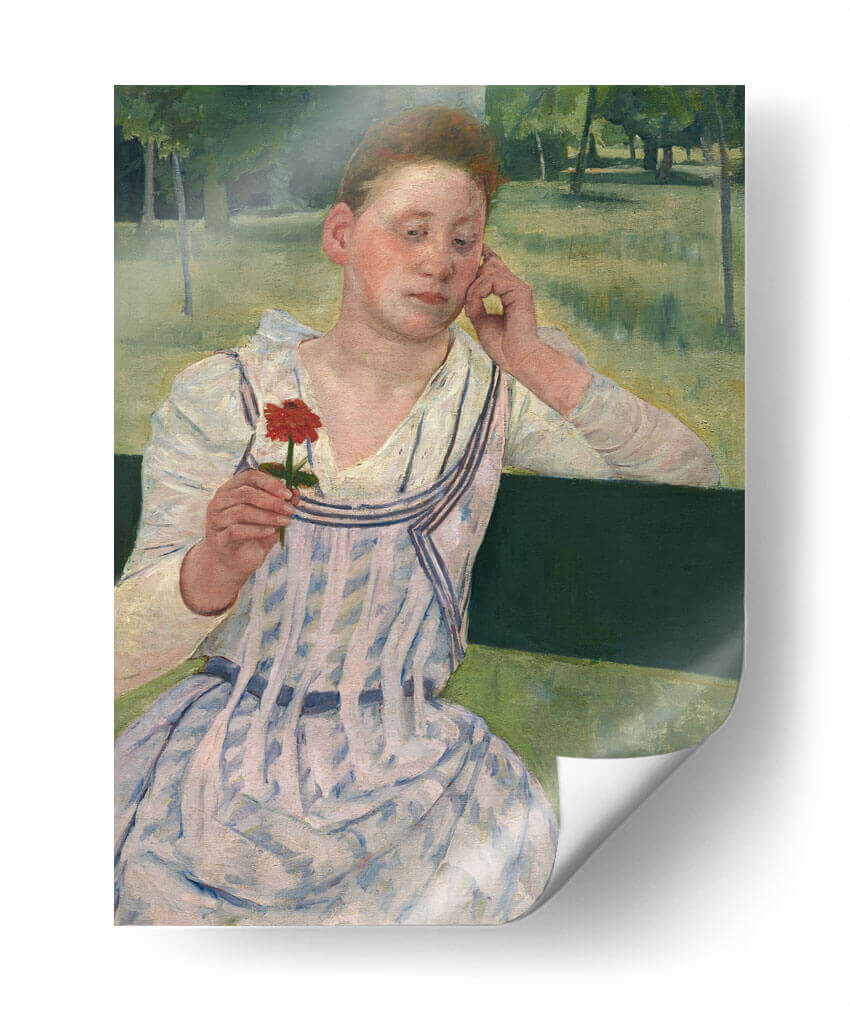 Sumérgete en la delicadeza y la introspección con este cautivador cuadro decorativo que captura la esencia de "Mujer con una zinnia roja" de Mary Cassatt. La obra retrata a una joven sentada en un banco de parque, sosteniendo una vibrante flor roja que contrasta sutilmente con su vestido de tonos pastel y azules. La pincelada, reminiscente del impresionismo, aporta una textura rica y una atmósfera envolvente al jardín de fondo, donde la luz se filtra a través de los árboles creando un juego de sombras y brillos. La expresión serena de la figura invita a la contemplación, transmitiendo una sensación de paz y melancolía sutil. Este cuadro es una adición perfecta para cualquier espacio que busque evocar tranquilidad y sofisticación, ideal para salones, dormitorios o estudios que deseen un toque de arte clásico con una perspectiva moderna. La paleta de colores suaves, dominada por verdes, azules pálidos y el acento rojo de la flor, crea un ambiente armonioso y acogedor, convirtiendo esta pieza en un punto focal lleno de sensibilidad y elegancia. Añade una obra maestra que inspire calma y belleza a tu decoración.