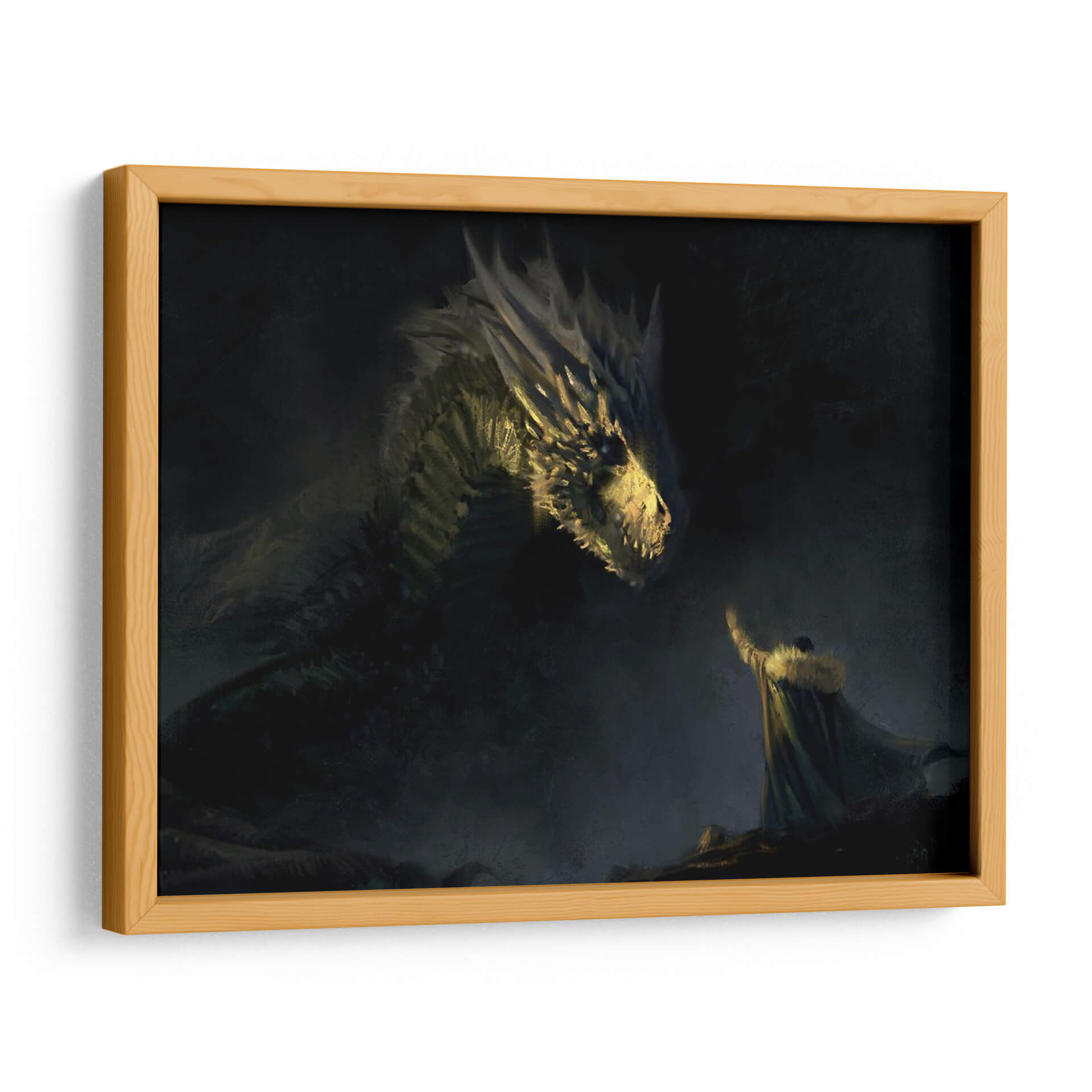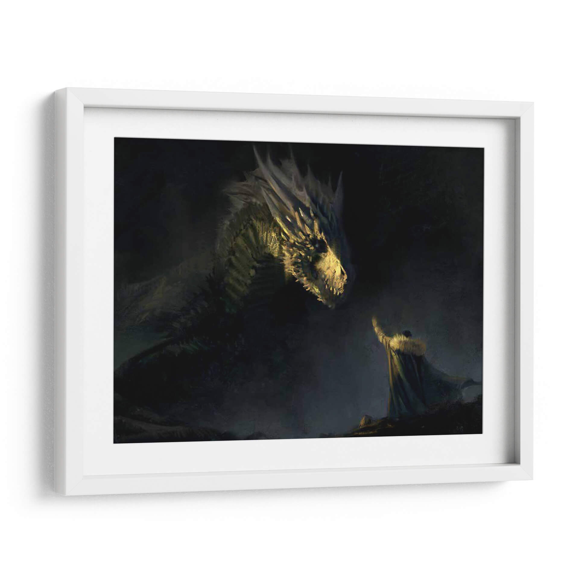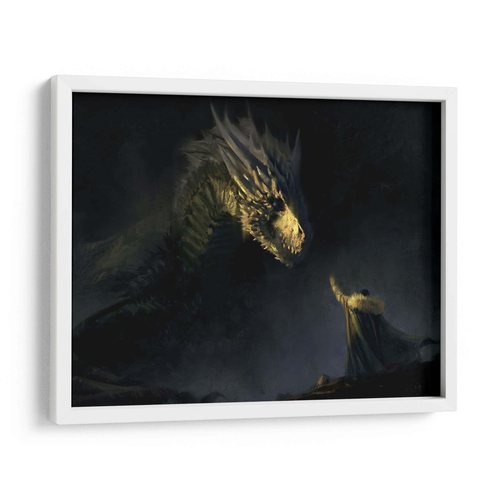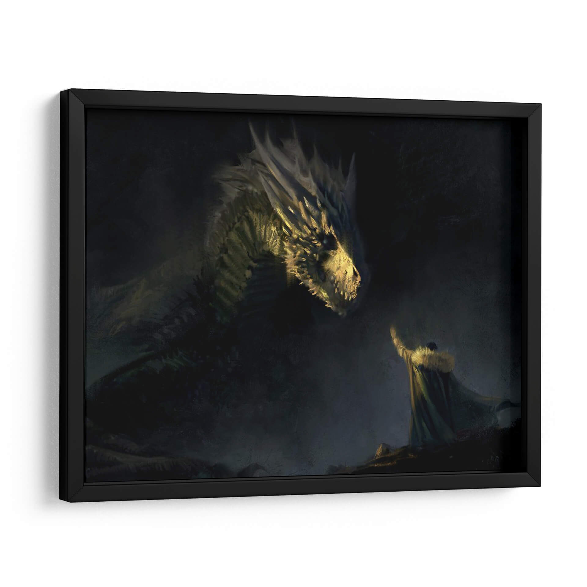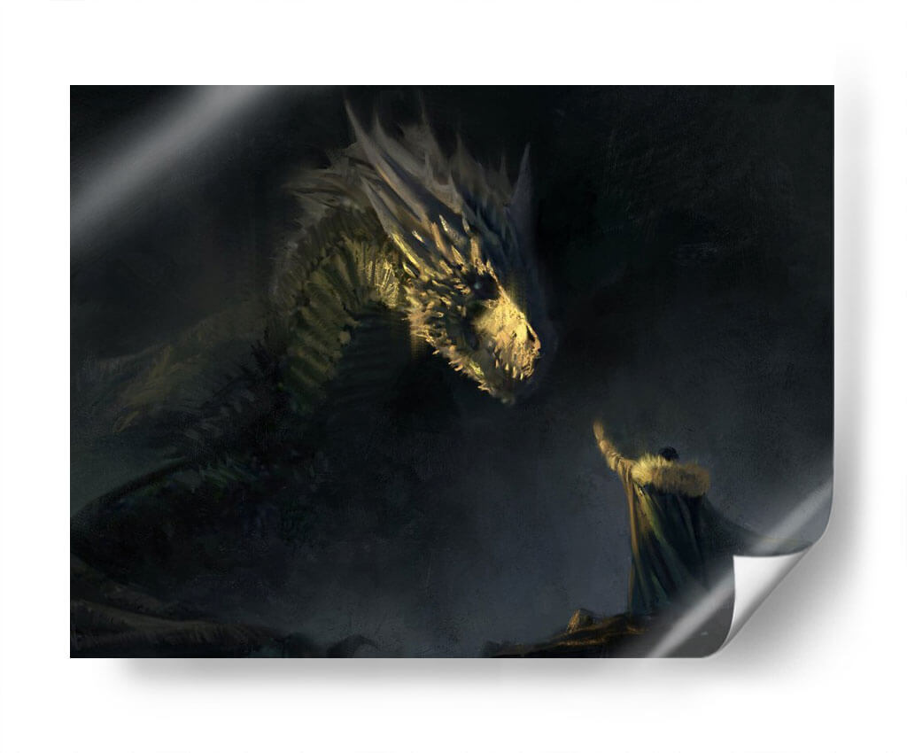 Sumérgete en un mundo de fantasía épica con este cautivador cuadro decorativo 'Aegon the VI of his name'. La obra maestra representa una escena dramática y poderosa, donde una figura imponente, vestida con una capa de piel, se encuentra cara a cara con un majestuoso dragón. La iluminación es un elemento crucial, con destellos dorados que resaltan las escamas del dragón y el rostro de la criatura, creando un contraste impactante con el oscuro y brumoso fondo. La atmósfera general es de misterio, poder y quizás un toque de desafío o reverencia. El estilo pictórico, con pinceladas sugerentes y una paleta de colores dominada por tonos oscuros, verdes y amarillos cálidos, evoca una sensación de antigüedad y leyenda. Este cuadro es perfecto para añadir un punto focal dramático a una sala de estar moderna, un estudio o incluso un dormitorio temático. Ideal para los amantes de la fantasía, la mitología y las narrativas visuales fuertes, este arte de pared transformará cualquier espacio en un escenario de cuento inolvidable. Su composición dinámica y su temática intrigante lo convierten en una pieza de conversación garantizada.