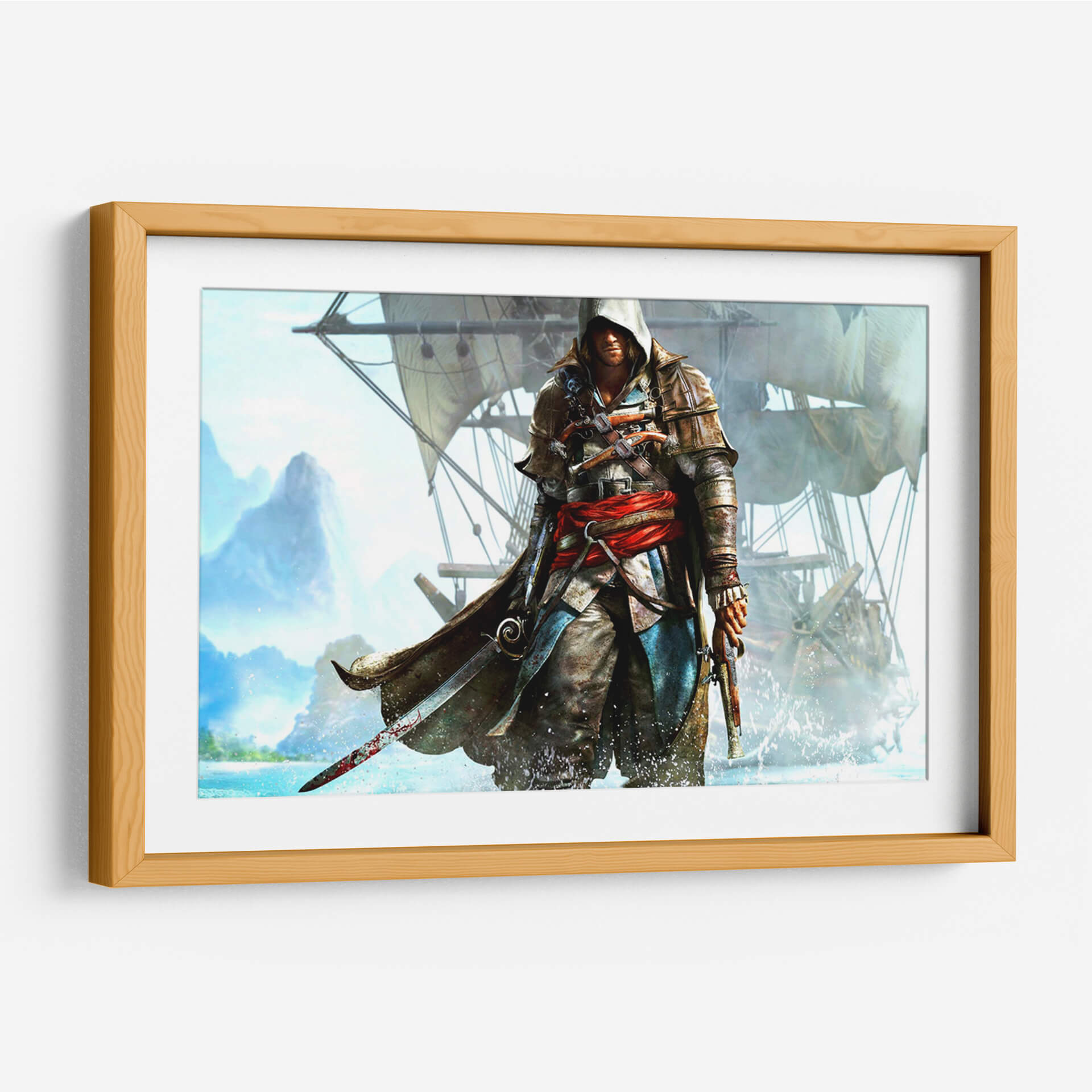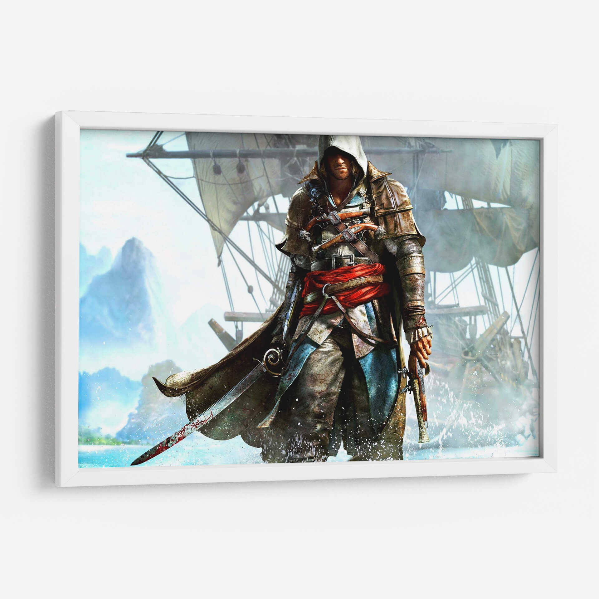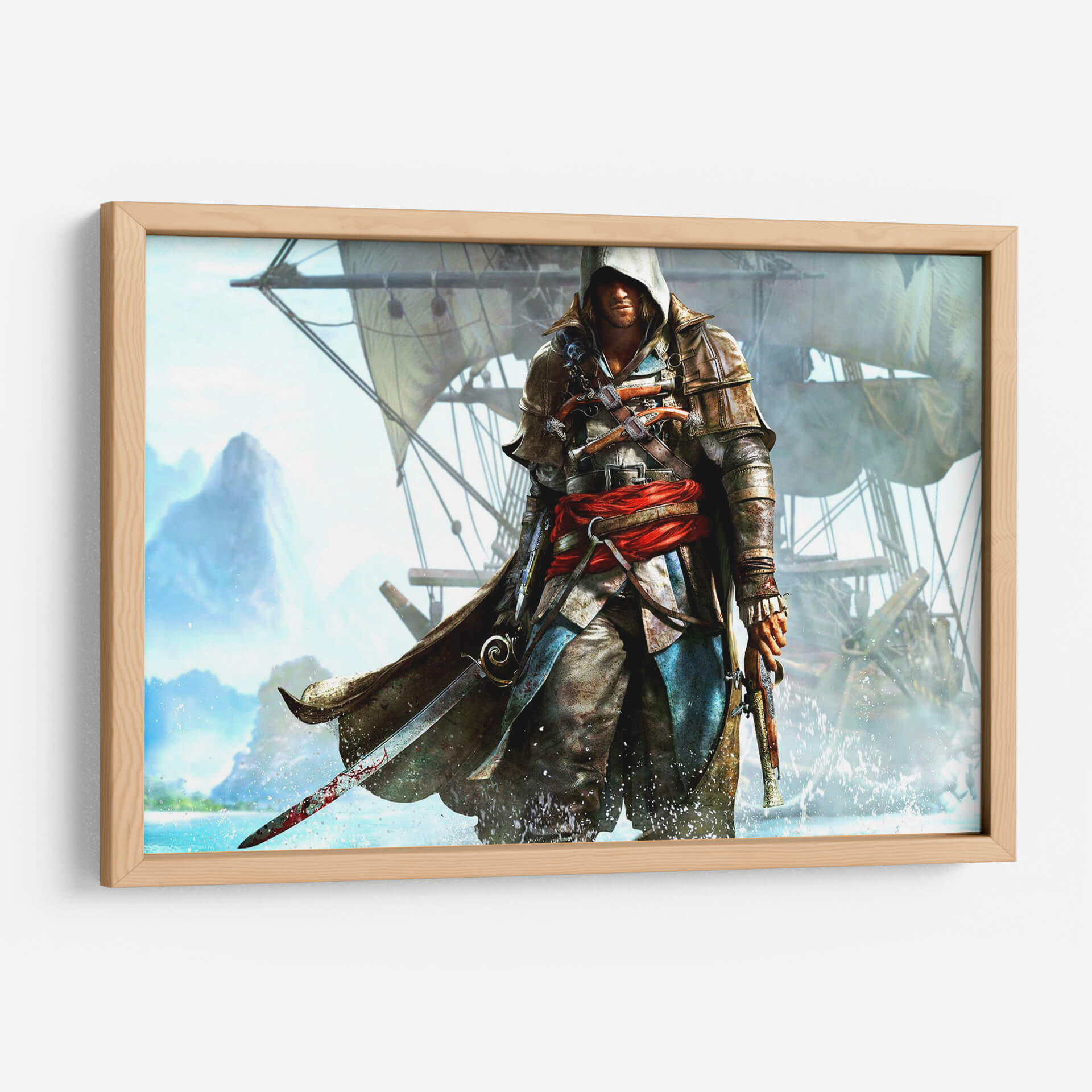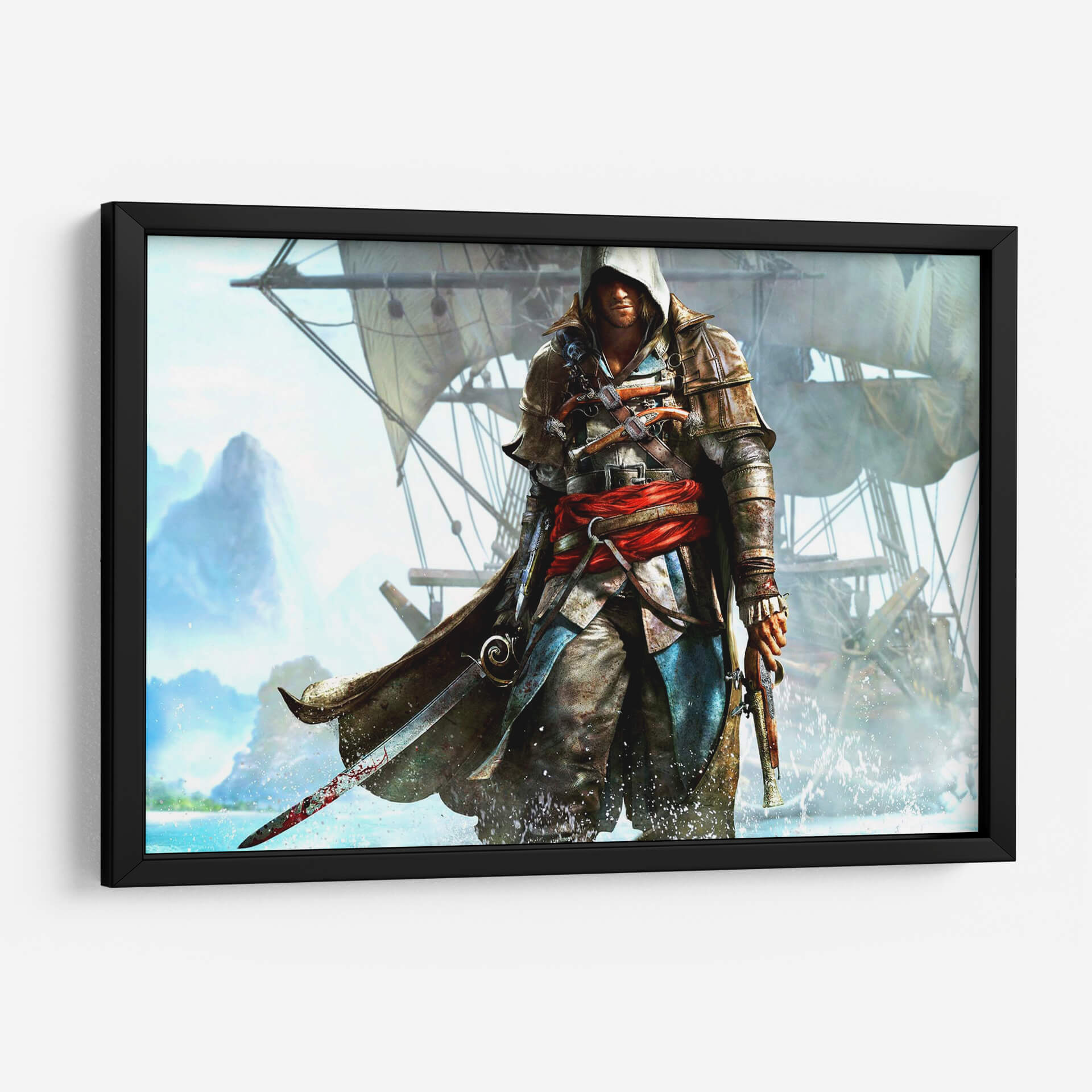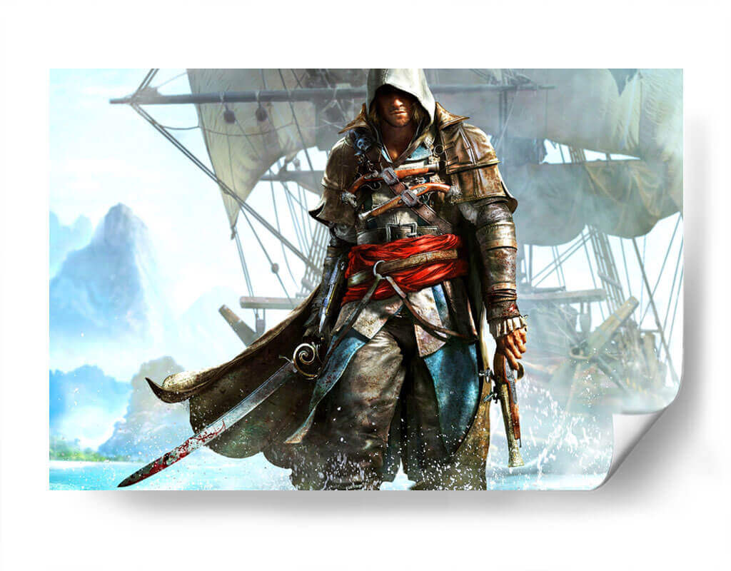 Sumérgete en la aventura y el misterio con este impactante cuadro decorativo que captura la esencia de "Assassins Creed IV Black Flag". La obra presenta a un intrépido protagonista varado en aguas poco profundas, con una imponente embarcación pirata de fondo y un paisaje de islas montañosas en la distancia. La paleta de colores, dominada por tonos azules del mar y el cielo, contrasta con los detalles cálidos y terrosos del atuendo del personaje, acentuado por un vibrante fajín rojo. La atmósfera es de acción inminente y descubrimiento, evocando la época dorada de la piratería y la búsqueda de tesoros ocultos. La composición dinámica, con el personaje en primer plano y la naturaleza salvaje en el horizonte, atrae la mirada y genera una sensación de profundidad y emoción. Este cuadro decorativo es ideal para añadir un toque de audacia y narrativa a cualquier espacio, desde una sala de estar moderna hasta un estudio o una zona de entretenimiento. Perfecto para los amantes de la historia, la aventura y los mundos de fantasía épica, este lienzo transformará tu pared en una ventana a un mundo de leyendas marineras y combates inolvidables. Su estilo realista y detallado, típico del arte digital, ofrece una pieza de conversación que despertará la imaginación y transportará a quienes la contemplen a un universo de piratas y grandes hazañas.