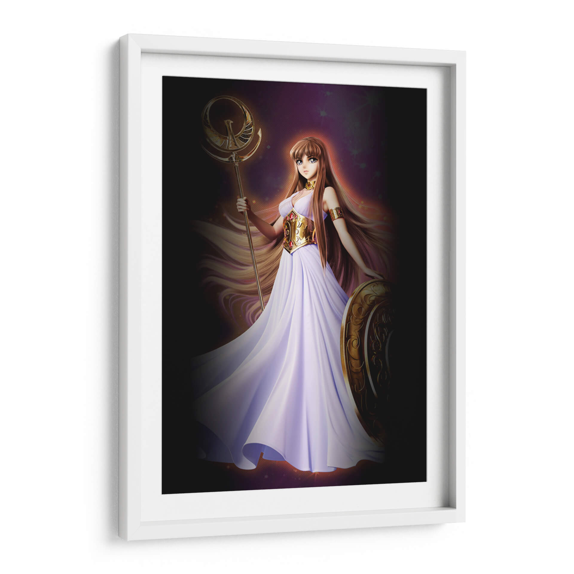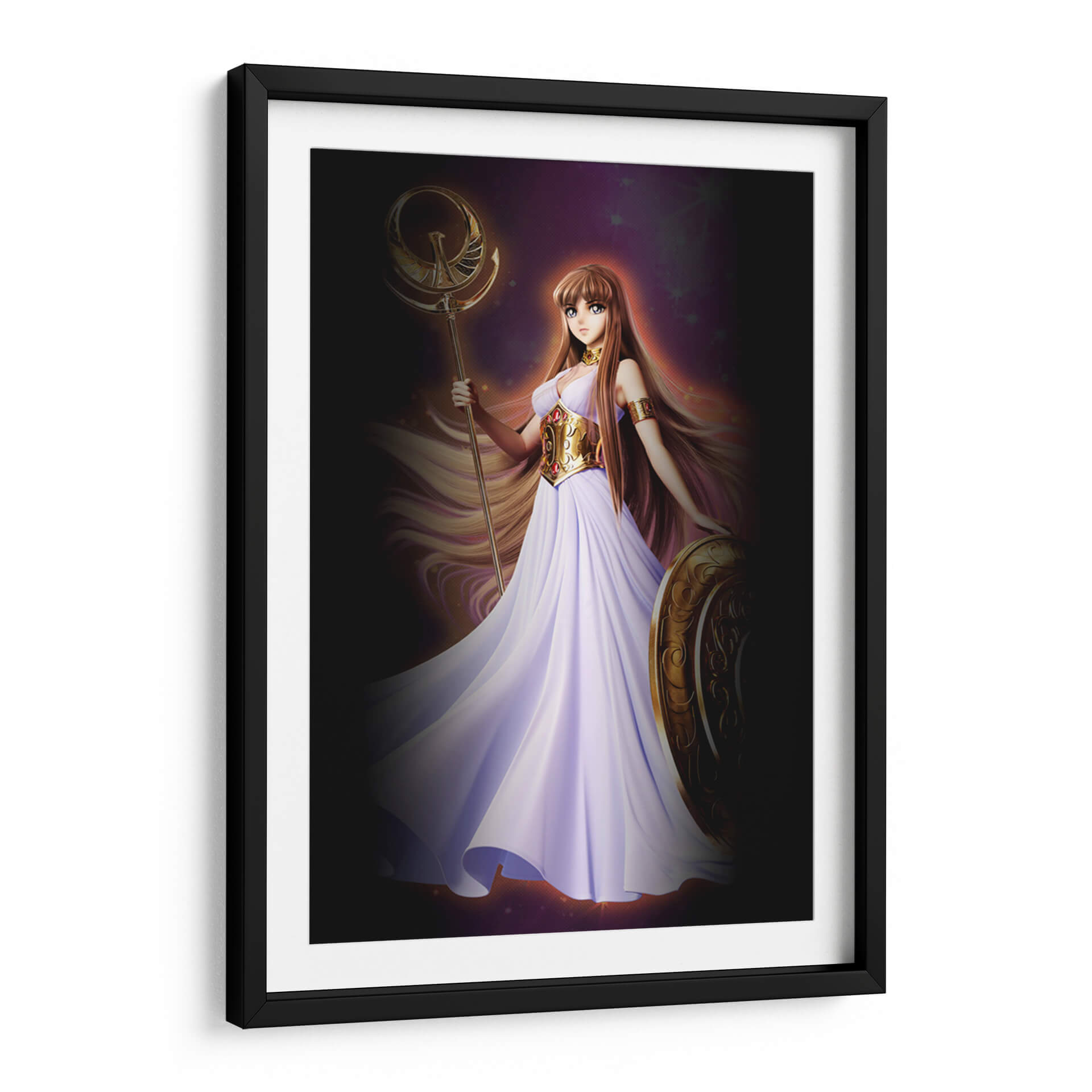 Sumérgete en la mística elegancia de este cuadro decorativo que presenta a una figura femenina etérea, inspirada en la mitología y la fantasía. La obra destaca por su detallada ilustración de una mujer con una túnica lila vaporosa y armadura dorada, portando un cetro celestial y un escudo ornamentado. Los colores predominantes, como el dorado cálido y los tonos suaves de lila, contrastan con un fondo oscuro y salpicado de estrellas, creando una atmósfera de misterio y poder sereno. El estilo de arte digital, con influencias de anime y fantasía épica, evoca una sensación de divinidad y fortaleza interior. Esta pieza es ideal para aquellos que buscan añadir un toque de sofisticación y carácter a sus espacios, ya sea una sala de estar moderna, un estudio o un dormitorio que necesite un punto focal cautivador. Su composición vertical y la pose de la figura central la convierten en una adición impresionante que invita a la contemplación y la admiración.