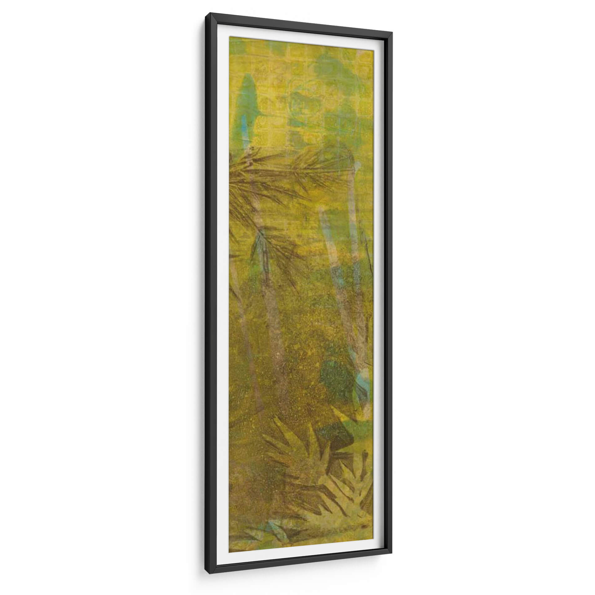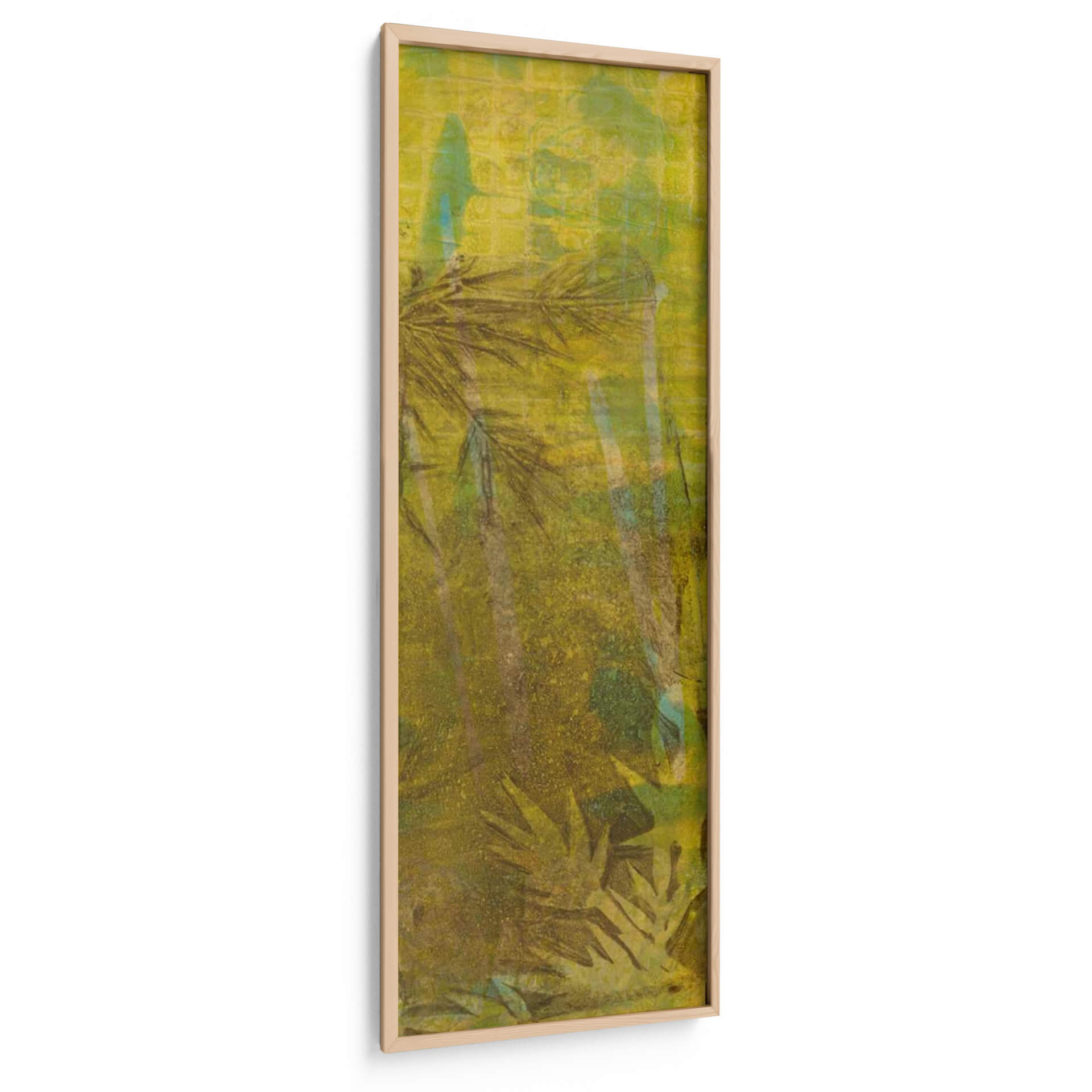 Sumérgete en la serenidad tropical con "Bambú Press II", una obra de arte contemporáneo de Jennifer Goldberger que evoca la exuberancia de un jardín secreto. Esta pieza vertical presenta una interpretación abstracta de cañas de bambú y follaje, donde los verdes profundos y los tonos tierra se entrelazan con sutiles toques de azul y amarillo, creando una atmósfera de calma y misterio natural. La textura visual, con pinceladas visibles y un posible uso de técnicas mixtas, aporta profundidad y un carácter artesanal a la composición. "Bambú Press II" es ideal para añadir un toque de naturaleza sofisticada y un respiro visual a cualquier espacio. Su formato alargado la hace perfecta para pasillos estrechos, o como elemento central en una sala de estar, comedor o estudio que busque una conexión con la tranquilidad del mundo natural. Transforma tu hogar u oficina en un oasis de paz con este cautivador cuadro decorativo que invita a la contemplación y al relax.