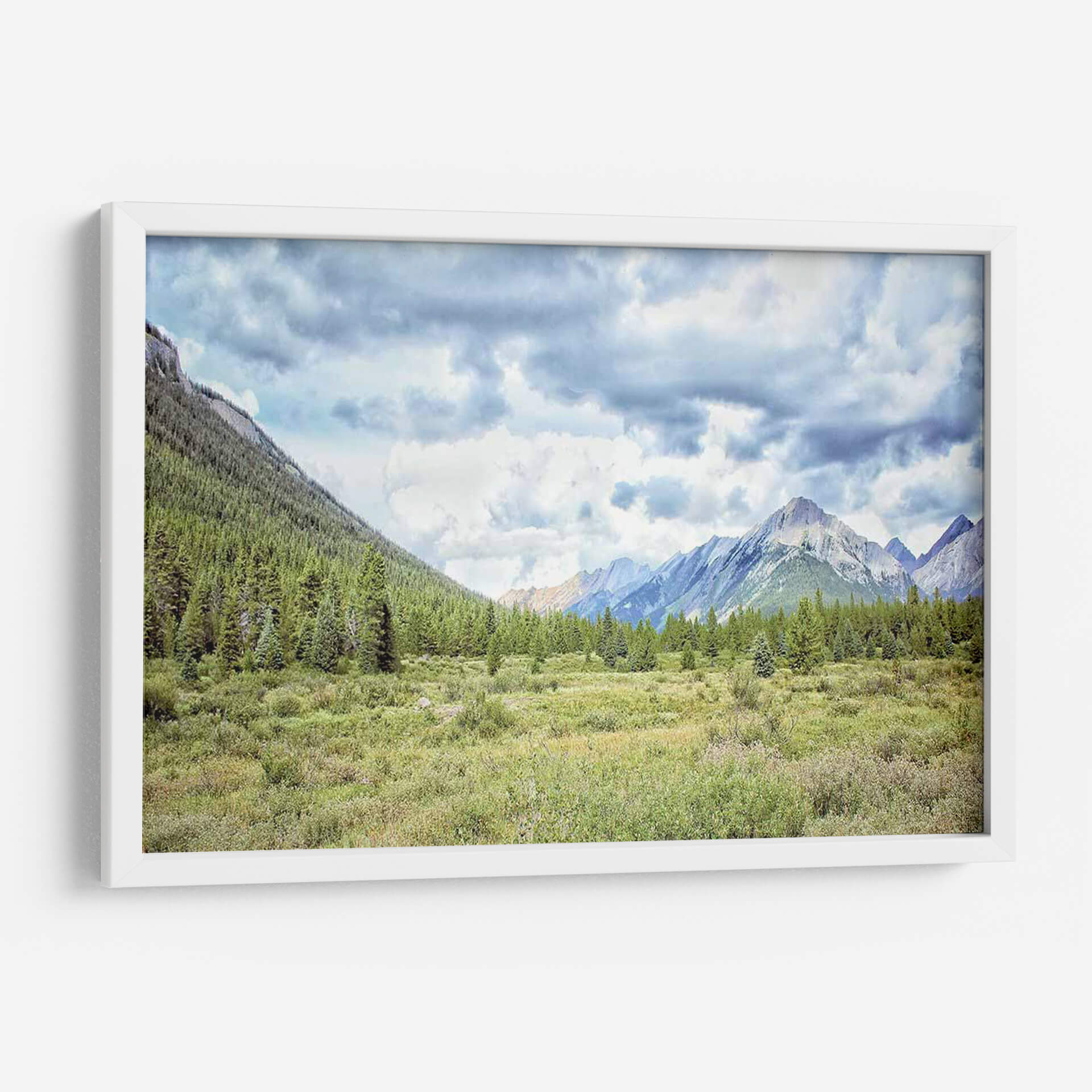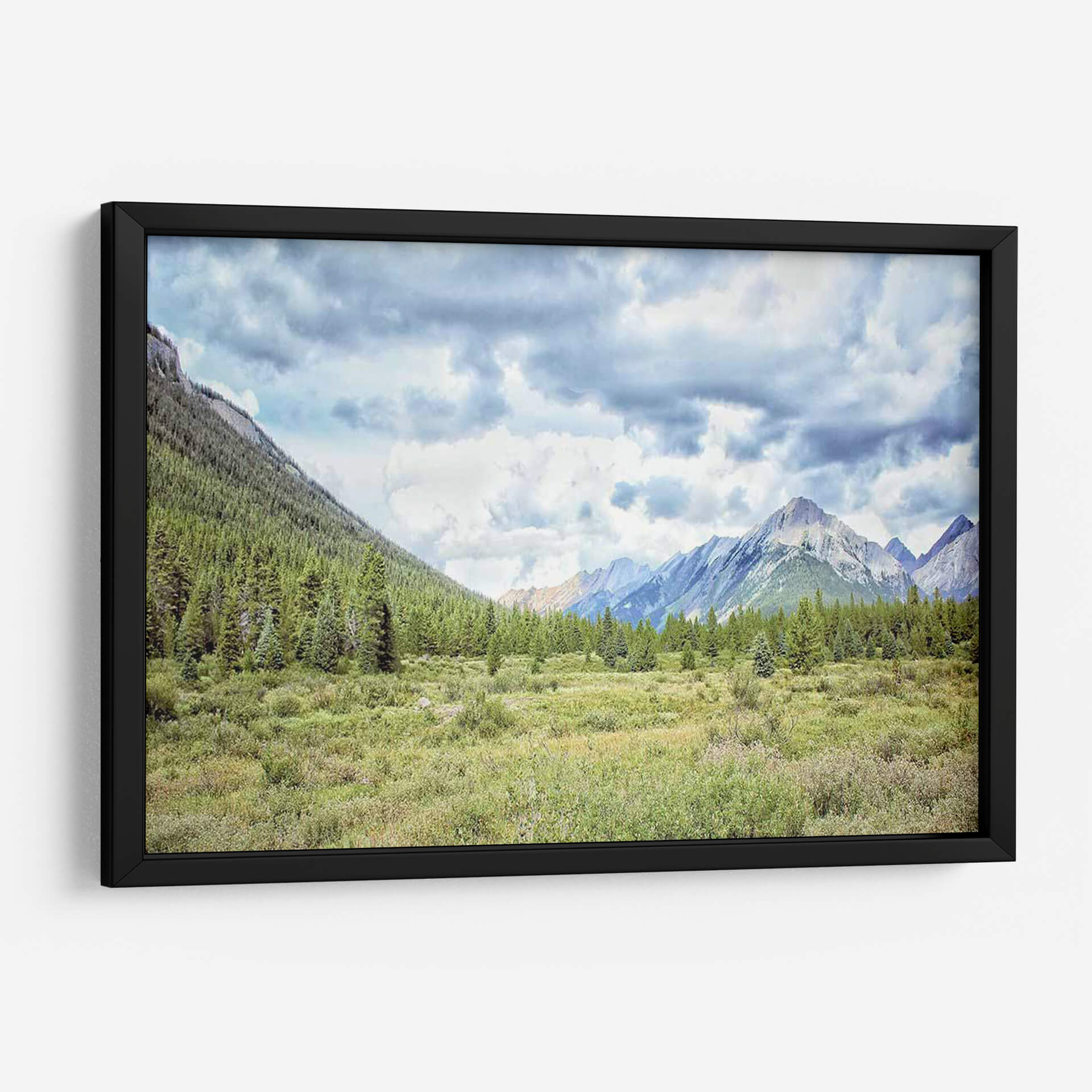 Sumérgete en la majestuosidad de la naturaleza con "Banff II", una obra de arte que captura la esencia de un paisaje montañoso sereno y evocador. Este cuadro decorativo transporta a los espectadores a un prado verdejante salpicado de vegetación exuberante, flanqueado por densos bosques de coníferas que ascienden por las laderas de imponentes montañas. Las cumbres rocosas, bañadas por una luz tenue y un cielo nublado dramático, crean una atmósfera de paz y asombro. La paleta de colores, dominada por verdes profundos, tonos tierra y grises celestes, aporta una sensación de calma y conexión con el entorno natural. El estilo, que combina la fotografía paisajista con un toque pictórico, permite apreciar la textura y la profundidad de la escena. "Banff II" es ideal para crear un punto focal inspirador en salones, estudios u oficinas, añadiendo un toque de serenidad y belleza natural a cualquier espacio. Su composición panorámica invita a la contemplación, invitando a soñar con aventuras al aire libre y la tranquilidad de la alta montaña. Una pieza perfecta para los amantes de la naturaleza y el arte paisajista que buscan infundir sus hogares con tranquilidad y elegancia.