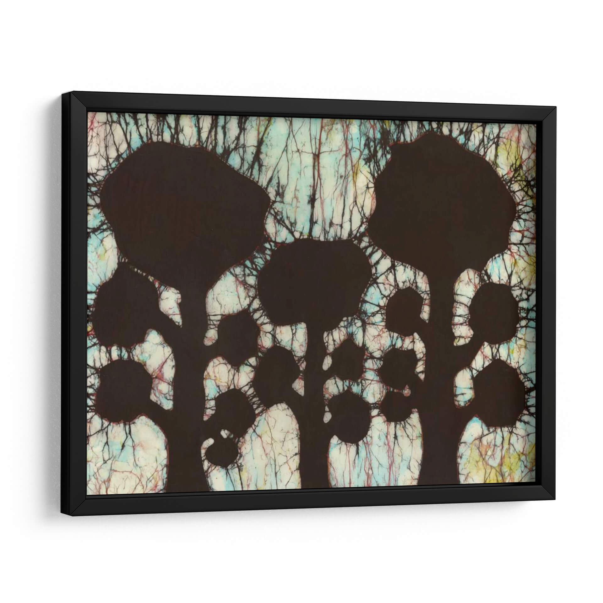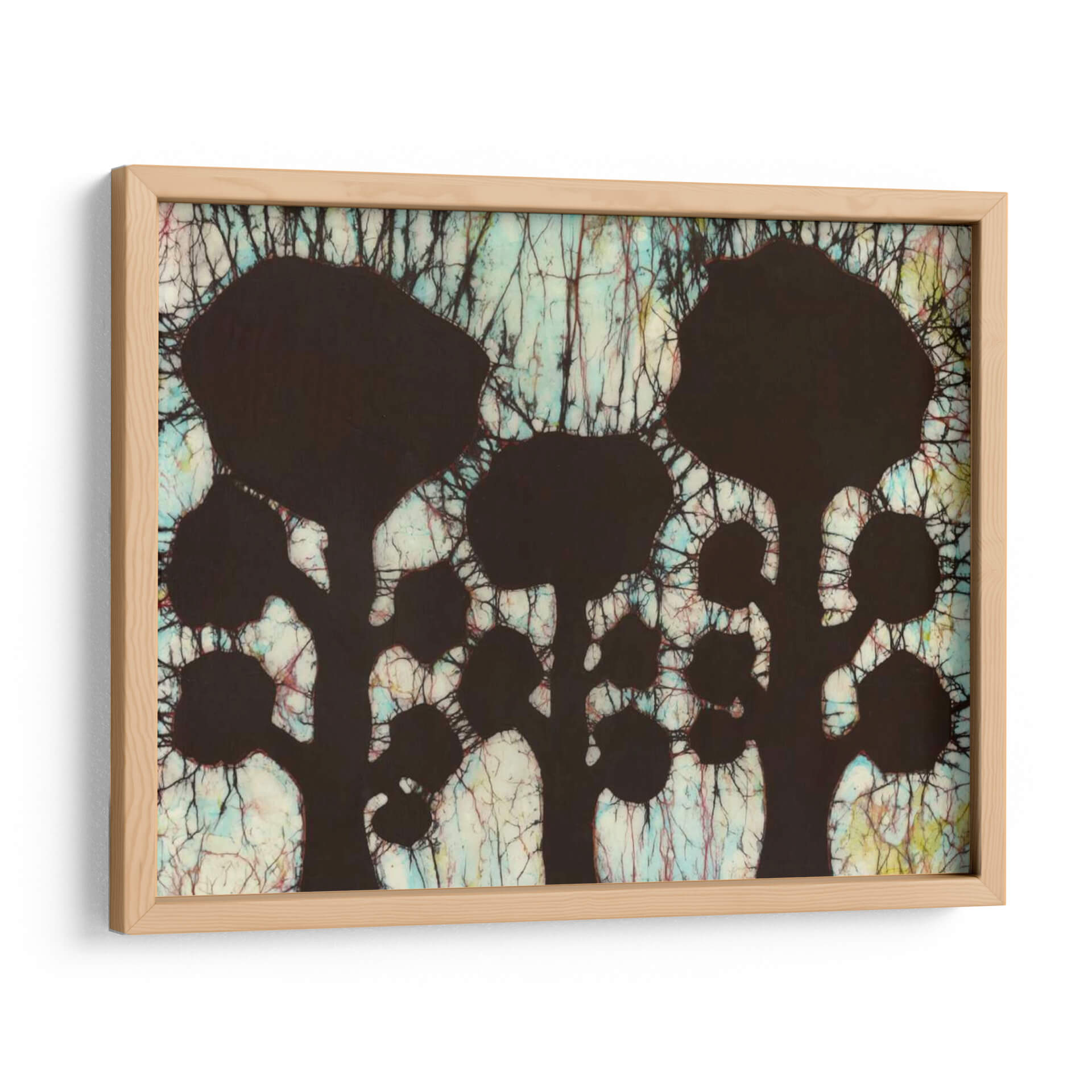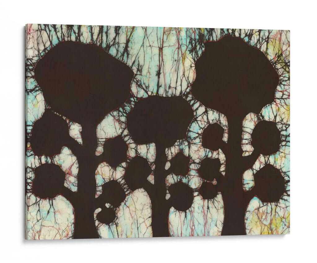Adéntrate en un mundo de siluetas orgánicas y texturas cautivadoras con "Batik Coberturas I", una obra de arte contemporáneo que evoca la belleza enigmática de la naturaleza. Las formas oscuras y redondeadas, reminiscentes de copas de árboles o formaciones botánicas estilizadas, se recortan contra un fondo vibrante y agrietado. Los colores de fondo, una mezcla etérea de azules celestes, toques de rojo, amarillo y blanco, crean una sensación de profundidad y movimiento, como un cielo tormentoso o un tejido exótico. La técnica, que sugiere la delicadeza del batik, añade una capa de complejidad visual con sus intrincadas líneas y patrones craquelados que imitan la corteza de un árbol o las venas de una hoja. Esta pieza abstracta y a la vez evocadora es perfecta para añadir un toque de misterio y sofisticación a cualquier espacio. Ideal como cuadro decorativo para salones modernos, oficinas o dormitorios que buscan un punto focal artístico y una conexión con lo orgánico. "Batik Coberturas I" invita a la contemplación y transforma cualquier pared en una ventana a un paisaje imaginario y lleno de textura.
