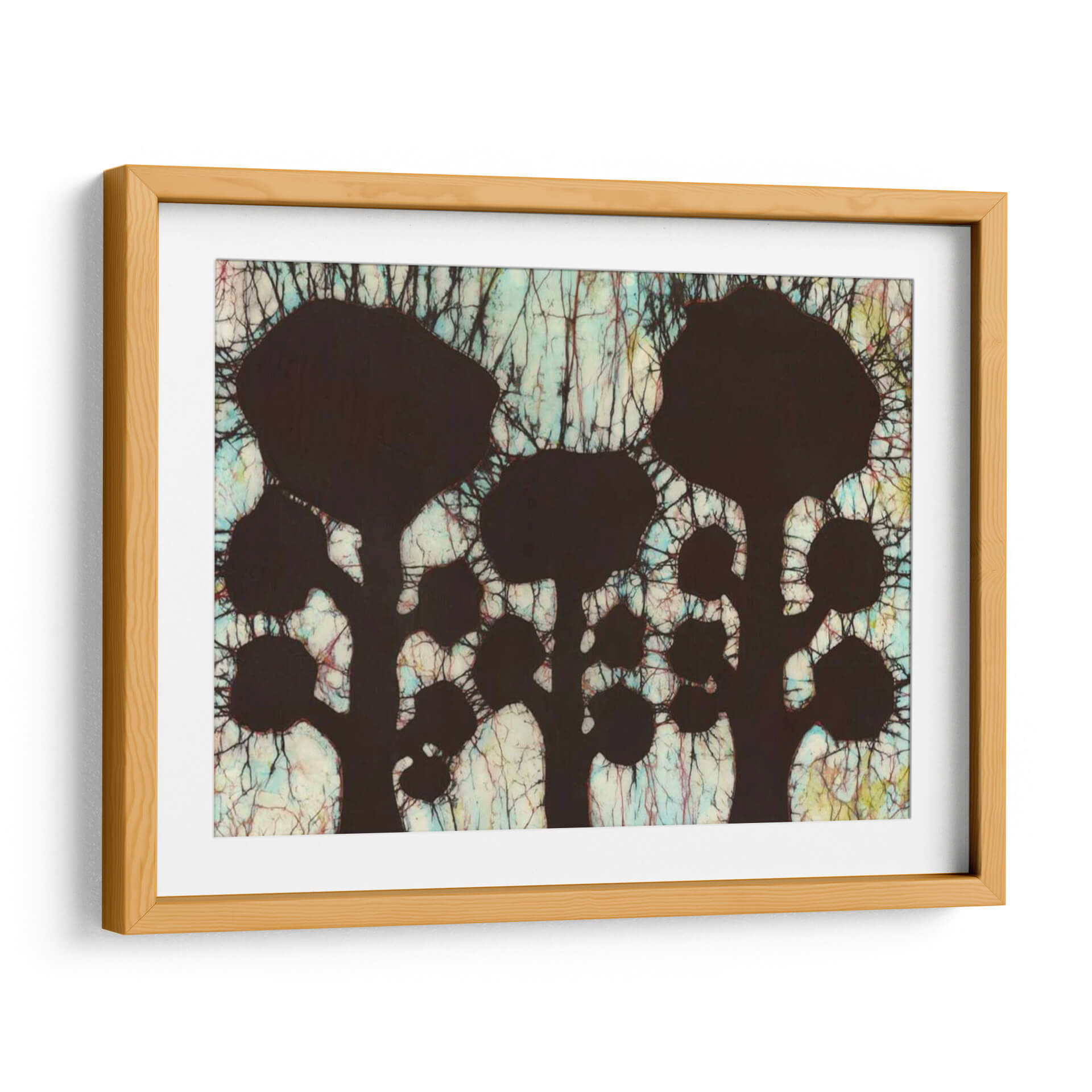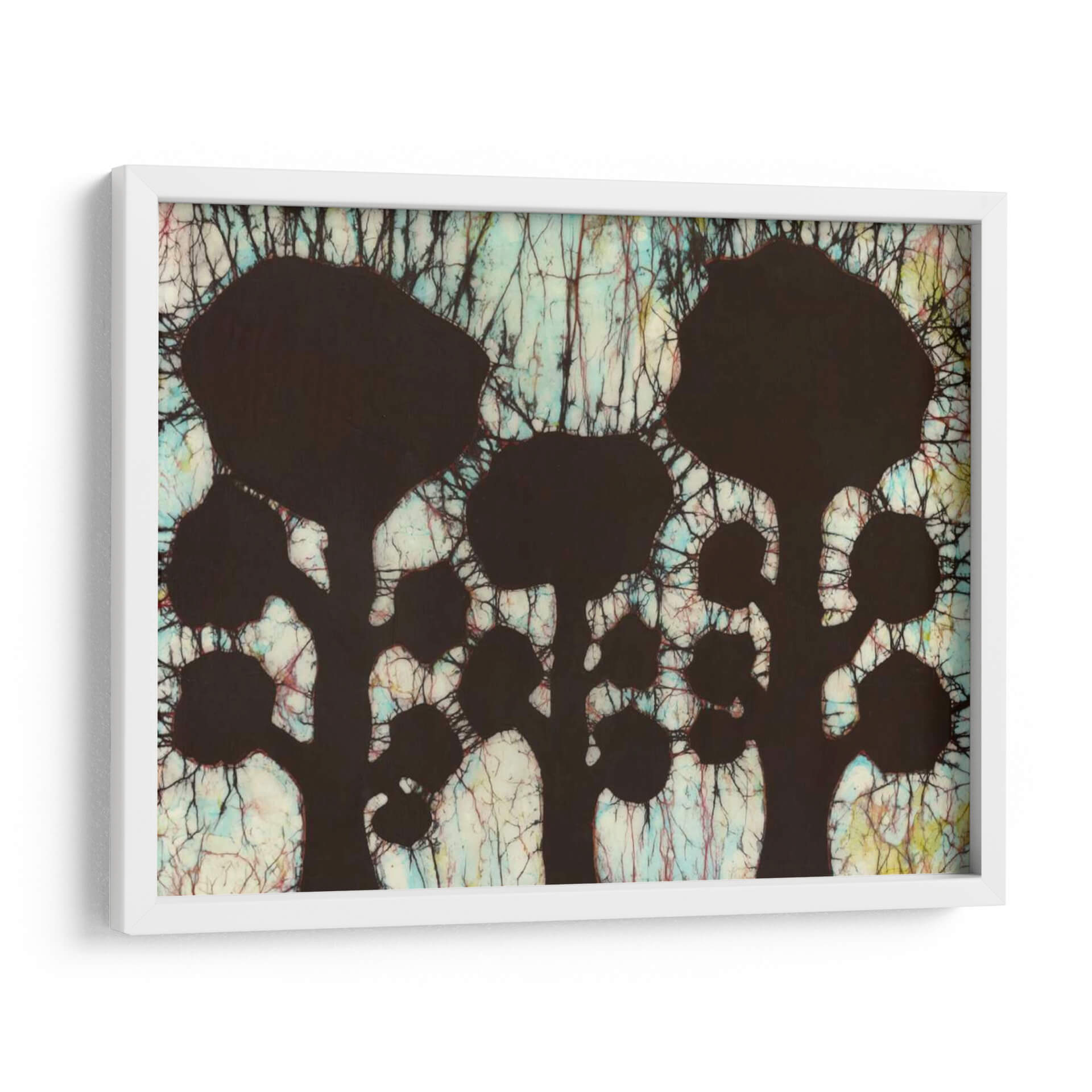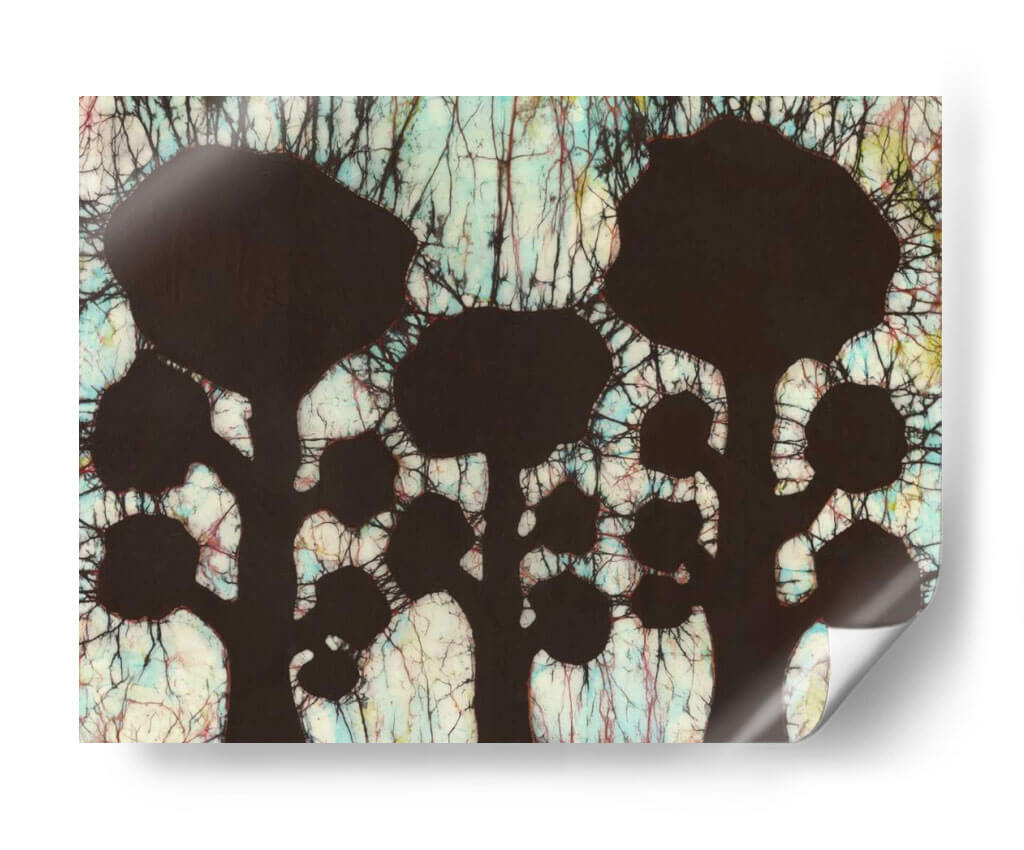 Adéntrate en un mundo de siluetas orgánicas y texturas cautivadoras con "Batik Coberturas I", una obra de arte contemporáneo que evoca la belleza enigmática de la naturaleza. Las formas oscuras y redondeadas, reminiscentes de copas de árboles o formaciones botánicas estilizadas, se recortan contra un fondo vibrante y agrietado. Los colores de fondo, una mezcla etérea de azules celestes, toques de rojo, amarillo y blanco, crean una sensación de profundidad y movimiento, como un cielo tormentoso o un tejido exótico. La técnica, que sugiere la delicadeza del batik, añade una capa de complejidad visual con sus intrincadas líneas y patrones craquelados que imitan la corteza de un árbol o las venas de una hoja. Esta pieza abstracta y a la vez evocadora es perfecta para añadir un toque de misterio y sofisticación a cualquier espacio. Ideal como cuadro decorativo para salones modernos, oficinas o dormitorios que buscan un punto focal artístico y una conexión con lo orgánico. "Batik Coberturas I" invita a la contemplación y transforma cualquier pared en una ventana a un paisaje imaginario y lleno de textura.