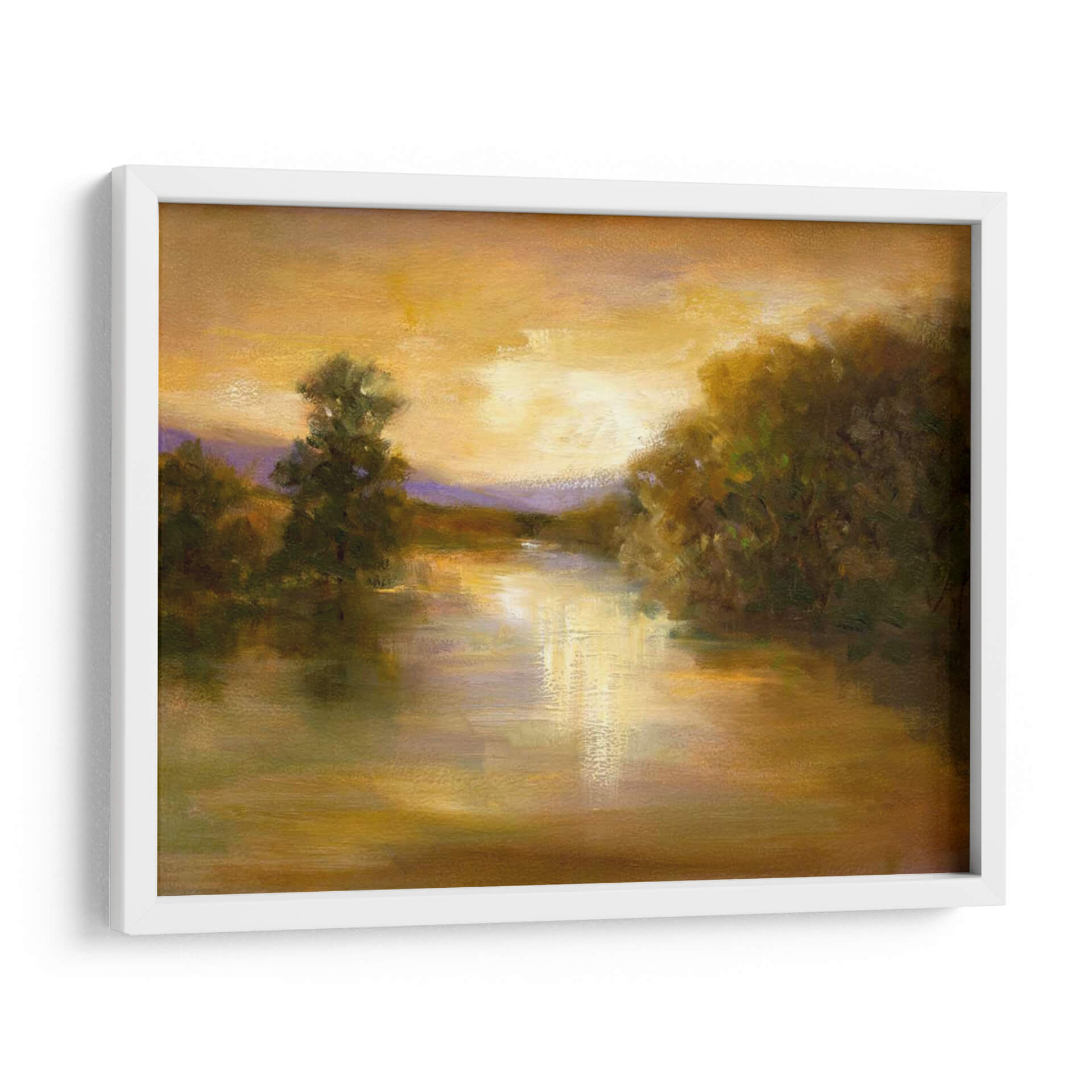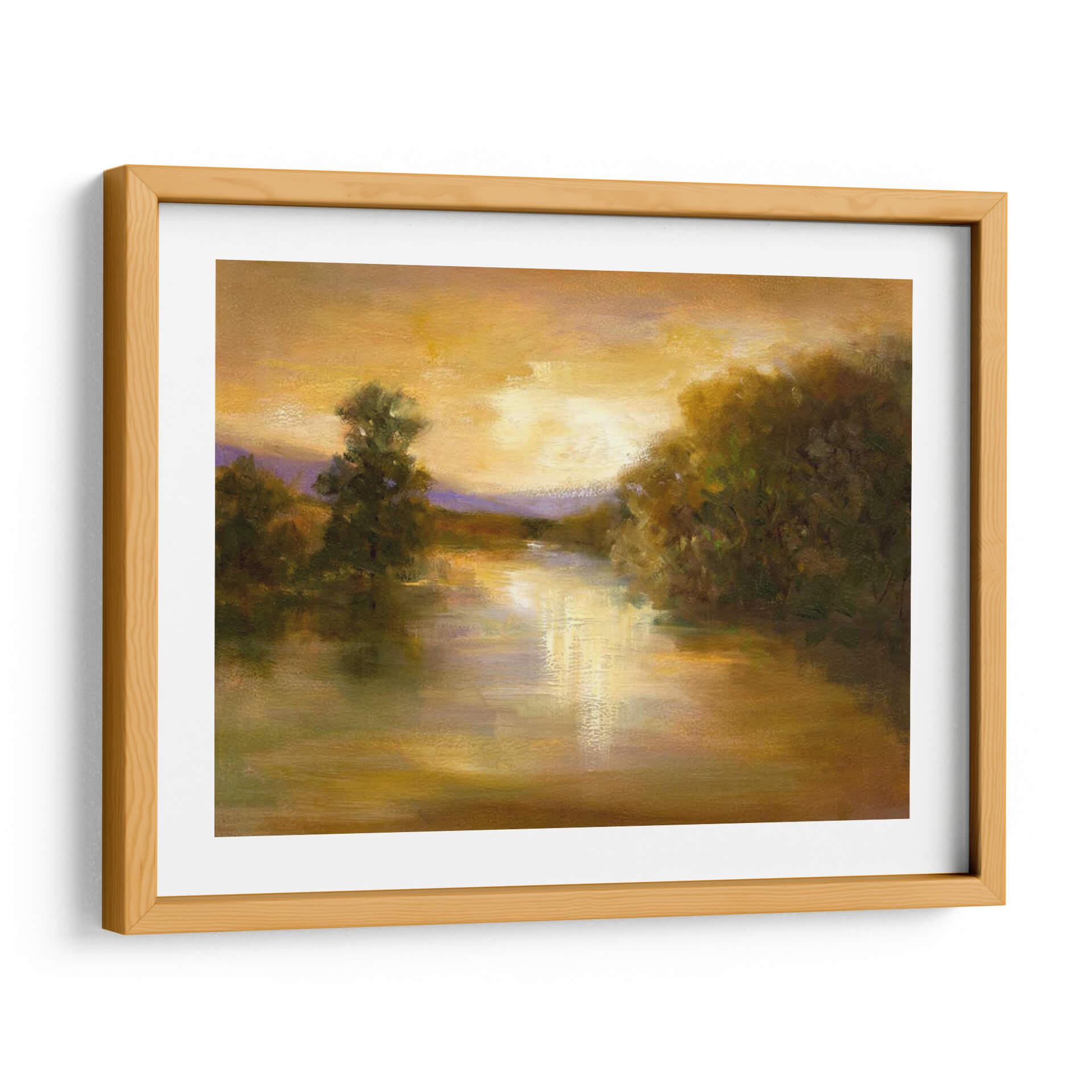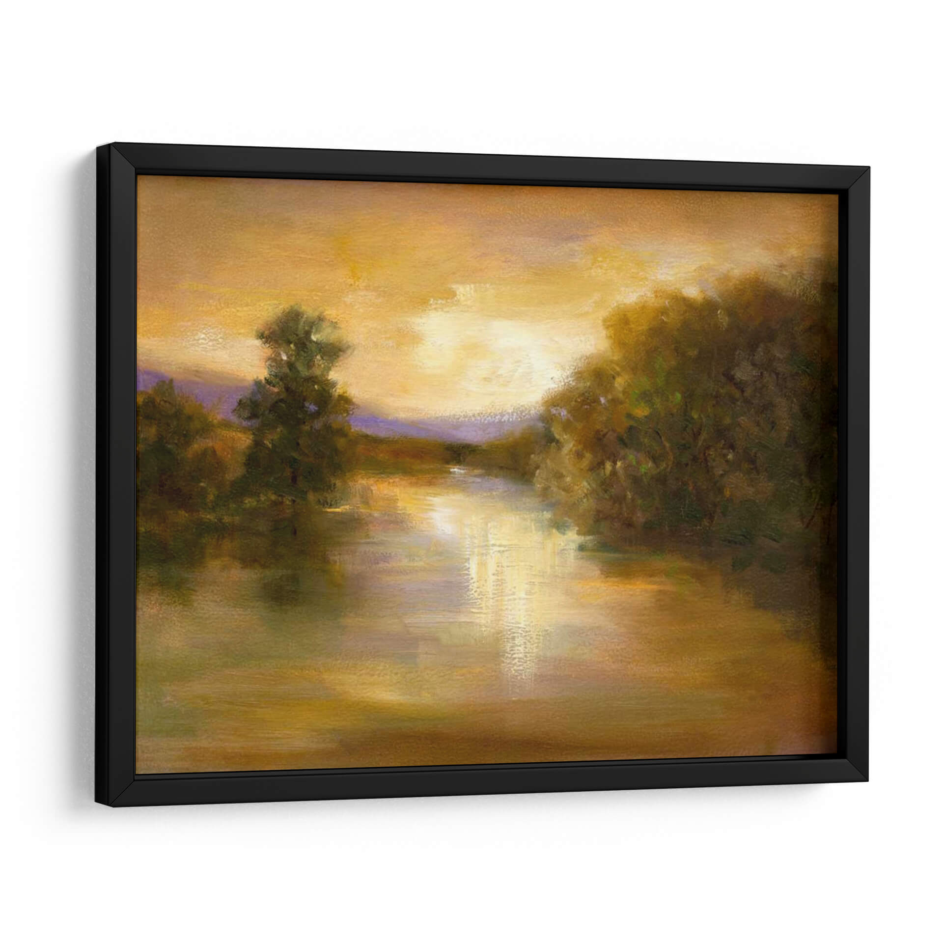 Sumérgete en la serenidad de "Brillo De Sol", una obra maestra de Sheila Finch que captura la esencia de un paisaje bañado por la luz dorada del atardecer. Este cuadro decorativo evoca una profunda sensación de paz y tranquilidad, transportándote a un remanso de calma. Los tonos cálidos y envolventes, que van desde el ocre dorado hasta verdes musgo y sutiles toques de violeta en el horizonte, crean una atmósfera de ensueño. La pincelada suelta y expresiva de Finch da vida a la ribera de un río sereno, reflejando la luz celestial en sus aguas tranquilas y las frondosas orillas. La composición, con el río fluyendo suavemente hacia un horizonte brumoso y la vegetación exuberante enmarcando la escena, invita a la contemplación y al sosiego. Ideal para añadir un toque de naturaleza idílica y elegancia atemporal a tu sala de estar, dormitorio o estudio, este cuadro decorativo se convertirá en un punto focal de serenidad. Perfecto para quienes buscan arte de pared que inspire relajación y conecte con la belleza de la naturaleza.