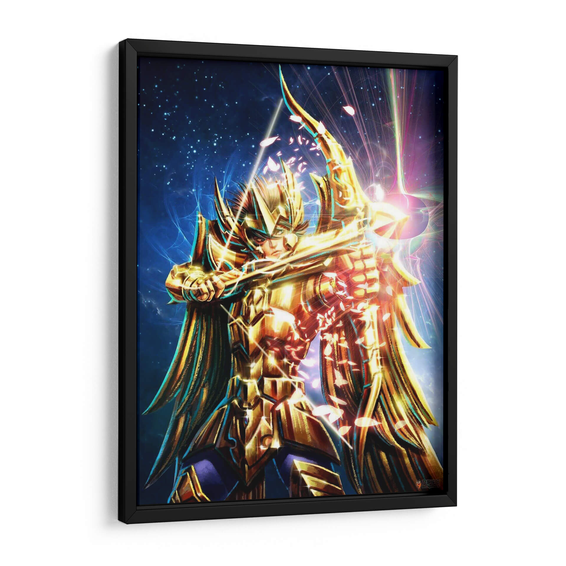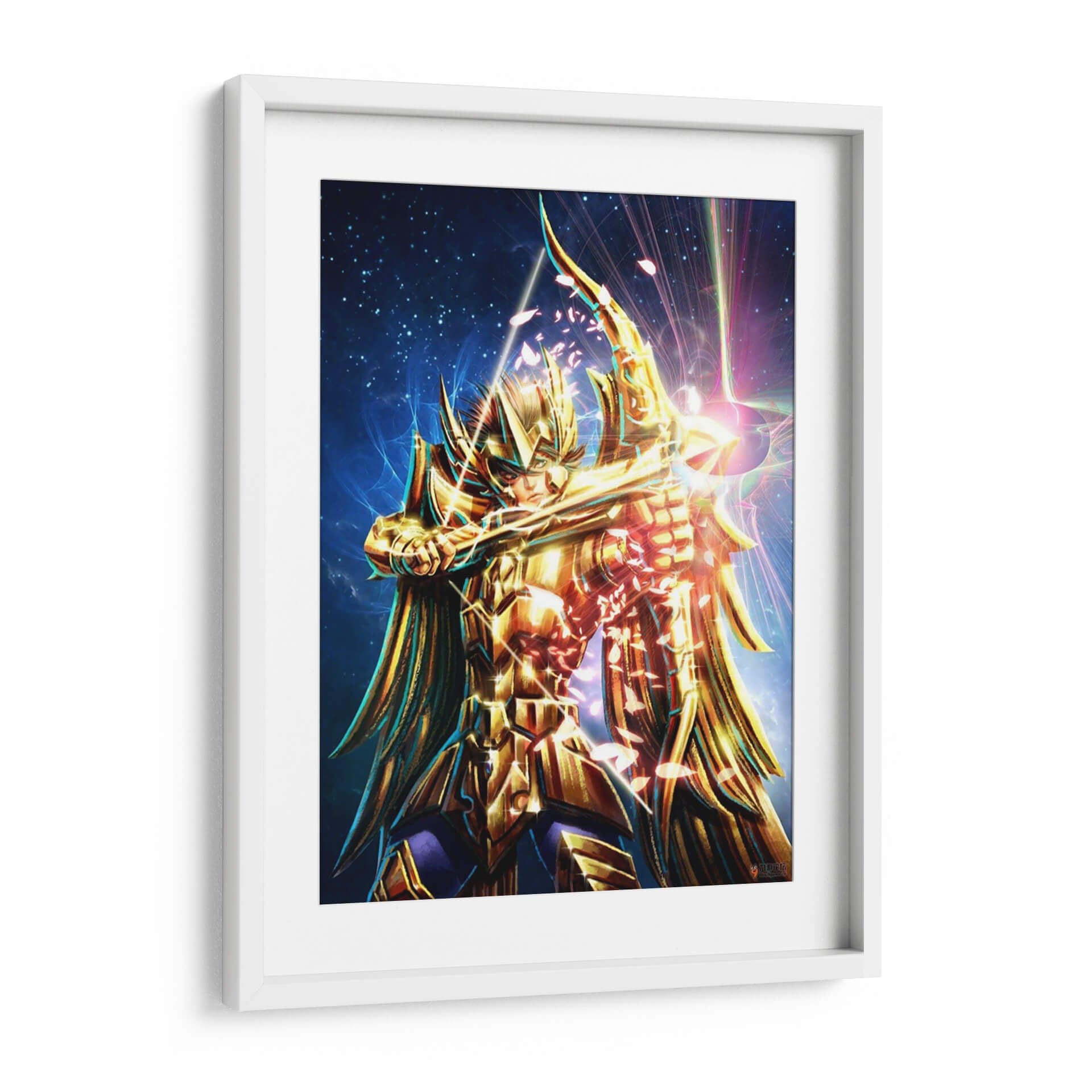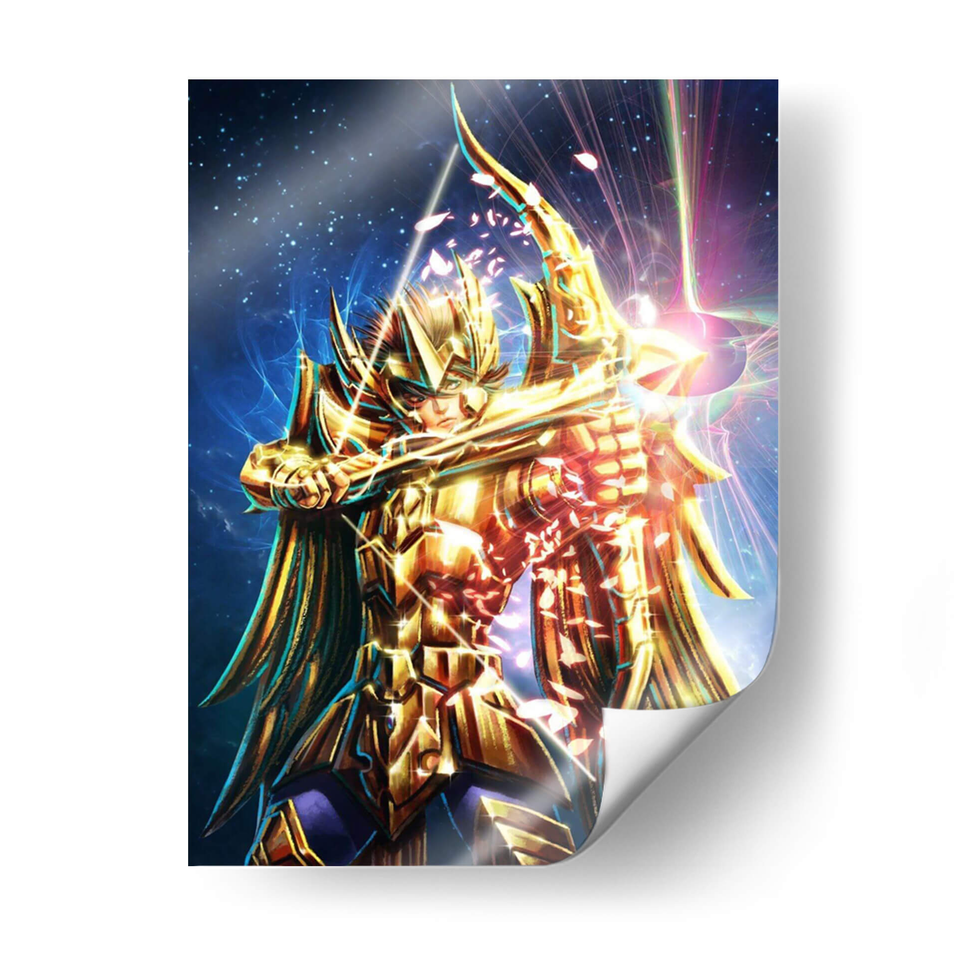 Sumérgete en el misticismo y el poder con "Caballero Dorado", una obra de arte digital que captura la esencia de un guerrero celestial. Esta pieza vibrante presenta a una figura imponente, ataviada con una armadura dorada reluciente, empuñando un arco y flecha con una determinación férrea. El fondo estrellado, salpicado de nebulosas azules y destellos de luz prismática, evoca un cosmos infinito y un escenario épico. La paleta de colores se centra en dorados intensos y azules profundos, con toques de rosa y púrpura que añaden un dinamismo etéreo. La composición, centrada en la figura del caballero, crea un punto focal potente, mientras que los efectos de luz y las partículas que parecen pétalos cayendo confieren una atmósfera de acción y magia. Ideal para quienes buscan infundir sus espacios con energía, coraje y un toque de fantasía épica, este cuadro decorativo es perfecto para una sala de estar moderna, un despacho o una habitación temática, atrayendo miradas y generando conversaciones.