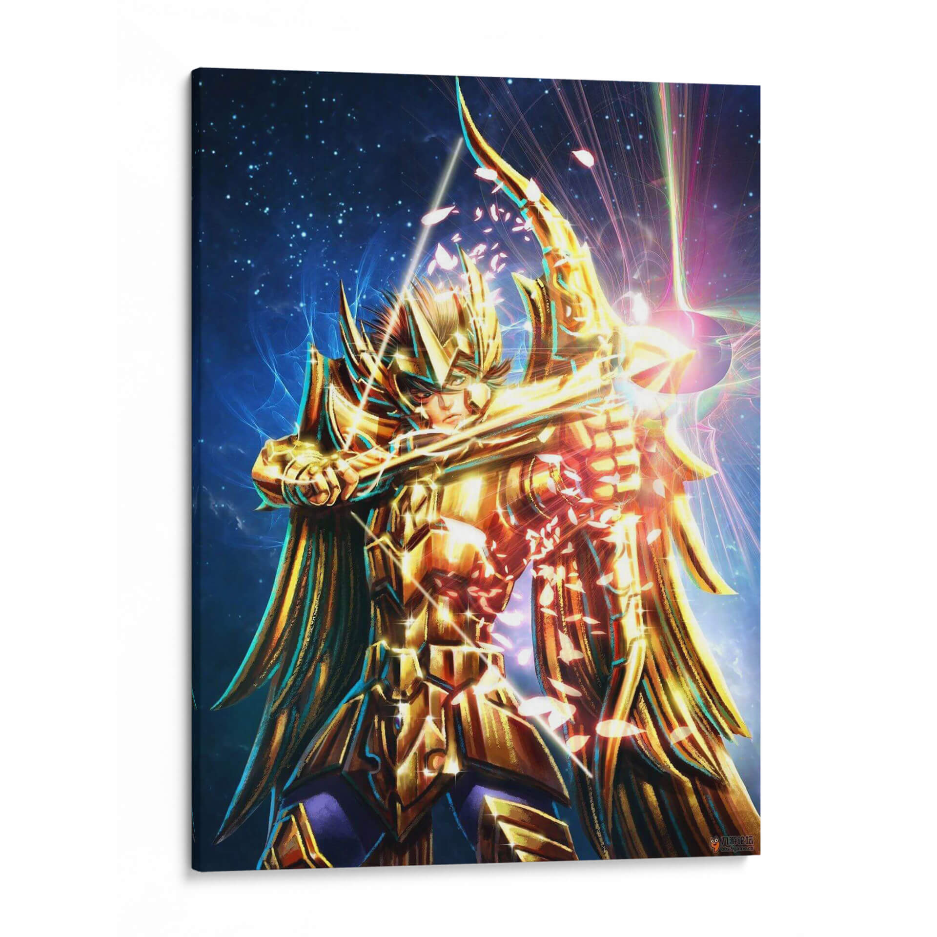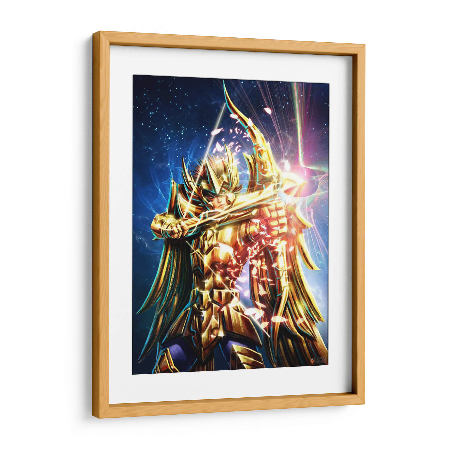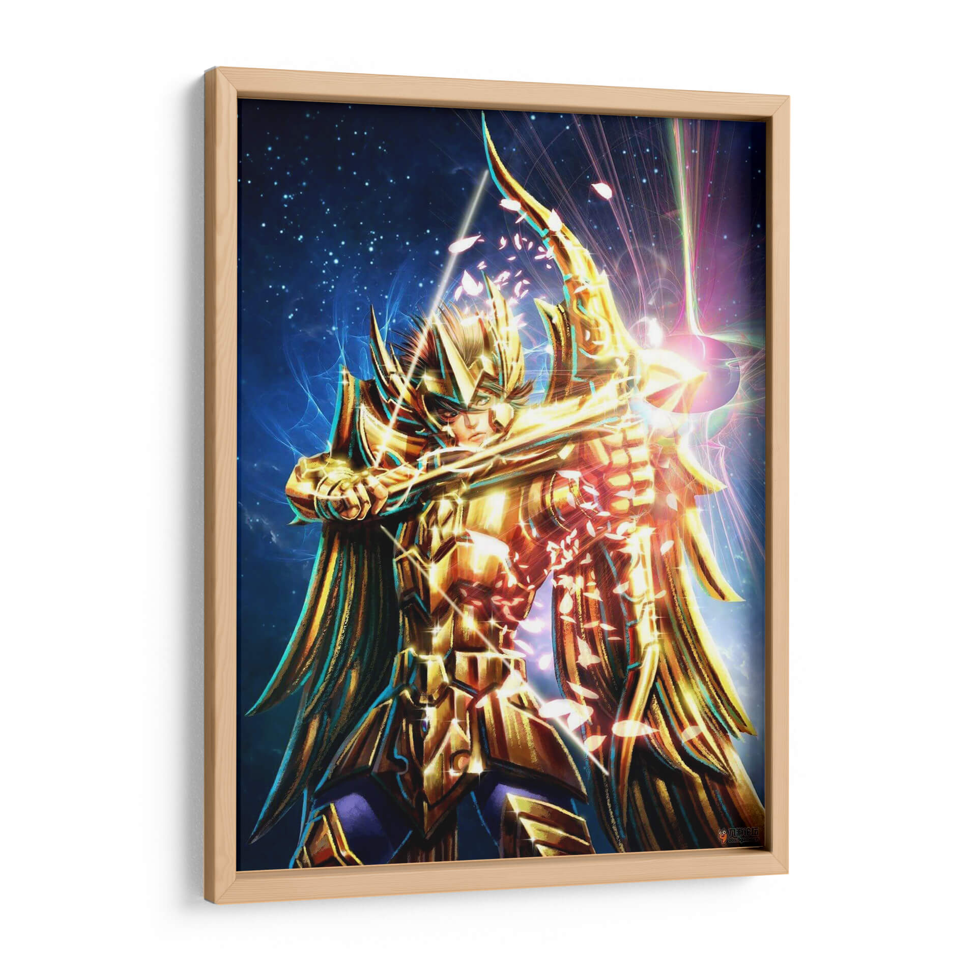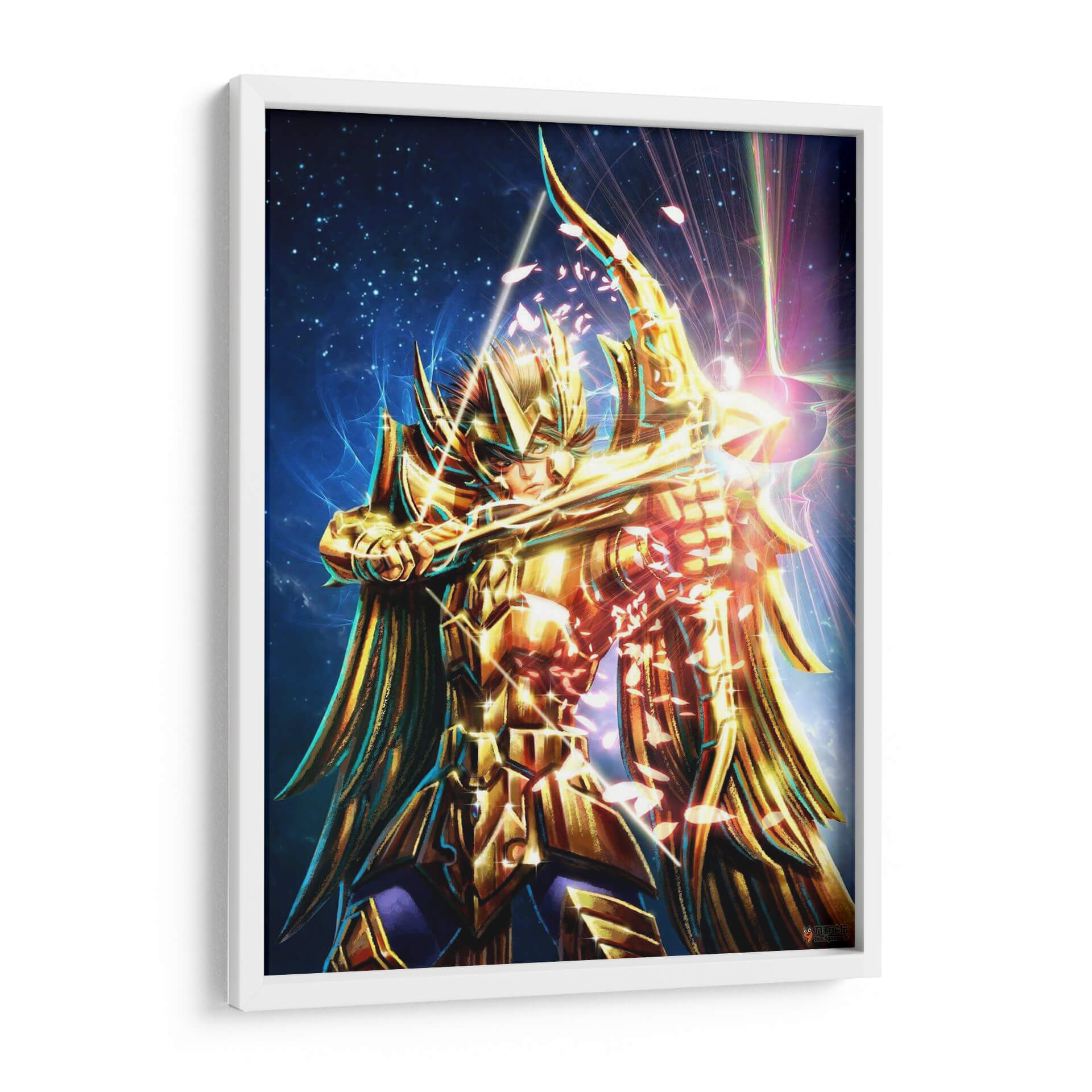 Sumérgete en el misticismo y el poder con "Caballero Dorado", una obra de arte digital que captura la esencia de un guerrero celestial. Esta pieza vibrante presenta a una figura imponente, ataviada con una armadura dorada reluciente, empuñando un arco y flecha con una determinación férrea. El fondo estrellado, salpicado de nebulosas azules y destellos de luz prismática, evoca un cosmos infinito y un escenario épico. La paleta de colores se centra en dorados intensos y azules profundos, con toques de rosa y púrpura que añaden un dinamismo etéreo. La composición, centrada en la figura del caballero, crea un punto focal potente, mientras que los efectos de luz y las partículas que parecen pétalos cayendo confieren una atmósfera de acción y magia. Ideal para quienes buscan infundir sus espacios con energía, coraje y un toque de fantasía épica, este cuadro decorativo es perfecto para una sala de estar moderna, un despacho o una habitación temática, atrayendo miradas y generando conversaciones.