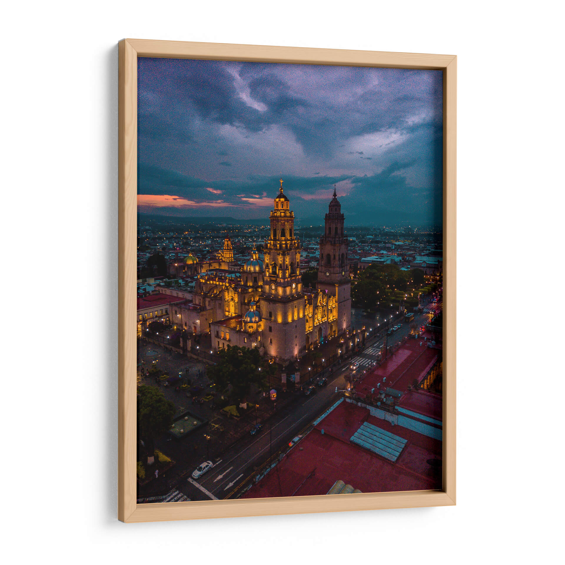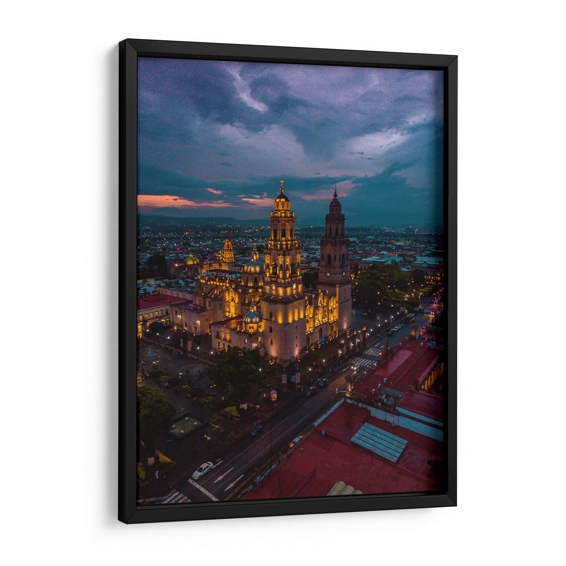 Captura la majestuosidad arquitectónica y la vibrante vida urbana con este impresionante cuadro decorativo de la Catedral de Morelia. Luis Fernando Cortez nos transporta a un momento crepuscular donde la imponente estructura del templo, bañada en luces cálidas, emerge contra un cielo dramático de tonos púrpuras y anaranjados. La perspectiva aérea resalta la escala monumental de la catedral, sus detalladas torres y cúpulas, así como el entramado de calles circundantes y tejados que conforman el corazón de la ciudad. Los colores profundos y el contraste entre la luz artificial que ilumina el edificio y la penumbra del atardecer crean una atmósfera de solemnidad y dinamismo. Este cuadro es ideal para añadir un toque de elegancia histórica y sofisticación a tu sala de estar, estudio u oficina. Su detallada representación y la atmósfera evocadora lo convierten en una pieza central que invita a la contemplación y al aprecio por la arquitectura icónica y los paisajes urbanos llenos de historia. Decora tus espacios con esta obra que combina arte, historia y la magia de un atardecer inolvidable.