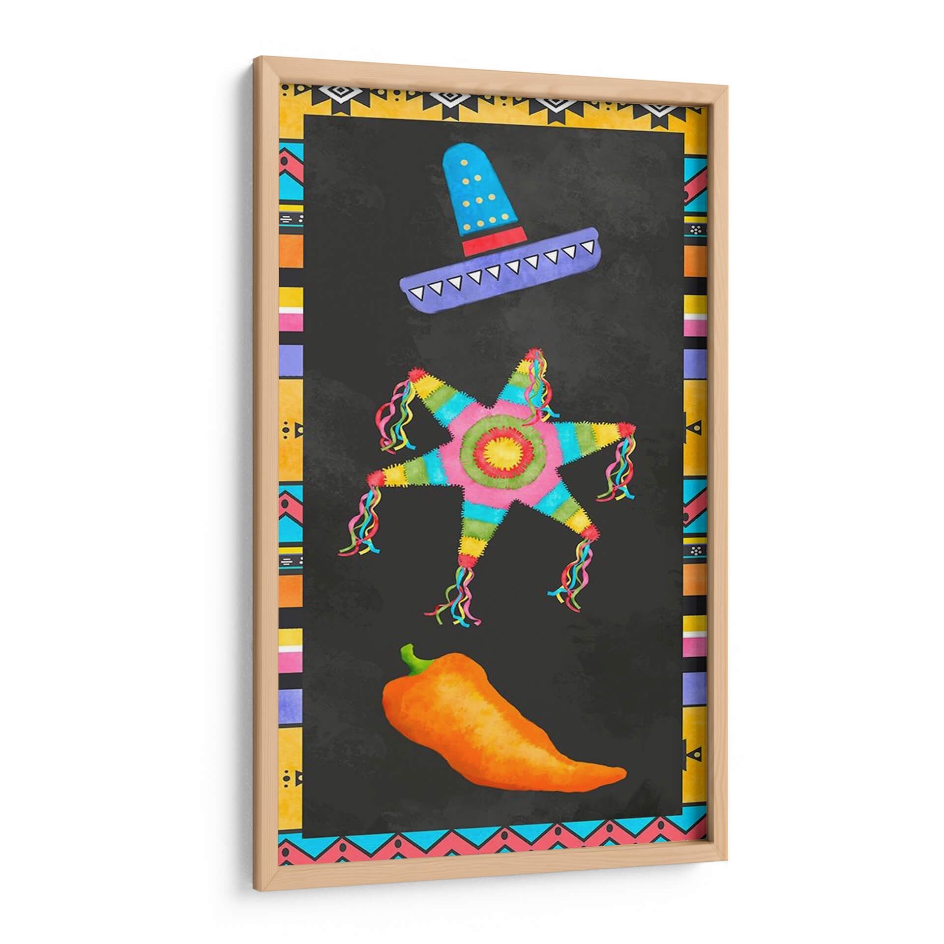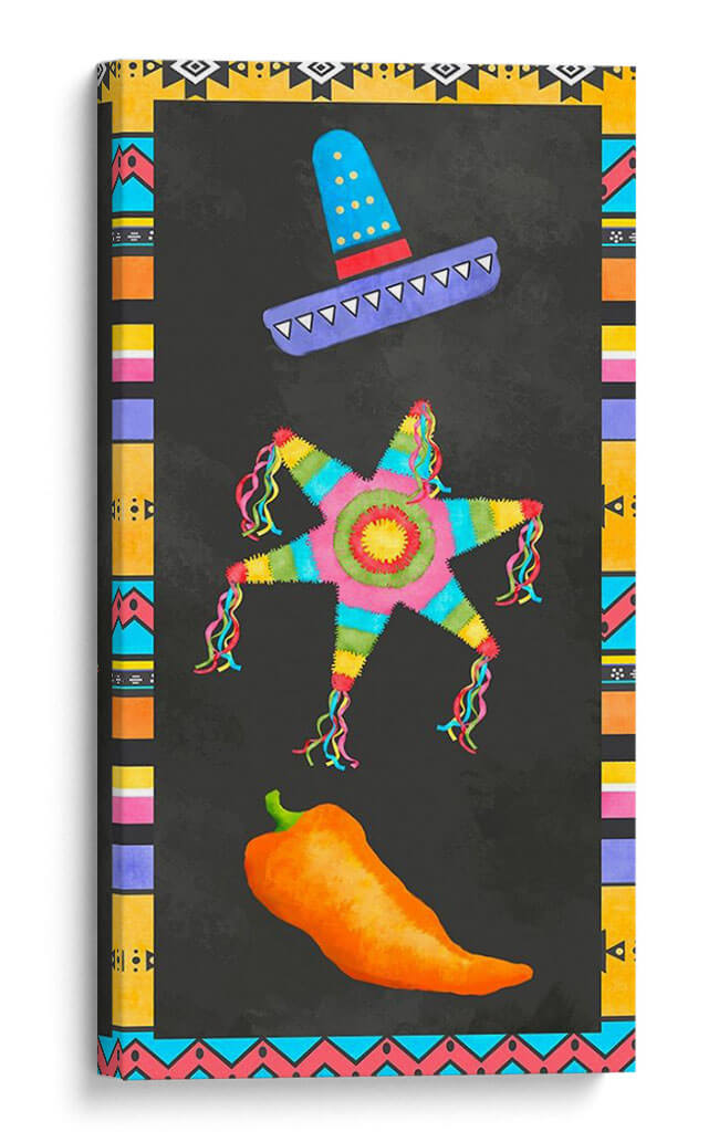 Celebra la alegría y la festividad con este vibrante cuadro decorativo, una obra de arte llena de color y energía inspirada en la icónica piñata mexicana. La pieza presenta una piñata de estrella en el centro, adornada con vibrantes colores que evocan la tradición y la diversión de las fiestas. A su alrededor, elementos como un sombrero y un chile picante añaden un toque auténtico y festivo, todo sobre un fondo oscuro que resalta la intensidad de la paleta cromática. Los bordes de la obra están decorados con un patrón geométrico inspirado en textiles tradicionales, añadiendo una capa adicional de riqueza visual. Este cuadro decorativo es perfecto para inyectar vitalidad y un espíritu alegre a cualquier espacio, ya sea una sala de estar moderna, una cocina, un comedor o incluso un espacio de entretenimiento. Su estilo pop y su temática festiva lo convierten en una pieza única que invita a la conversación y al disfrute. Ideal para quienes buscan añadir un toque de cultura mexicana y alegría desenfrenada a su decoración. Transforma tu hogar u oficina en un espacio lleno de optimismo y estilo con este llamativo cuadro decorativo de la colección Piñata Party B.