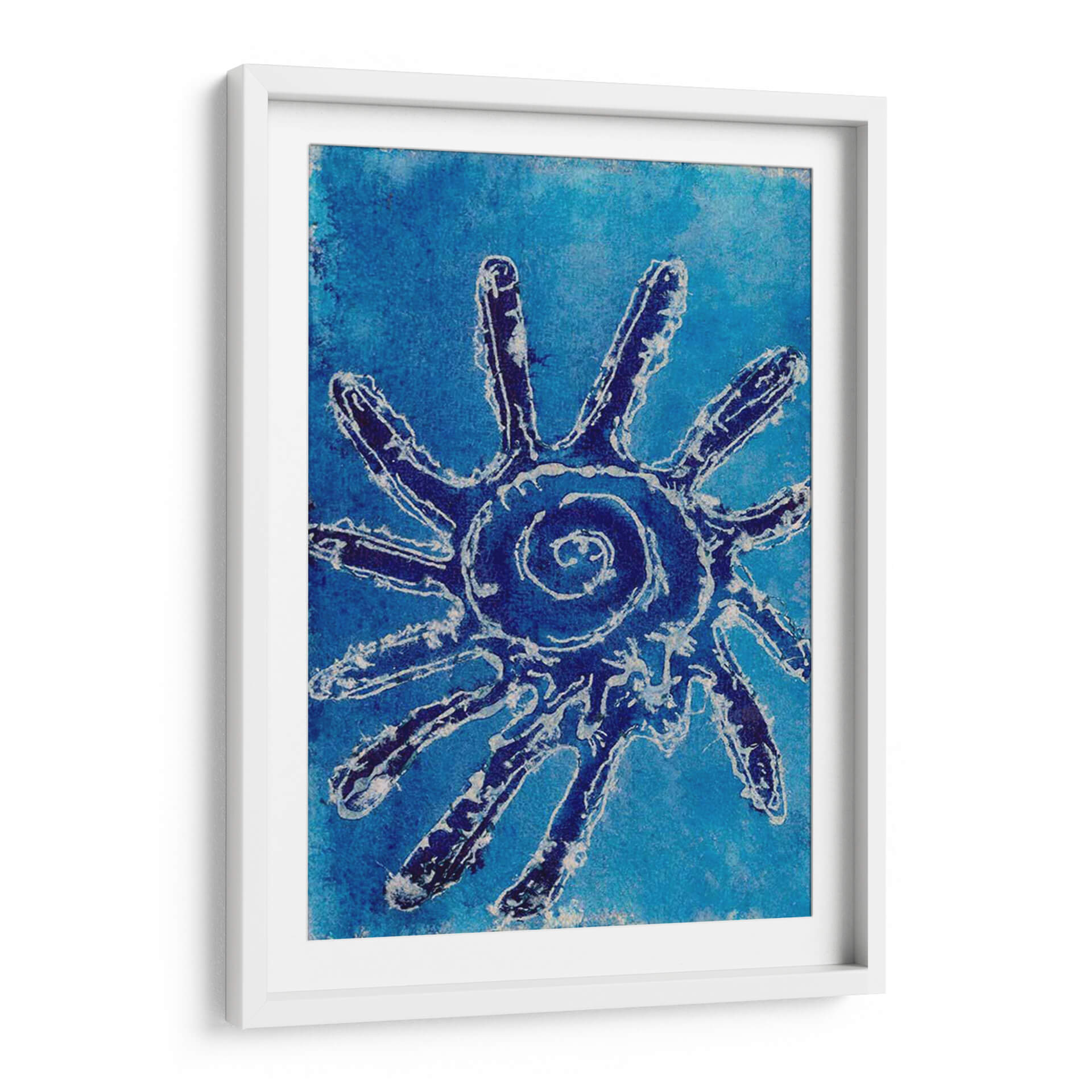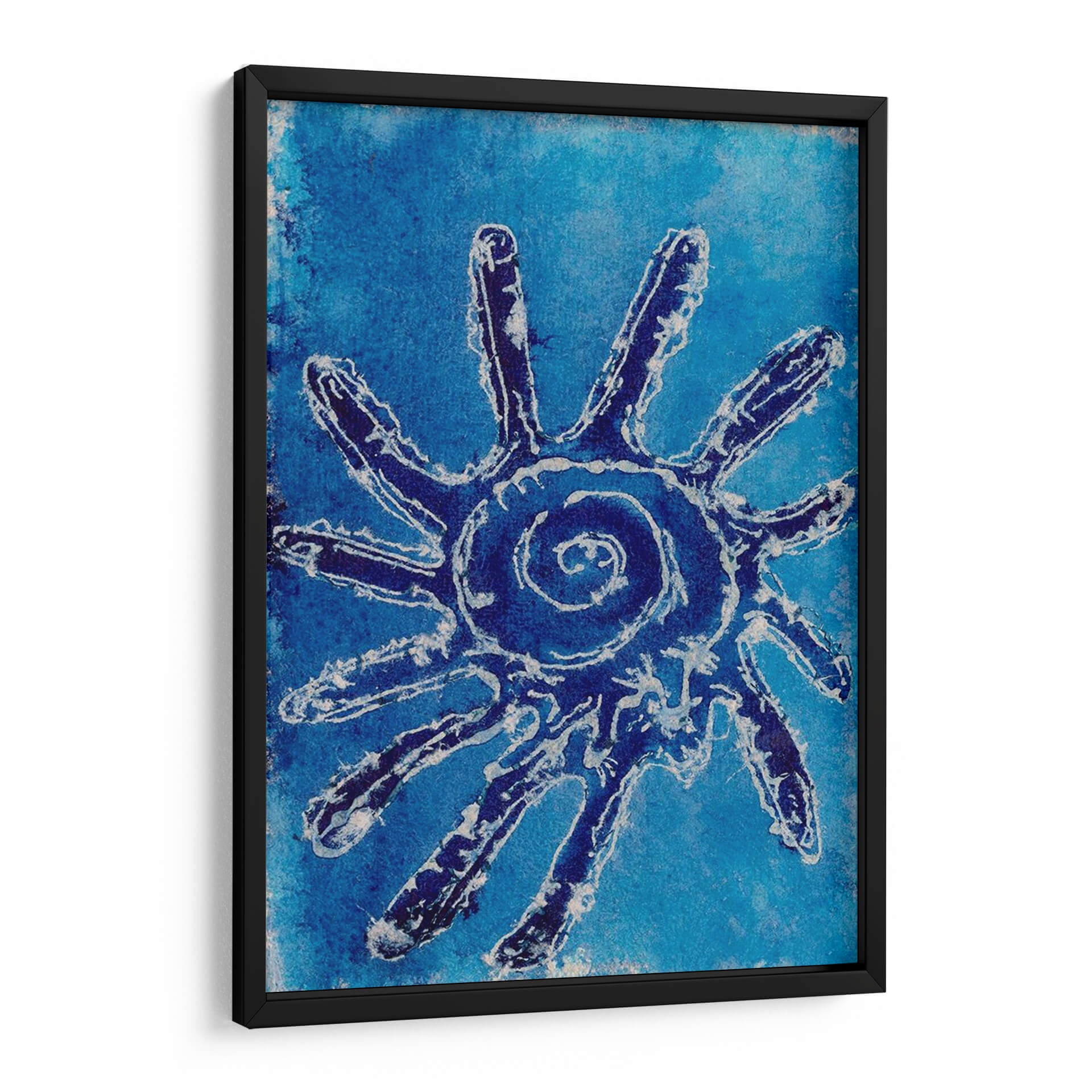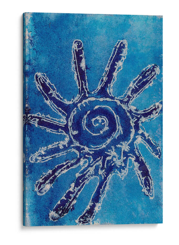 Sumérgete en la serenidad y el misterio con 'Conchas Cerúas V', una obra de arte cautivadora de Regina Moore. Este cuadro decorativo presenta una enigmática figura central, reminiscenta de un sol estilizado o una criatura marina abstracta, definida por trazos audaces en azul profundo y blanco sobre un vibrante fondo azul cerúleo. La composición evoca la inmensidad del océano y la energía vital que emana de sus profundidades. La paleta de azules intensos crea una atmósfera de calma profunda y contemplación, perfecta para transformar cualquier espacio en un santuario de paz. El estilo artístico, que fusiona elementos abstractos con una textura que recuerda a técnicas artesanales, aporta una dimensión única y orgánica a la pieza. 'Conchas Cerúas V' es ideal para quienes buscan añadir un toque de sofisticación natural y un punto focal intrigante a su sala de estar, dormitorio u oficina. Su diseño atemporal y su conexión con la naturaleza la convierten en una adición memorable a cualquier colección de arte contemporáneo, invitando a la reflexión y al asombro en cada mirada.