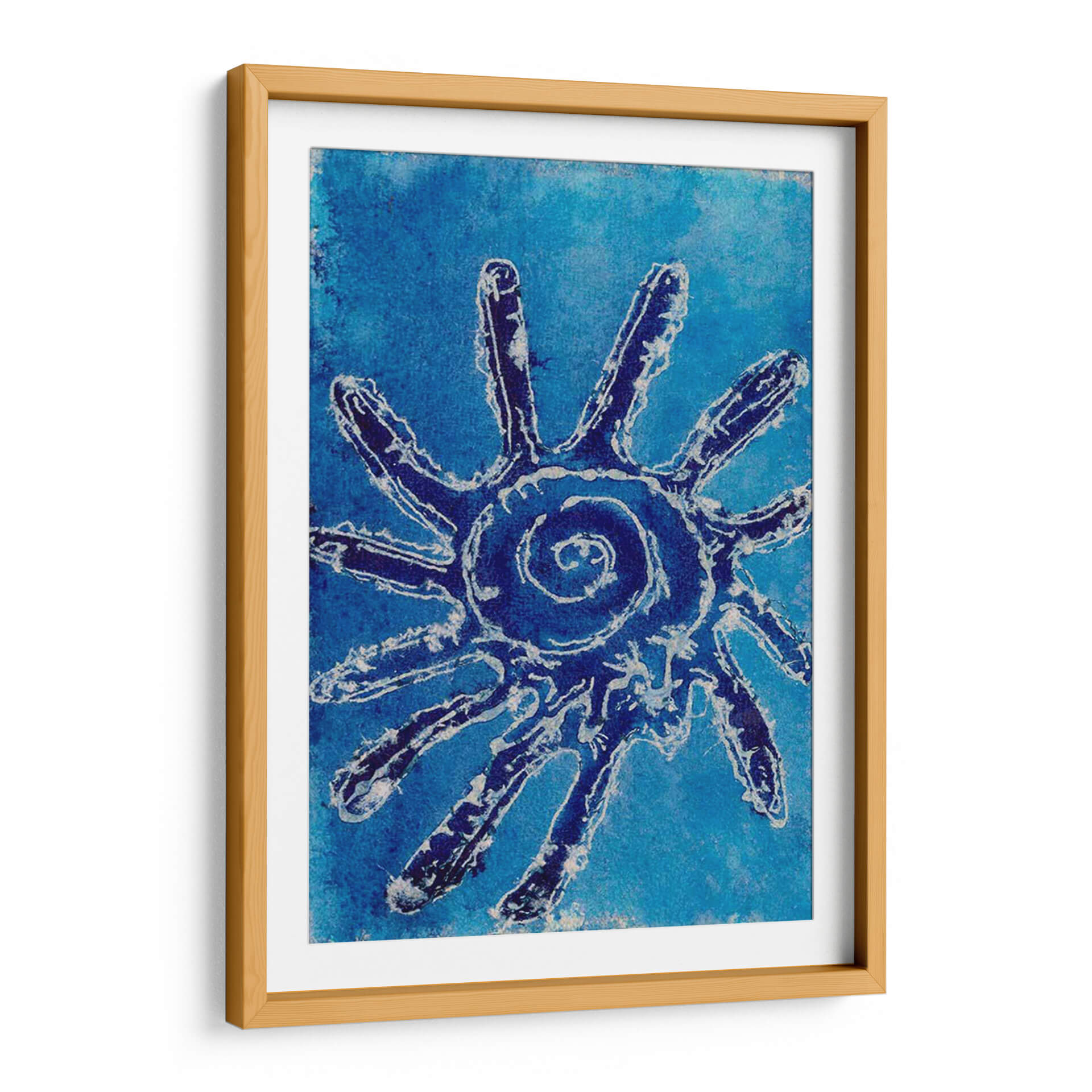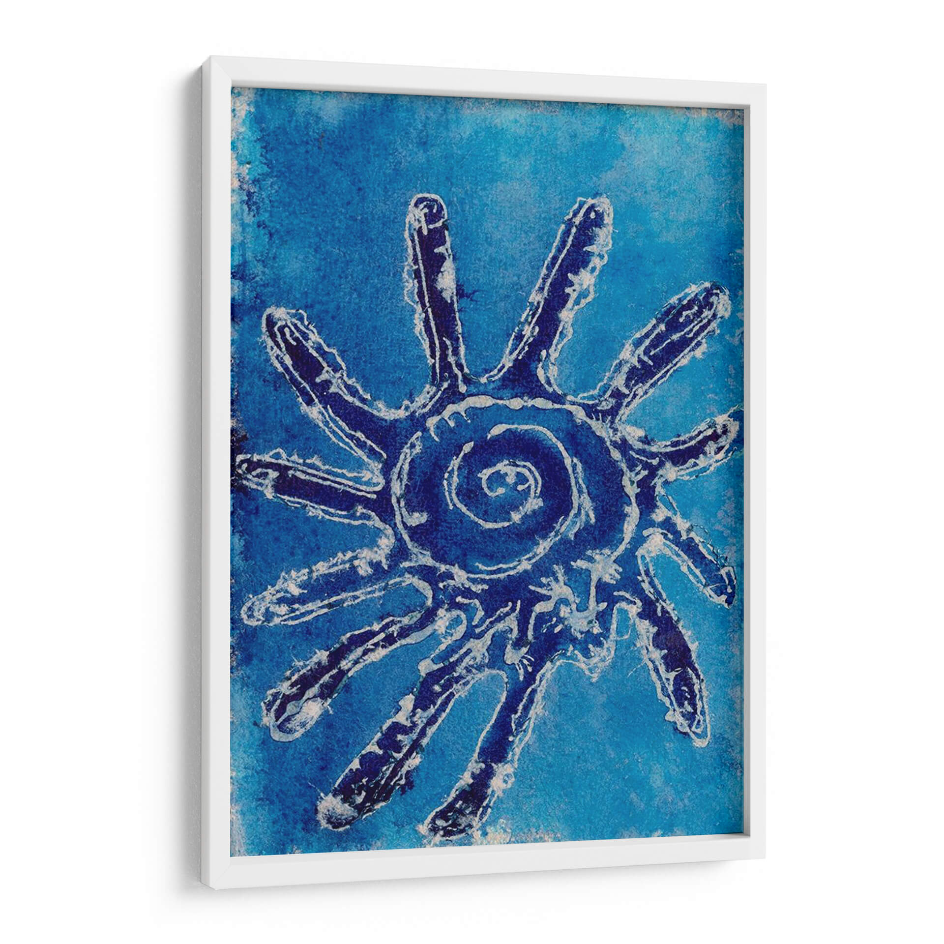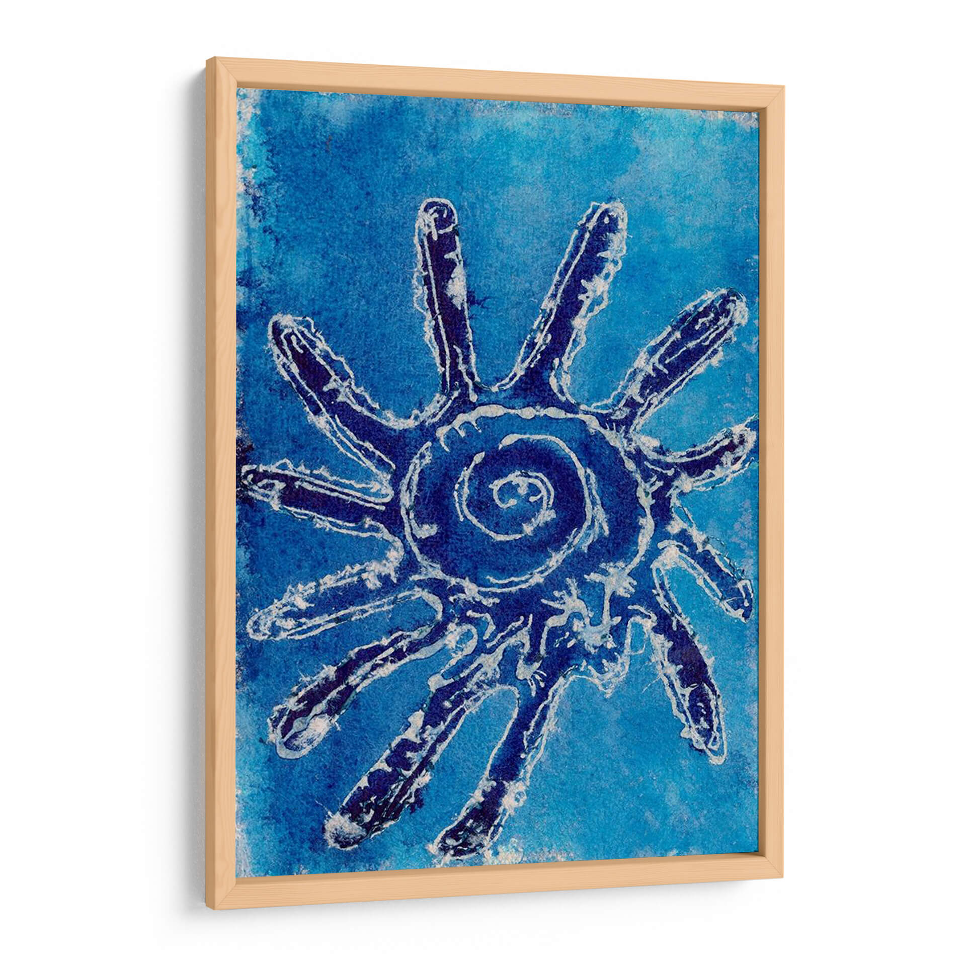 Sumérgete en la serenidad y el misterio con 'Conchas Cerúas V', una obra de arte cautivadora de Regina Moore. Este cuadro decorativo presenta una enigmática figura central, reminiscenta de un sol estilizado o una criatura marina abstracta, definida por trazos audaces en azul profundo y blanco sobre un vibrante fondo azul cerúleo. La composición evoca la inmensidad del océano y la energía vital que emana de sus profundidades. La paleta de azules intensos crea una atmósfera de calma profunda y contemplación, perfecta para transformar cualquier espacio en un santuario de paz. El estilo artístico, que fusiona elementos abstractos con una textura que recuerda a técnicas artesanales, aporta una dimensión única y orgánica a la pieza. 'Conchas Cerúas V' es ideal para quienes buscan añadir un toque de sofisticación natural y un punto focal intrigante a su sala de estar, dormitorio u oficina. Su diseño atemporal y su conexión con la naturaleza la convierten en una adición memorable a cualquier colección de arte contemporáneo, invitando a la reflexión y al asombro en cada mirada.