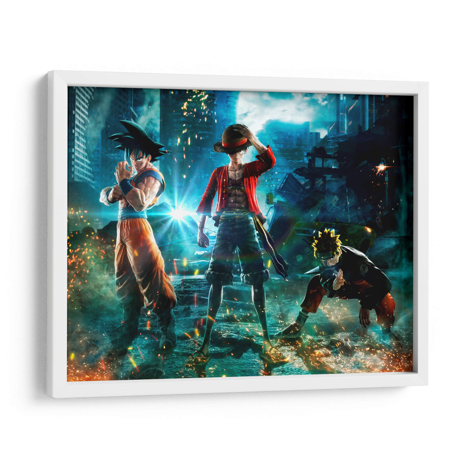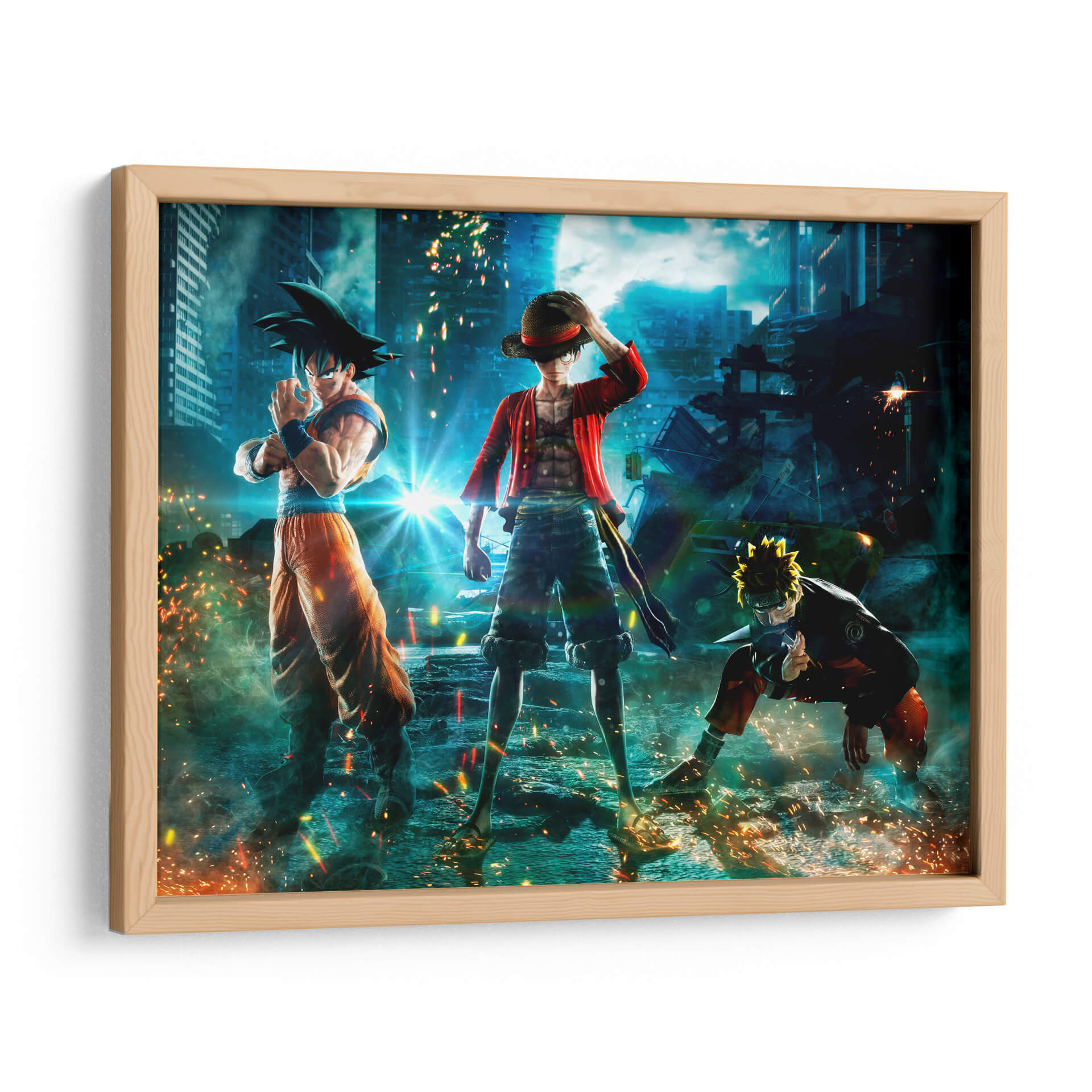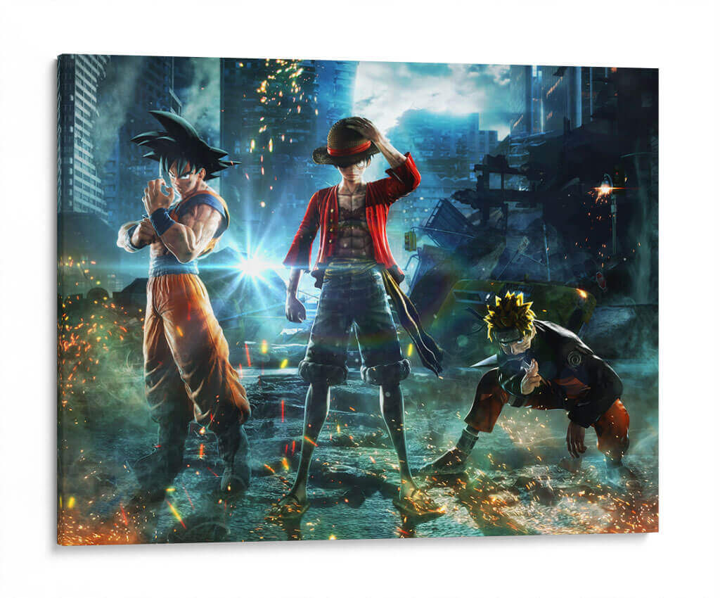 Sumérgete en un universo de acción y aventura con este impactante cuadro decorativo 'Crossover Épico'. La obra presenta a icónicos personajes de anime, reconocidos por sus series, reunidos en un escenario urbano futurista y caótico. La composición dinámica captura la esencia de la lucha y la camaradería, con un estilo de arte digital vibrante y lleno de energía. La paleta de colores, dominada por azules profundos del cielo nocturno y los edificios, se ve realzada por los destellos de luz anaranjada y amarillenta provenientes de explosiones y efectos de poder, creando un ambiente de alta intensidad. Los detalles de los personajes y el entorno están representados con gran fidelidad, haciendo de esta pieza un punto focal ideal para cualquier habitación de un fanático del anime, o para aquellos que buscan añadir un toque de dramatismo y fantasía a su decoración. Este cuadro decorativo es perfecto para salones, salas de juegos o estudios, transmitiendo una sensación de poder y determinación. Su estilo contemporáneo y su temática de culto lo convierten en una adición memorable a cualquier espacio que busque reflejar pasión y dinamismo.