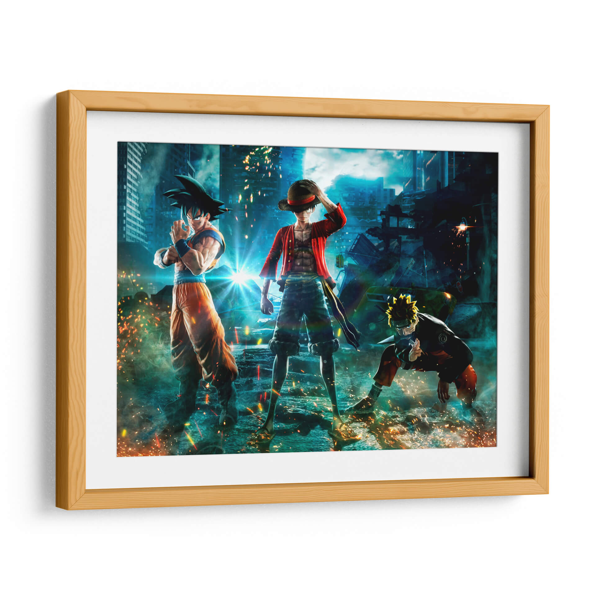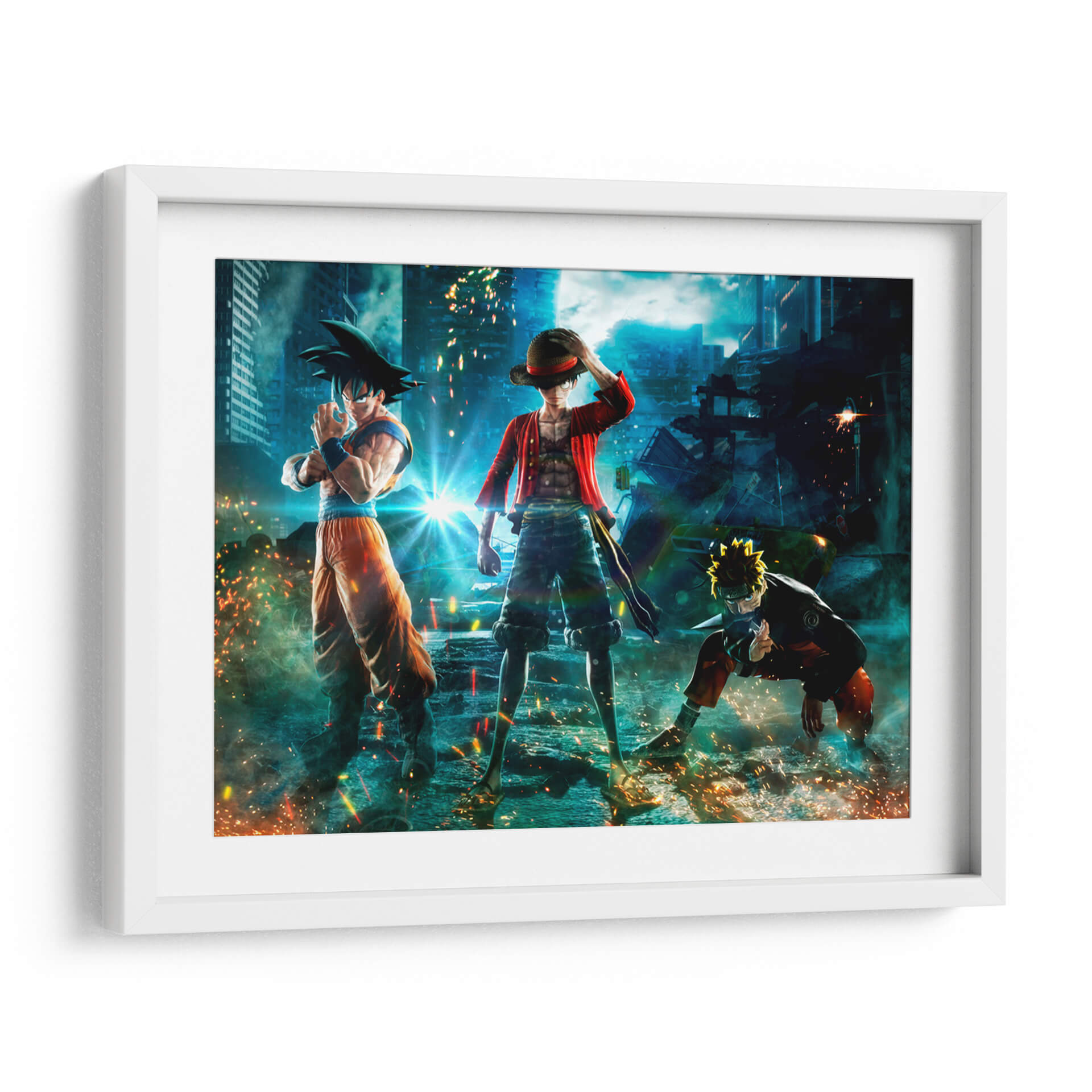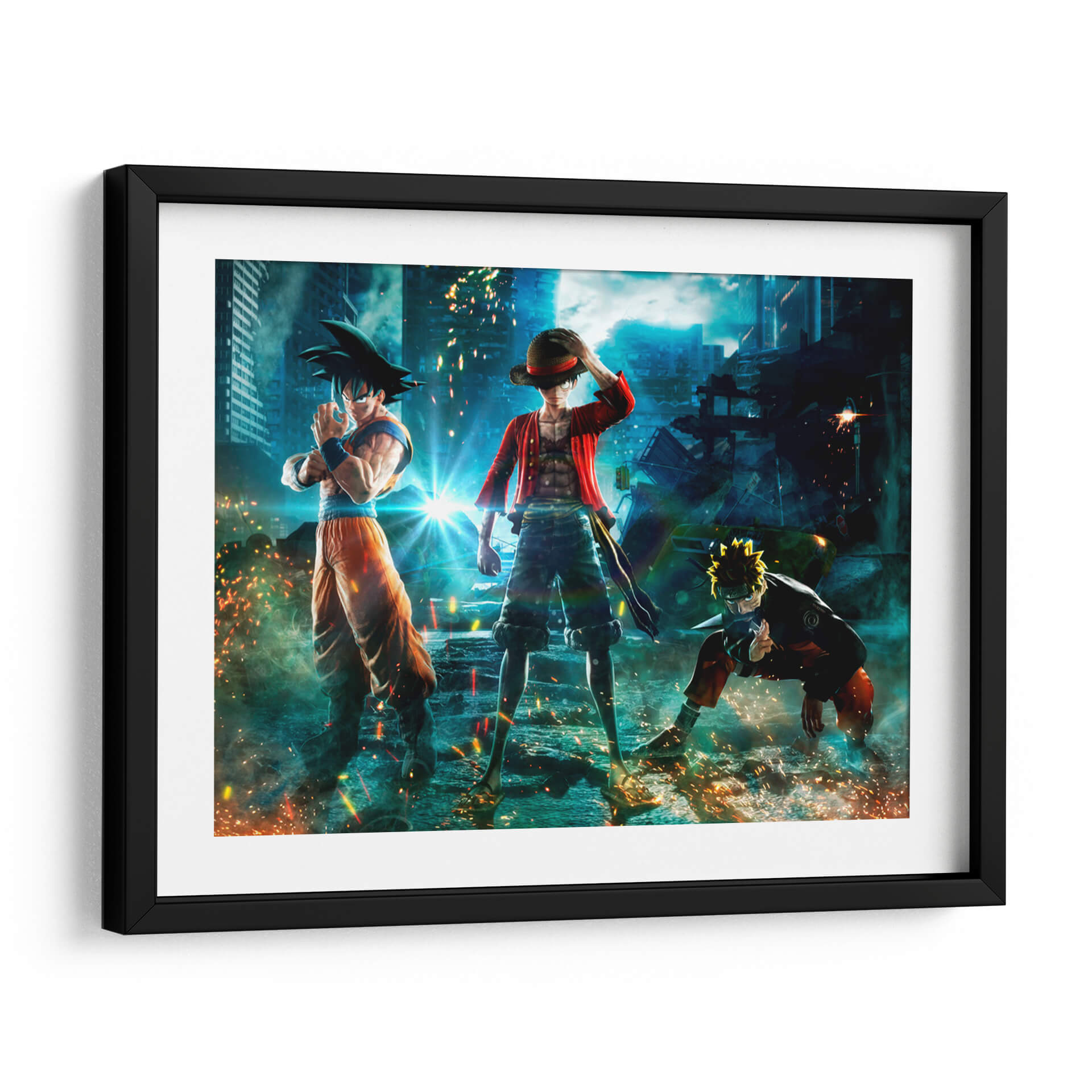 Sumérgete en un universo de acción y aventura con este impactante cuadro decorativo 'Crossover Épico'. La obra presenta a icónicos personajes de anime, reconocidos por sus series, reunidos en un escenario urbano futurista y caótico. La composición dinámica captura la esencia de la lucha y la camaradería, con un estilo de arte digital vibrante y lleno de energía. La paleta de colores, dominada por azules profundos del cielo nocturno y los edificios, se ve realzada por los destellos de luz anaranjada y amarillenta provenientes de explosiones y efectos de poder, creando un ambiente de alta intensidad. Los detalles de los personajes y el entorno están representados con gran fidelidad, haciendo de esta pieza un punto focal ideal para cualquier habitación de un fanático del anime, o para aquellos que buscan añadir un toque de dramatismo y fantasía a su decoración. Este cuadro decorativo es perfecto para salones, salas de juegos o estudios, transmitiendo una sensación de poder y determinación. Su estilo contemporáneo y su temática de culto lo convierten en una adición memorable a cualquier espacio que busque reflejar pasión y dinamismo.