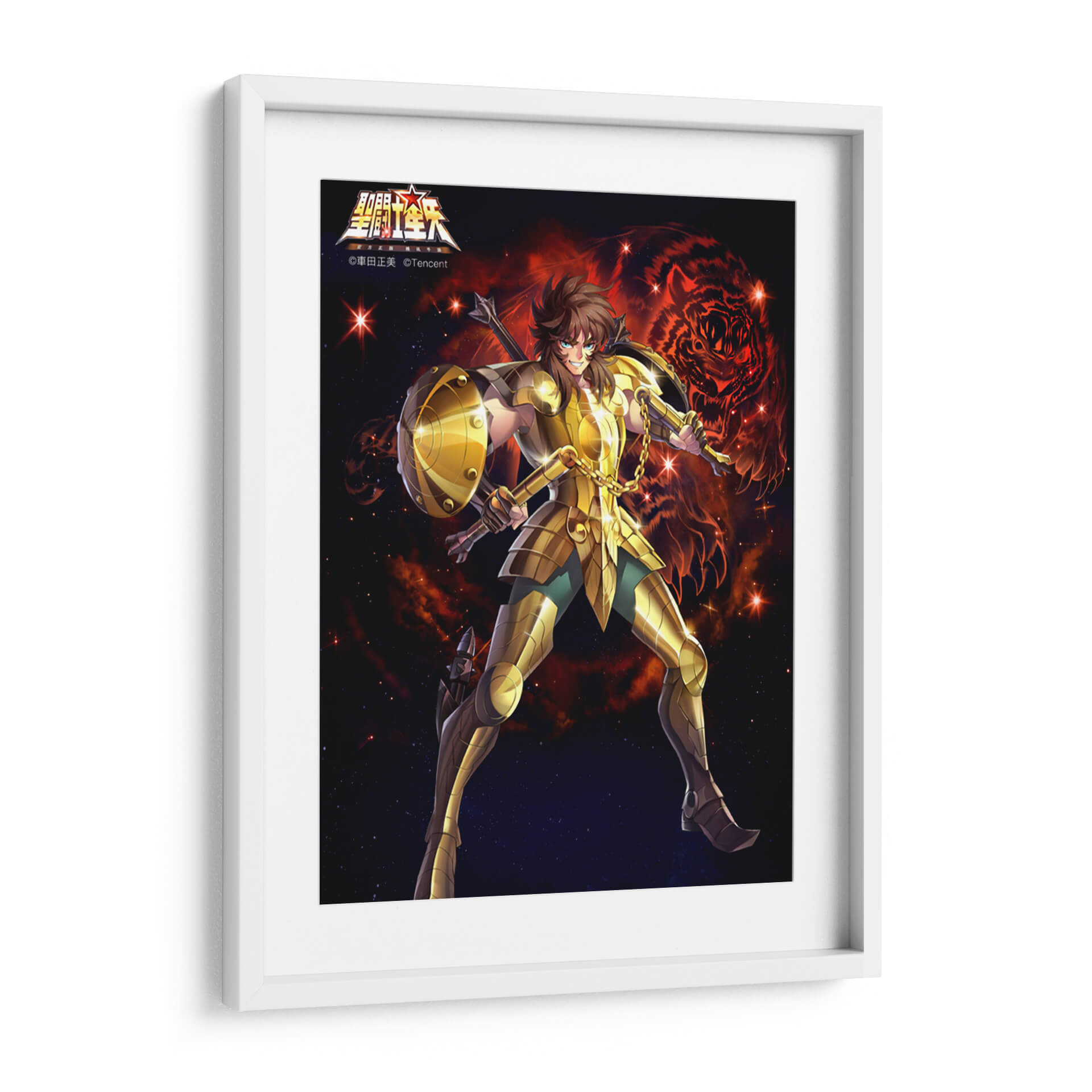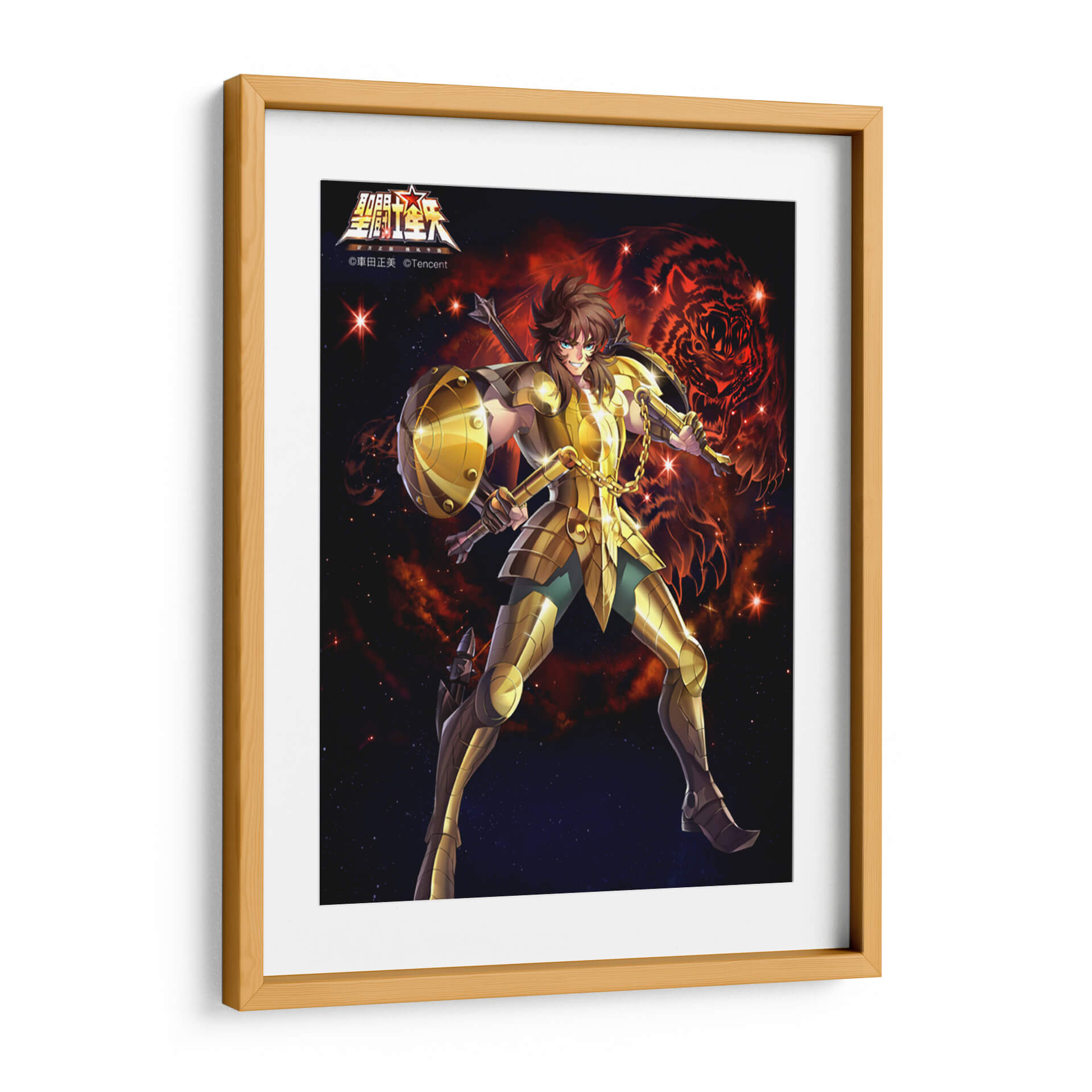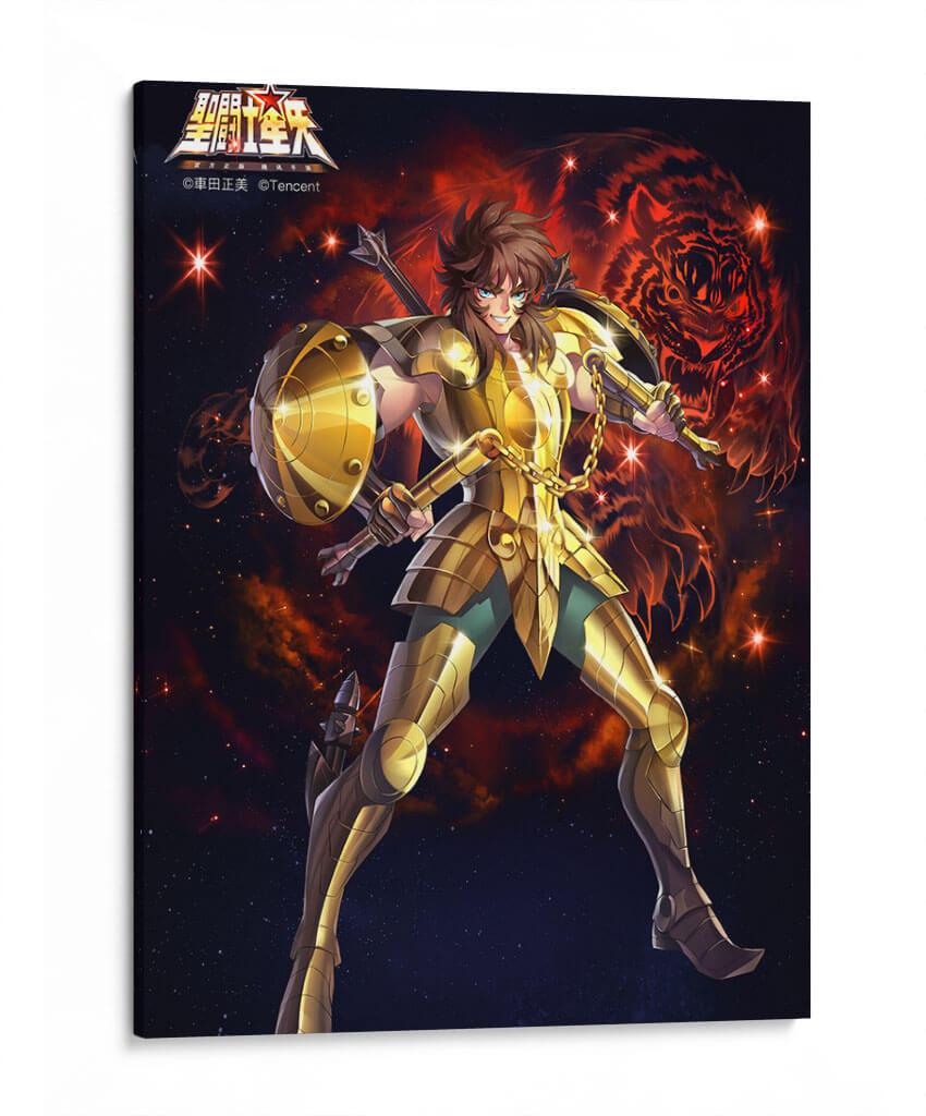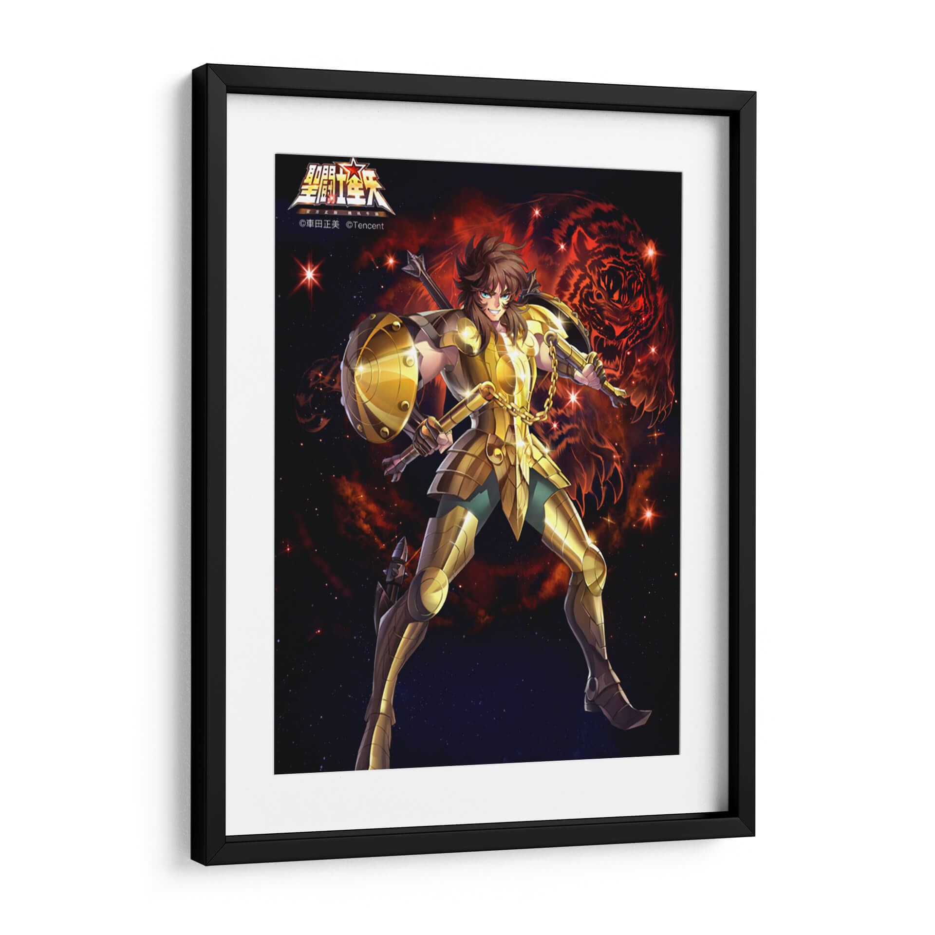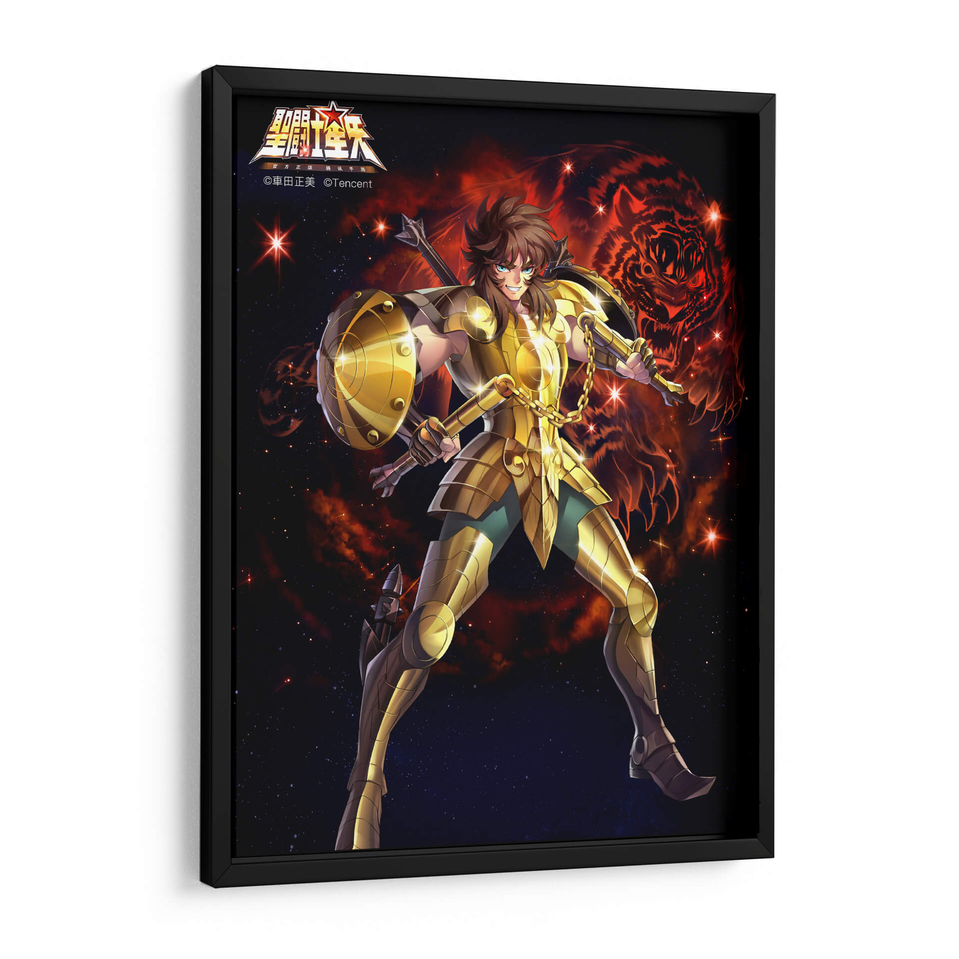 Sumérgete en la intensidad y el poder con este cautivador cuadro decorativo inspirado en la figura de Dohko de Libra. La obra presenta a un guerrero icónico, ataviado con una armadura dorada brillante que irradia fuerza y determinación. Detrás de él, una silueta felina ardiente, posiblemente un león o un tigre, emerge de un torbellino de energía naranja y roja, simbolizando la pasión y el coraje indomable. El fondo oscuro salpicado de estrellas evoca la inmensidad del cosmos, creando un contraste dramático que realza la figura central y la intensidad de la escena. Los tonos dorados de la armadura, combinados con los cálidos y vibrantes rojos y naranjas del fondo, crean una paleta de colores electrizante que transmite una sensación de acción y misticismo. Este cuadro es ideal para espacios que buscan un toque de heroísmo y energía, como una sala de estar moderna, un estudio o una habitación temática. Su composición dinámica y su atmósfera épica lo convierten en una pieza central que atrae todas las miradas, perfecta para los amantes del arte con carácter y narrativas visuales potentes.