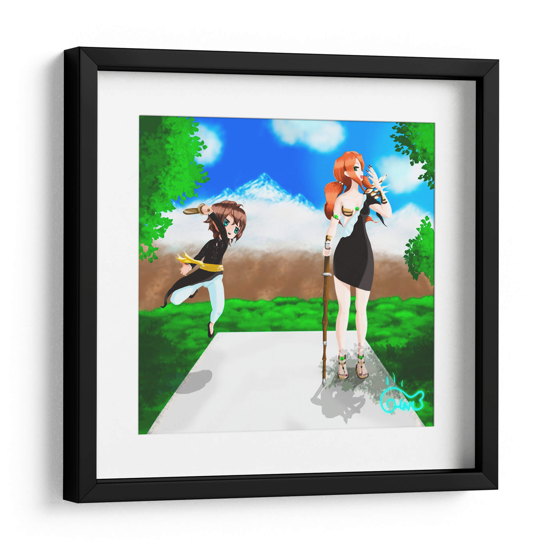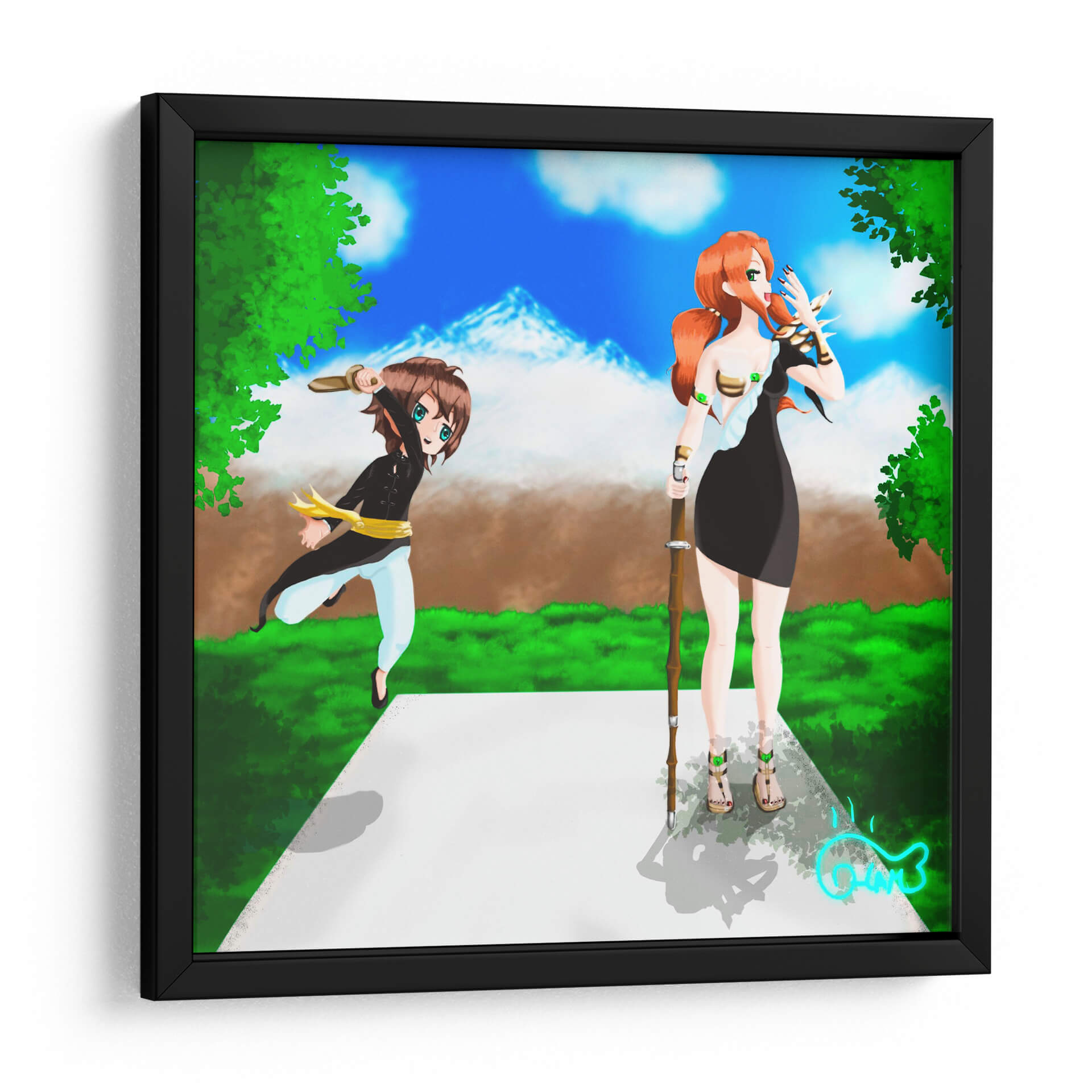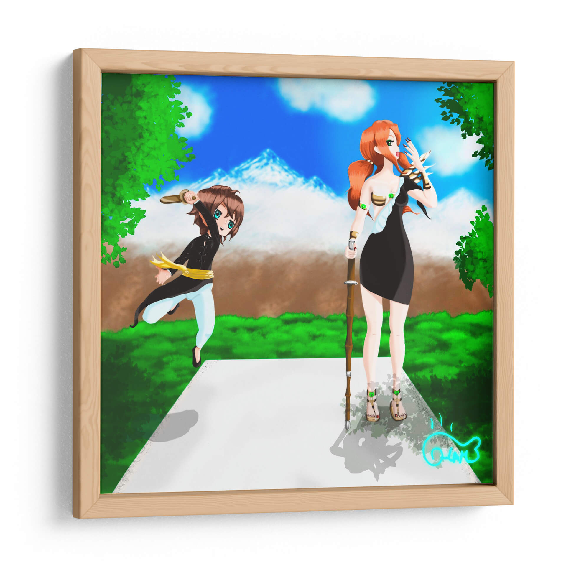 Sumérgete en la enérgica escena de 'Entrenamiento con la Espada', una obra de arte digital vibrante y cautivadora del artista Ham Hams!. Esta pieza presenta dos figuras estilizadas, reminiscentes del anime, en un entorno natural exuberante bajo un cielo azul brillante con picos montañosos nevados al fondo. Una figura, con cabello rojizo y vestimenta oscura, empuña un bastón, mientras que la otra, de cabello castaño y atuendo deportivo, se lanza hacia adelante con una espada en alto, evocando una sensación de acción y preparación. La paleta de colores, dominada por verdes intensos, azules celestes y toques de marrón y dorado, crea una atmósfera de aventura y determinación. El estilo artístico, con sus líneas definidas y expresiones animadas, transmite una energía juvenil y un sentido de propósito. Este cuadro decorativo es perfecto para añadir un toque de dinamismo y fantasía a cualquier espacio, ya sea una sala de estar moderna, un dormitorio temático o una oficina que busque inspiración. 'Entrenamiento con la Espada' no es solo una imagen, sino una invitación a la acción y al espíritu de superación, ideal para quienes aprecian el arte contemporáneo con influencias de fantasía y anime. Decora tu hogar u oficina con esta pieza única que inspirará conversaciones y admiración, capturando la esencia de la disciplina y la aventura en un formato visualmente impactante.