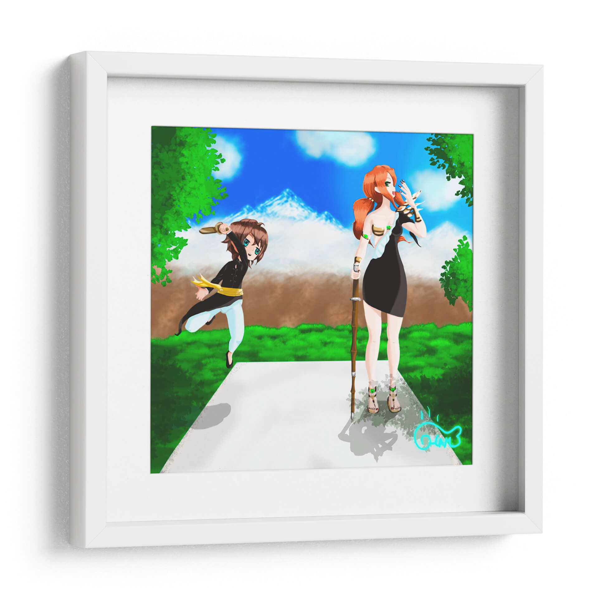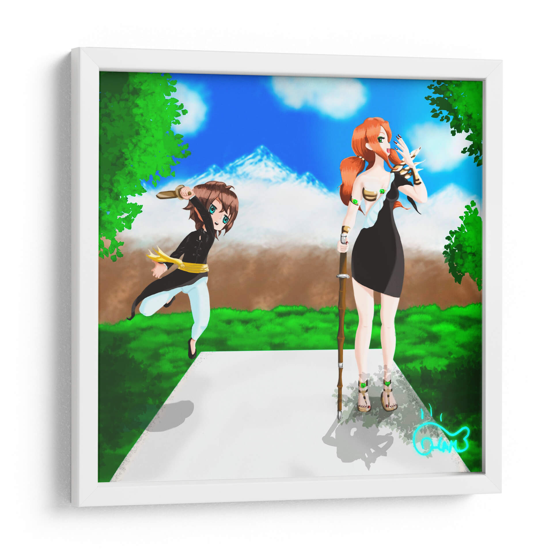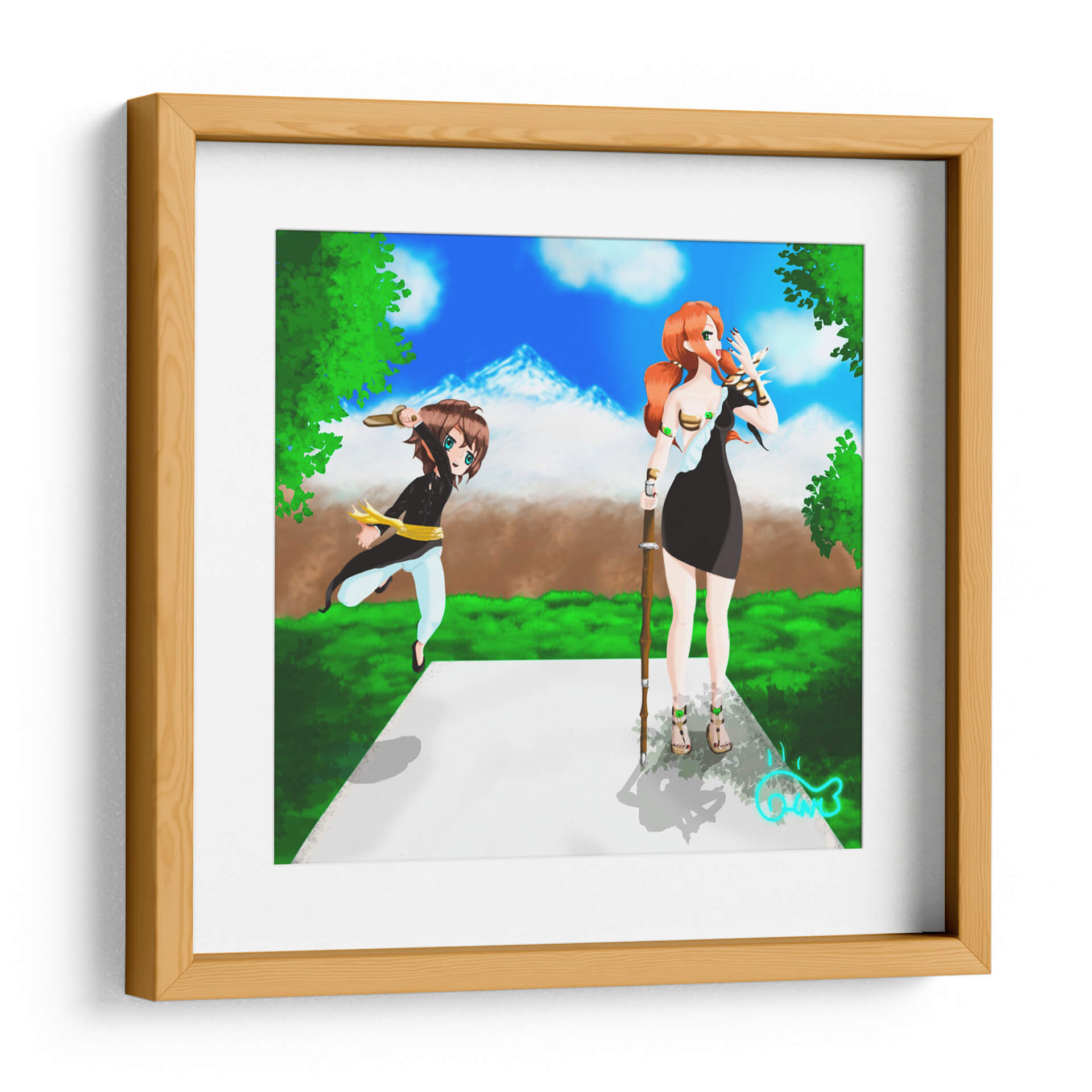 Sumérgete en la enérgica escena de 'Entrenamiento con la Espada', una obra de arte digital vibrante y cautivadora del artista Ham Hams!. Esta pieza presenta dos figuras estilizadas, reminiscentes del anime, en un entorno natural exuberante bajo un cielo azul brillante con picos montañosos nevados al fondo. Una figura, con cabello rojizo y vestimenta oscura, empuña un bastón, mientras que la otra, de cabello castaño y atuendo deportivo, se lanza hacia adelante con una espada en alto, evocando una sensación de acción y preparación. La paleta de colores, dominada por verdes intensos, azules celestes y toques de marrón y dorado, crea una atmósfera de aventura y determinación. El estilo artístico, con sus líneas definidas y expresiones animadas, transmite una energía juvenil y un sentido de propósito. Este cuadro decorativo es perfecto para añadir un toque de dinamismo y fantasía a cualquier espacio, ya sea una sala de estar moderna, un dormitorio temático o una oficina que busque inspiración. 'Entrenamiento con la Espada' no es solo una imagen, sino una invitación a la acción y al espíritu de superación, ideal para quienes aprecian el arte contemporáneo con influencias de fantasía y anime. Decora tu hogar u oficina con esta pieza única que inspirará conversaciones y admiración, capturando la esencia de la disciplina y la aventura en un formato visualmente impactante.