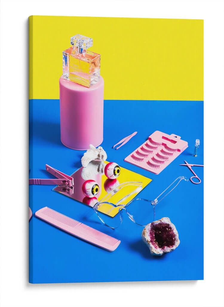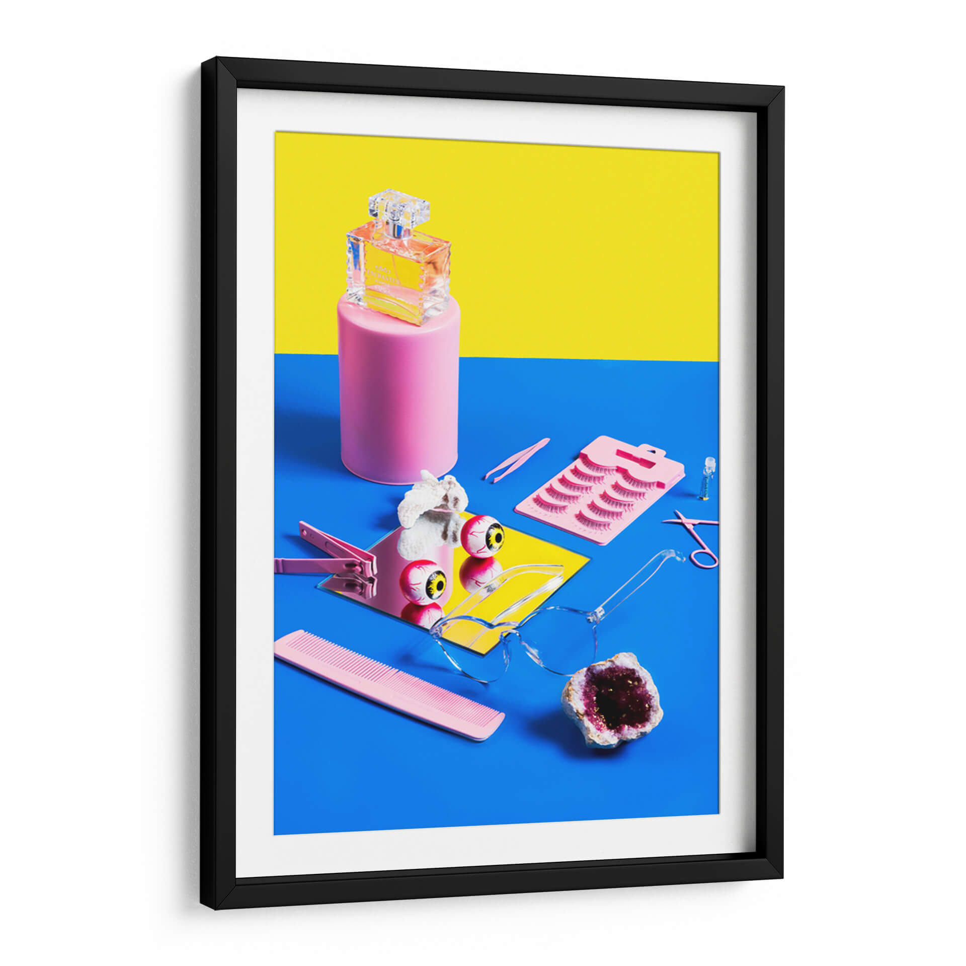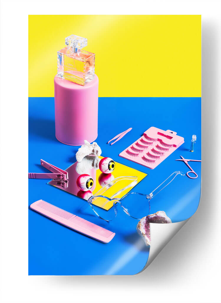 Sumérgete en el cautivador mundo del "Experimento", una obra de arte visualmente estimulante que desafía las convenciones. Esta pieza contemporánea te transporta a un escenario surrealista y meticulosamente organizado, donde objetos cotidianos adquieren un significado nuevo y enigmático. La composición se despliega sobre un fondo dividido en vibrantes bloques de color: un azul eléctrico profundo que contrasta audazmente con un amarillo solar, creando una atmósfera de energía pop y atrevimiento. El centro de atención se desvía hacia una disposición intrigante de elementos: un frasco de perfume de cristal sobre un pedestal rosa, unas pestañas postizas cuidadosamente presentadas, unas tijeras y pinzas de manicura, un peine, unas gafas transparentes y lo más impactante, un par de ojos de juguete con una mirada penetrante que parecen observar al espectador. Un cristal geoda morado añade un toque de misterio natural. La paleta de colores, dominada por el rosa, azul y amarillo, junto con los toques metálicos y transparentes, crea una estética audaz y moderna. Esta obra es ideal para aquellos que buscan una pieza de conversación para su hogar u oficina, aportando un toque de humor surrealista y un estilo vanguardista. "Experimento" es una declaración de originalidad, perfecta para espacios que buscan reflejar una personalidad creativa y un gusto por lo inesperado.