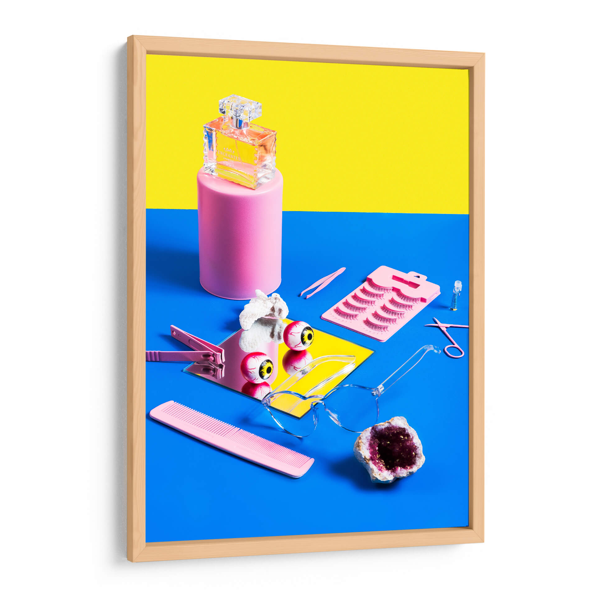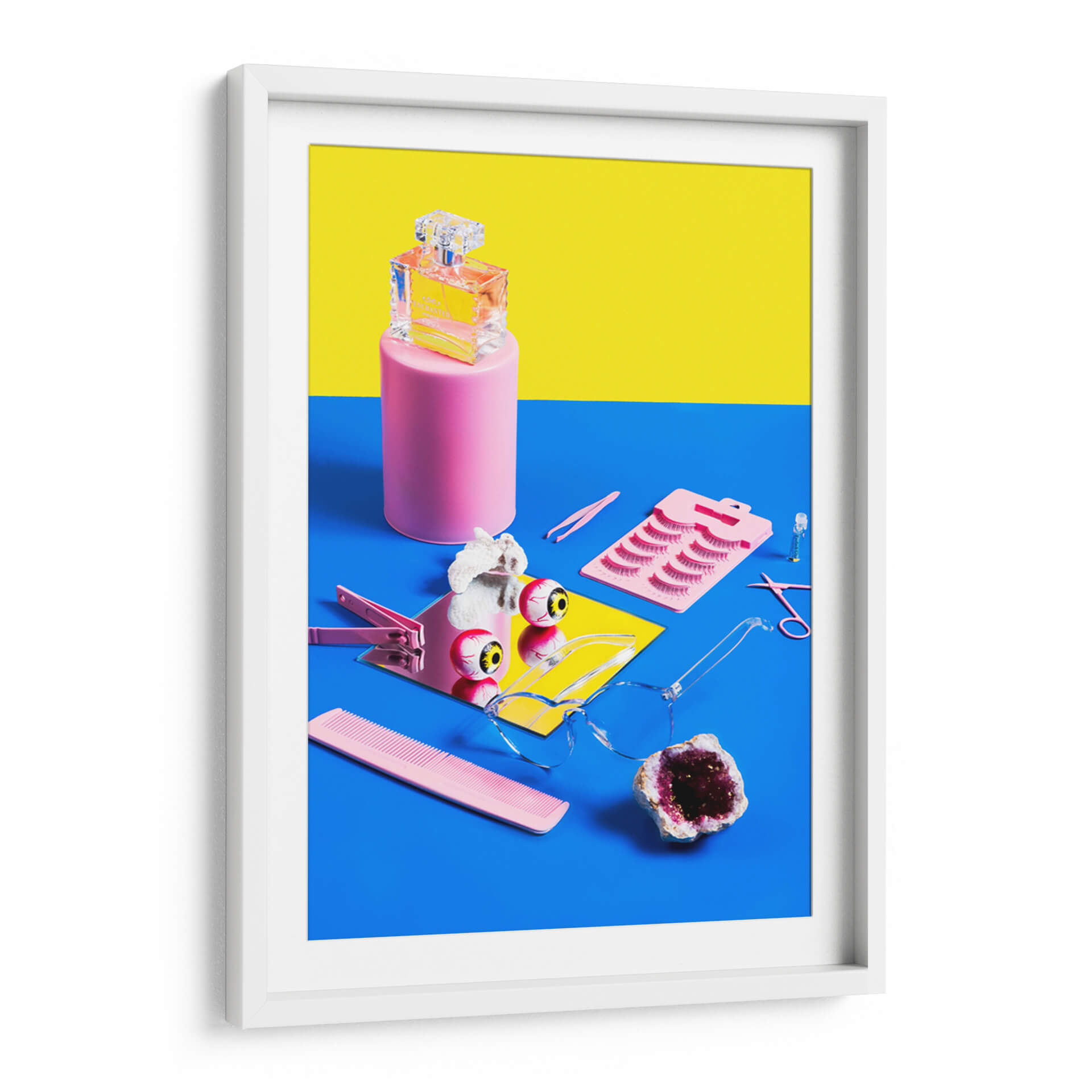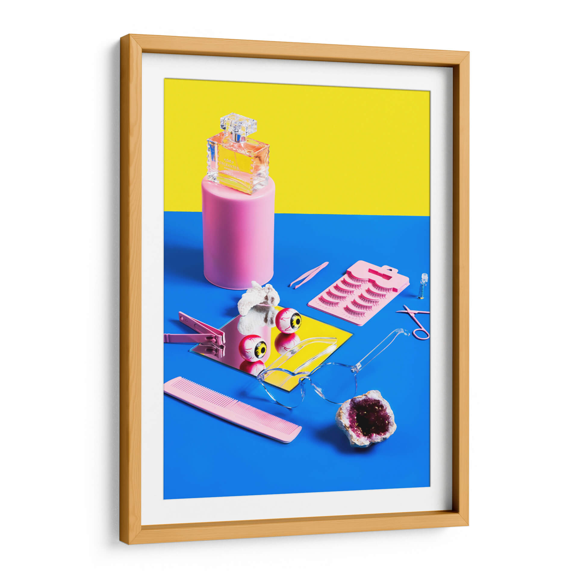 Sumérgete en el cautivador mundo del "Experimento", una obra de arte visualmente estimulante que desafía las convenciones. Esta pieza contemporánea te transporta a un escenario surrealista y meticulosamente organizado, donde objetos cotidianos adquieren un significado nuevo y enigmático. La composición se despliega sobre un fondo dividido en vibrantes bloques de color: un azul eléctrico profundo que contrasta audazmente con un amarillo solar, creando una atmósfera de energía pop y atrevimiento. El centro de atención se desvía hacia una disposición intrigante de elementos: un frasco de perfume de cristal sobre un pedestal rosa, unas pestañas postizas cuidadosamente presentadas, unas tijeras y pinzas de manicura, un peine, unas gafas transparentes y lo más impactante, un par de ojos de juguete con una mirada penetrante que parecen observar al espectador. Un cristal geoda morado añade un toque de misterio natural. La paleta de colores, dominada por el rosa, azul y amarillo, junto con los toques metálicos y transparentes, crea una estética audaz y moderna. Esta obra es ideal para aquellos que buscan una pieza de conversación para su hogar u oficina, aportando un toque de humor surrealista y un estilo vanguardista. "Experimento" es una declaración de originalidad, perfecta para espacios que buscan reflejar una personalidad creativa y un gusto por lo inesperado.