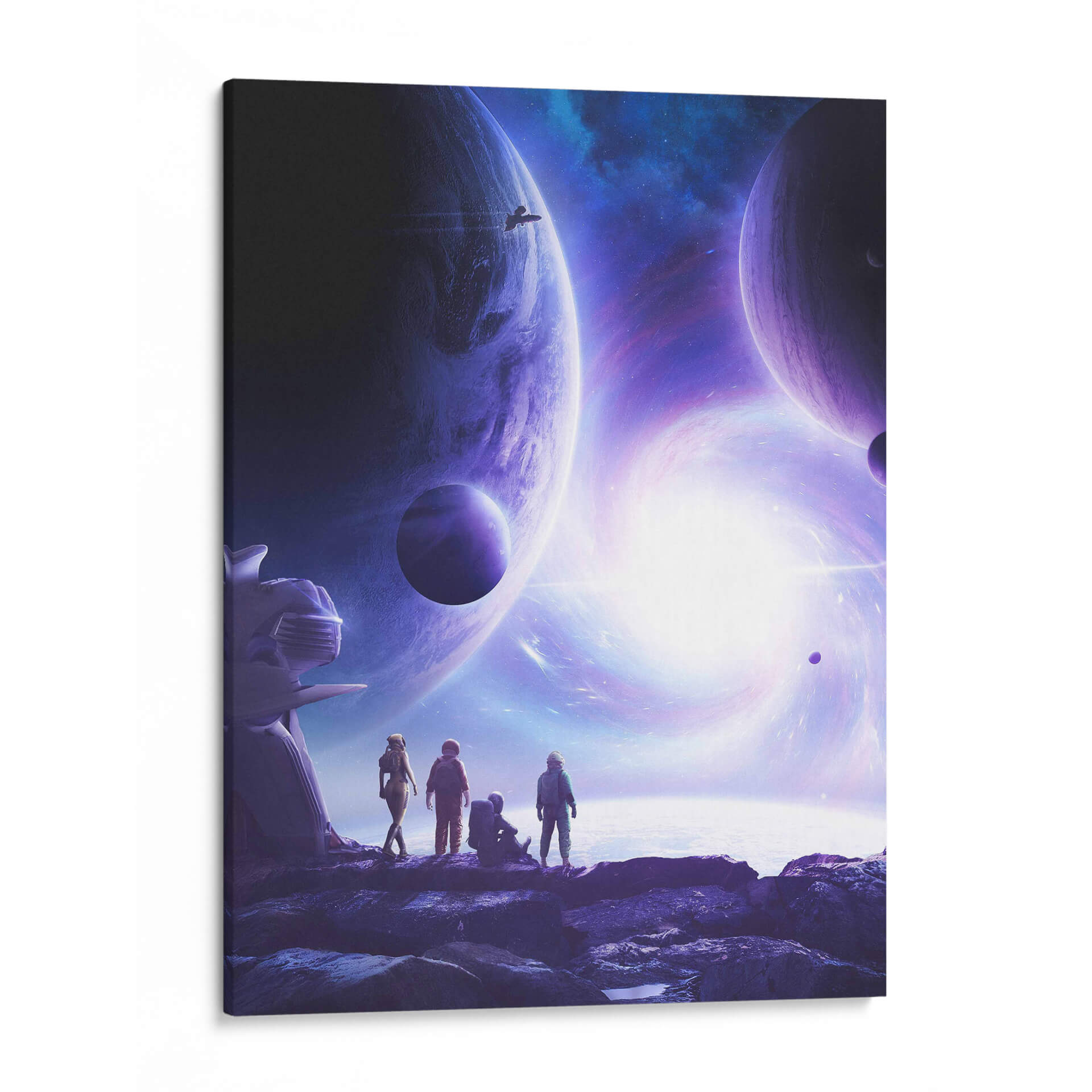 Sumérgete en las profundidades del cosmos con "Exploradores", una obra de arte digital que te transportará a un universo de maravillas y descubrimientos. Este impresionante cuadro decorativo presenta a un grupo de astronautas en la orilla de un planeta desconocido, contemplando un espectáculo celestial deslumbrante. Gigantescos planetas púrpuras y un vórtice de energía cósmica en el centro crean una escena épica que evoca asombro y la infinita curiosidad humana. La paleta de colores, dominada por vibrantes tonos de azul, púrpura y toques de luz brillante, irradia una atmósfera de misterio y aventura. El estilo visual, reminiscente de la ciencia ficción más imaginativa, con detalles nítidos y una composición dramática, convierte esta pieza en un punto focal cautivador para cualquier espacio. "Exploradores" es ideal para salas de estar modernas, estudios o cualquier lugar donde desees inyectar una dosis de imaginación y una perspectiva cósmica. Este cuadro decorativo no solo embellece tu hogar, sino que también inspira conversaciones sobre el universo y nuestro lugar en él. Añade un toque de lo extraordinario a tu decoración y deja que tu imaginación vuele a las estrellas.
