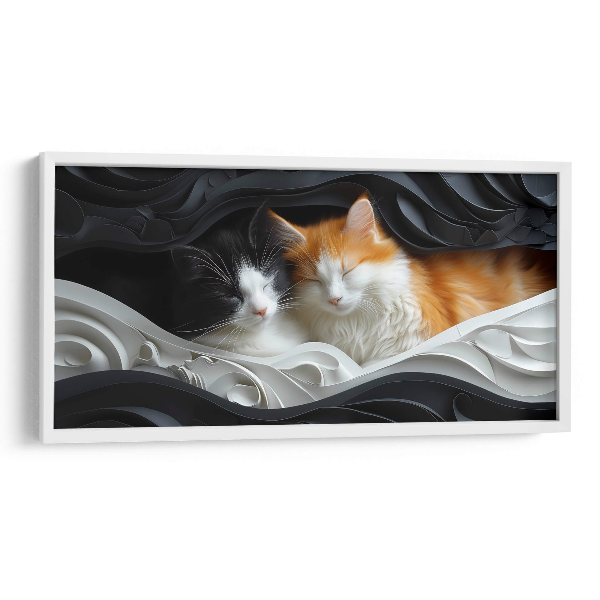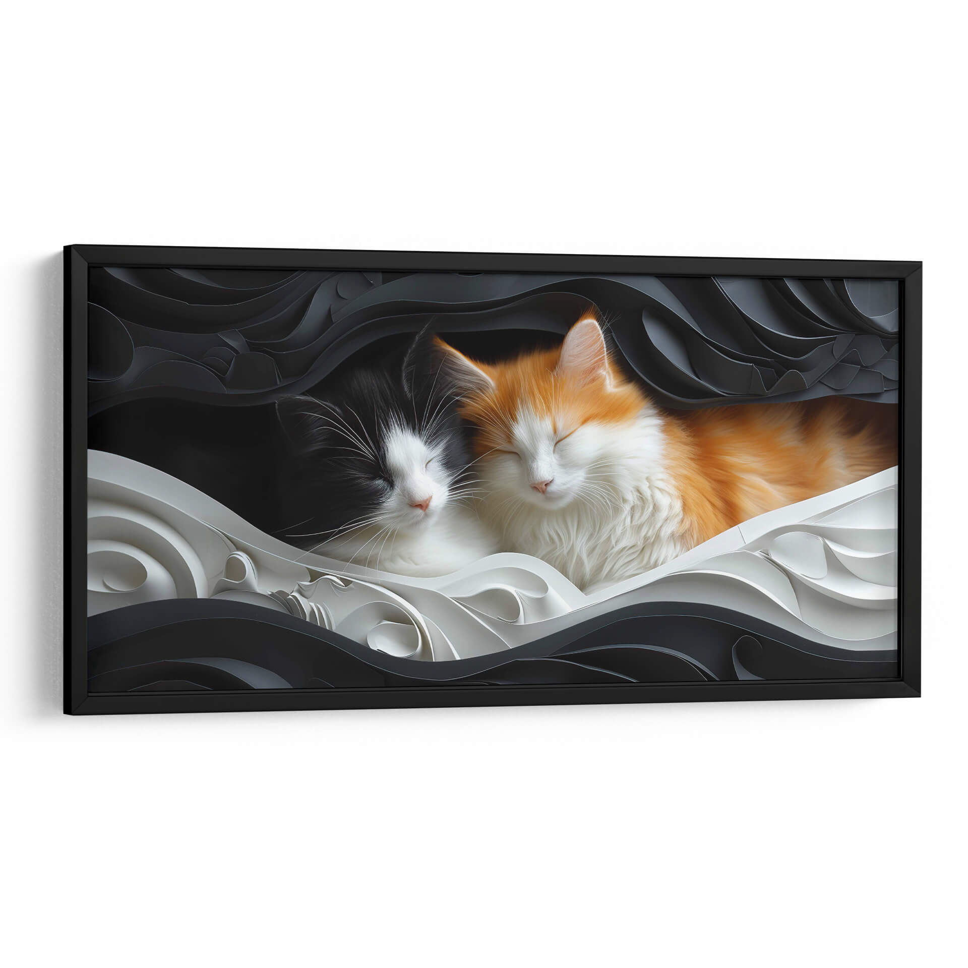 Sumérgete en la ternura y la serenidad con este cautivador cuadro decorativo que presenta a dos adorables gatos durmiendo plácidamente. La obra, titulada 'Gatos 4' y creada por la artista Cecilia Flores, captura un momento de paz y conexión, ideal para añadir un toque de calidez a cualquier espacio. La composición juega con un contraste dramático entre el fondo oscuro y las formas onduladas en blanco y negro que enmarcan a los felinos, creando una atmósfera visualmente impactante pero a la vez reconfortante. Los gatos, uno de pelaje naranja y blanco y el otro negro y blanco, exhiben texturas suaves y detalladas que invitan a la contemplación. La paleta de colores, predominantemente en blanco, negro y toques sutiles de naranja, confiere a la pieza una elegancia atemporal y versátil, permitiendo que se integre fácilmente en decoraciones modernas, minimalistas o incluso eclécticas. Este cuadro decorativo no solo es una pieza de arte, sino una ventana a la tranquilidad, perfecta para dormitorios, salas de estar, estudios o cualquier rincón donde busques un refugio de paz y dulzura. Transforma tu hogar en un santuario de calma con esta hermosa representación artística.
