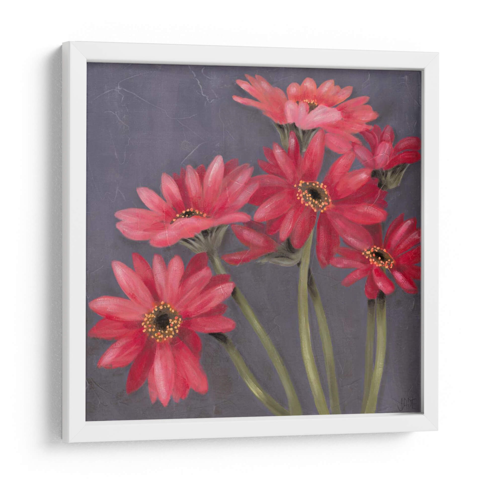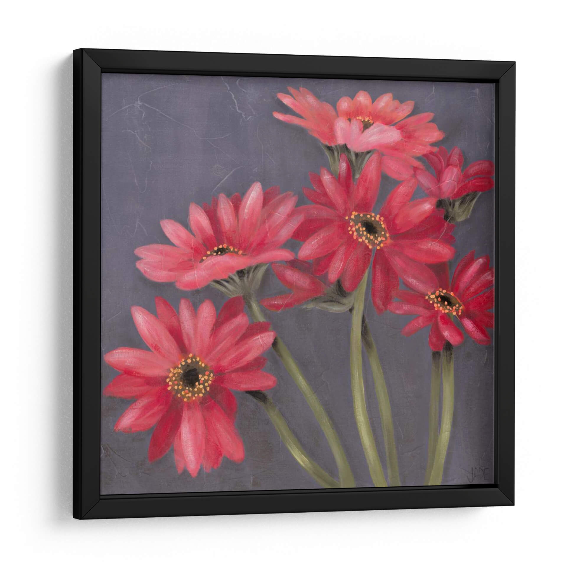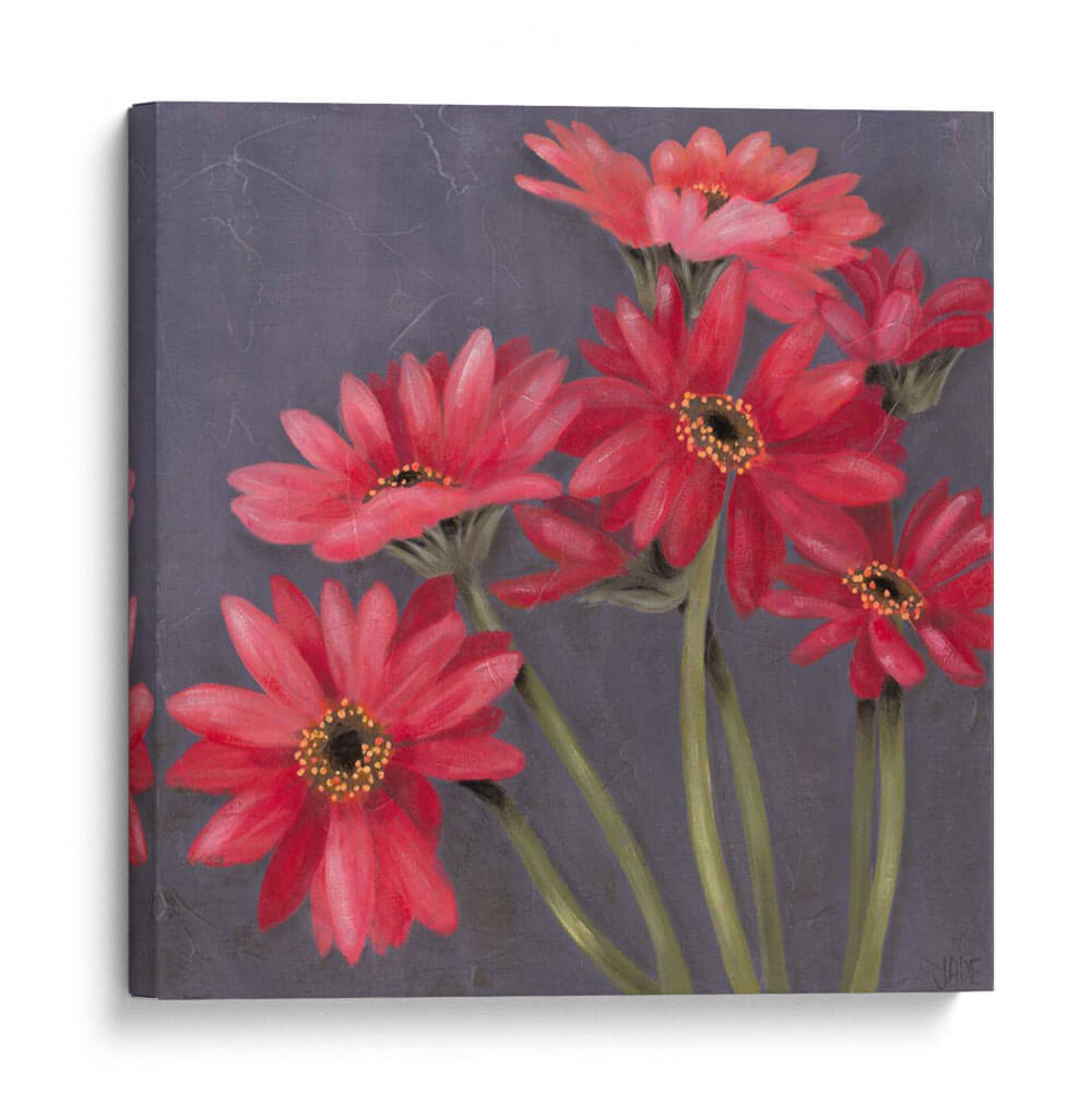Embellece tu espacio con "Gerber En Grey II", una obra de arte contemporánea de Jade Reynolds que captura la vibrante esencia de las gerberas en plena floración. Esta pieza presenta un cautivador arreglo de flores en tonos rojos intensos y rosados, cuyas delicadas pétalos se despliegan con gracia sobre un fondo texturizado en gris oscuro. La paleta de colores, dominada por los rojos vivos de las flores y contrastada con los tallos verdes y el sombrío fondo, crea una atmósfera de elegancia y vitalidad. El estilo pictórico, con pinceladas sutiles que sugieren movimiento y profundidad, aporta un toque sofisticado y moderno. "Gerber En Grey II" es ideal para añadir un punto focal de color y frescura a cualquier habitación, desde una sala de estar moderna hasta un sereno dormitorio o una oficina inspiradora. Transmite una sensación de alegría y optimismo, invitando a la contemplación de la belleza natural. Este cuadro decorativo es una elección perfecta para quienes buscan arte que hable de pasión y delicadeza, aportando vida y carácter a la decoración de interiores.